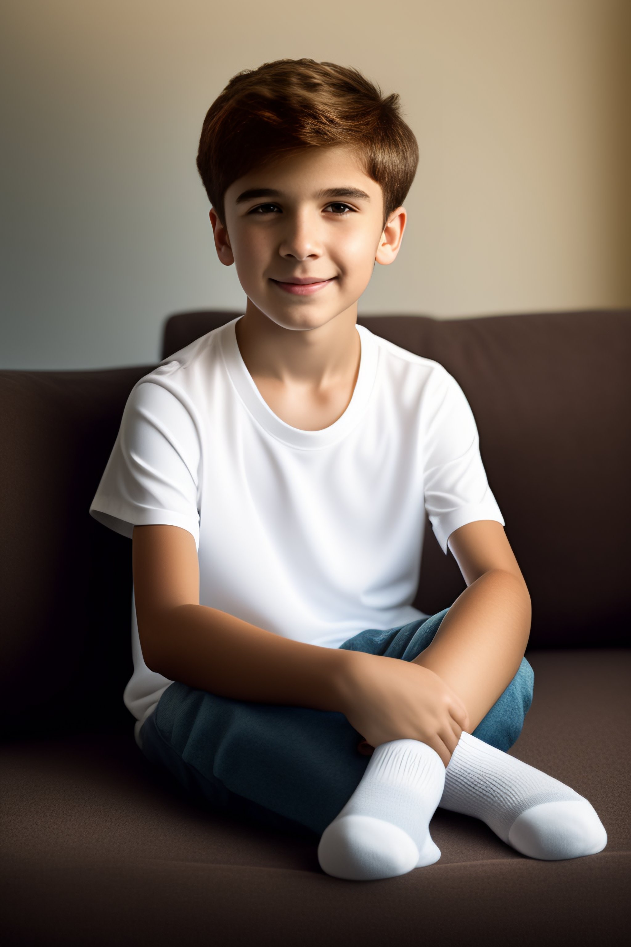 11 year old boy wearing soft white socks and long white tank top, studio lighting, light brown hair, pretty detailed face