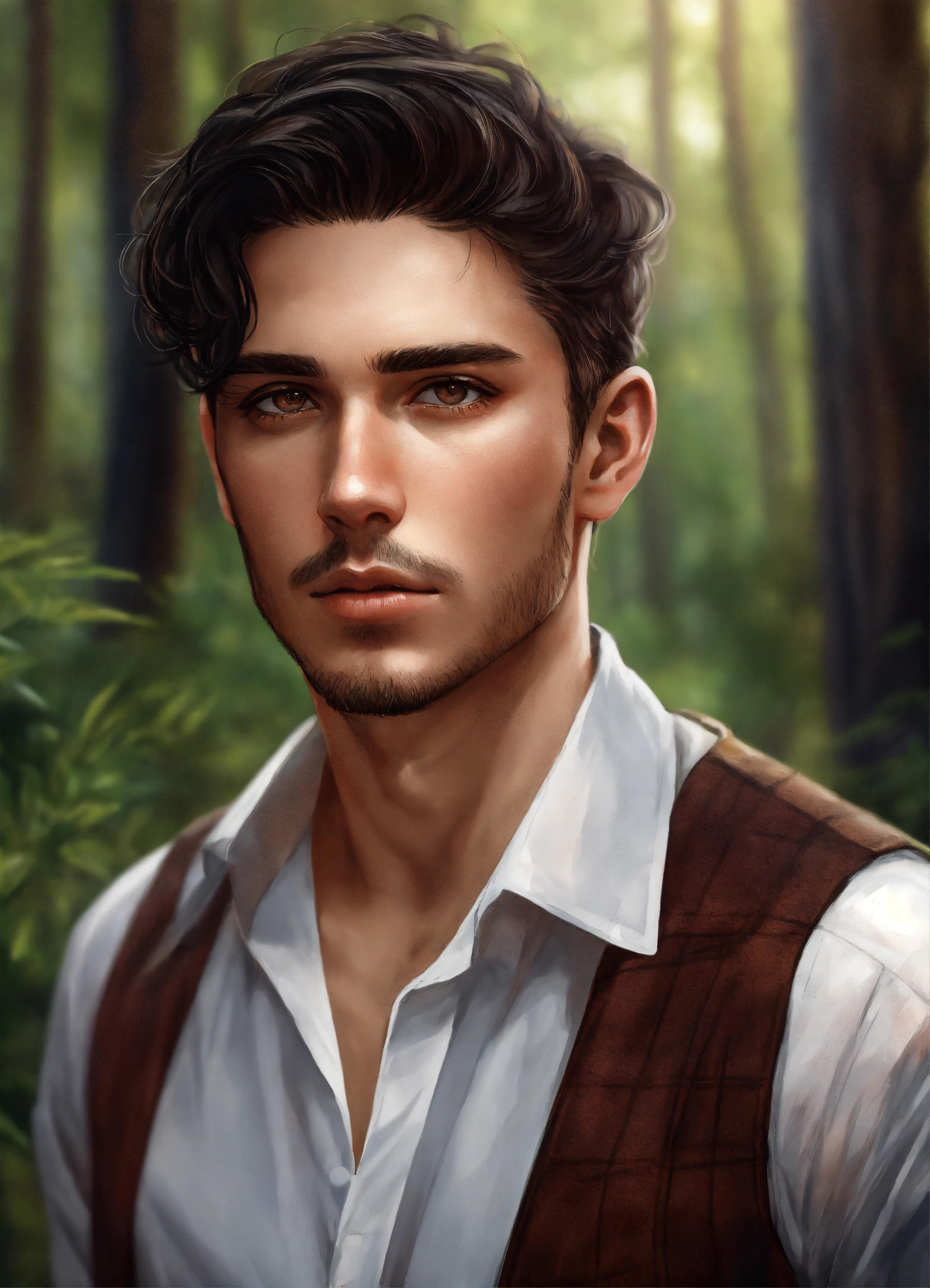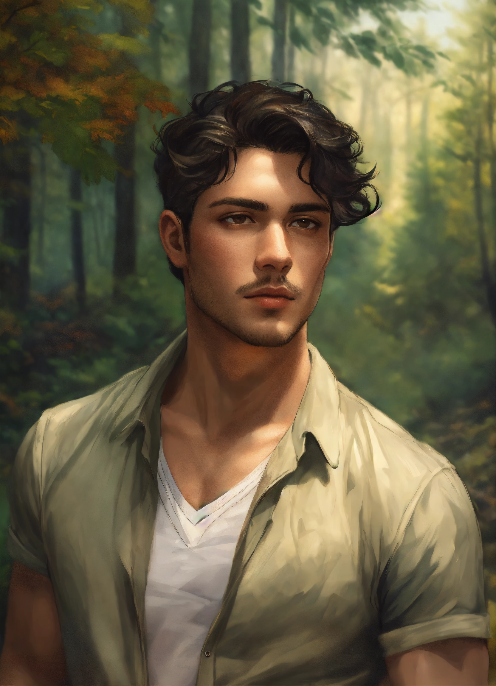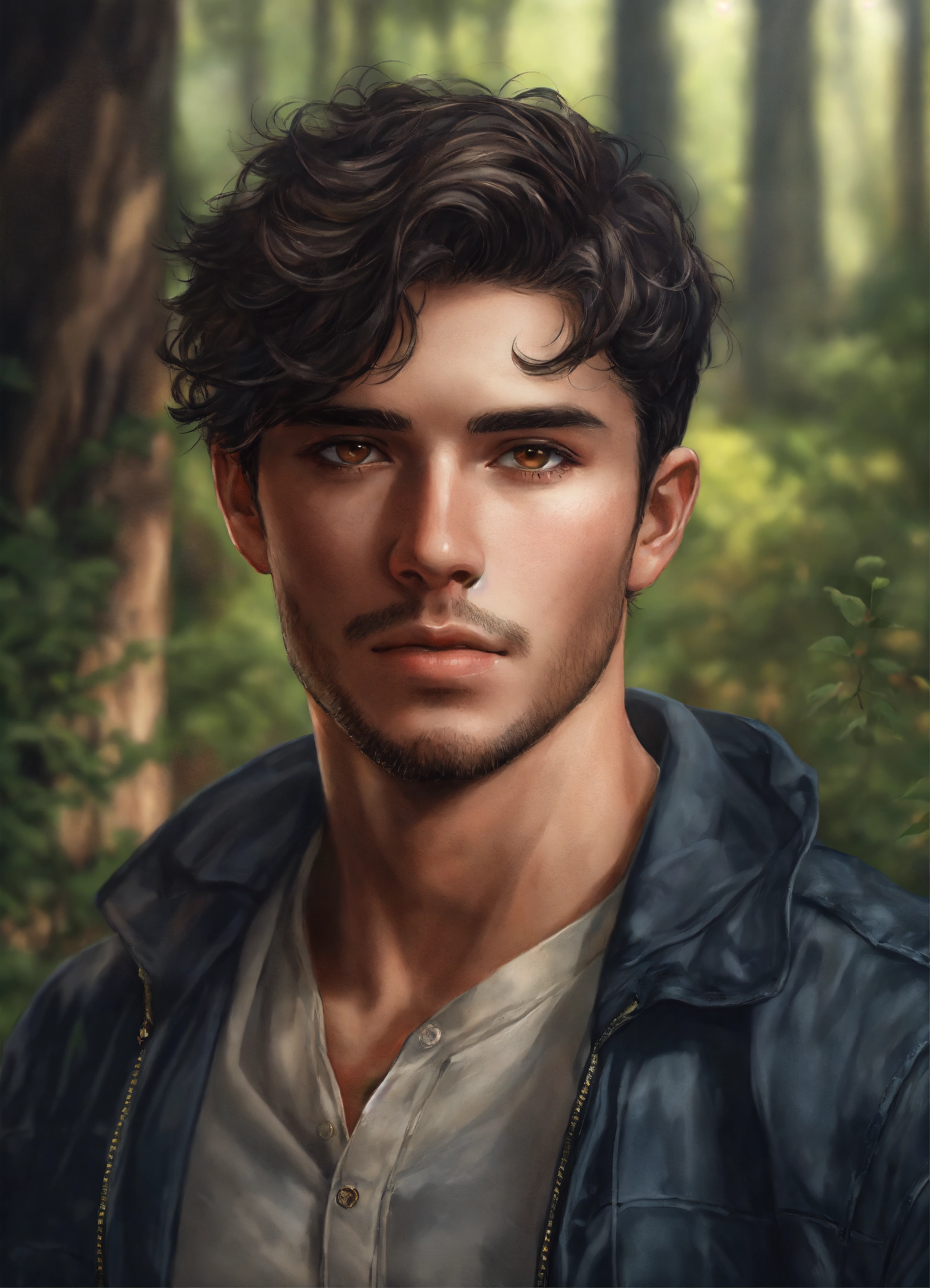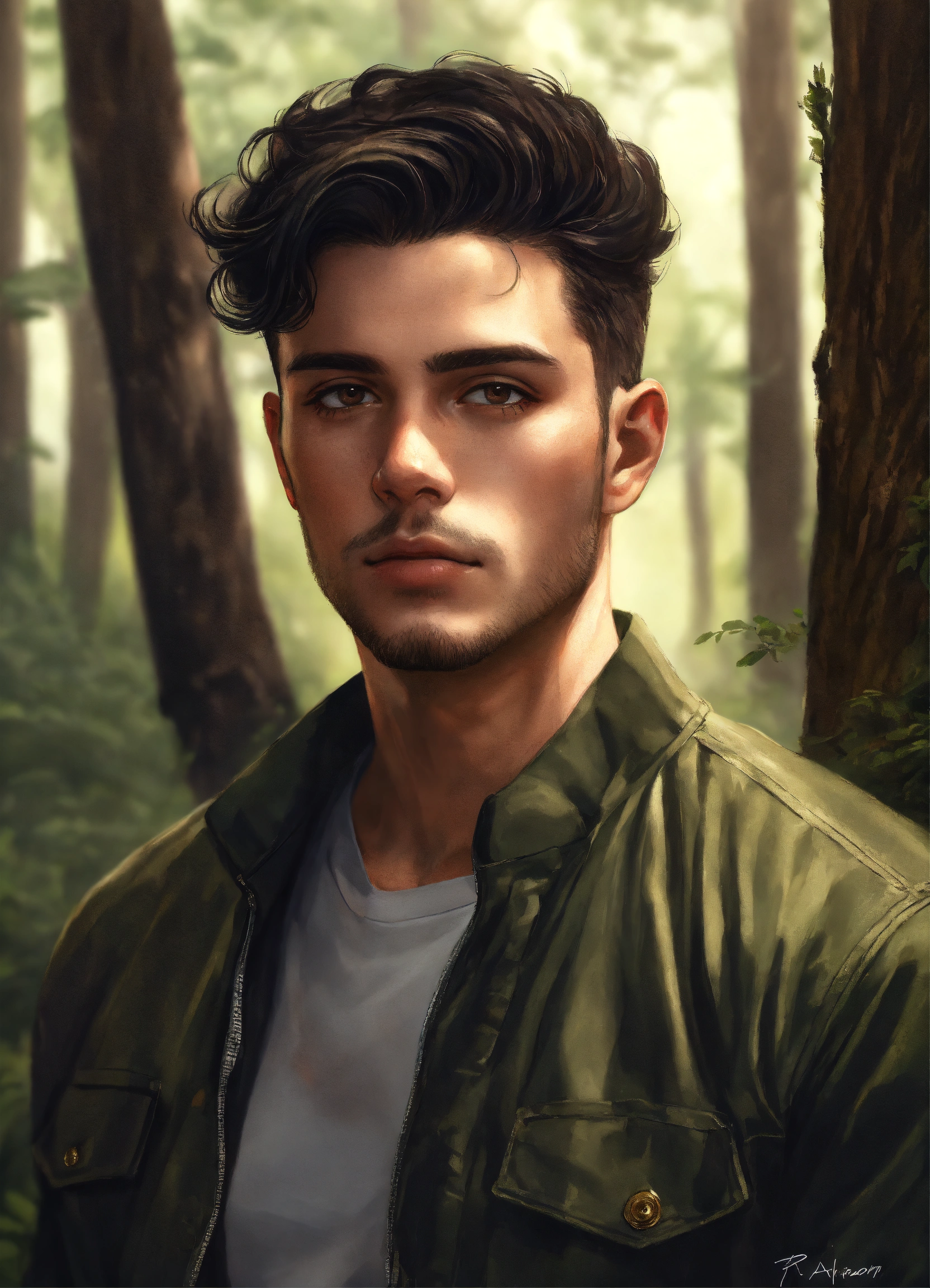 Realistic detailed portrait, stanley artgerm, very coherent. male. 25 years old. modern clothes. forest in the background. arón piper. black hair. brown eyes. italian.