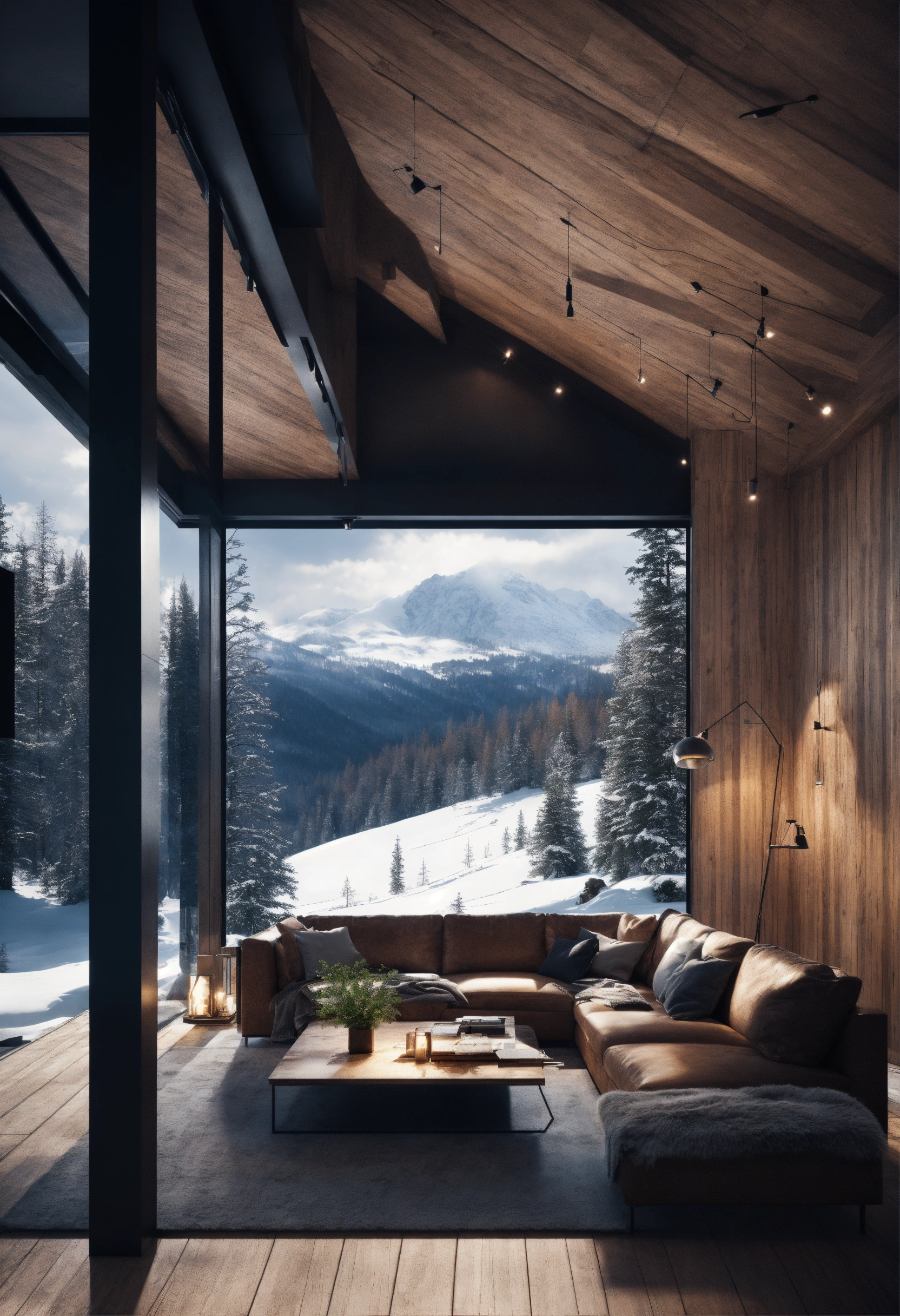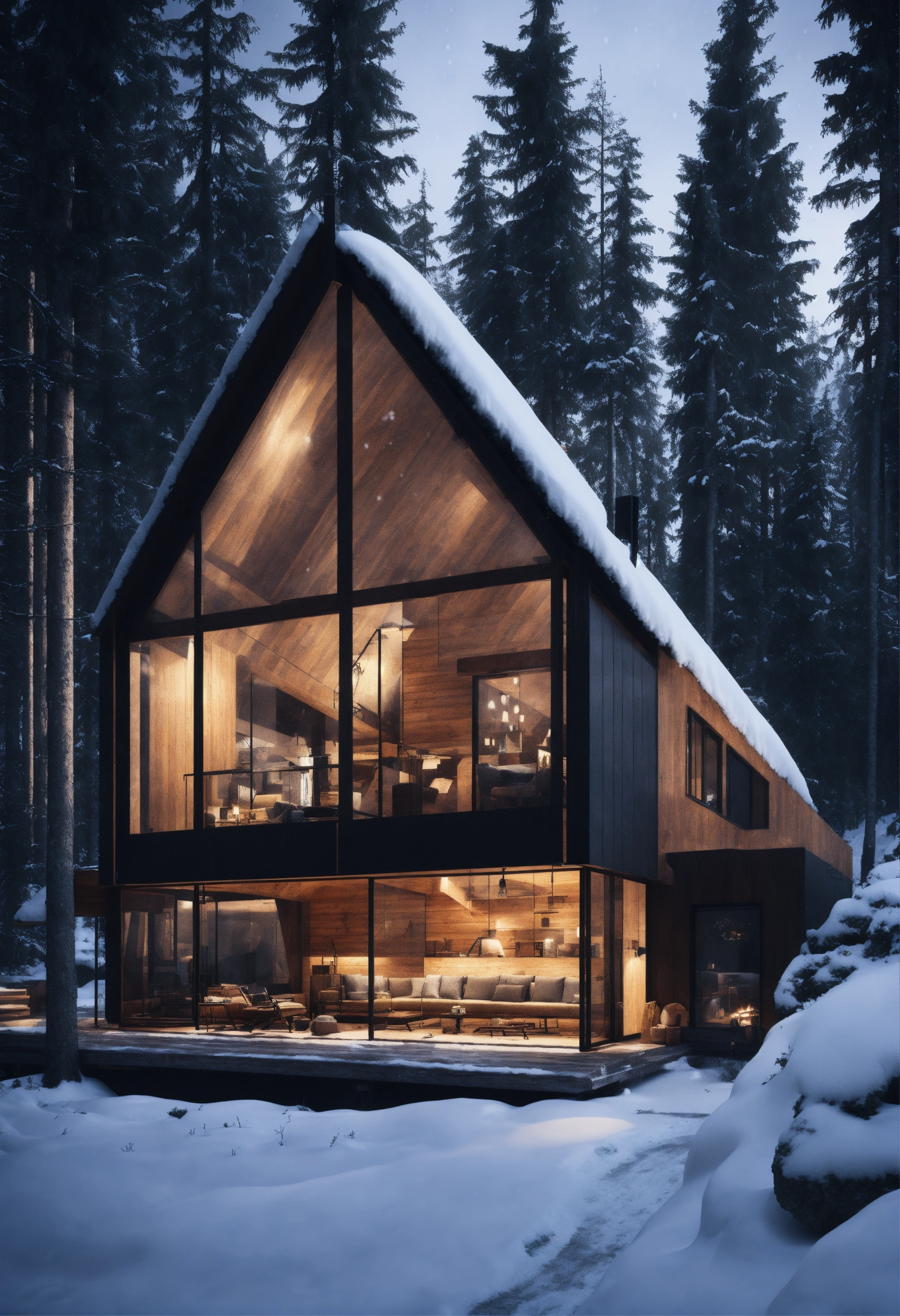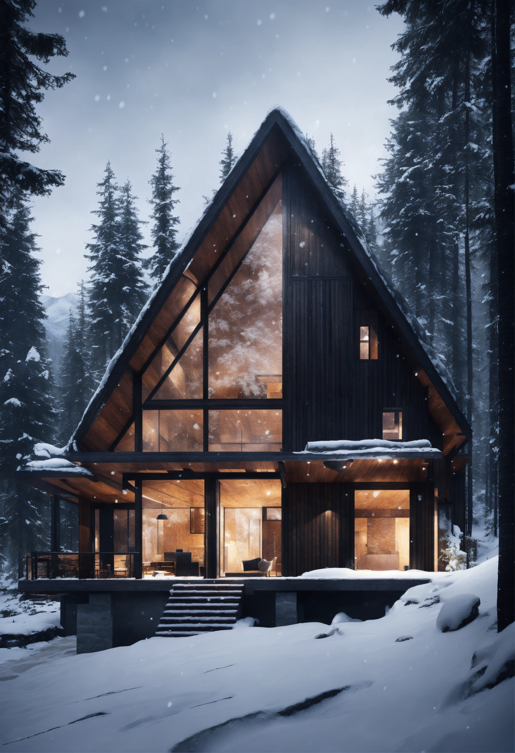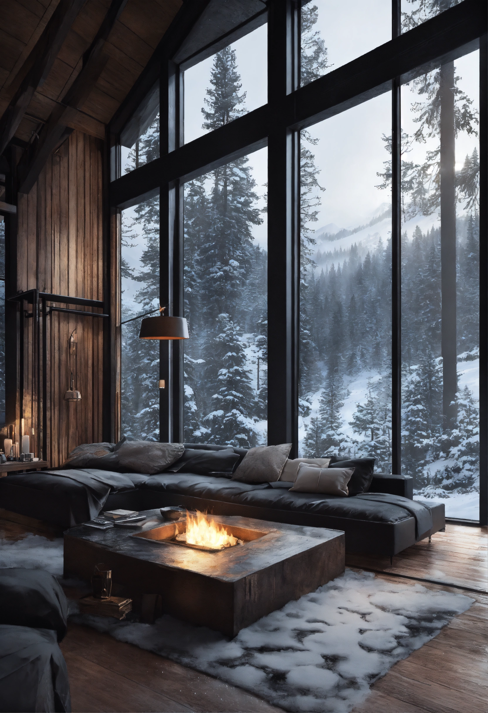 Concept art of interior design forest house, dark modern architecture house, interior design style, winter, snow, mountain cabin, interior design