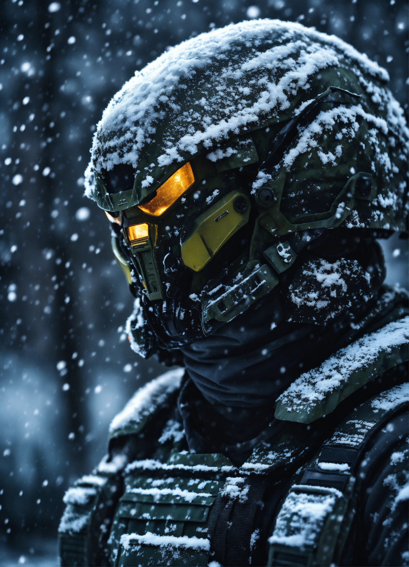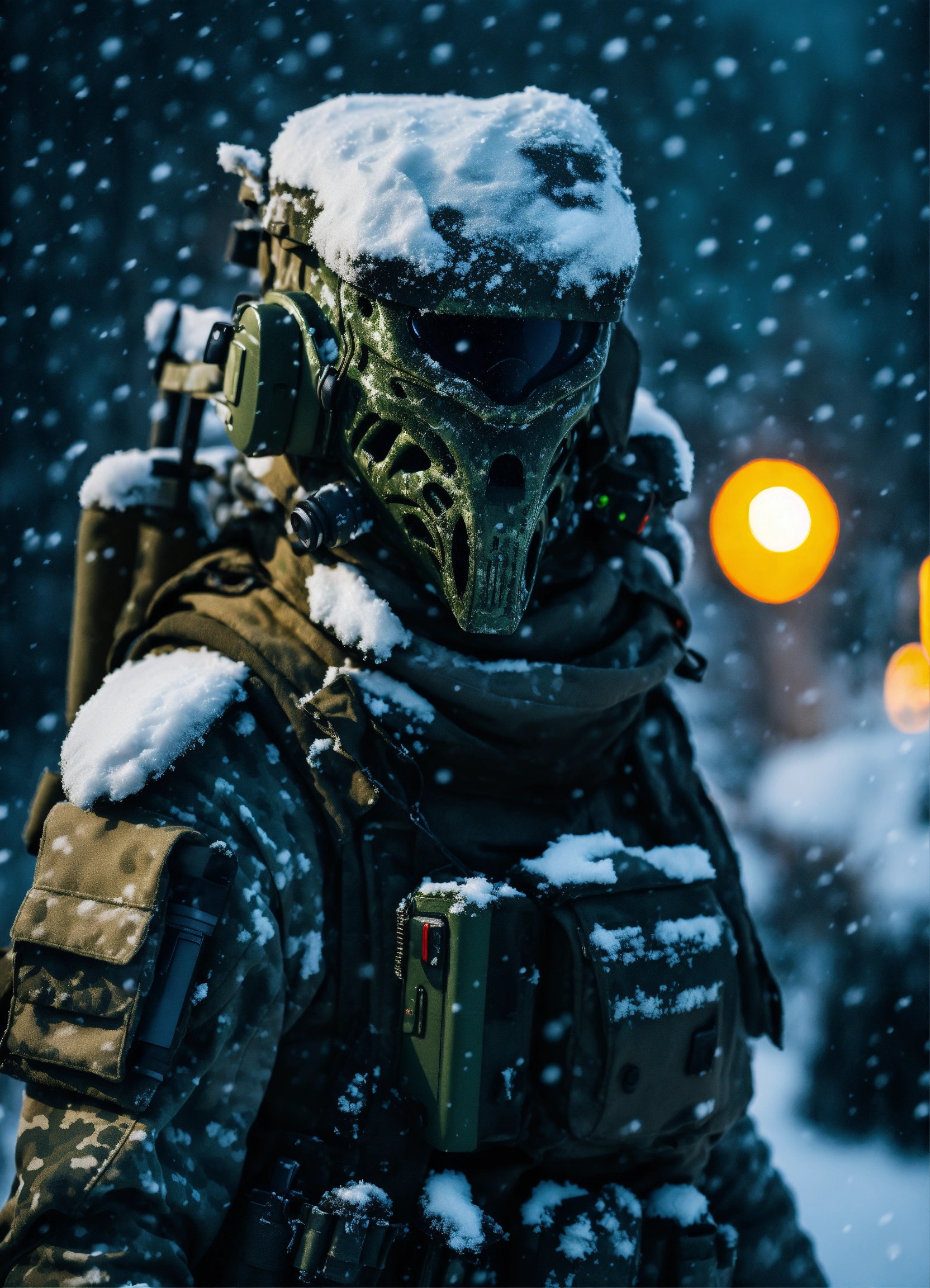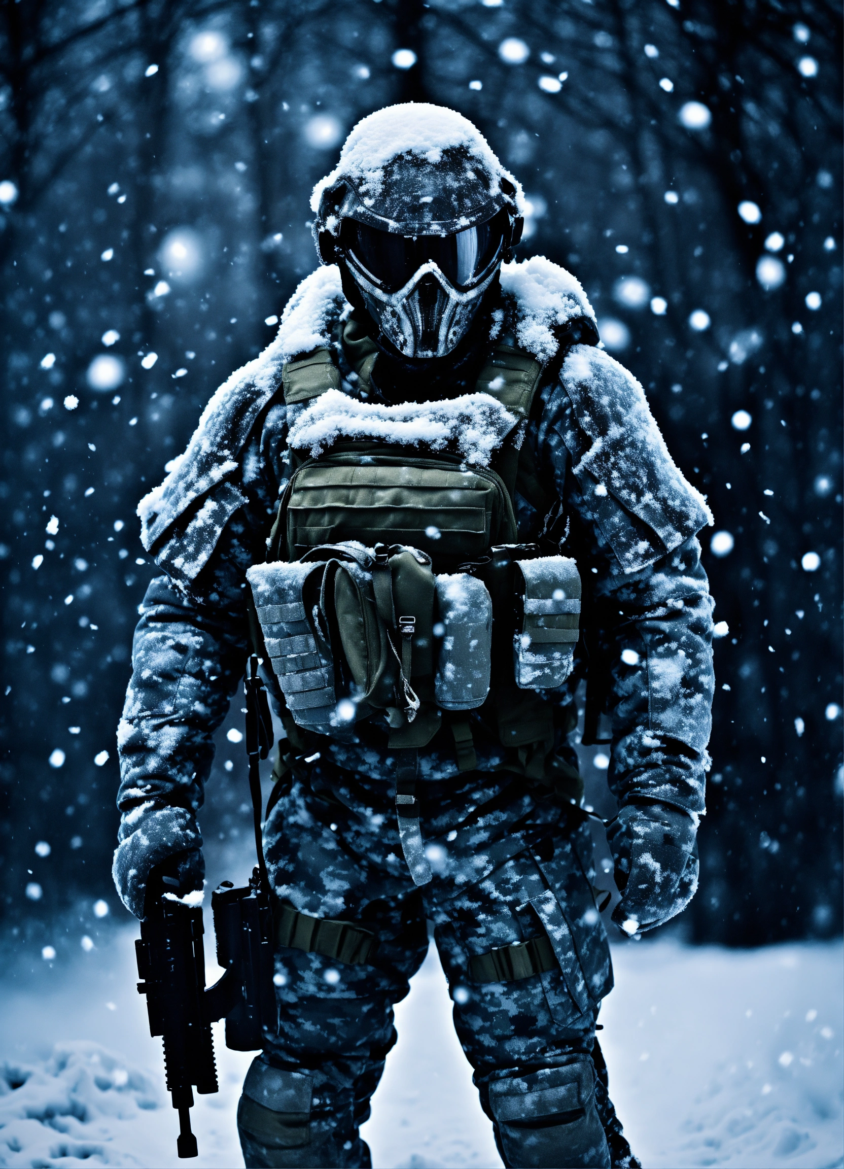 A alien soldier monster, wearing winter camo military gear, during a snow storm, dark lighting, full body portrait, intricate details, depth of field, in a cold snowstorm, outdoors, night