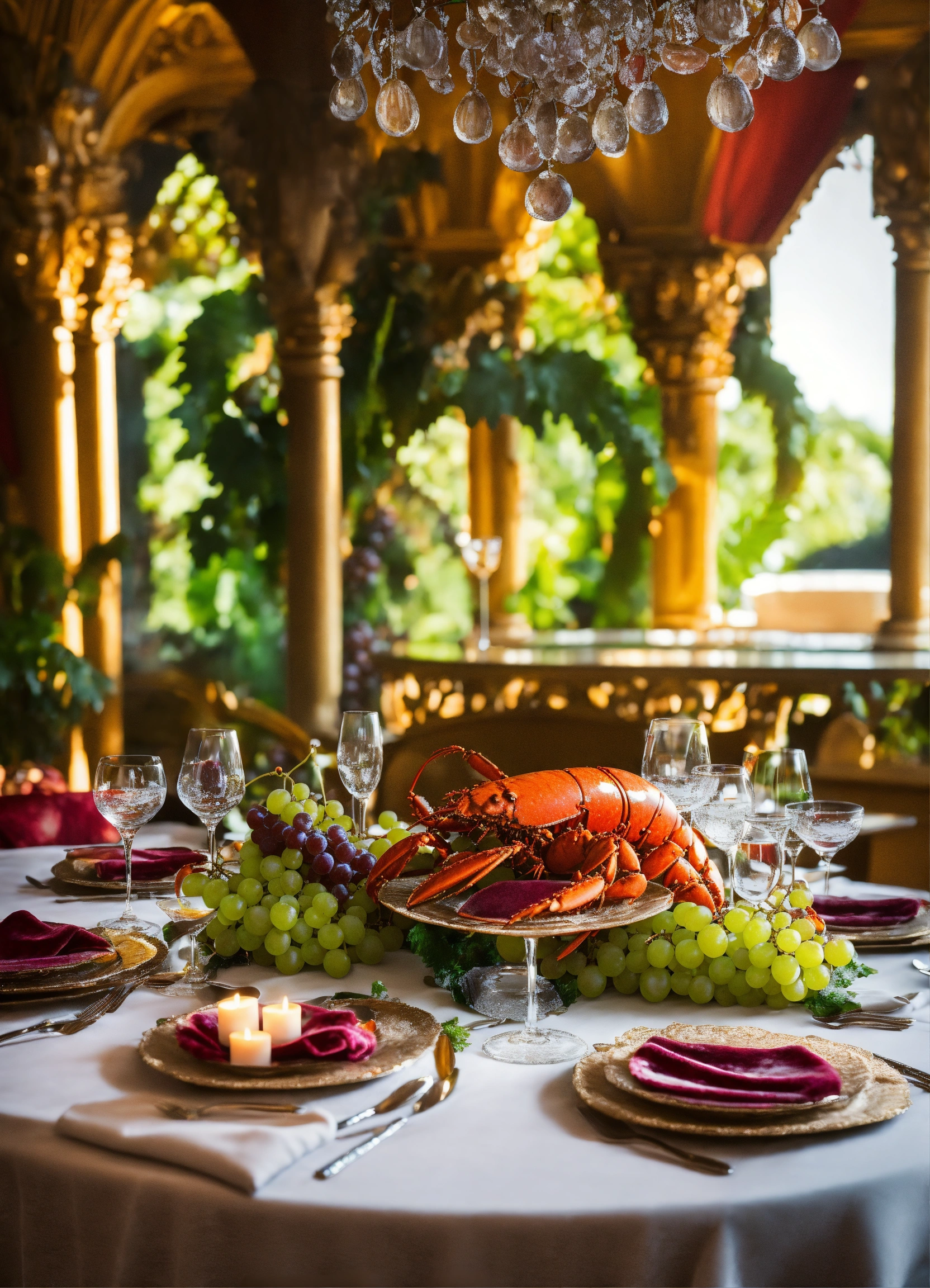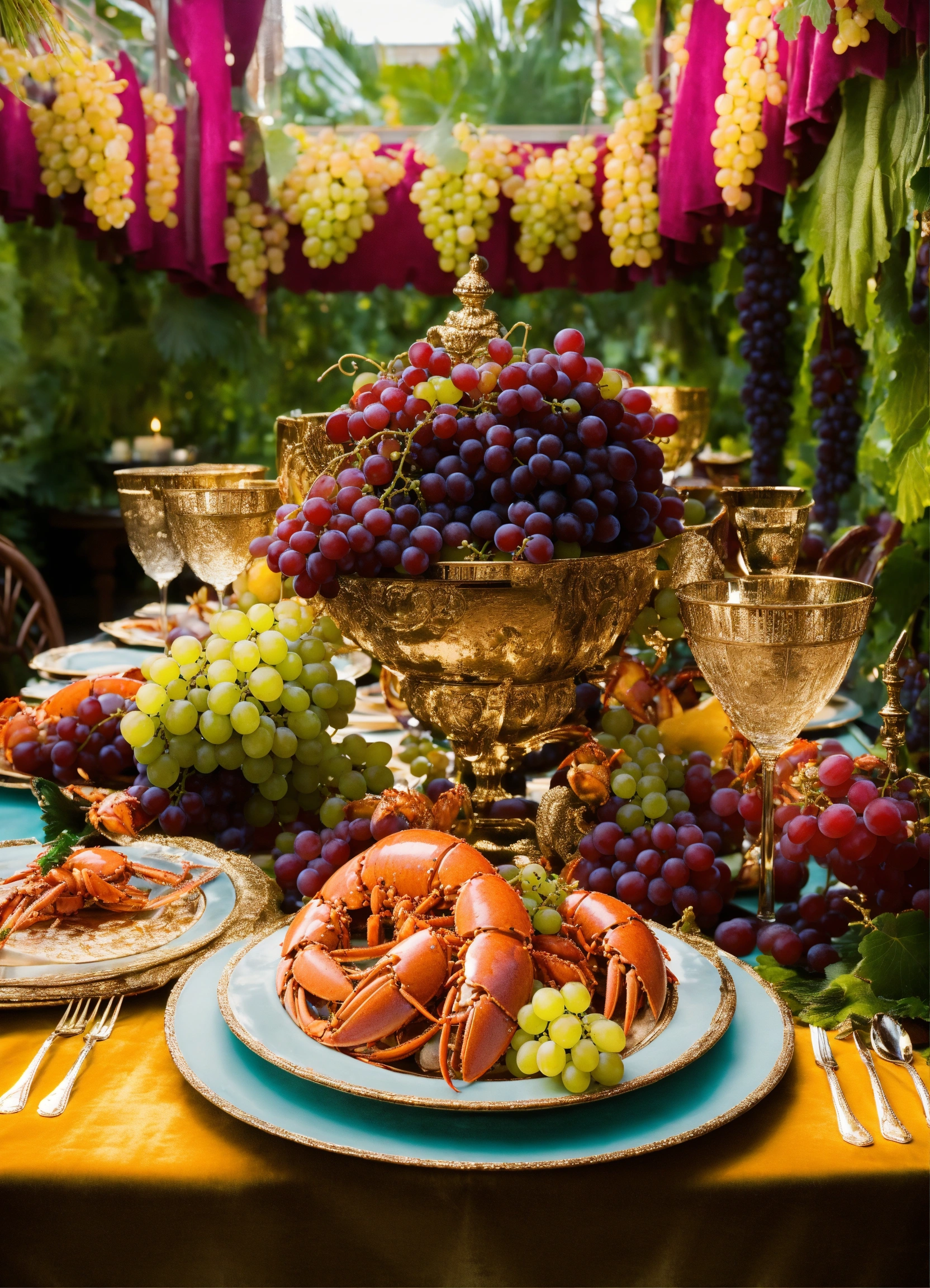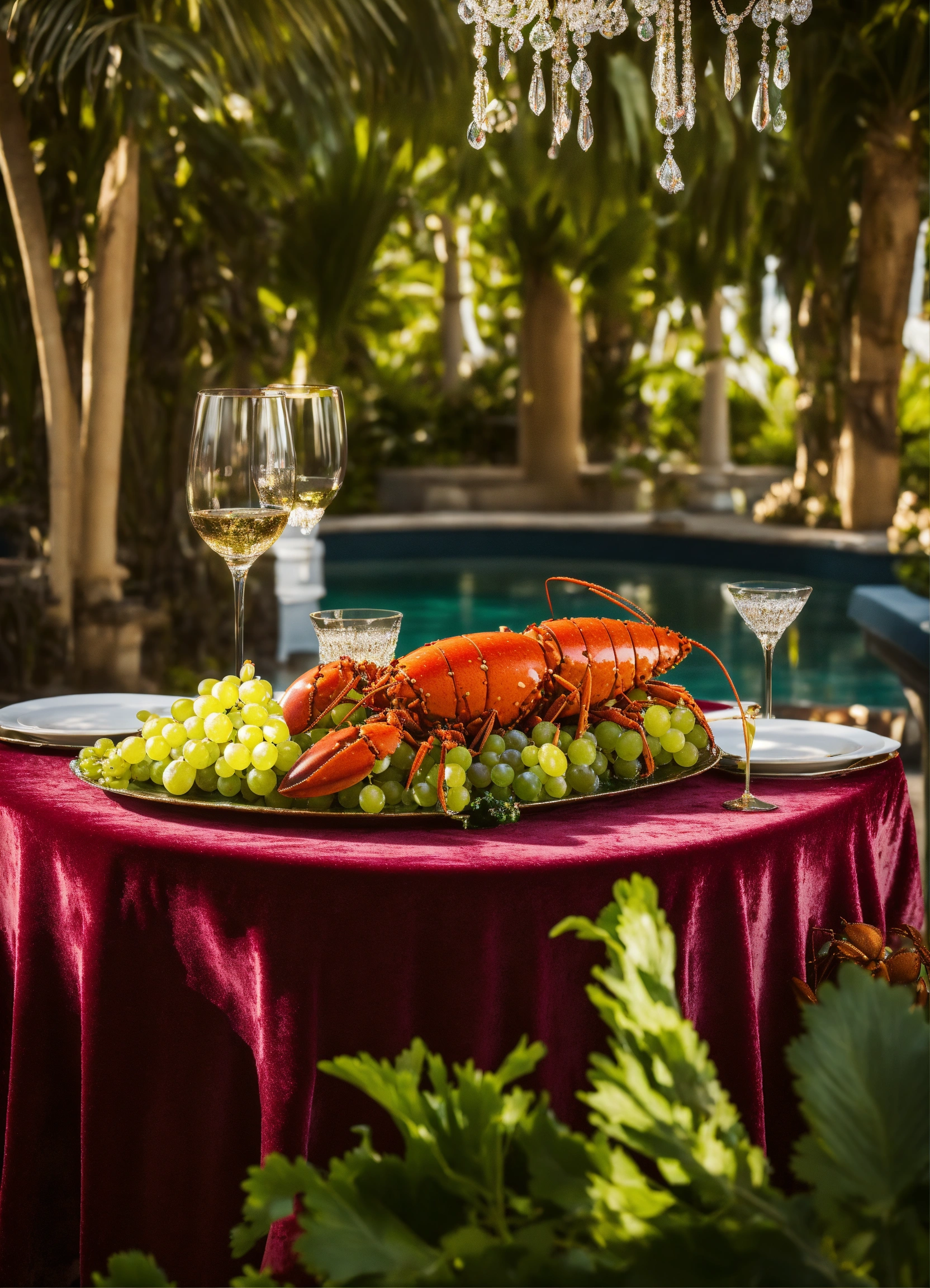 Decadent table with grapes, lobster, food canopy, tropical background, affluent spread, posh food, fine dining, rich decor, expensive table, velvet tablecloth