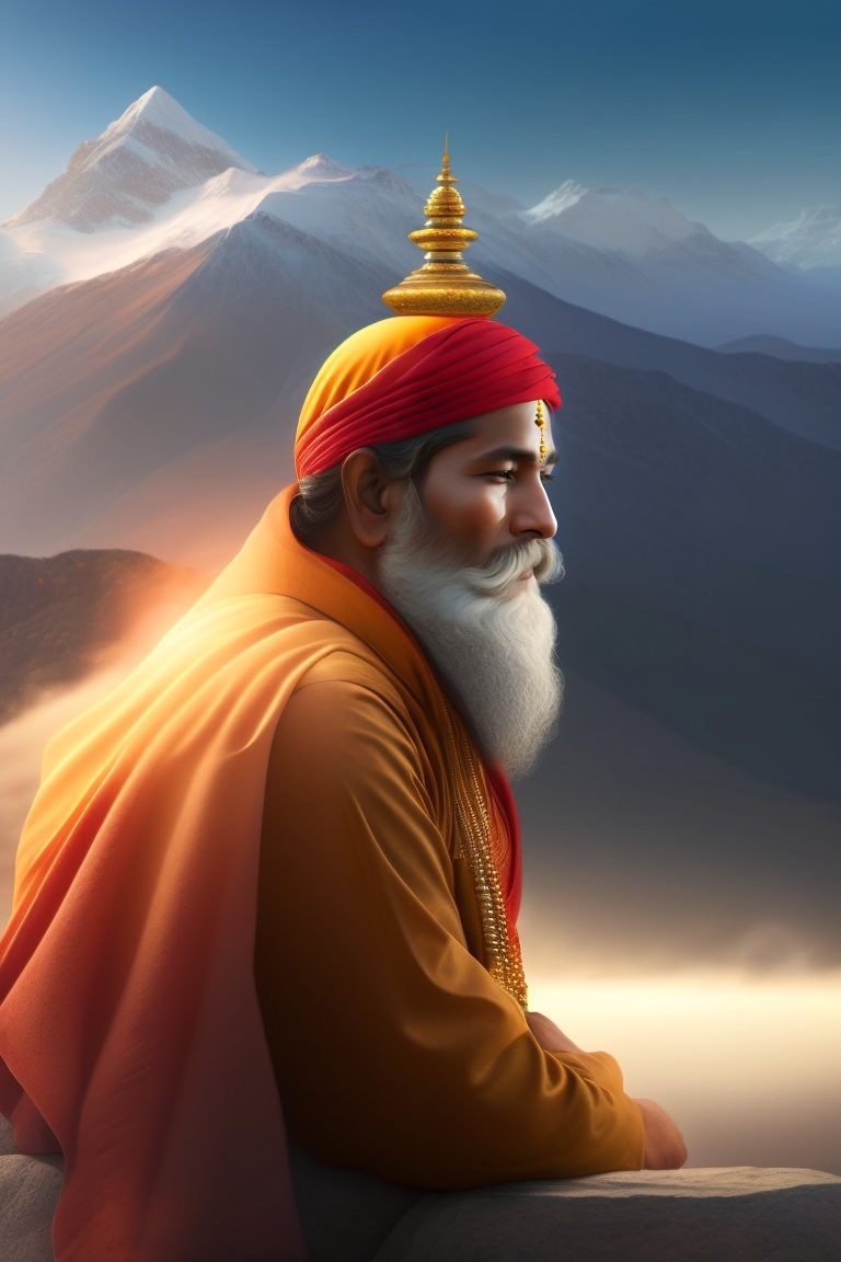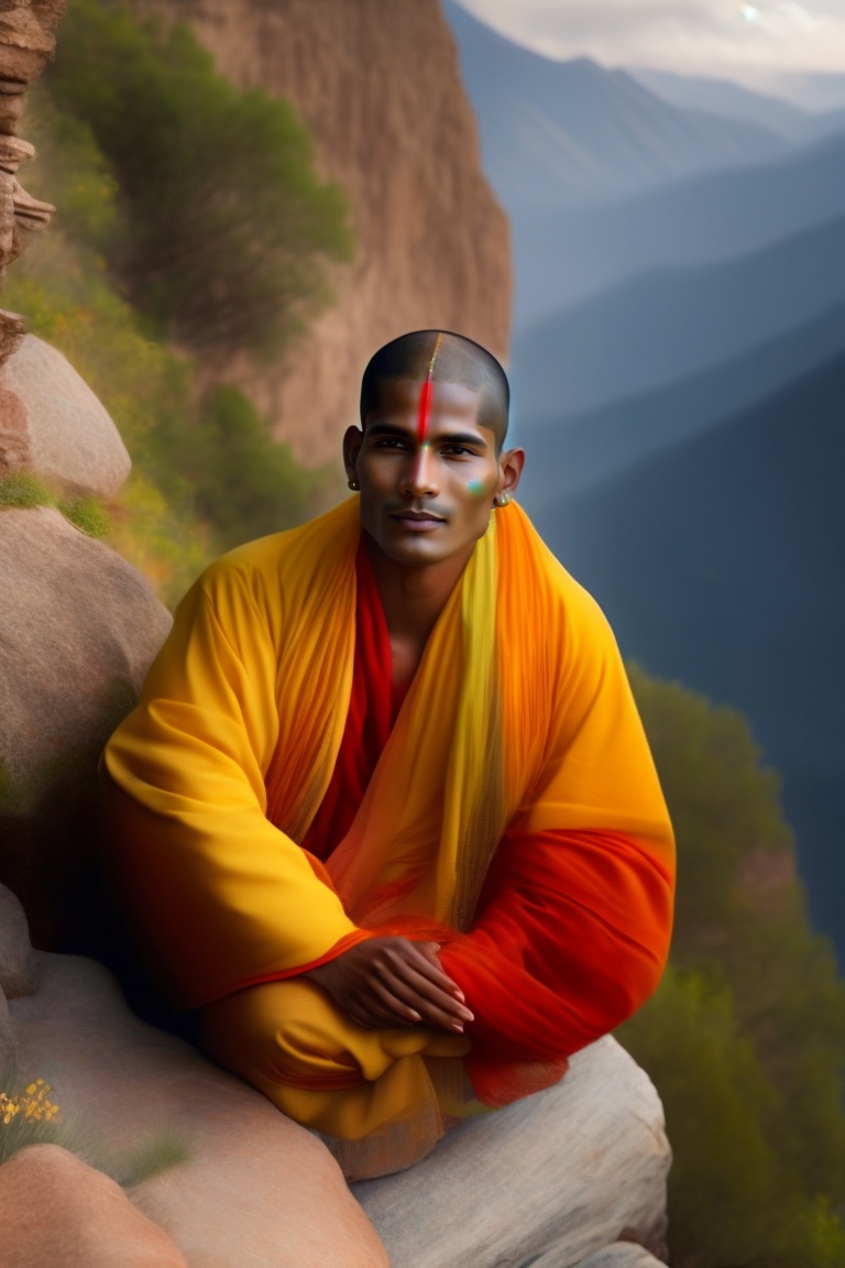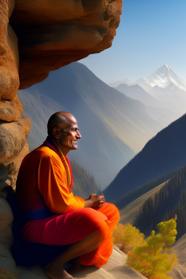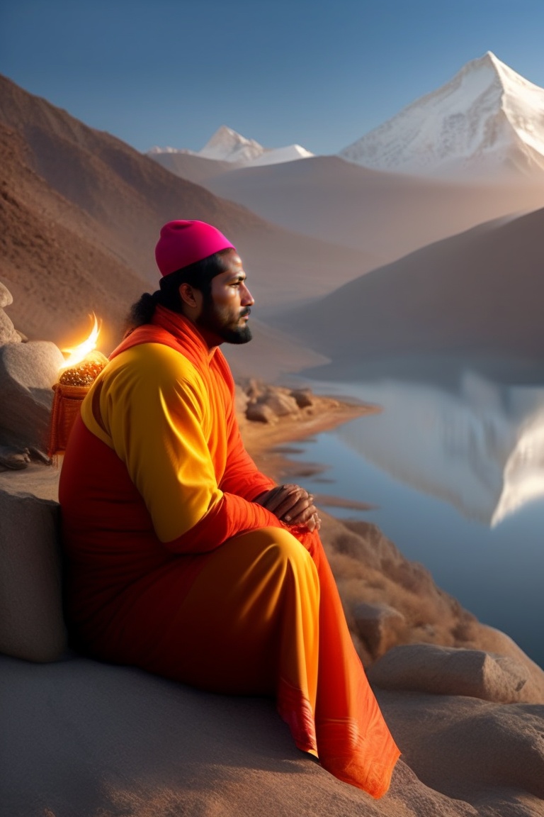 "Write a description highlighting the challenges and struggles faced by a Hindu sanyasi monk near the Himalayas.