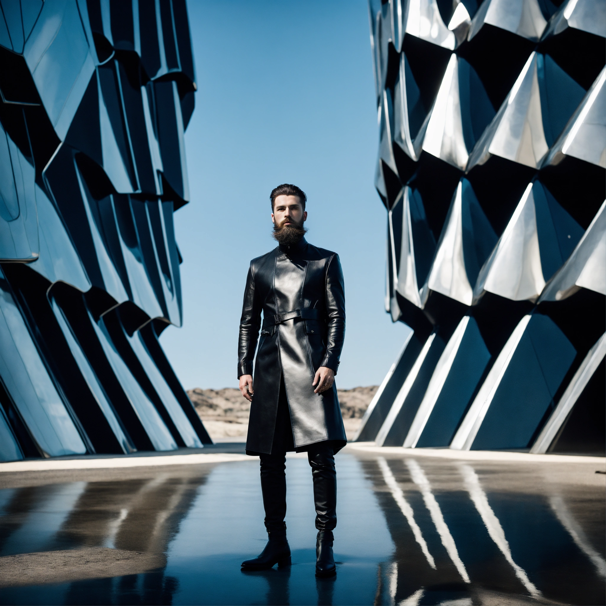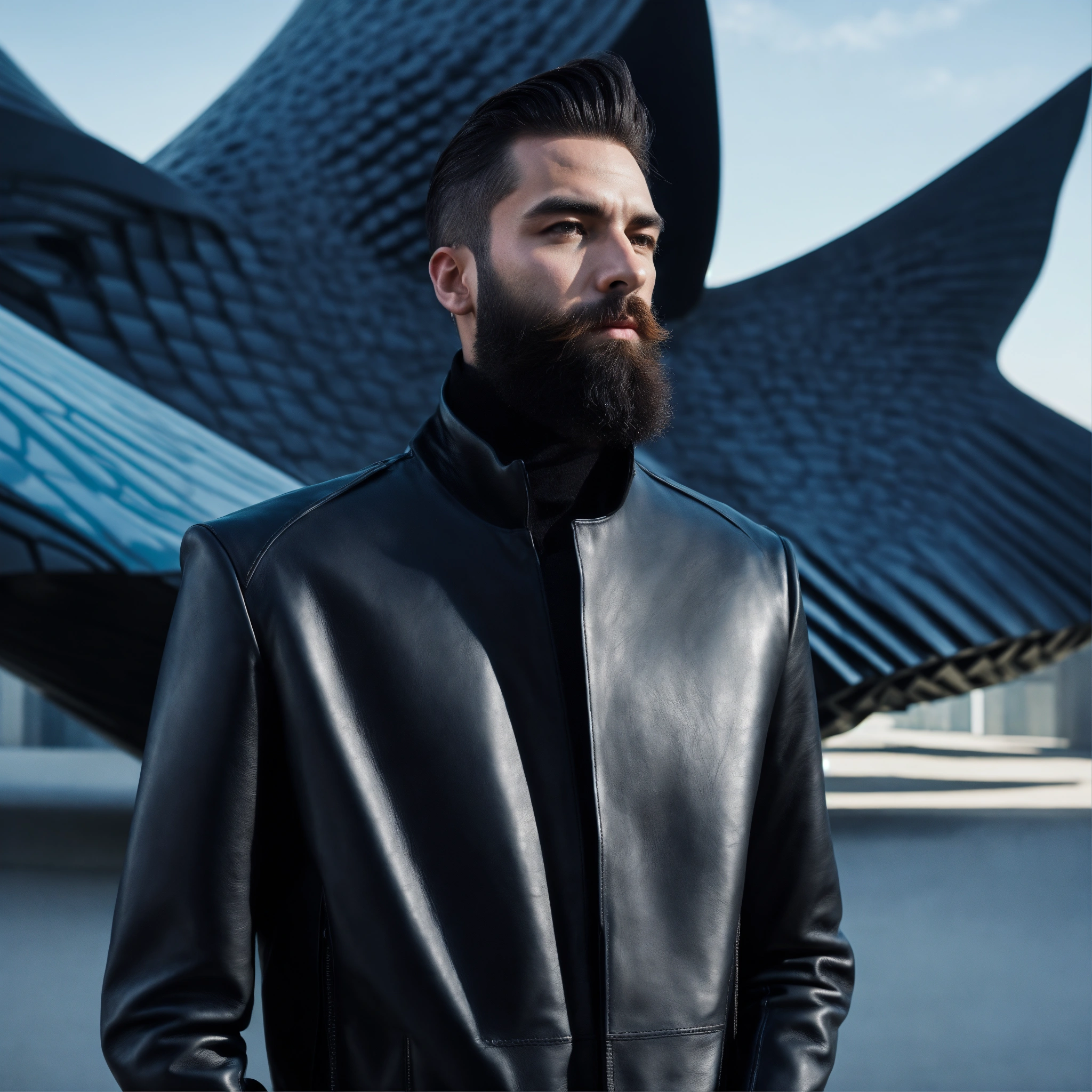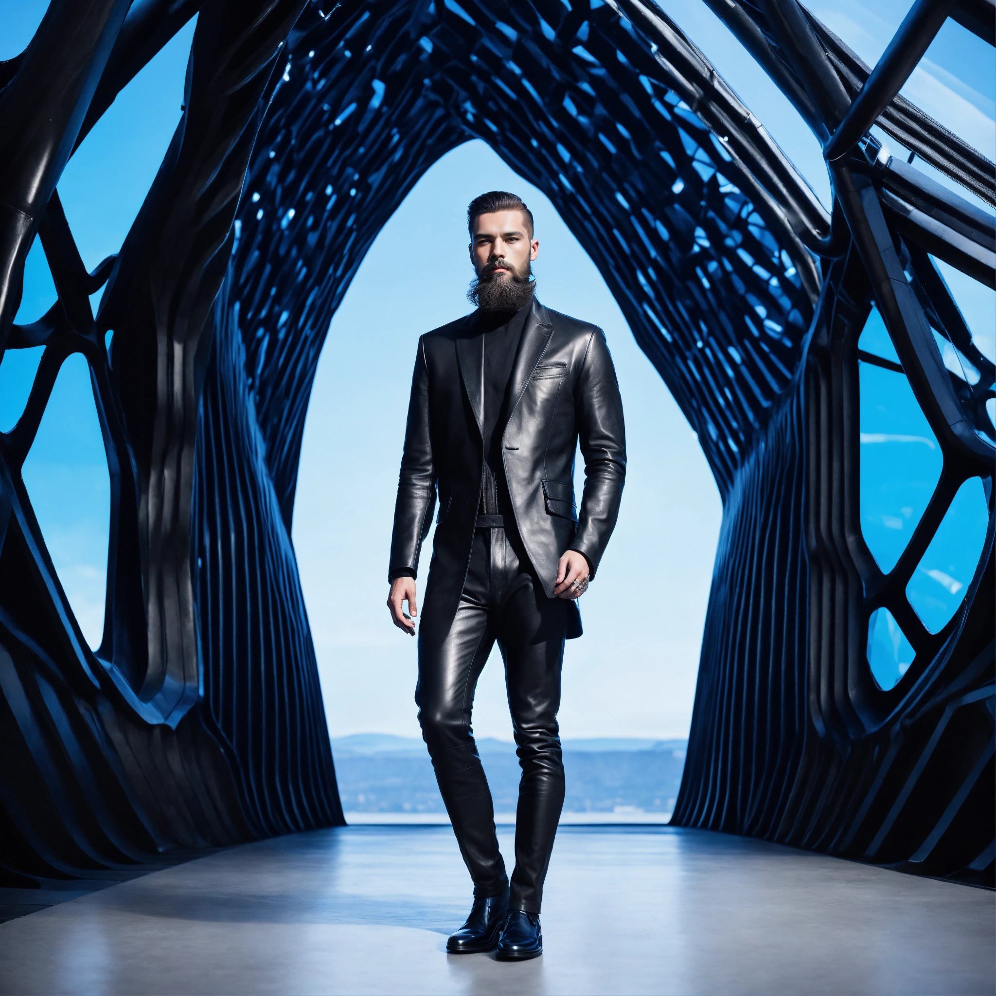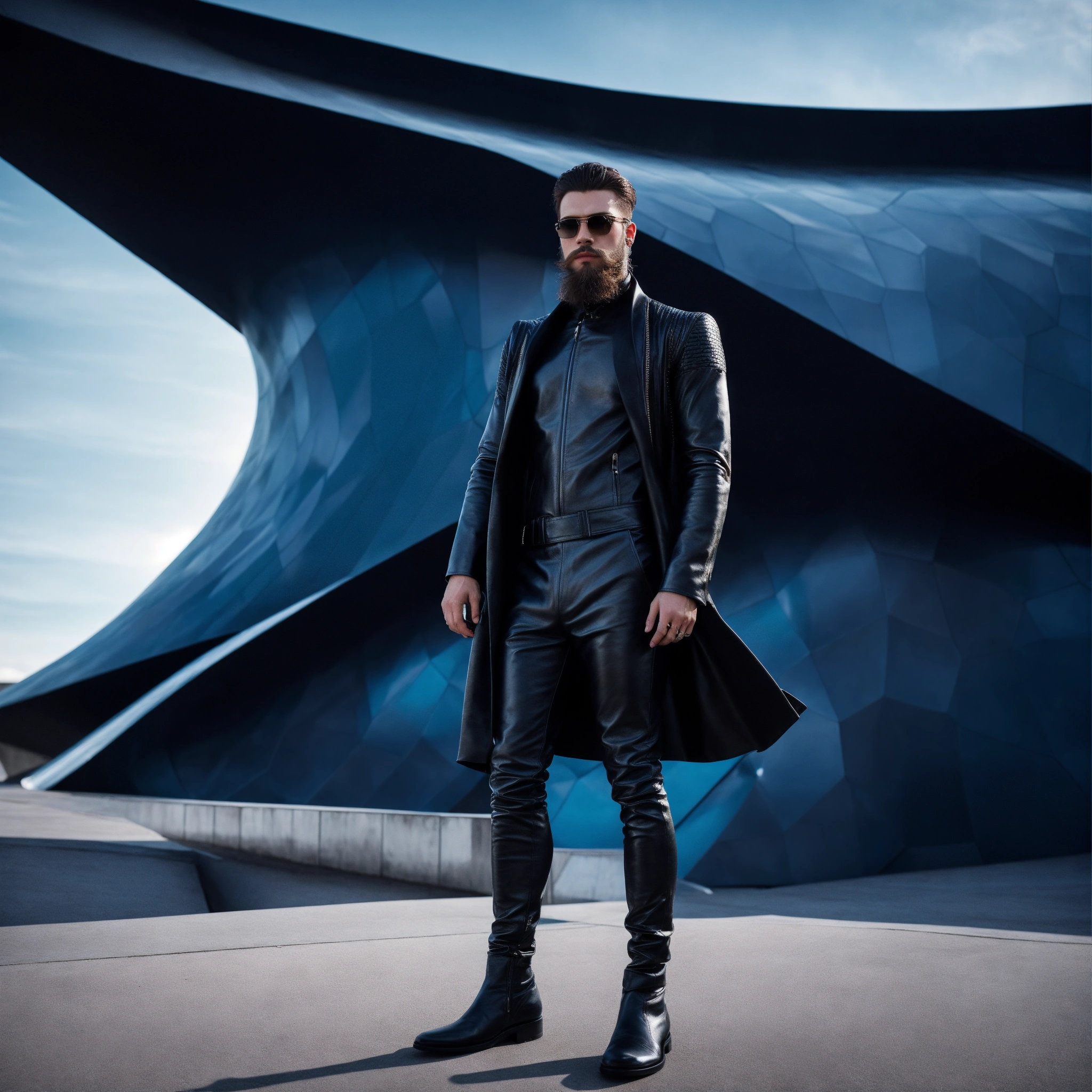 Hyperrealistic haute couture male fashion model wearing black leather outfit with beard . photoshoot in the style of kinfolk magazine in front of parametric futuristic architecture by zaha hadid. surrealism iso 400, surrealistic, 8k, full frame, landscape, architecture, blue wallet