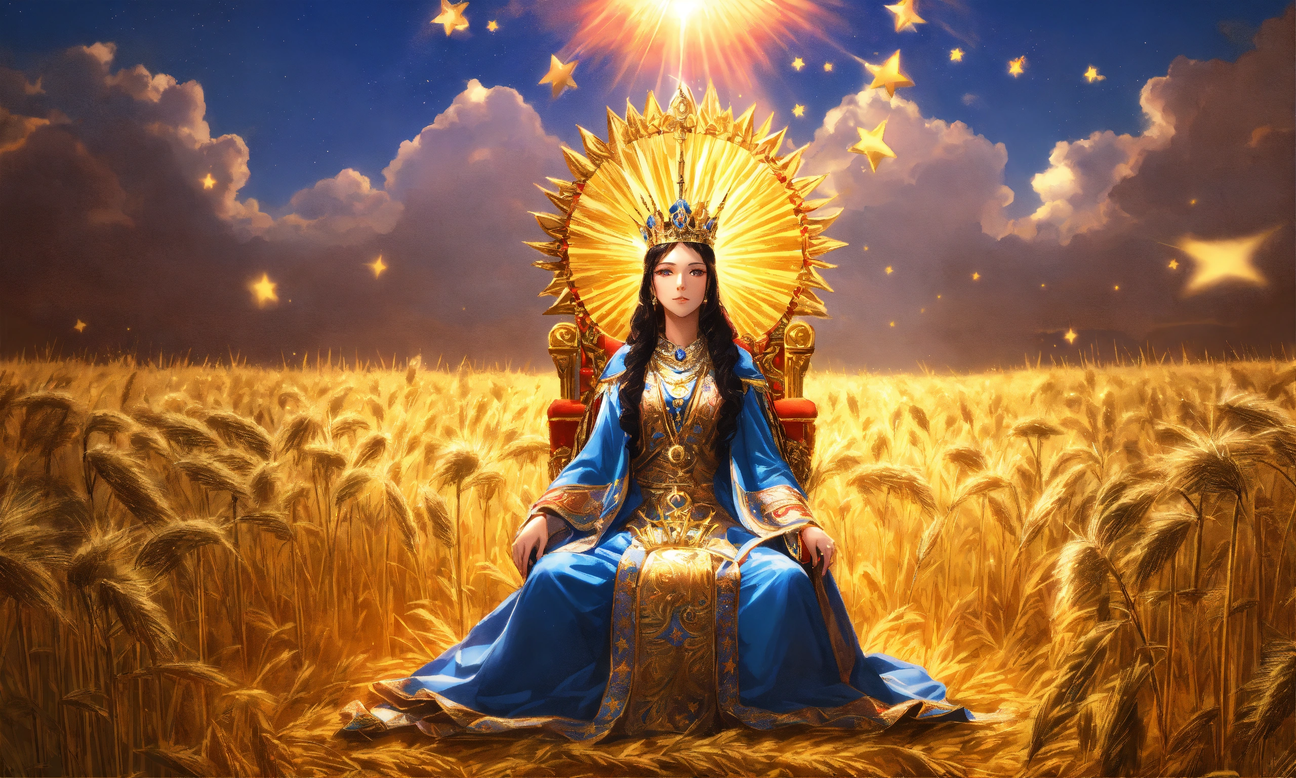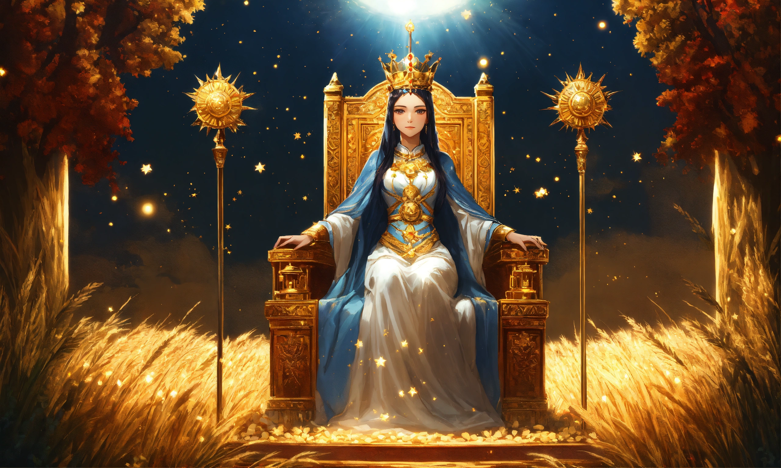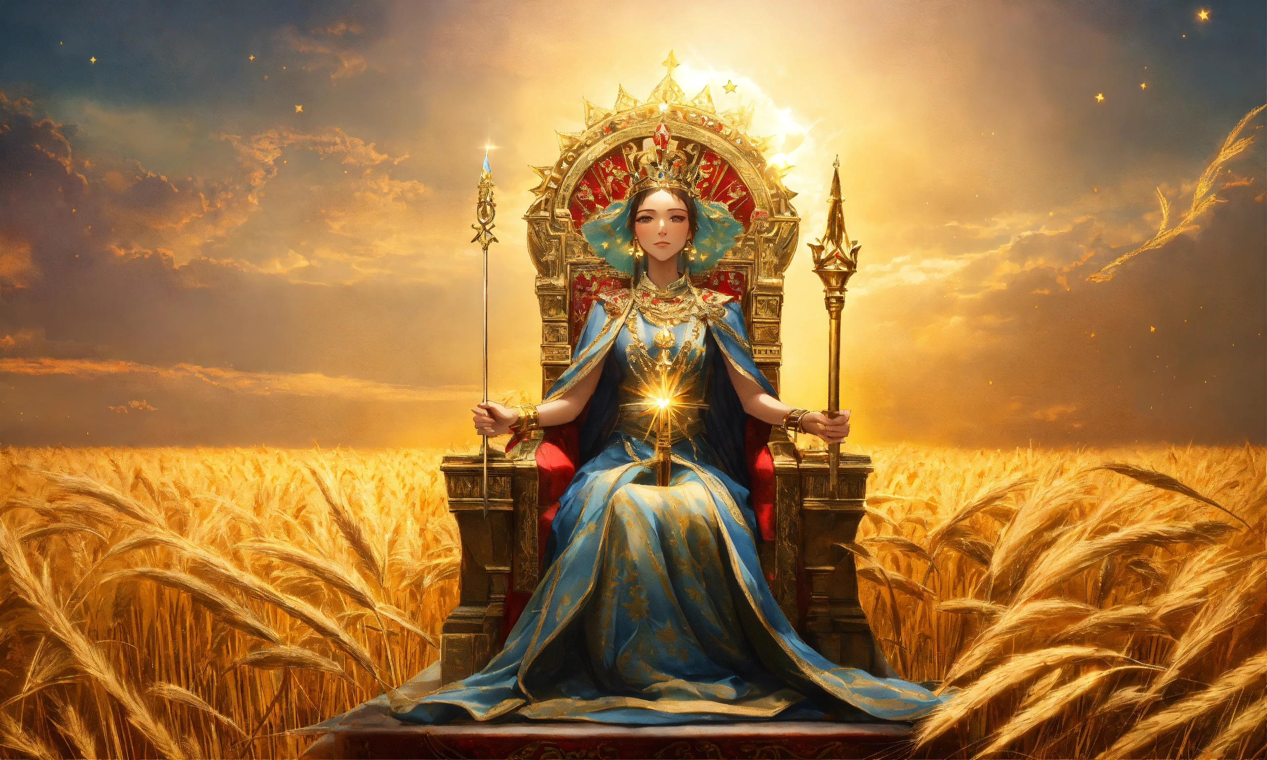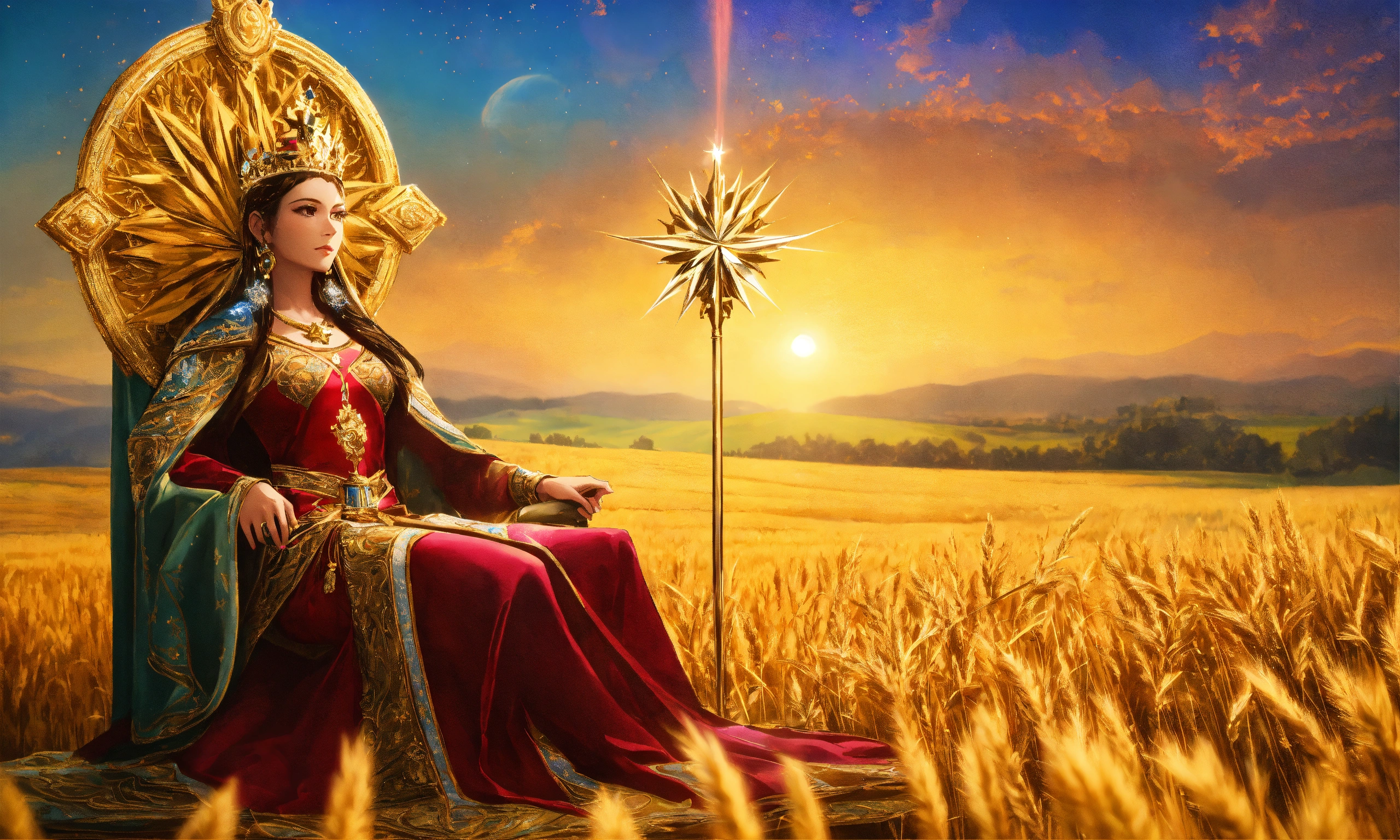The empress sits on a throne wearing a crown with twelve stars, holding a scepter in one hand. the scepter is representative of her power over life, her crown has twelve stars representing her dominance over the year, and her throne is in the midst of a field of grain, representative of her dominion over growing things. the sun is shining above her.