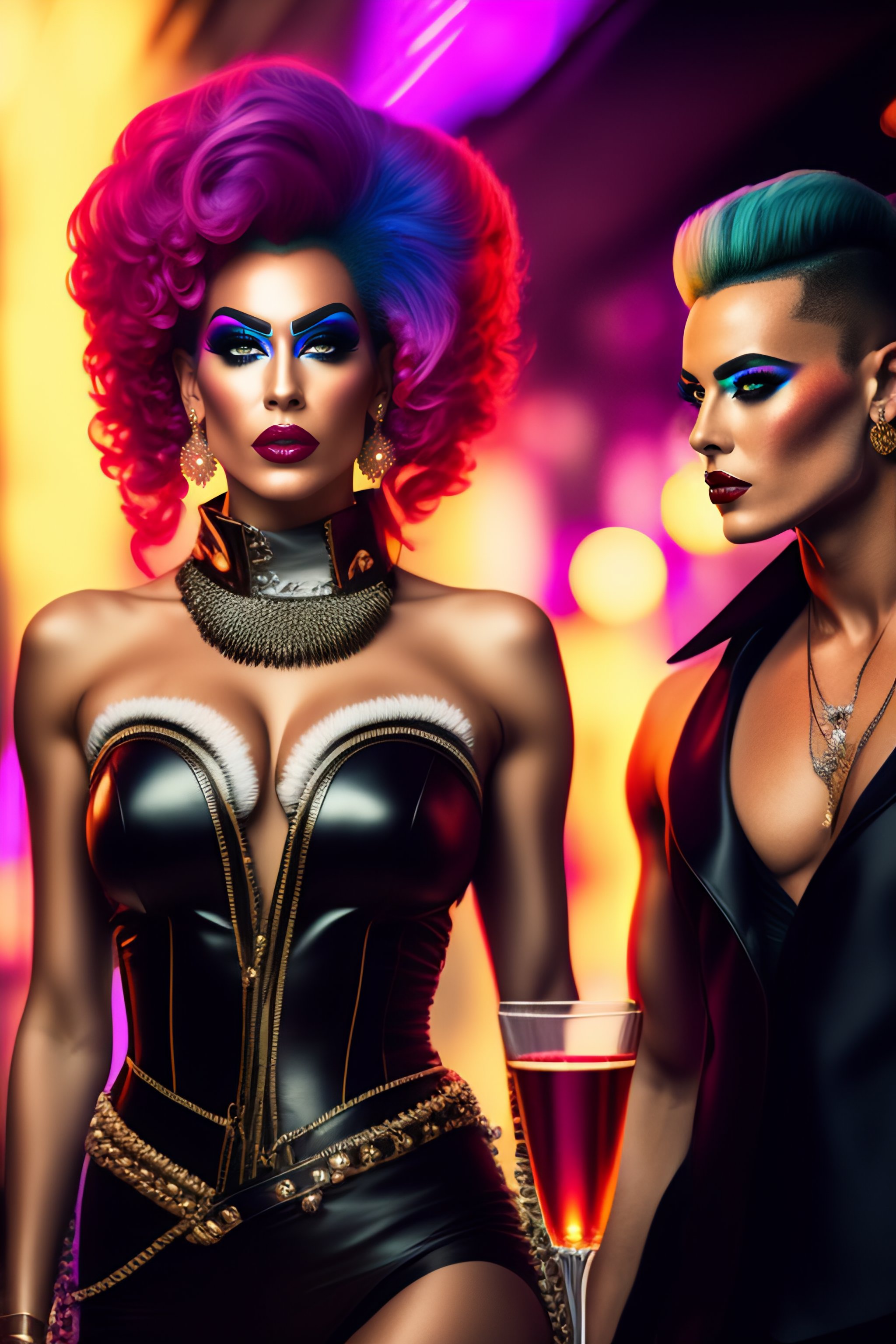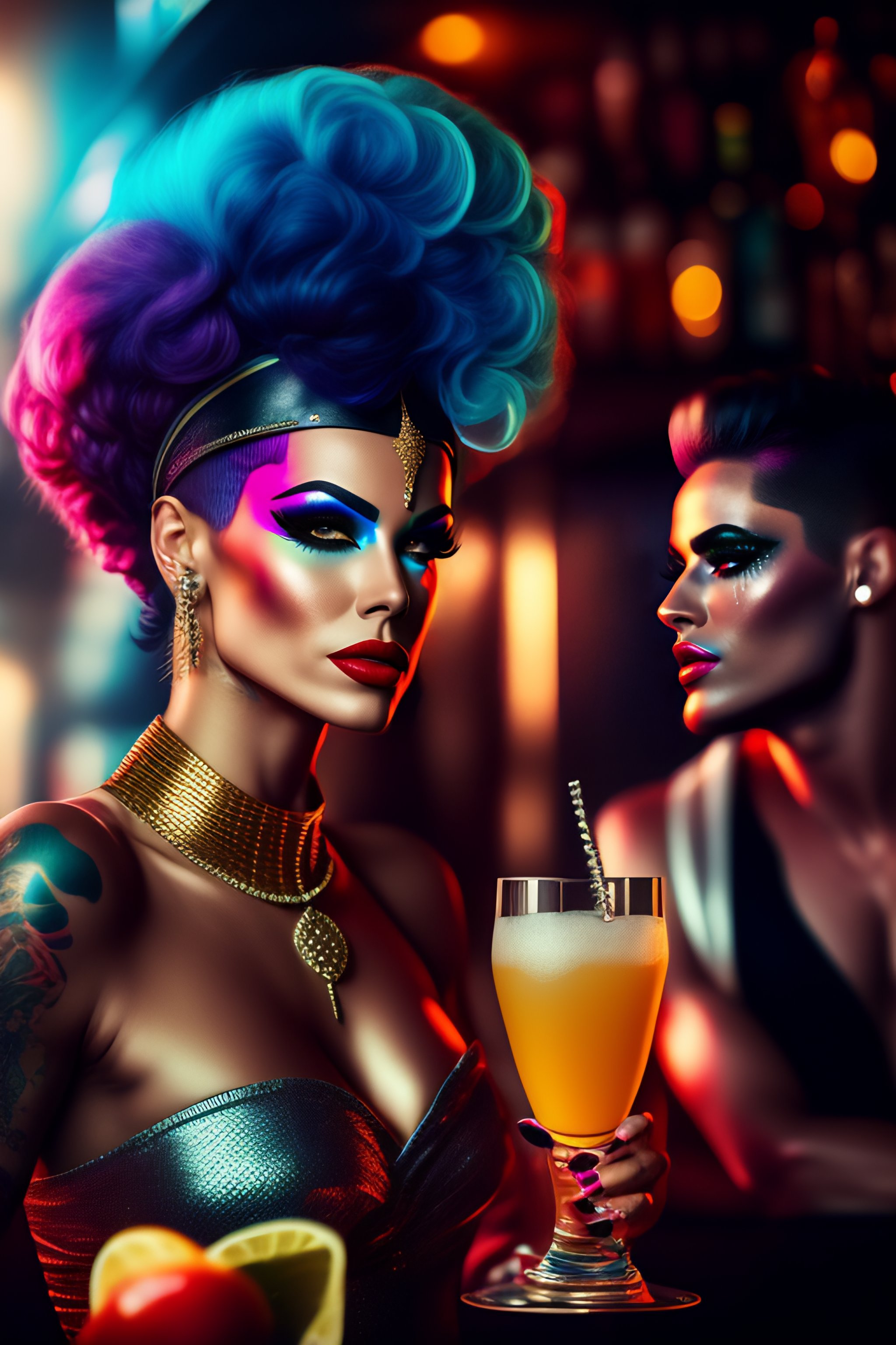 Punk drag queen and man and girls drinking cocktails in ibiza
