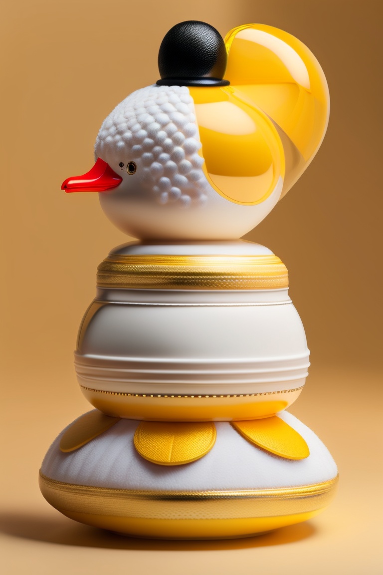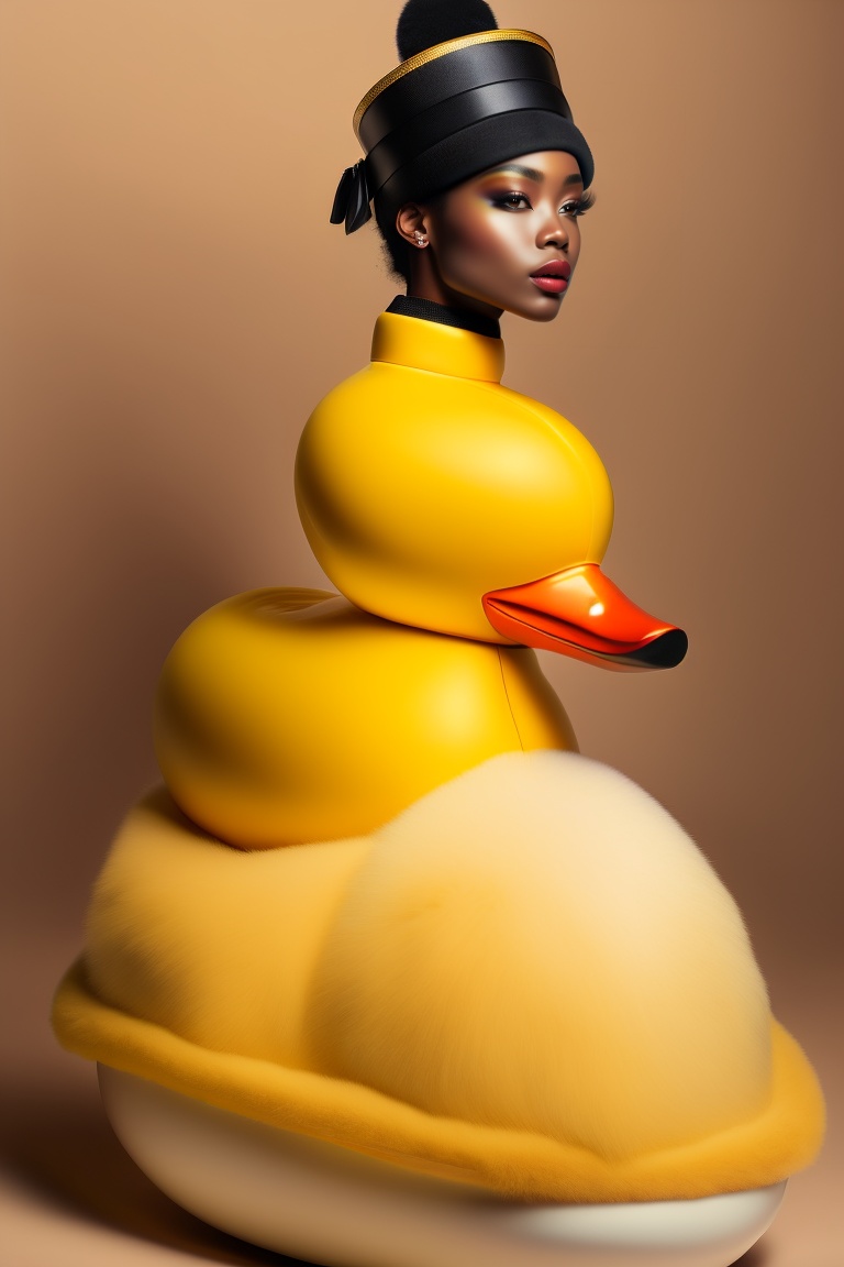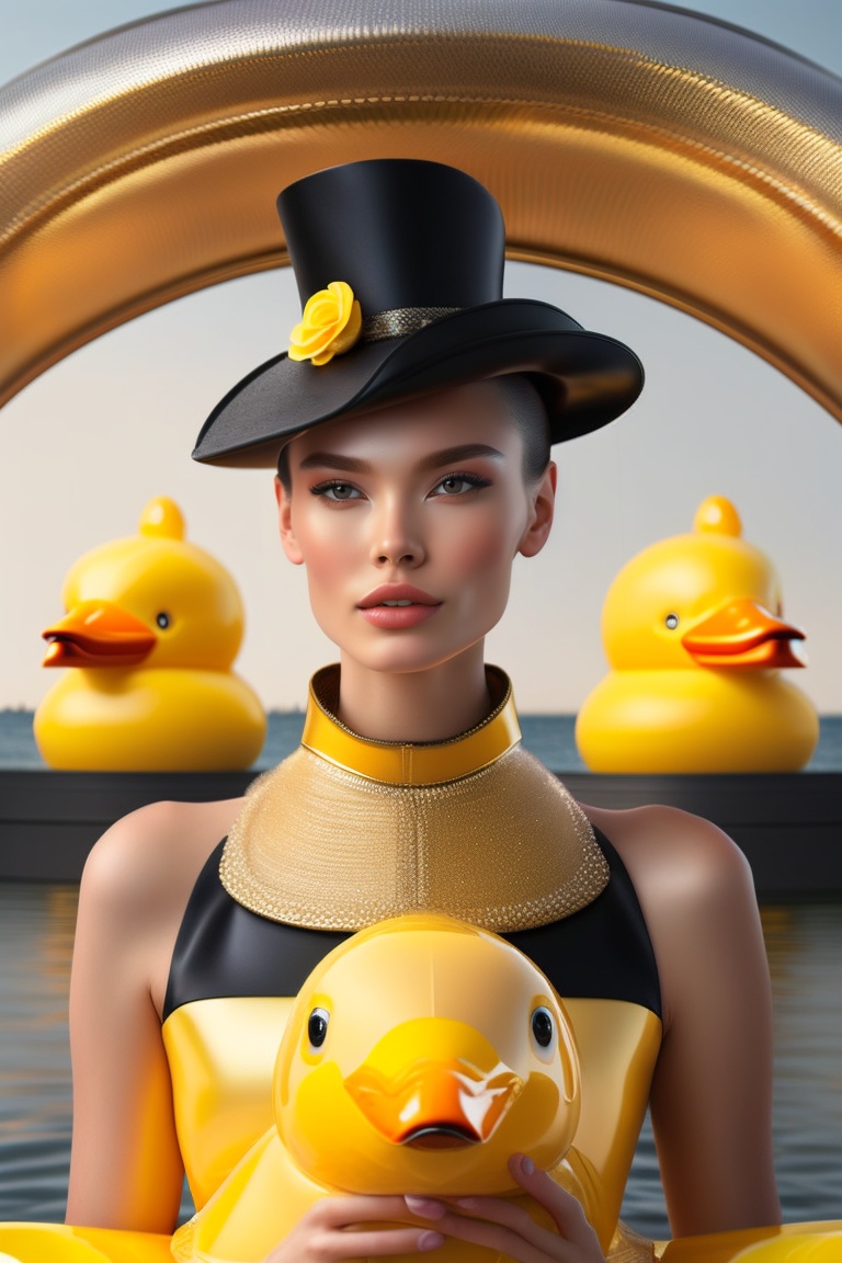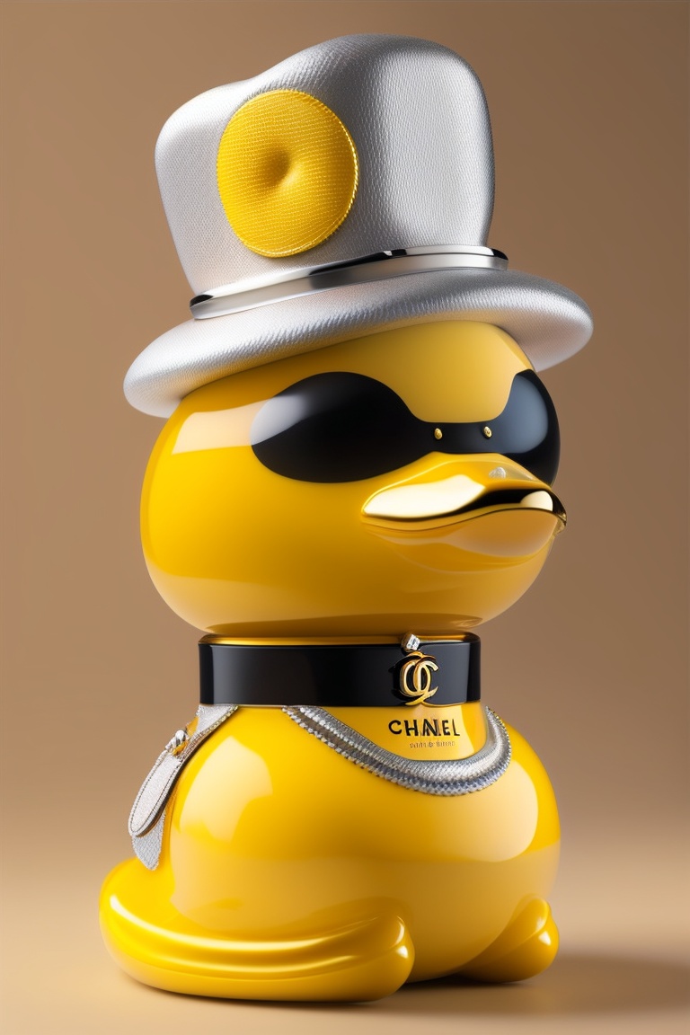 Chanel's duck couture description: explore the intersection of classic elegance and whimsical charm by envisioning a chanel fashion campaign centered around the yellow rubber duck. use ai-generated descriptions to capture the essence of chanel's timeless style, incorporating the duck into haute couture ensembles, accessories, and iconic chanel settings.