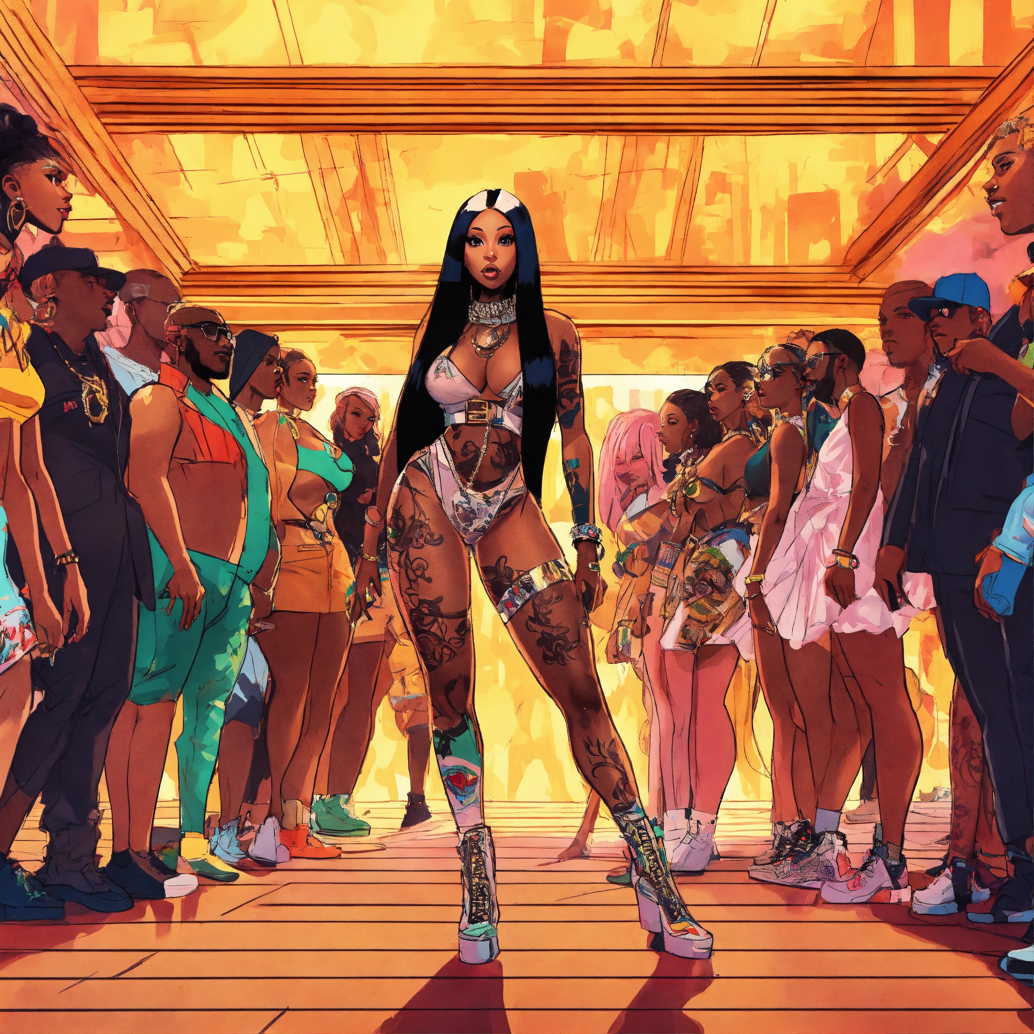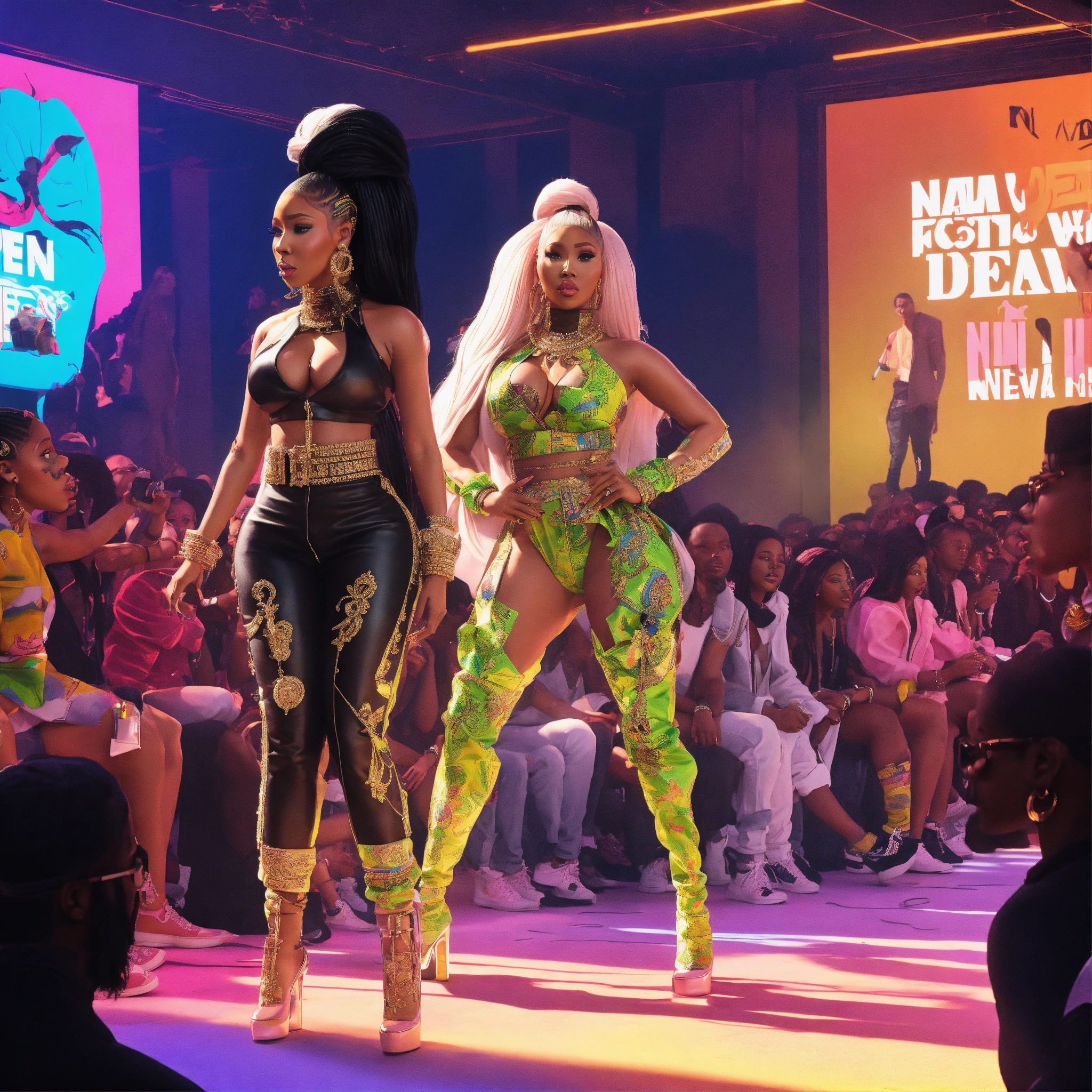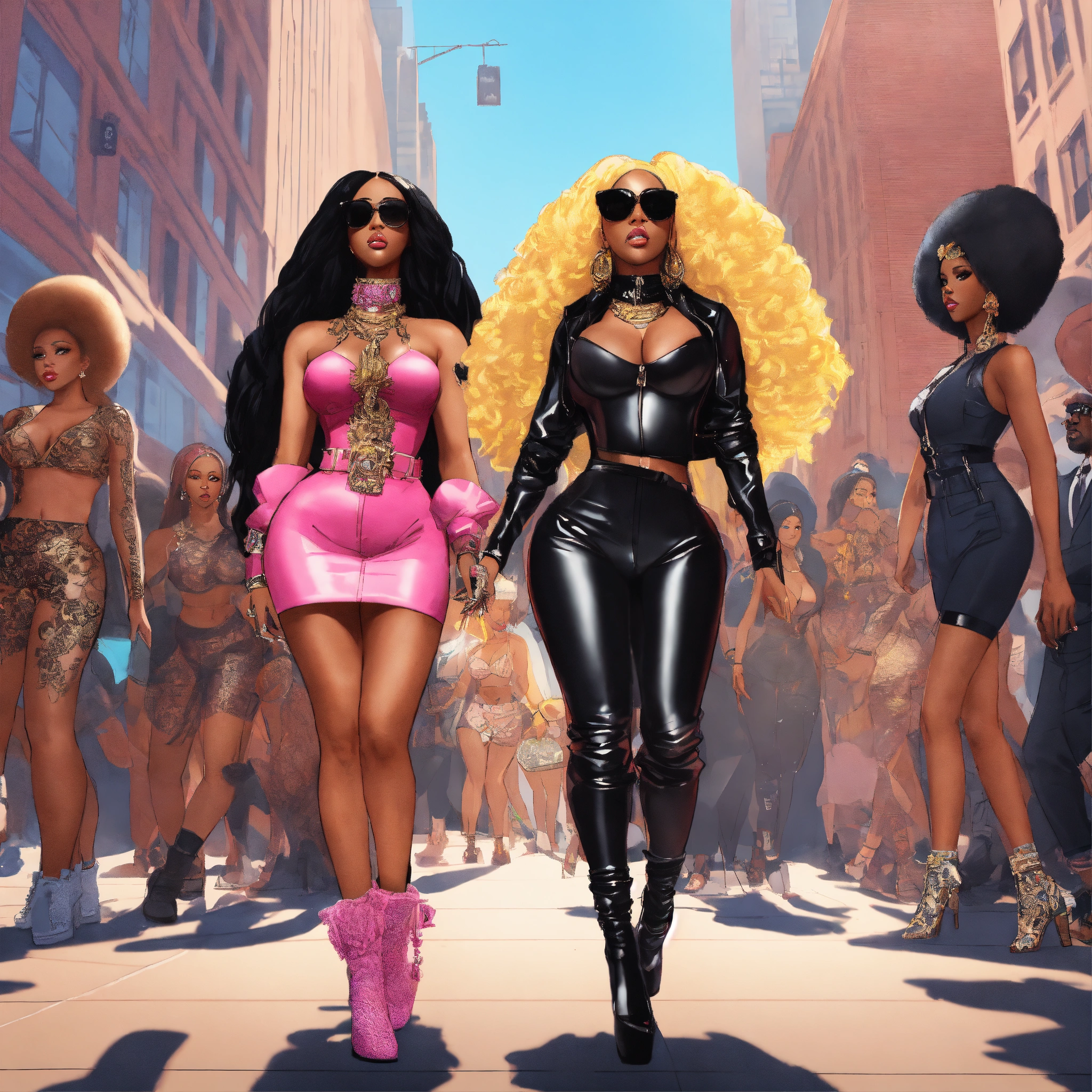 Full body interior view black cartoon of rappers "nicki minaj" fighting "cardi b" in a fashion week in new york city fashion show on a sunny dream like day. concept art, highly detailed, intricate, sharp focus, digital art, 8 k