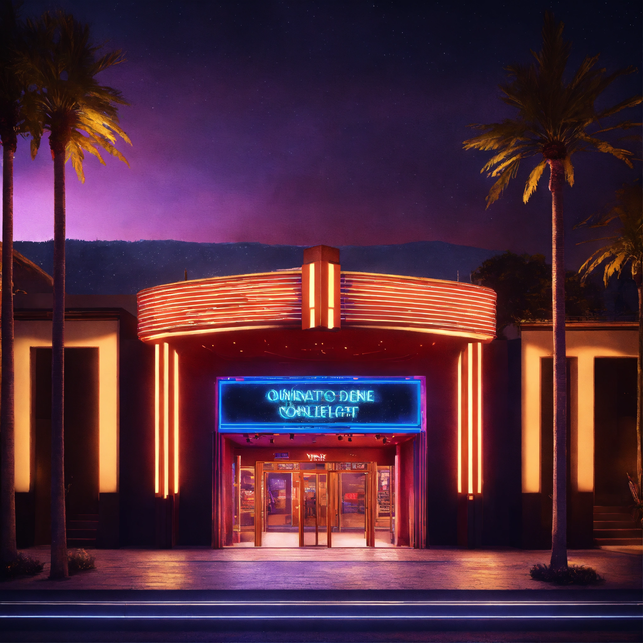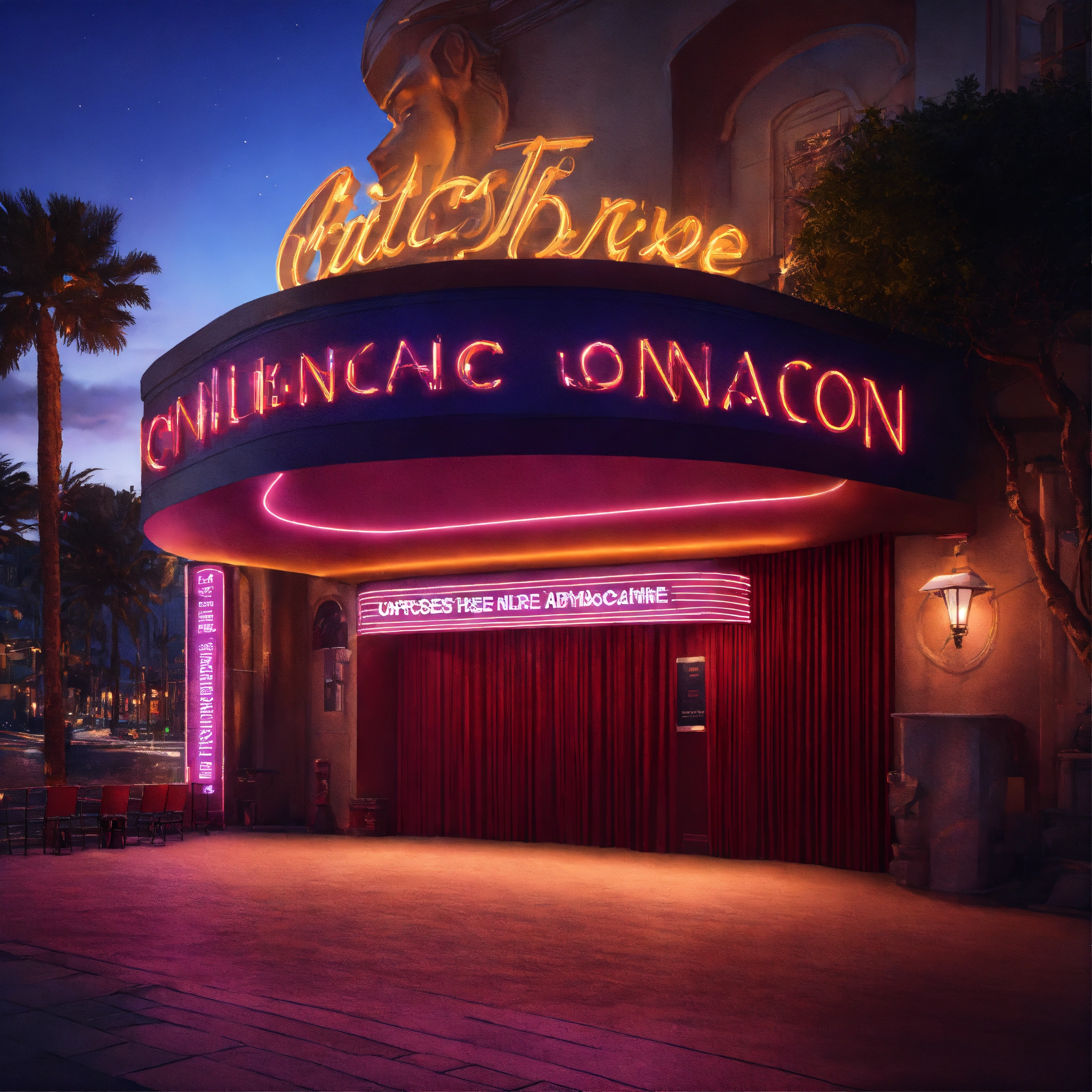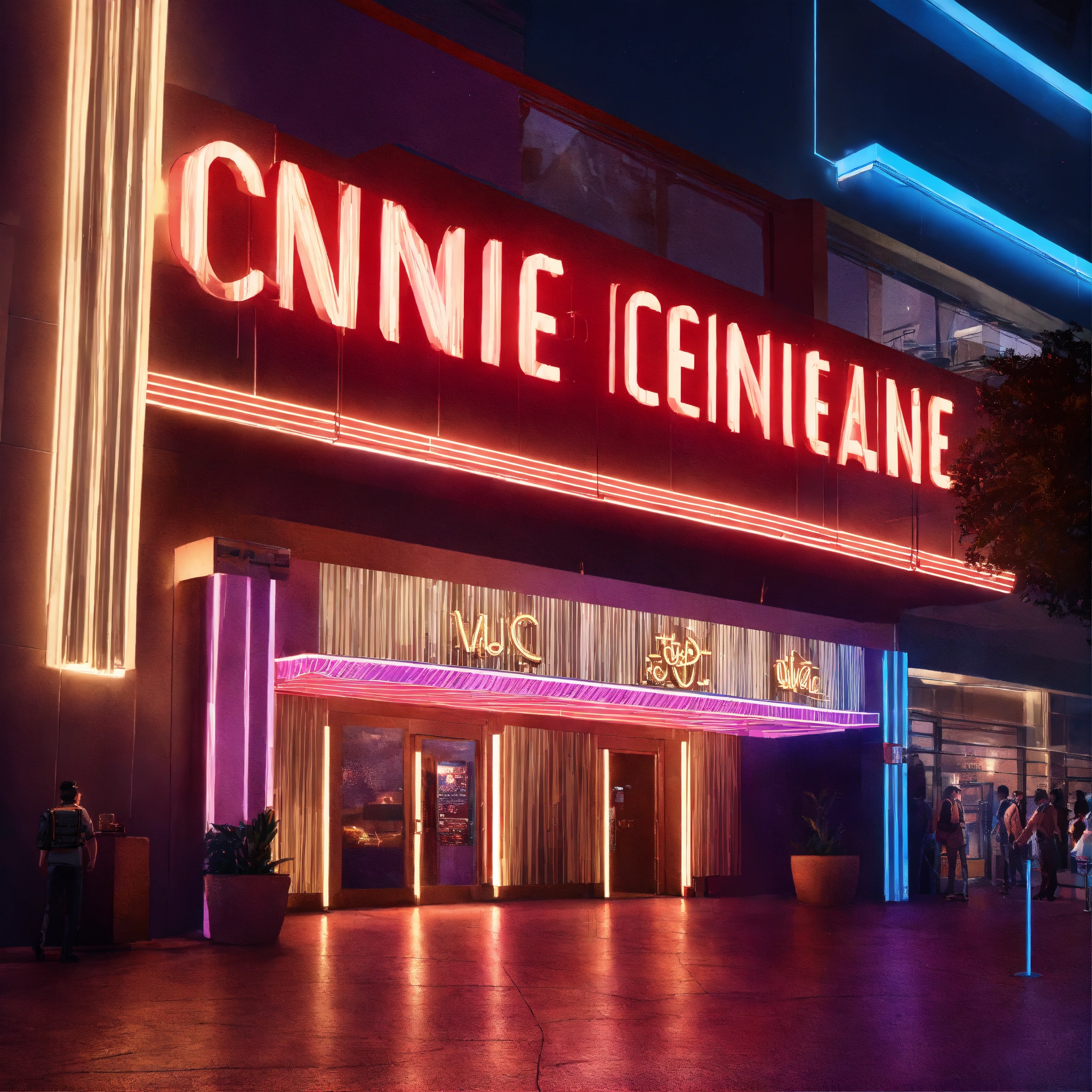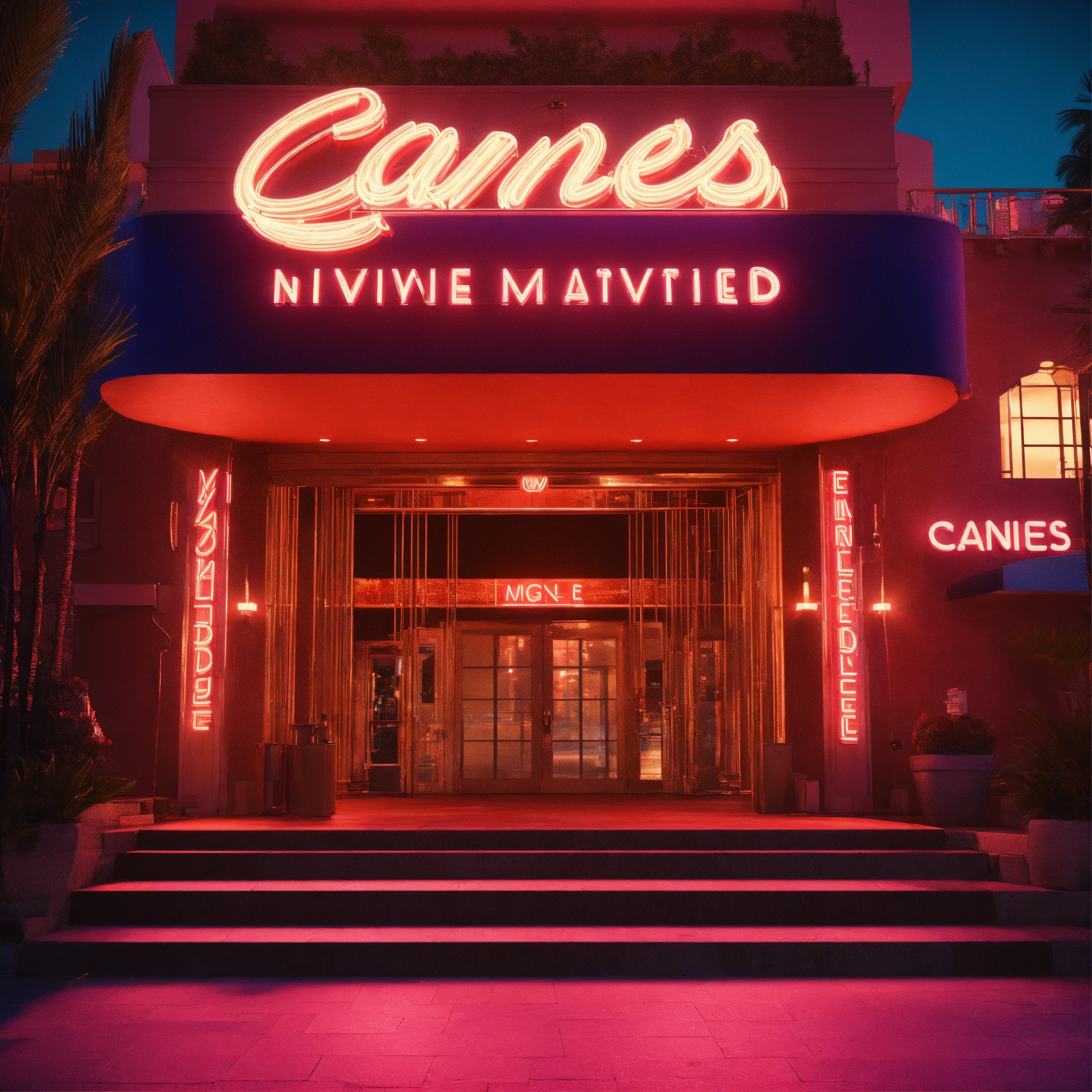 Outdoor entrance movie theater, night, cannes, lettering neon, cinematic lighting, movie theather, vibrant, 8k, unreal engine, wide shot