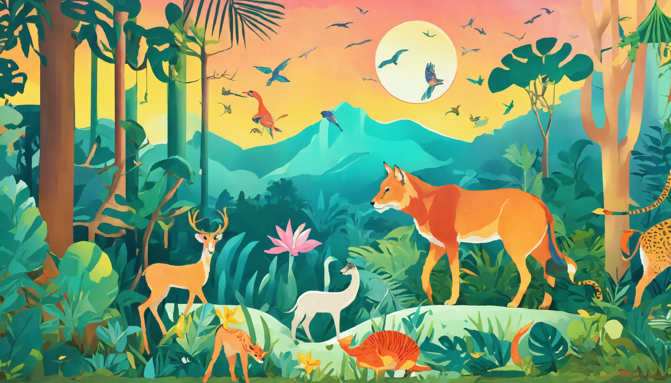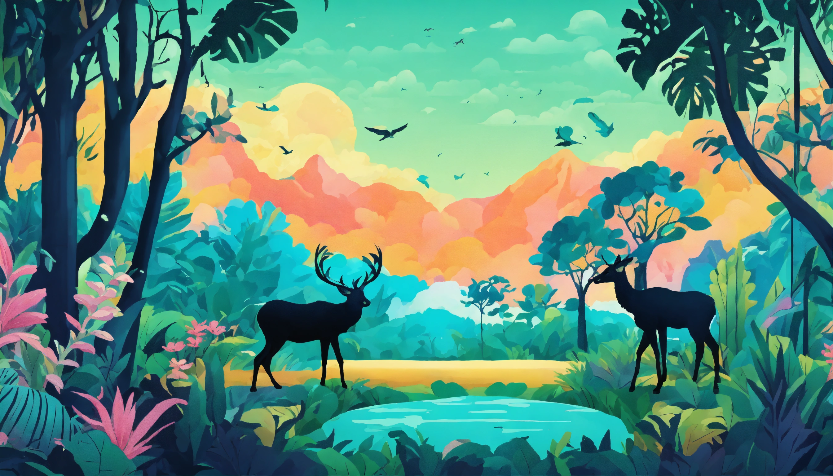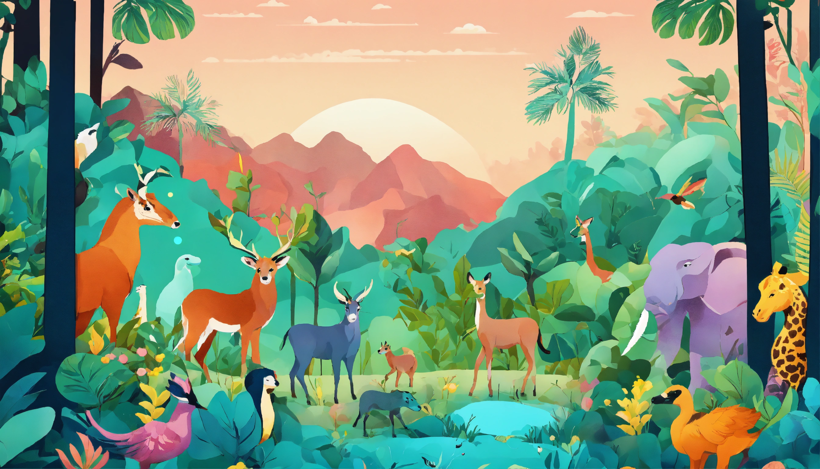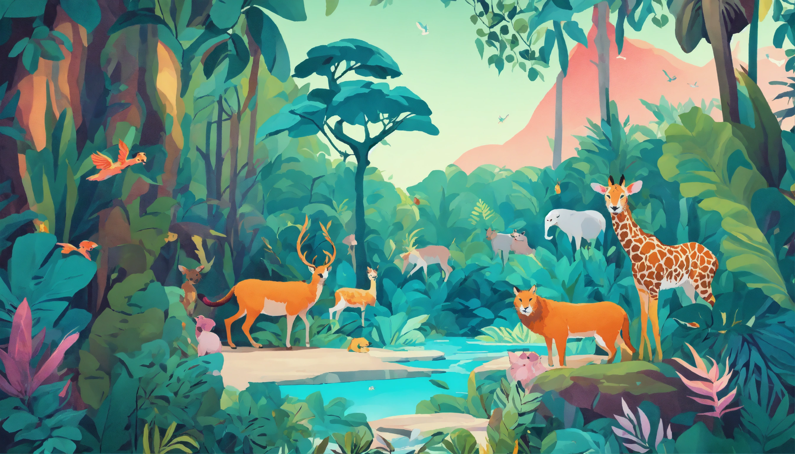 Opal stone color tropical forest with animals illustration art, die-cut sticker, paper cut, magazine illustration, highly detailed, simple, smooth and clean vector curve, no jagged lines, vector art, no backround