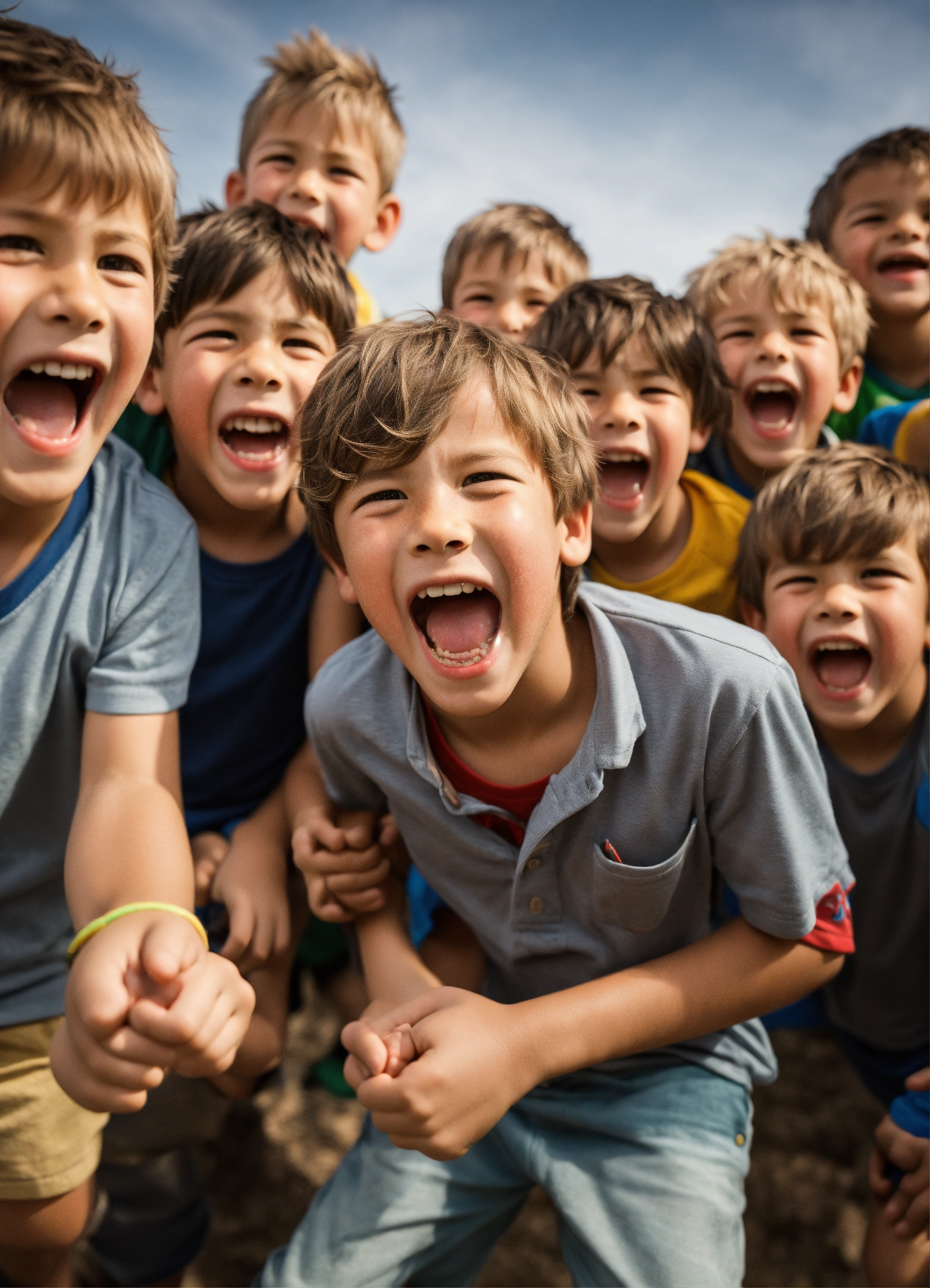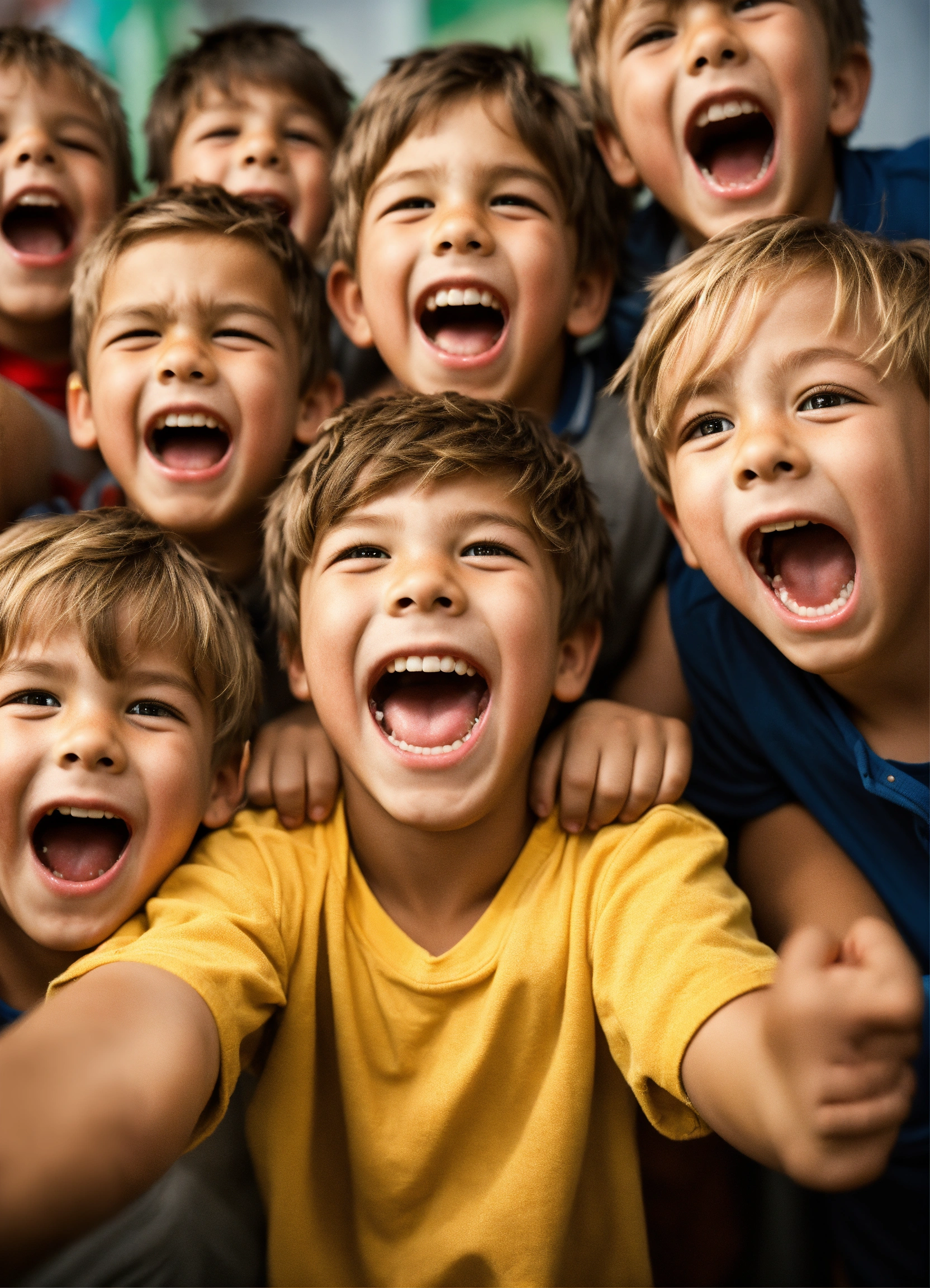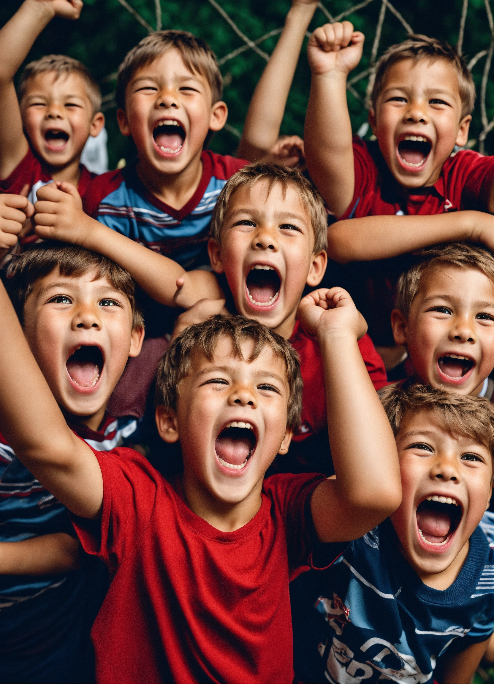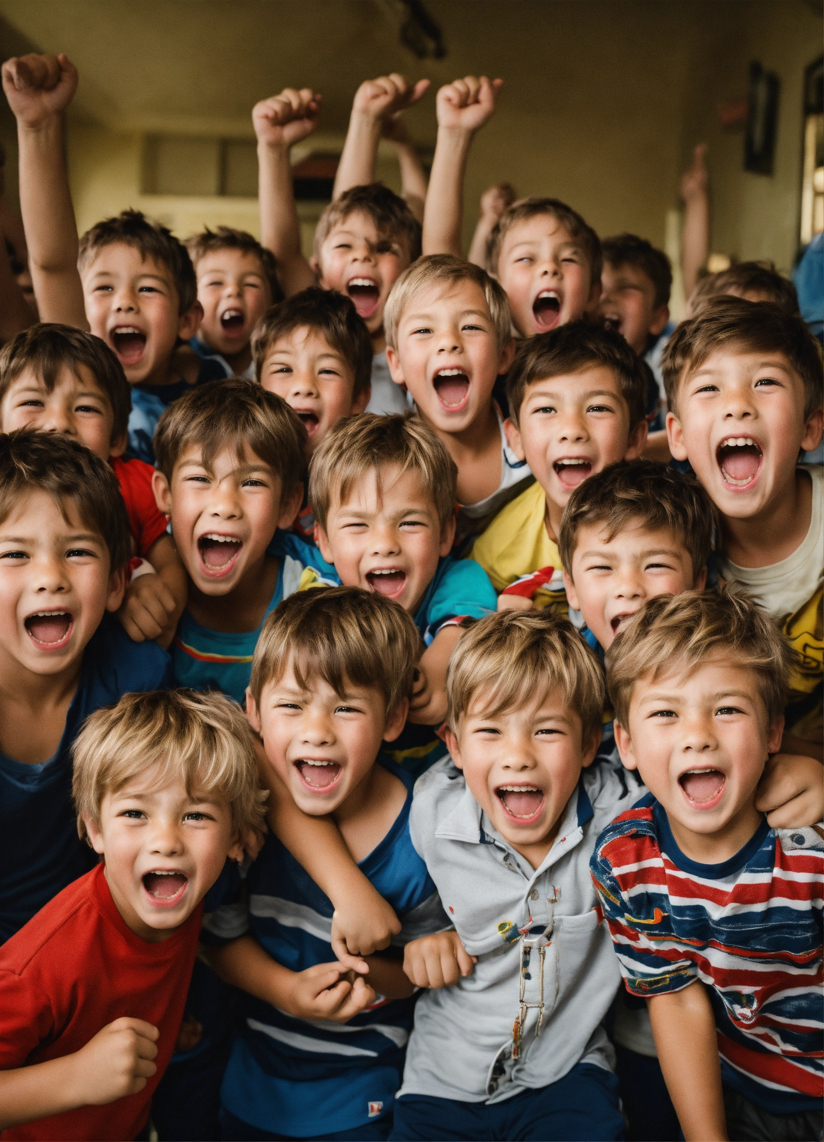 (photo, real, ultra detailed, best quality, professional photo1), group of rowdy little boys, single focal point, 8-year-old boys, varying faces, excited, shouting, cheering
