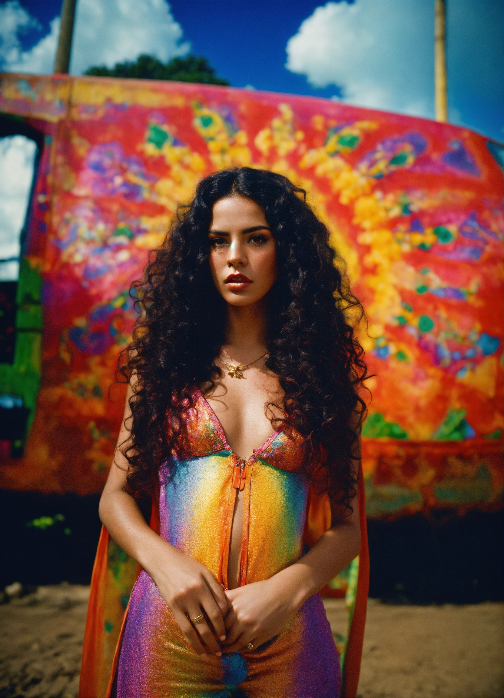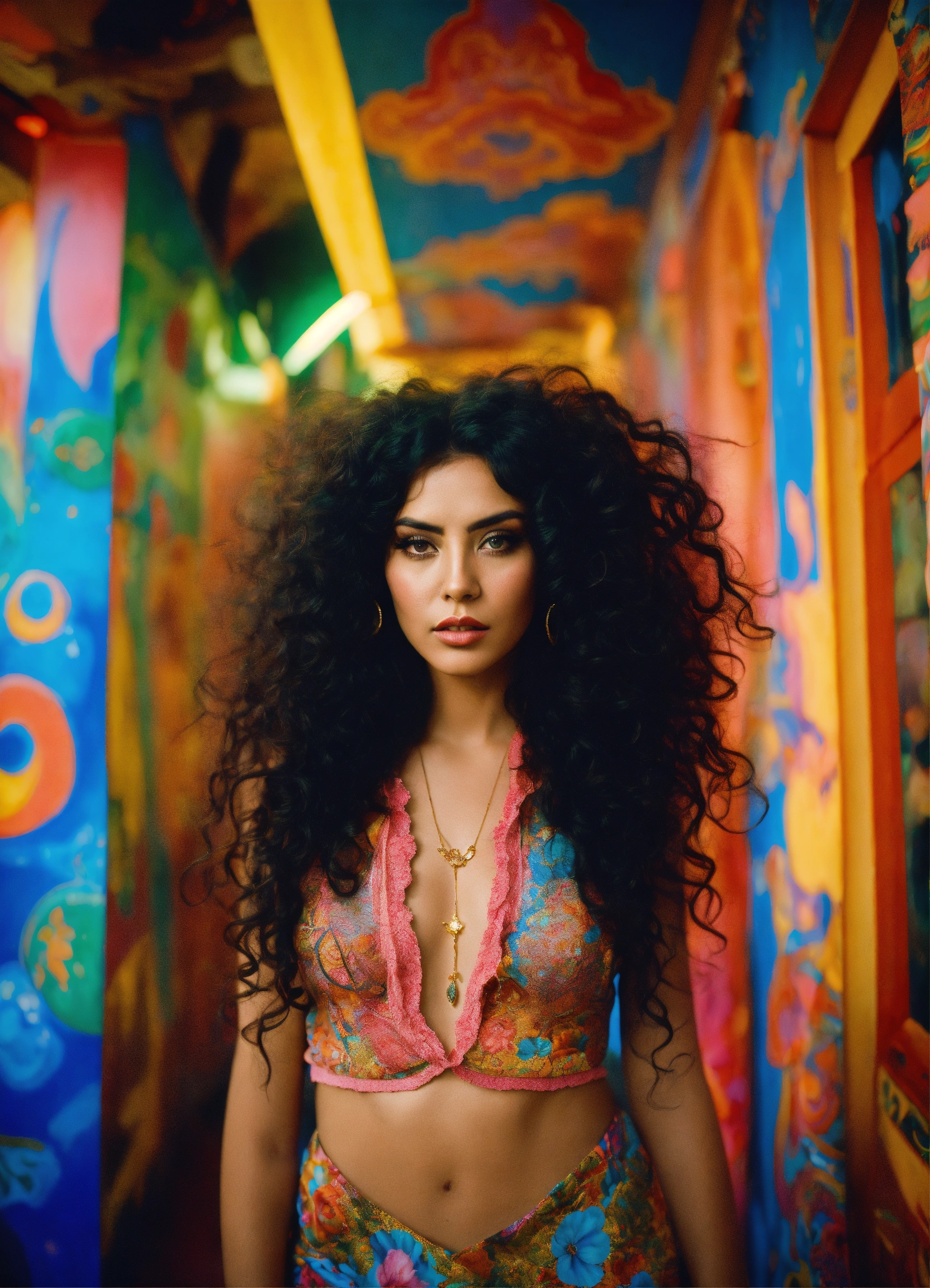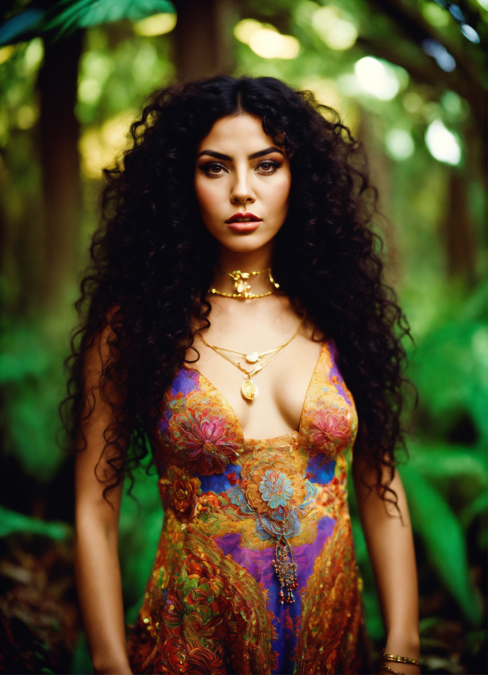 Sad stunning exotic woman with very long curly dark hair, psychedelic david lachapelle photography inspiration, film grain, wide angle shot, outside photography, leica