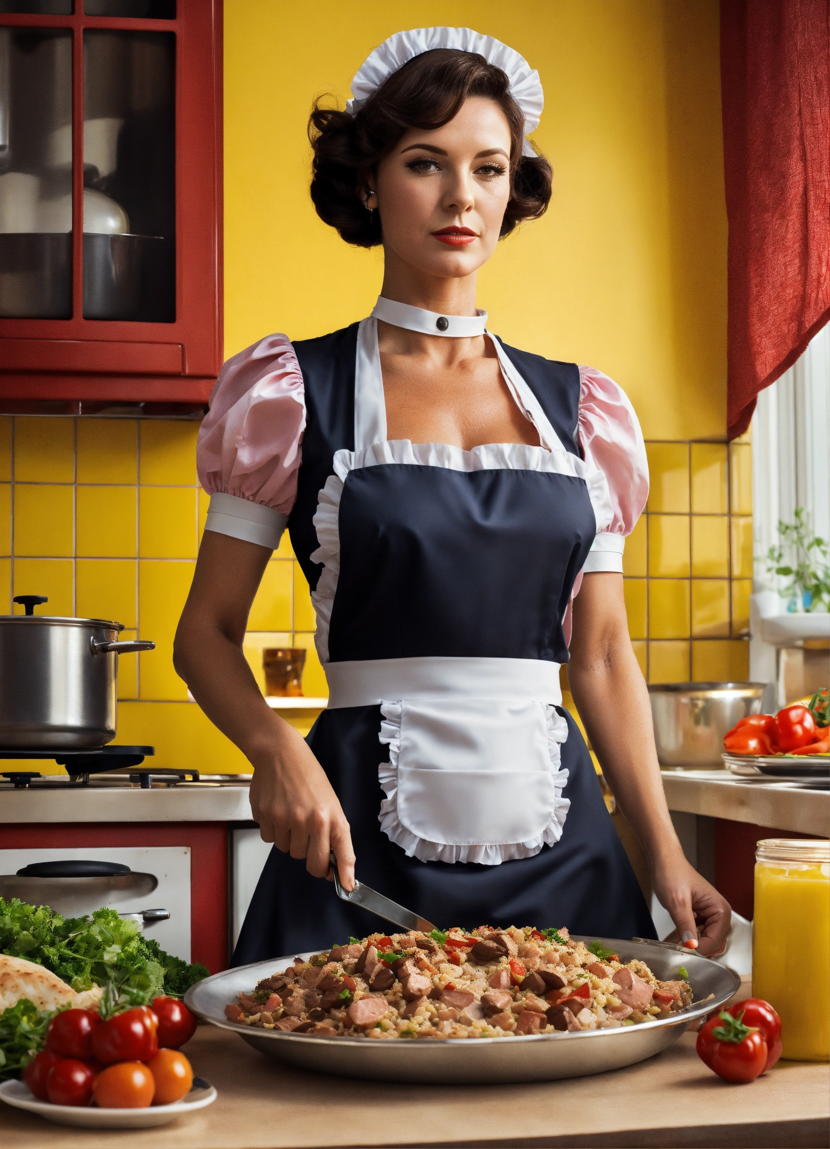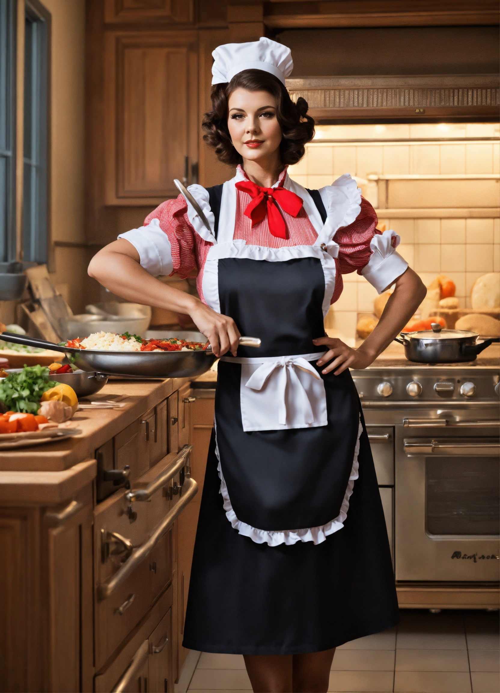 Beautiful older brunette 40s auotomaton french maid mom robot maid with huge muscles cooking dinner, fully covered, long dress, big body, maid outfit, plus size body, short hair, big arms, product photography, concept art, brunette
