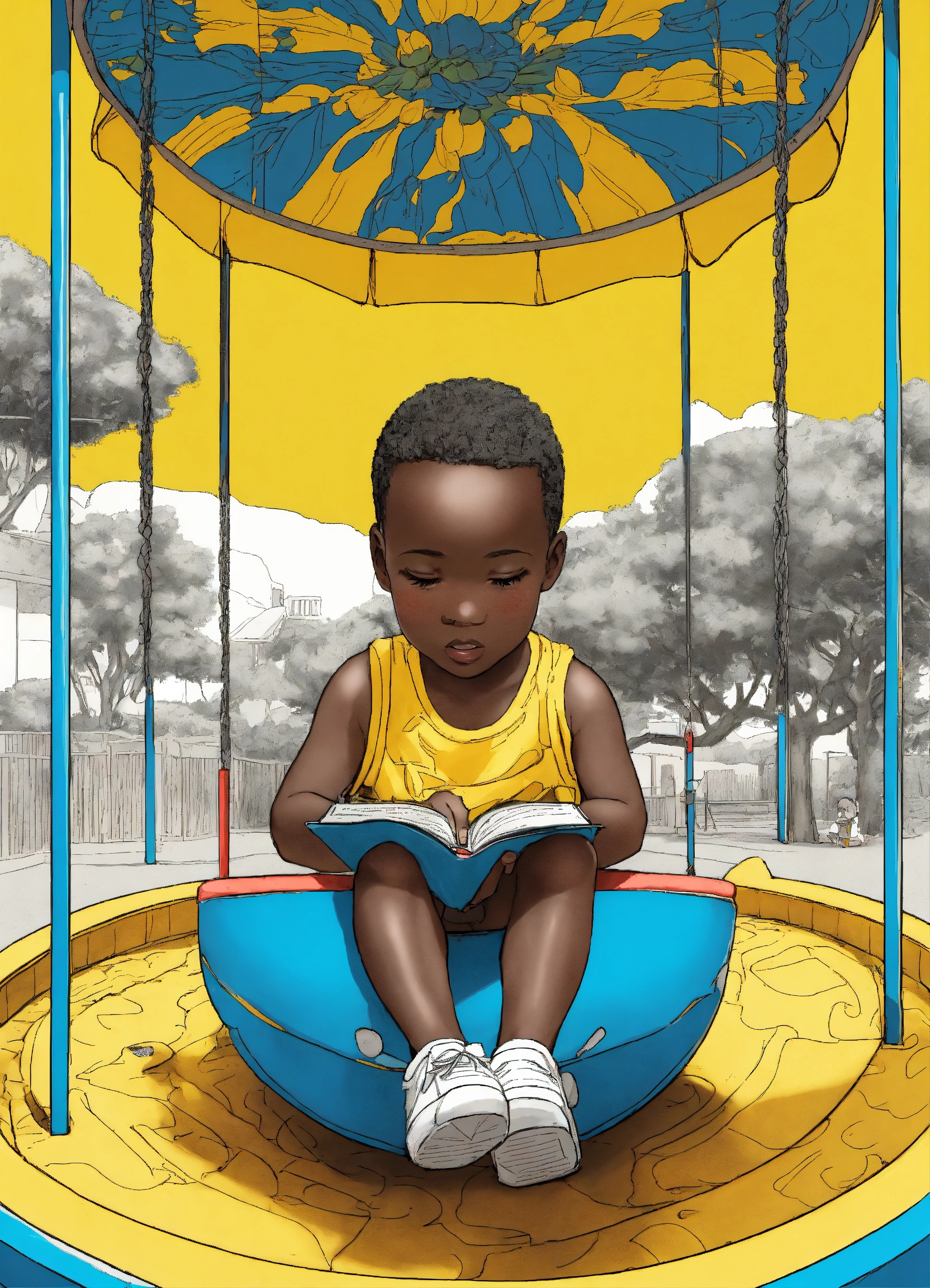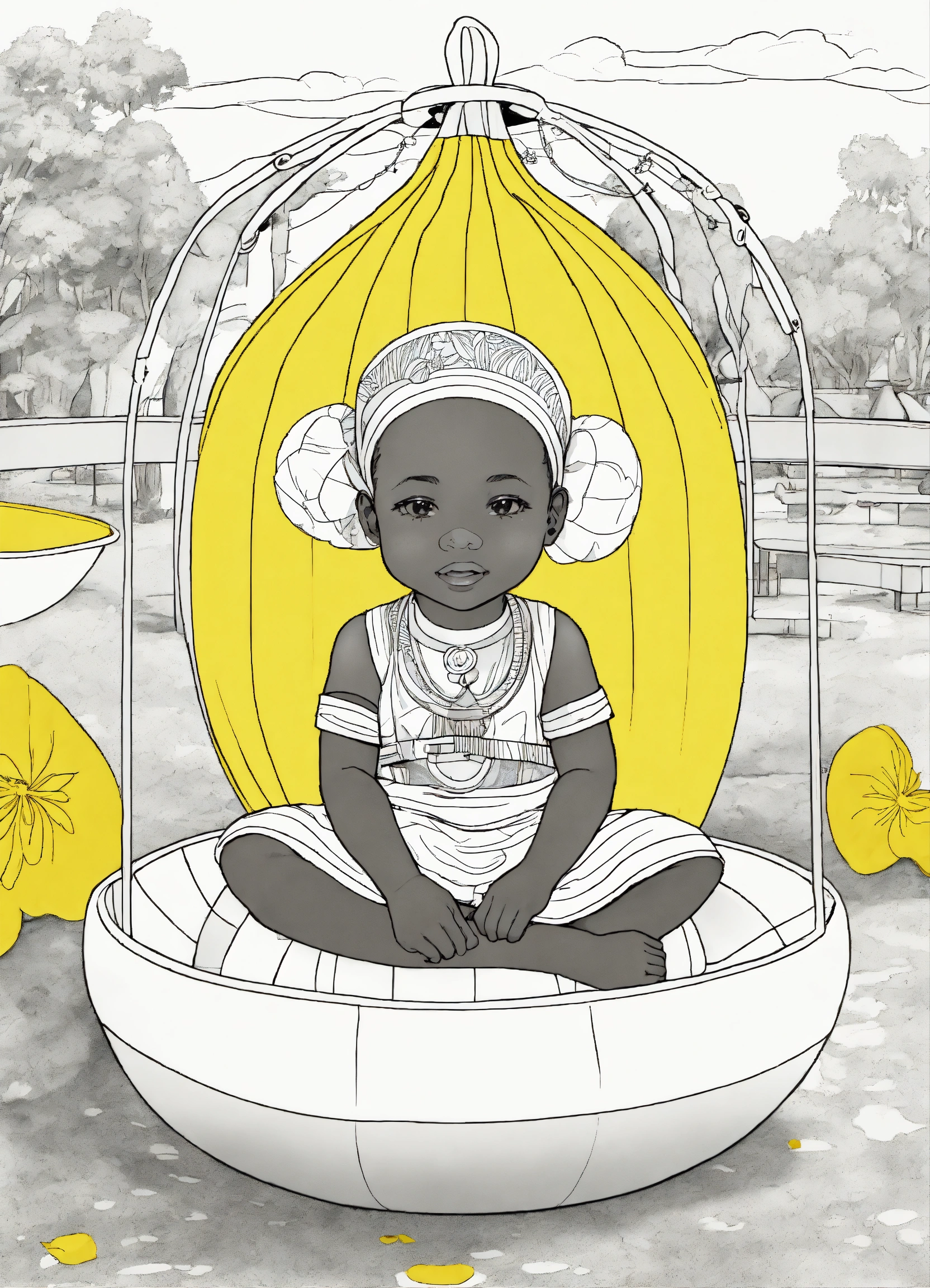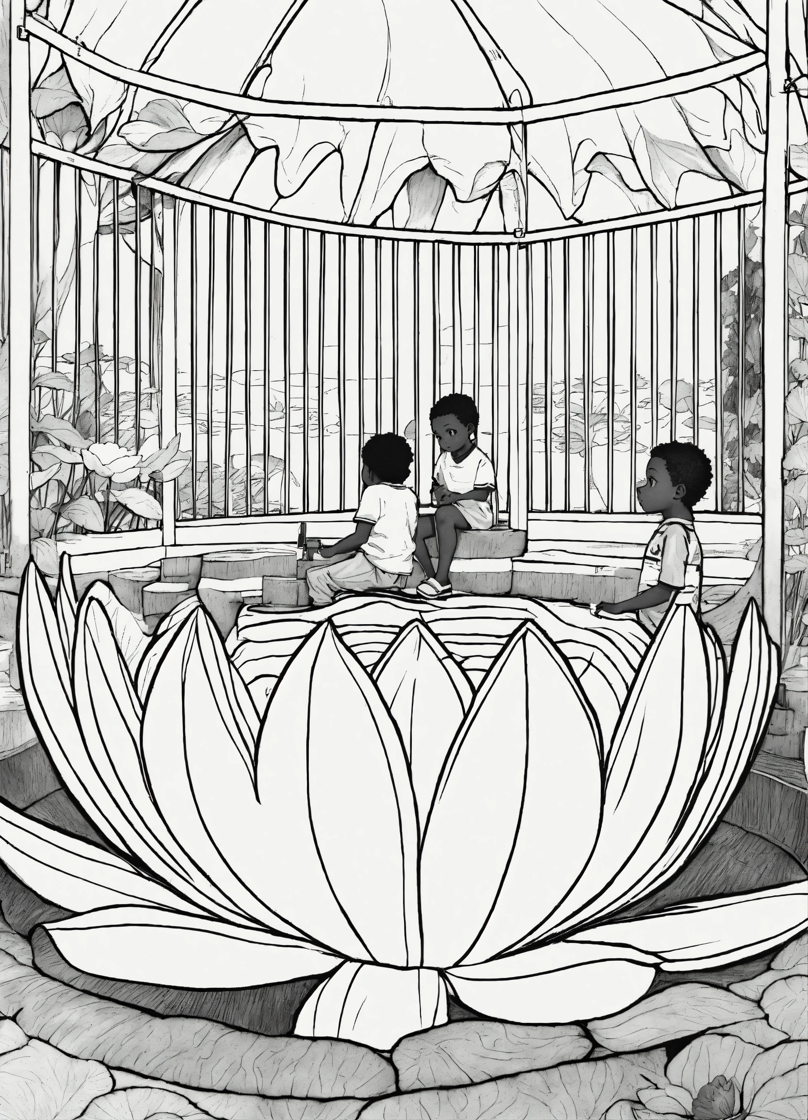 Black and white image coloring book african children inside a lotus bud on a playground, yellow and blue
