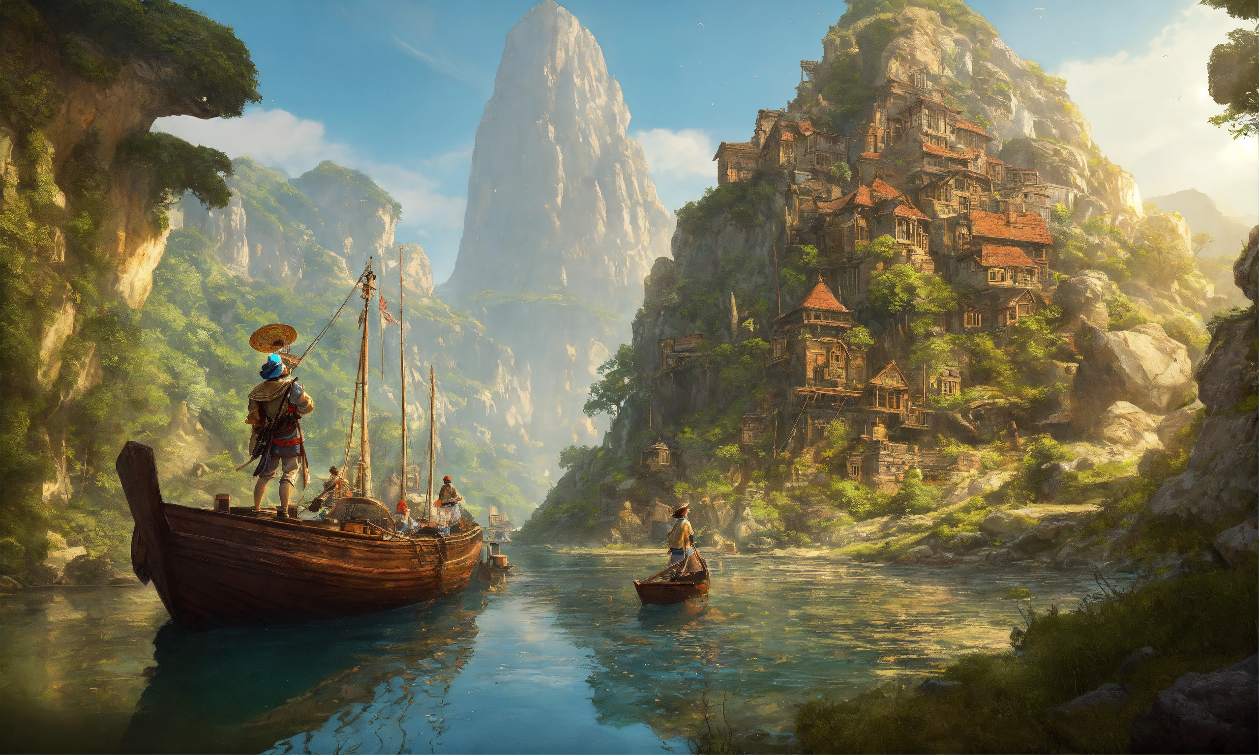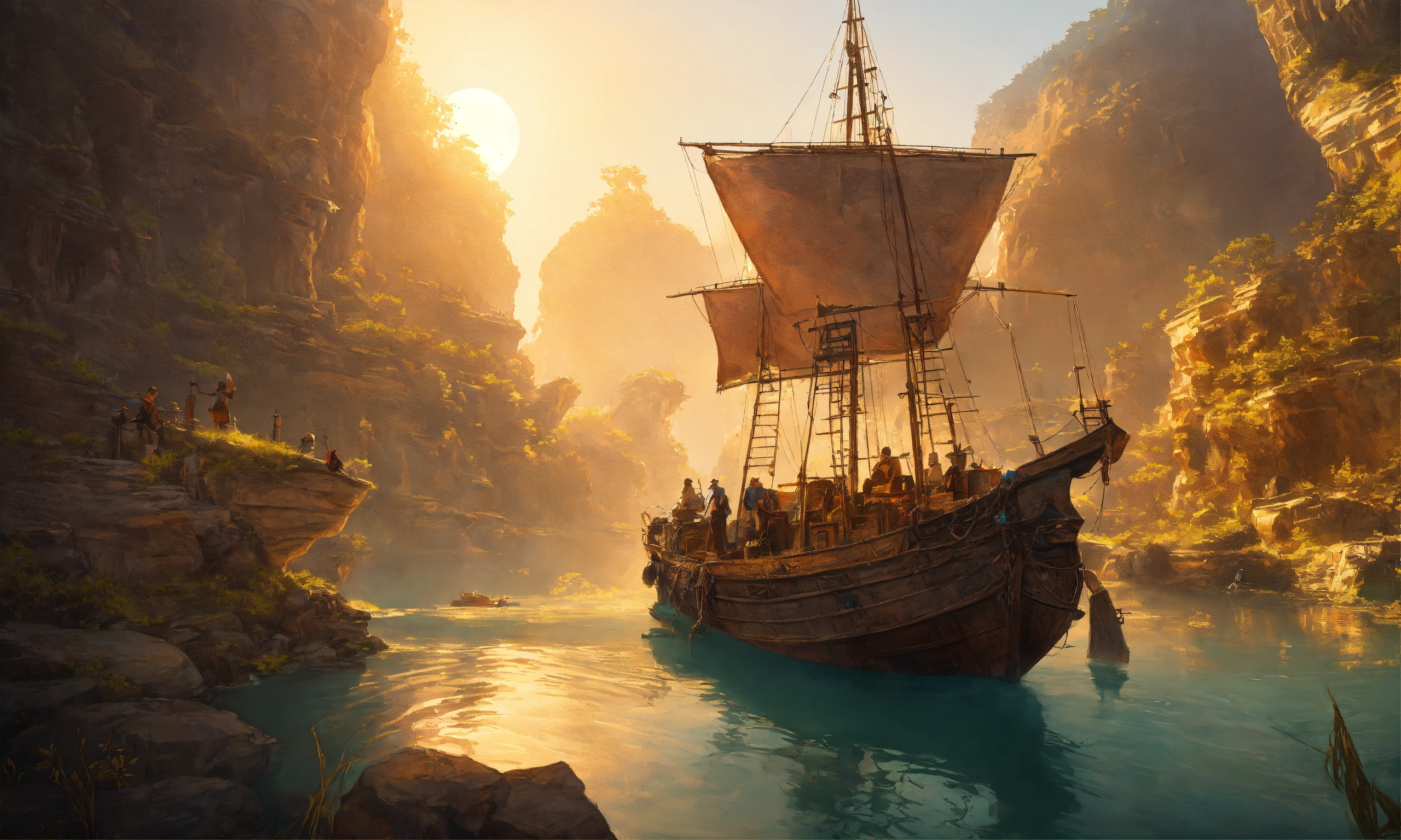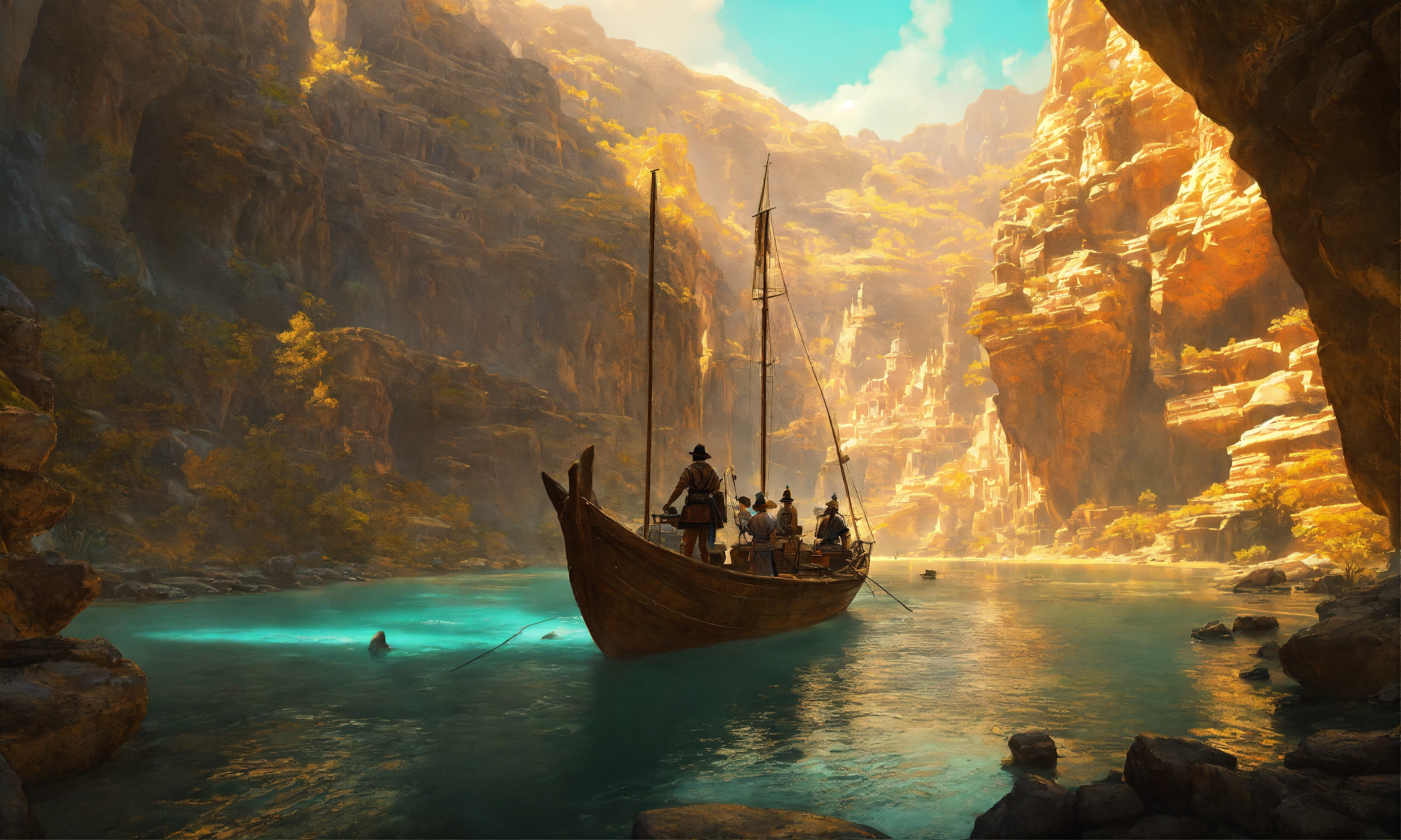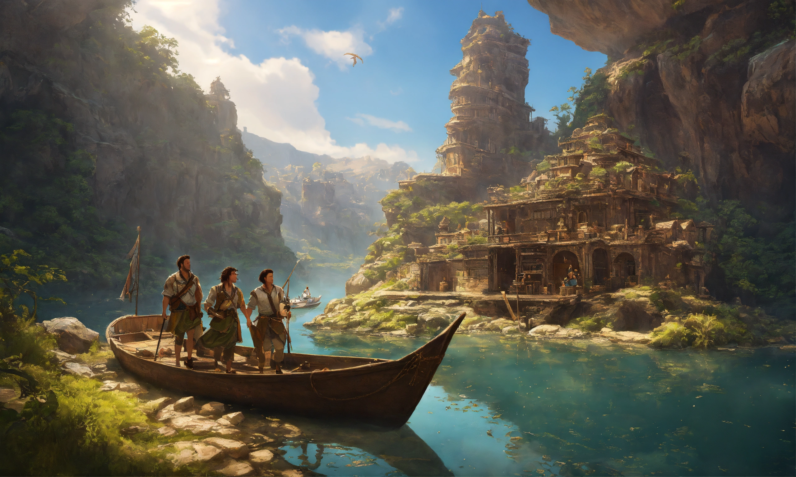 Archaeological friends from 1940 on a boat sailing on a hidden river, scare, ancient statues carved in gigantic quartz discovered on the rocky slopes, left by a disappeared civilization, abandoned technological village, adventure and immensity, environmental art, fantasy art, landscape art, in greg rutkowski style, illustration, epic, fantasy, intricate, hyper detailed, artstation, concept art, smooth, sharp focus, ray tracing
