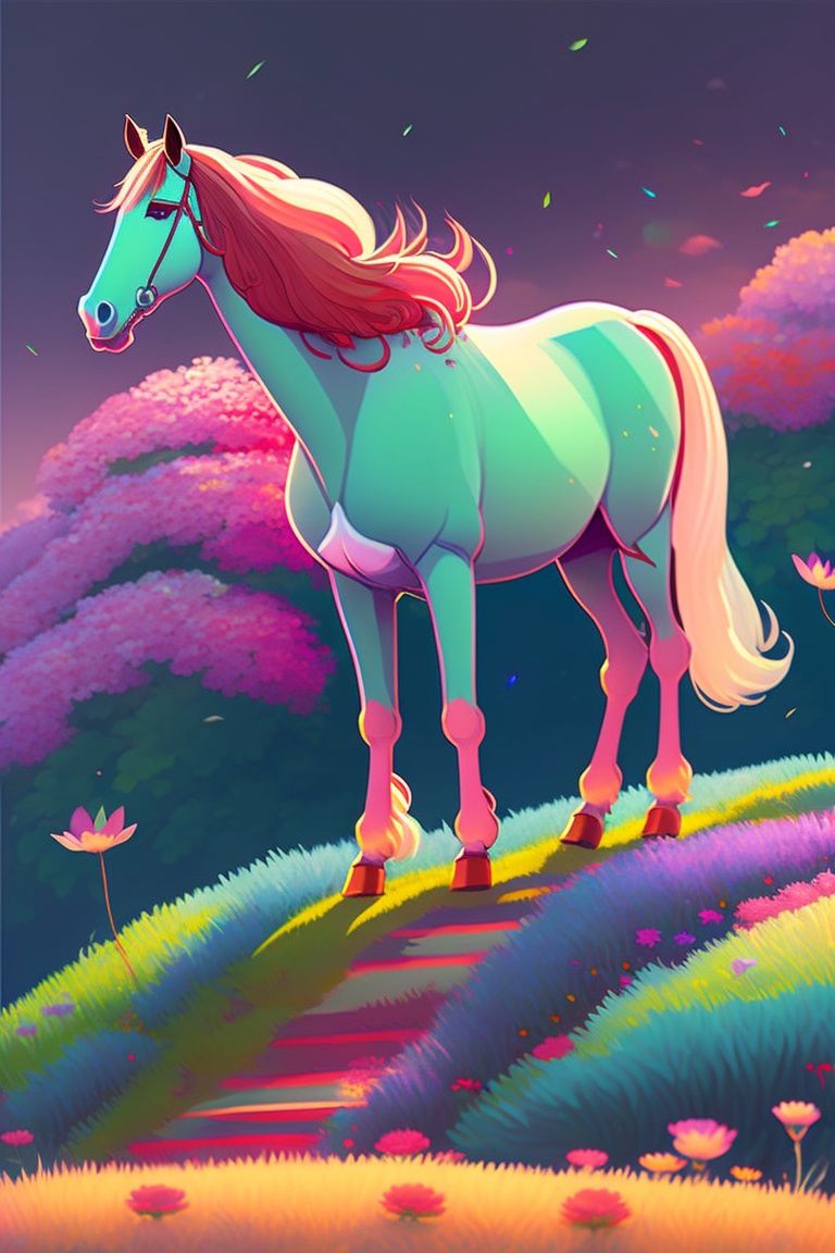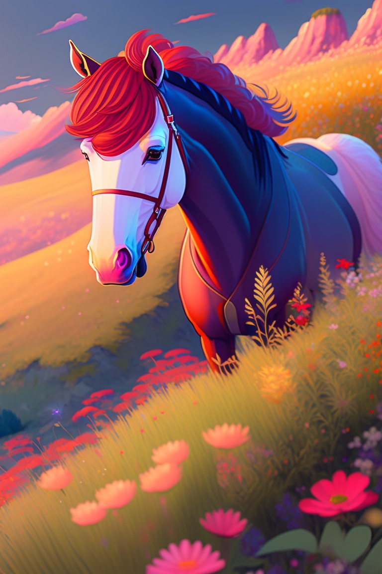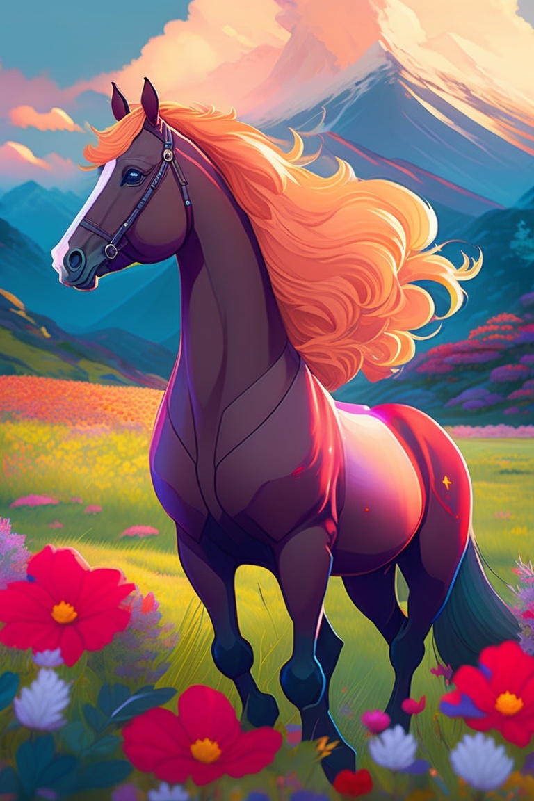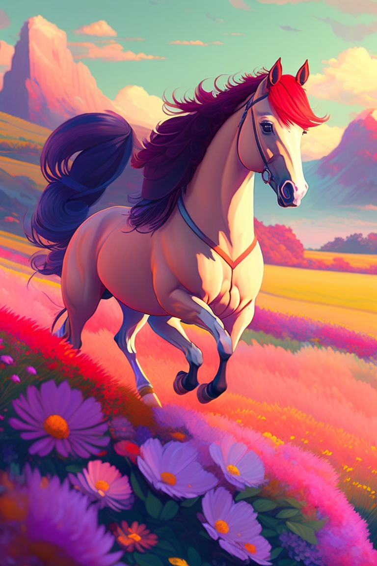 "a horse frolicing in a field of flowers, style of laurie greasley, studio ghibli, akira toriyama, james gilleard, genshin impact, trending pixiv fanbox"