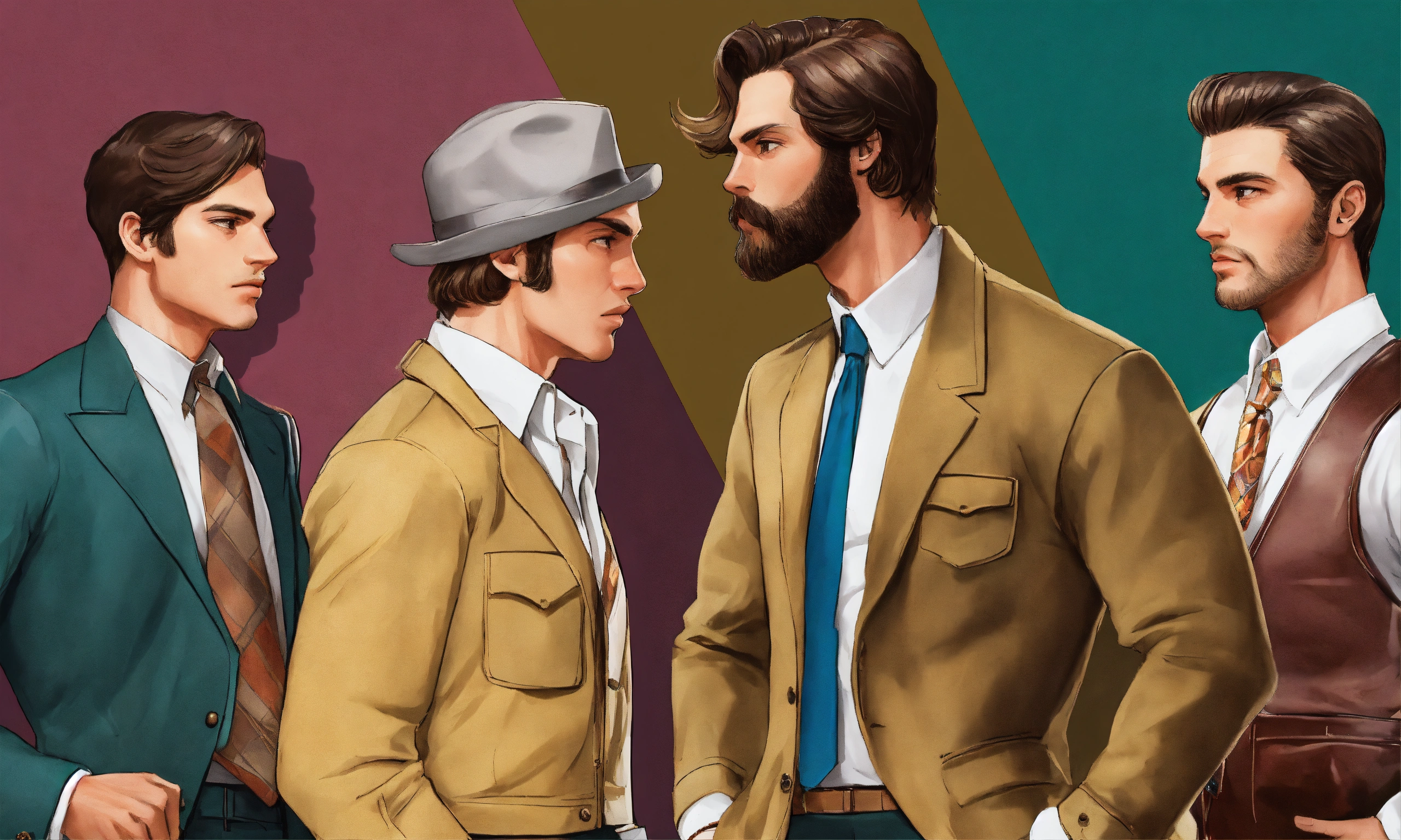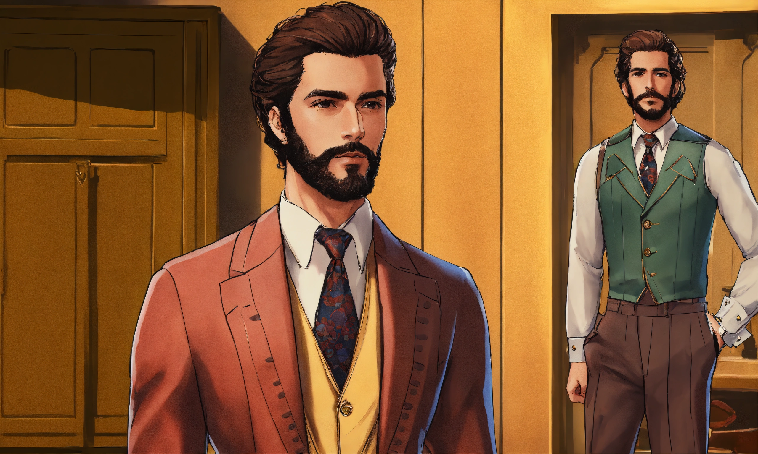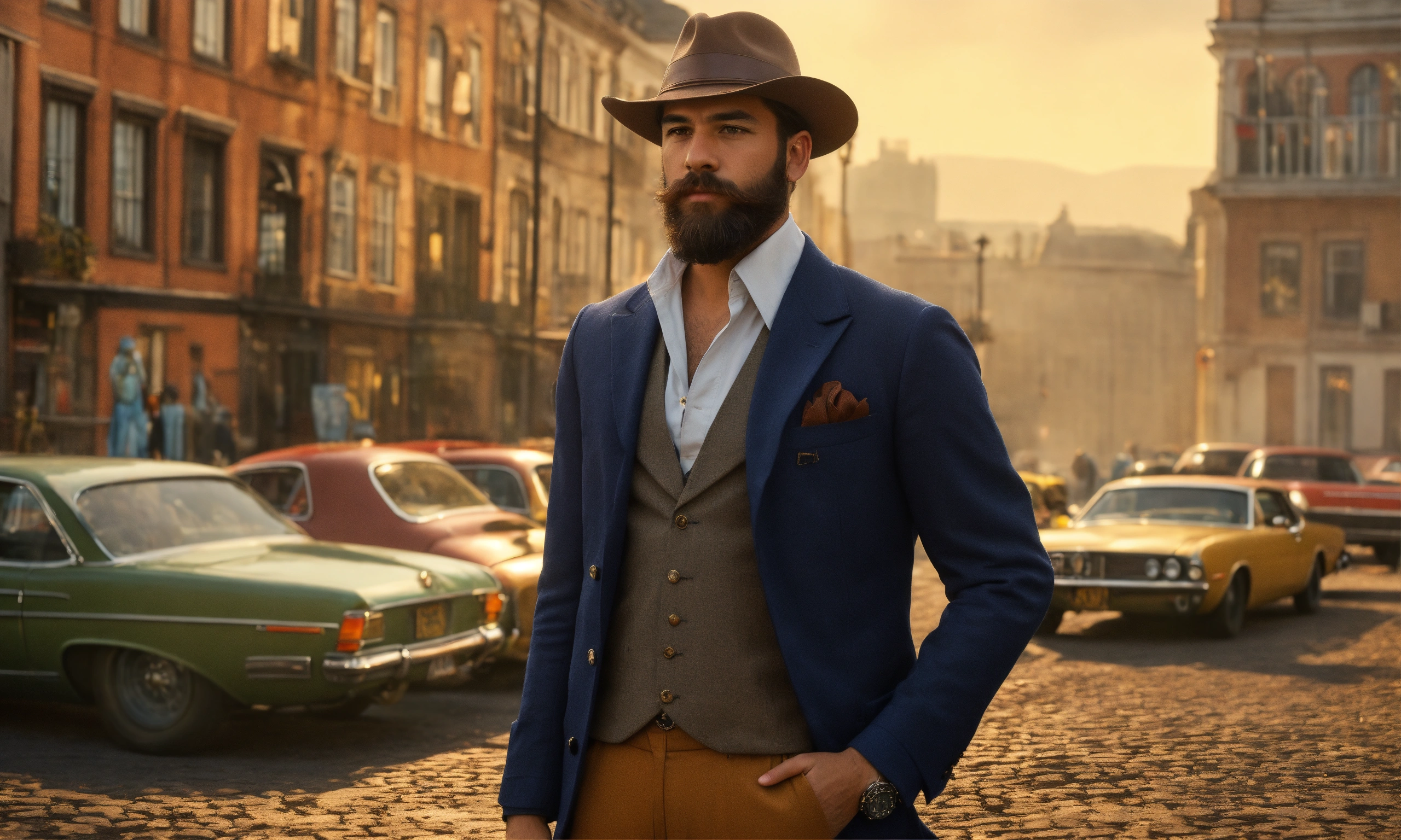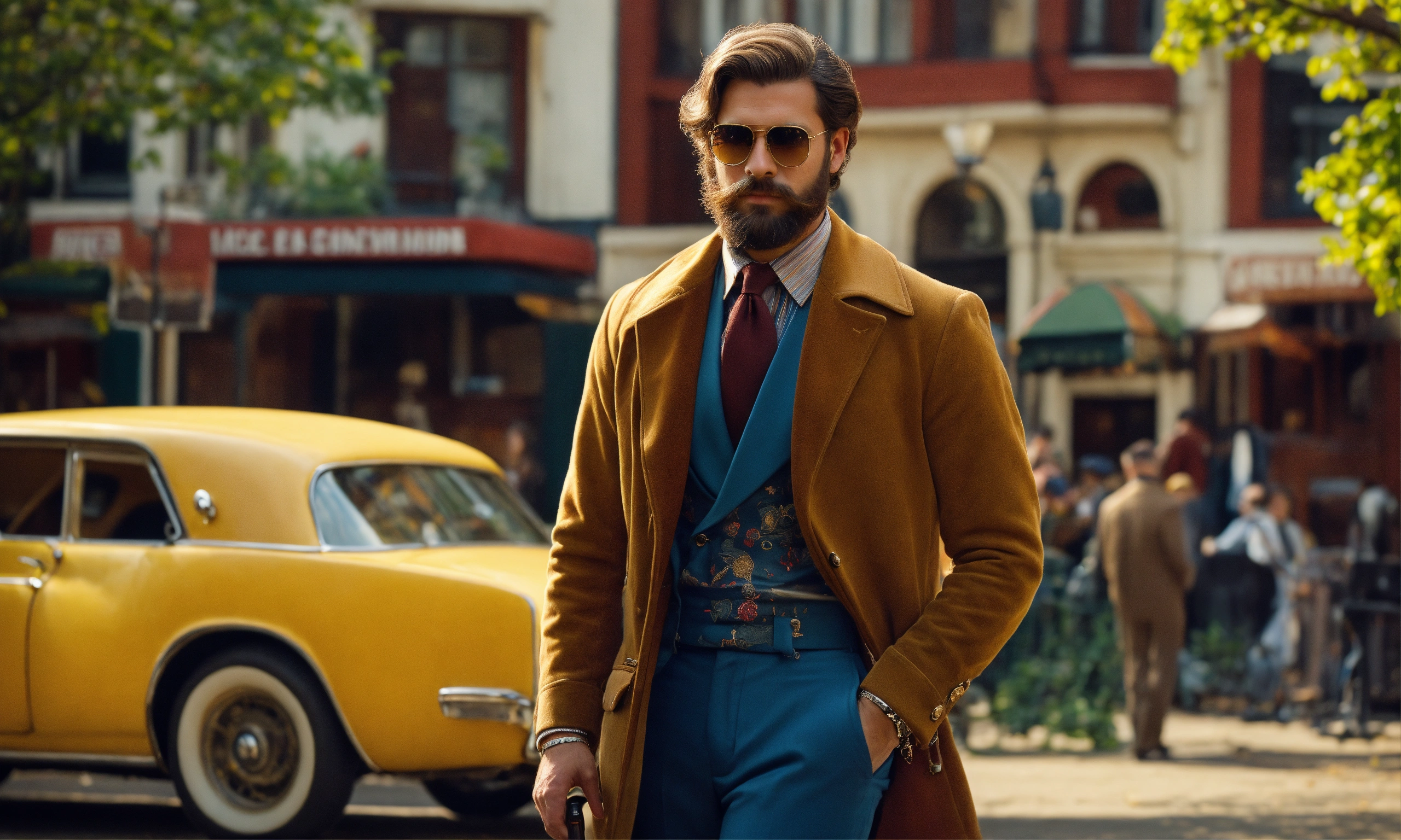 Create a description of a man in the retro usa style from the 70s to 90s, depicting him without glasses in his everyday life. imagine him as a stylish gentleman with meticulously groomed hair and a well-kept beard. describe his vintage-inspired wardrobe, featuring well-fitted trousers, fashionable wide-lapel jackets, and eye-catching printed shirts. pay attention to the intricate details, including the use of sleek leather bags and metallic-bracelet watches as accessories. emphasize the richness of the background with a diverse array of elements that resonate with the era, such as antique furniture, classic automobiles, vinyl records, and other paraphernalia from that period, creating an atmosphere of nostalgia and cultural abundance. man has black eyes.