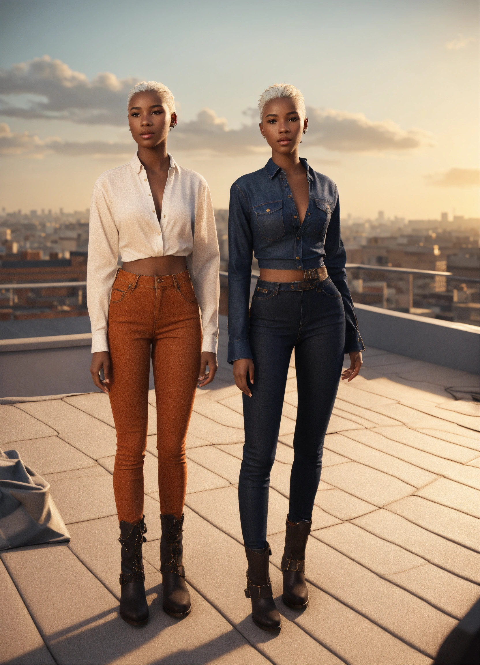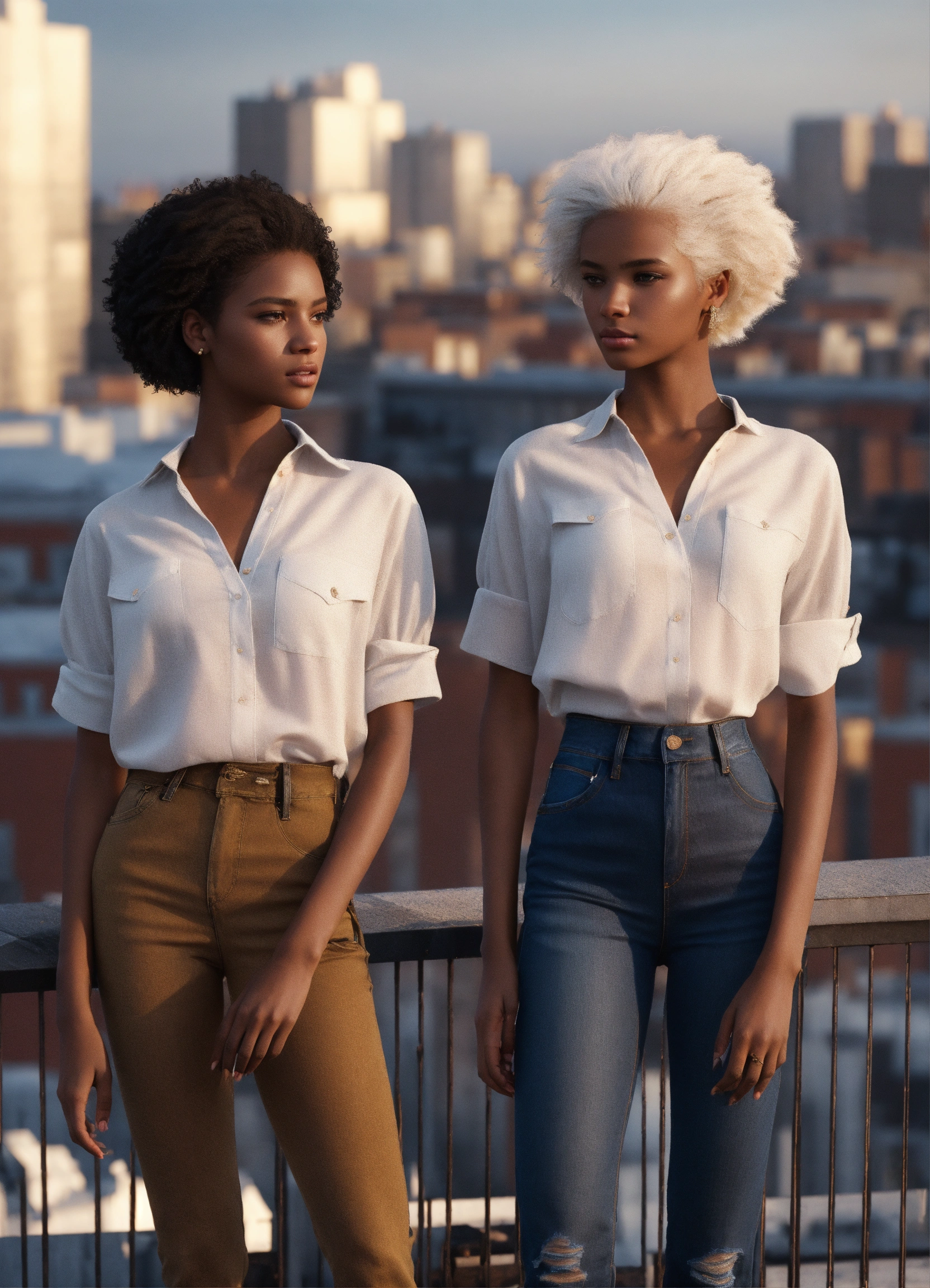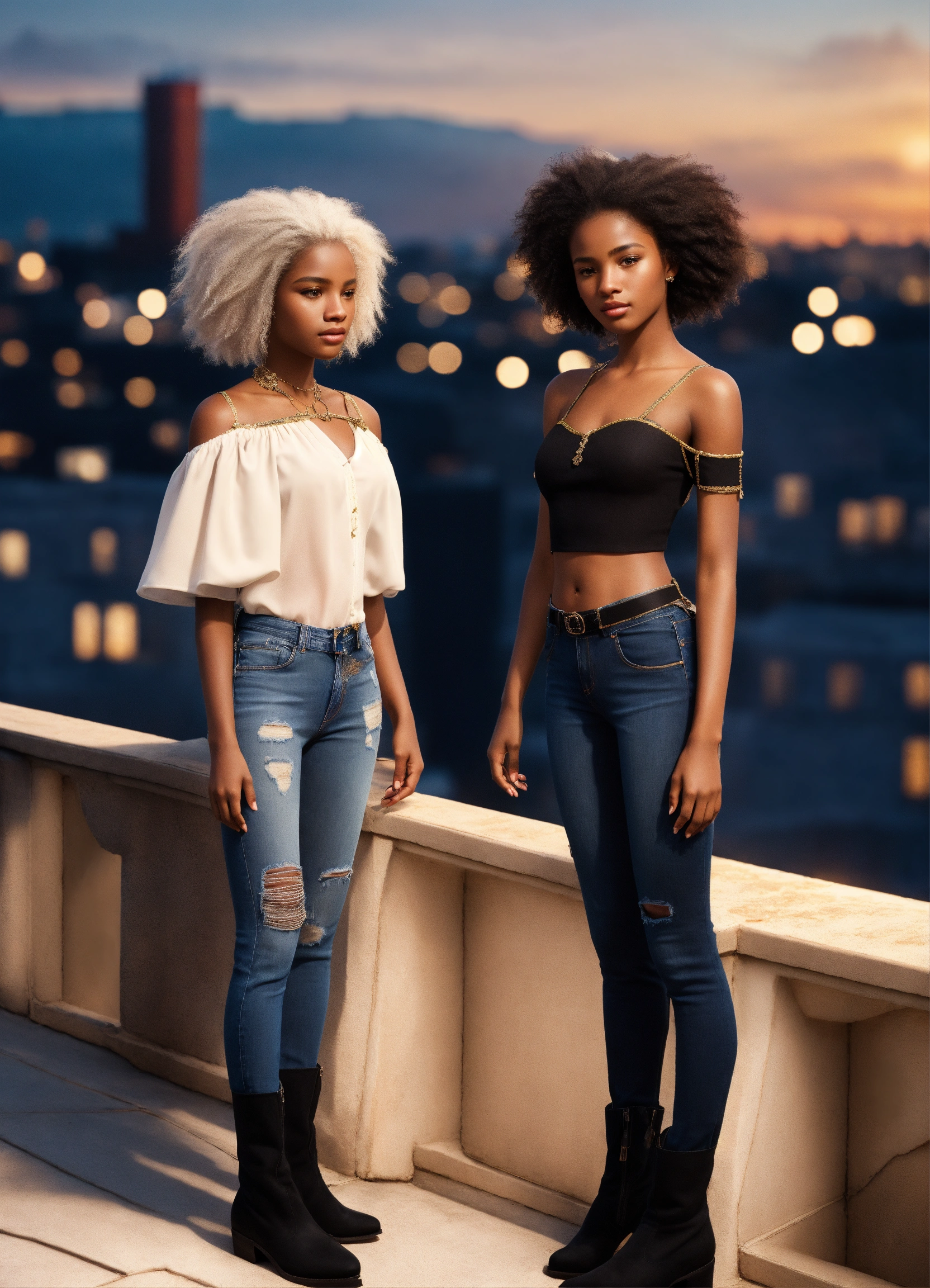 Pretty fraternal twins, twin 13-year-old, one twin white hair. african features, one twin brown-skin, black hair, in haute couture blouse, jeans, and boots. standing on rooftop terrace, regal persona. early morning, cinematic style, high detail, realistic physics, photorealistic, unreal engine, hdr, 8k