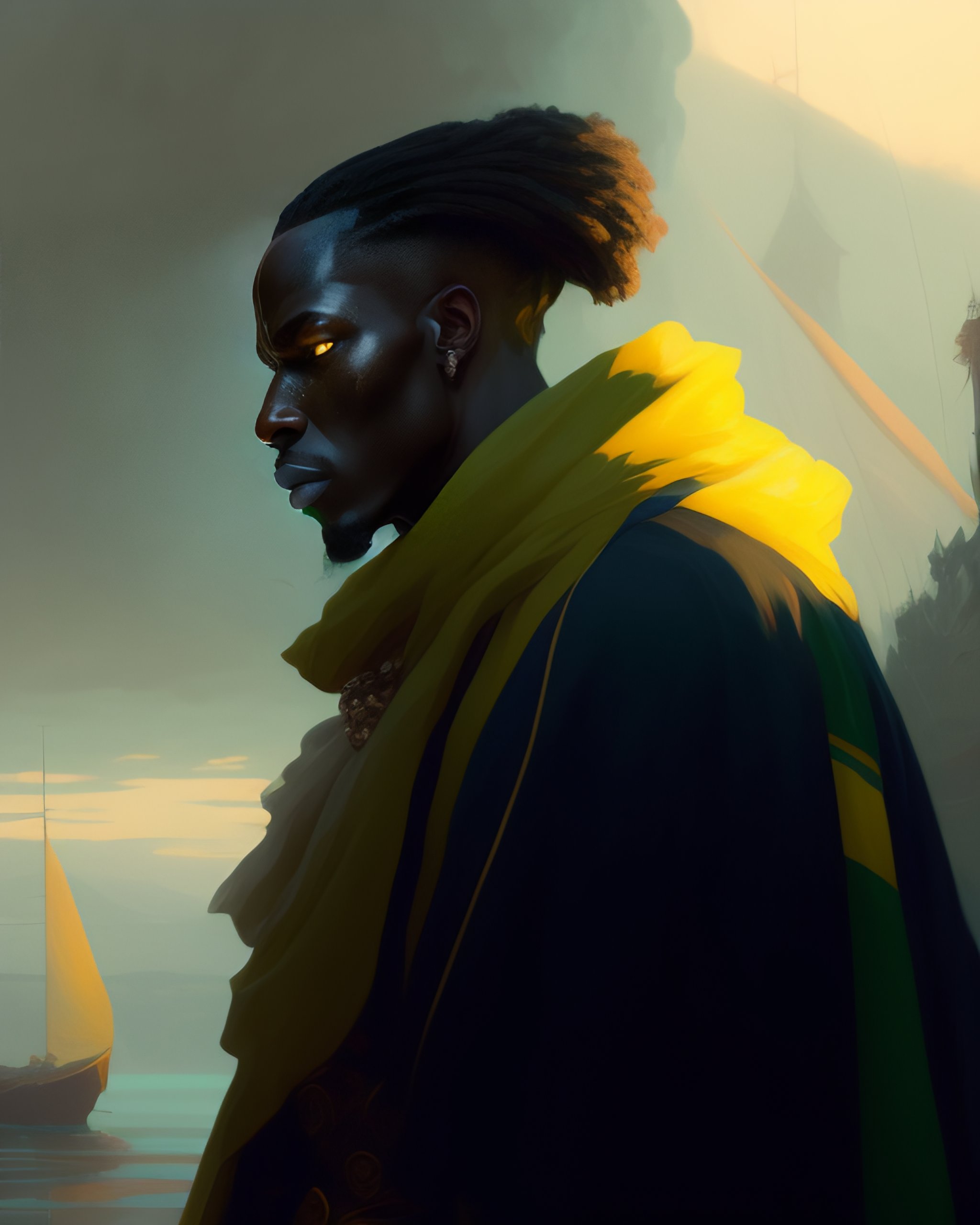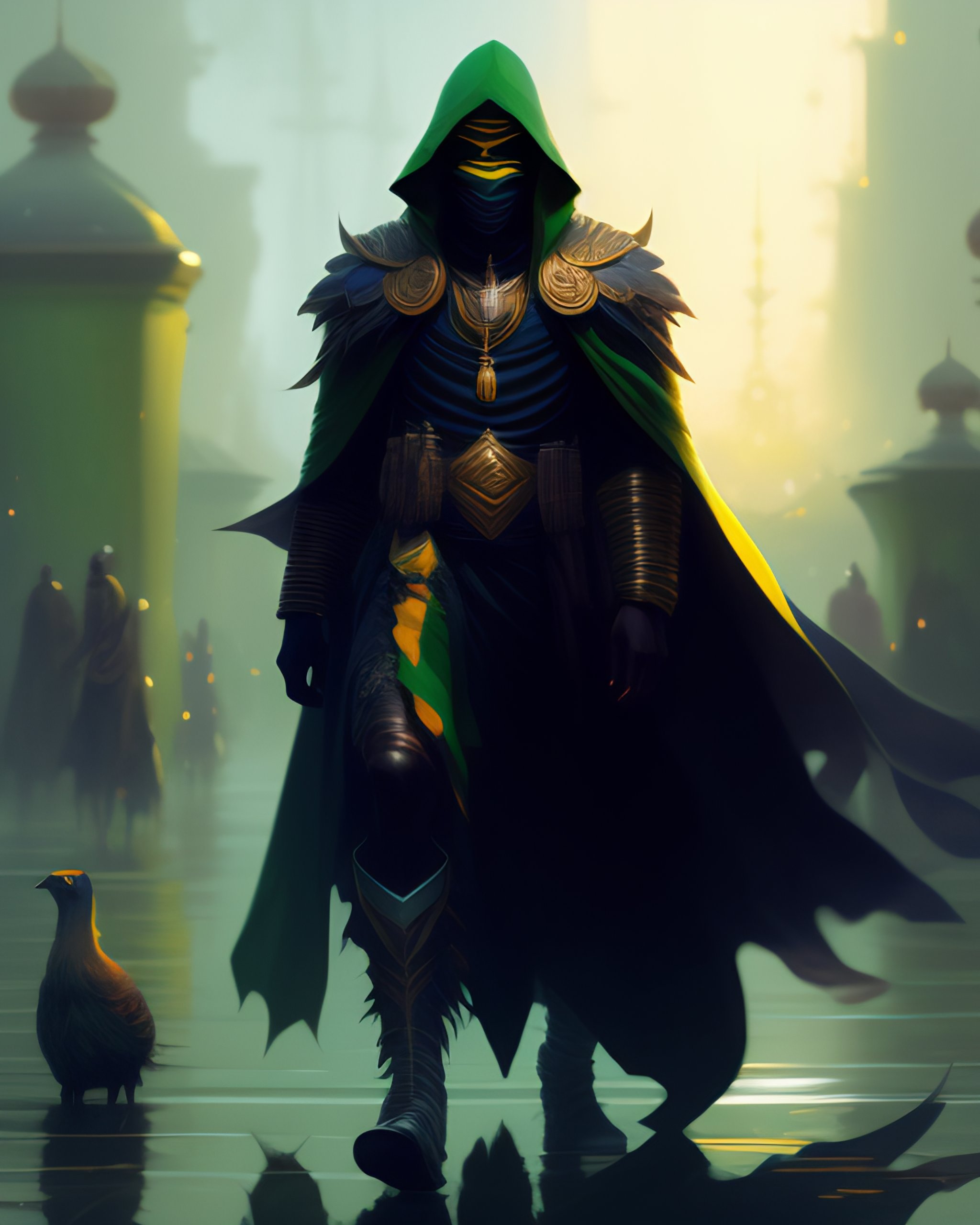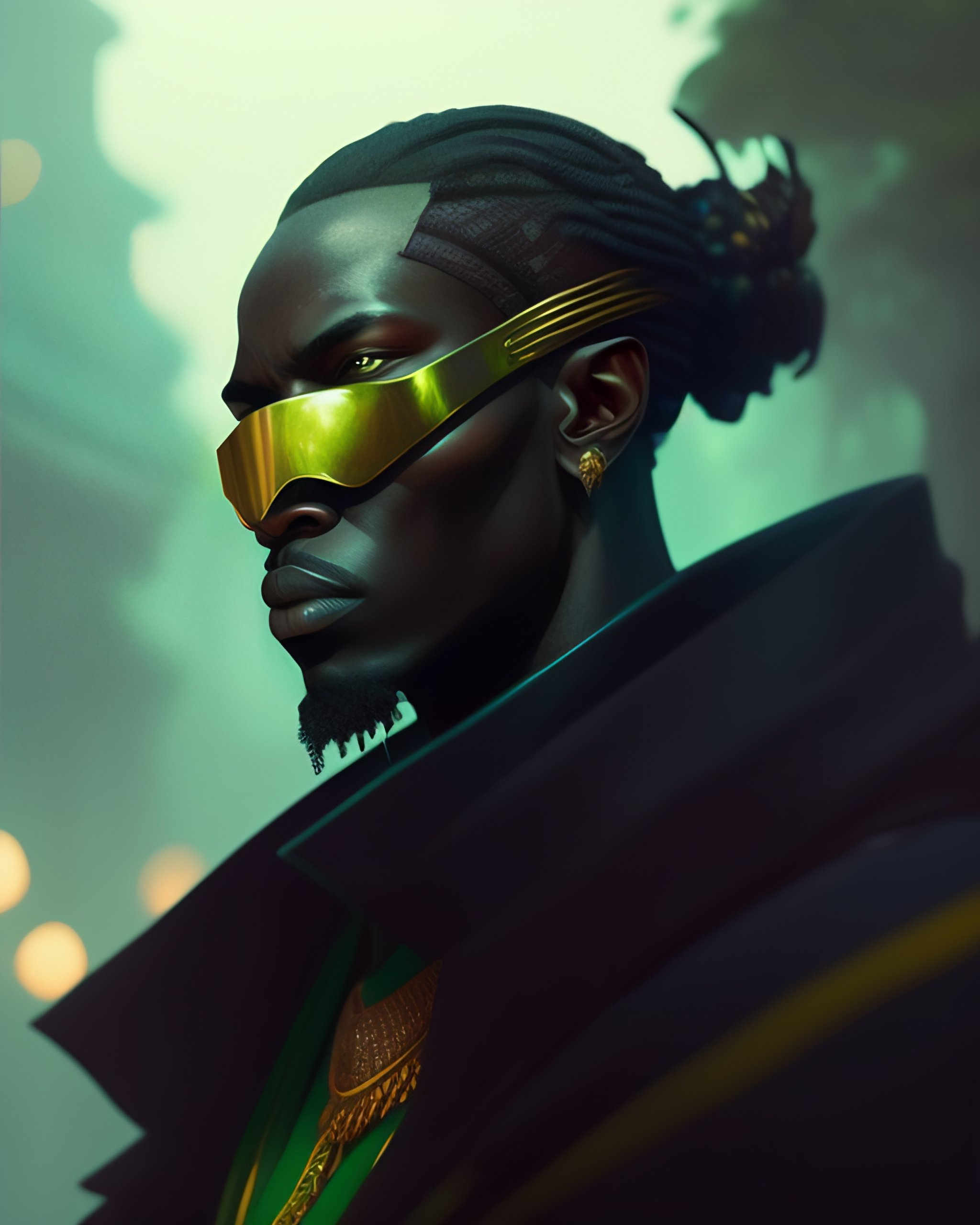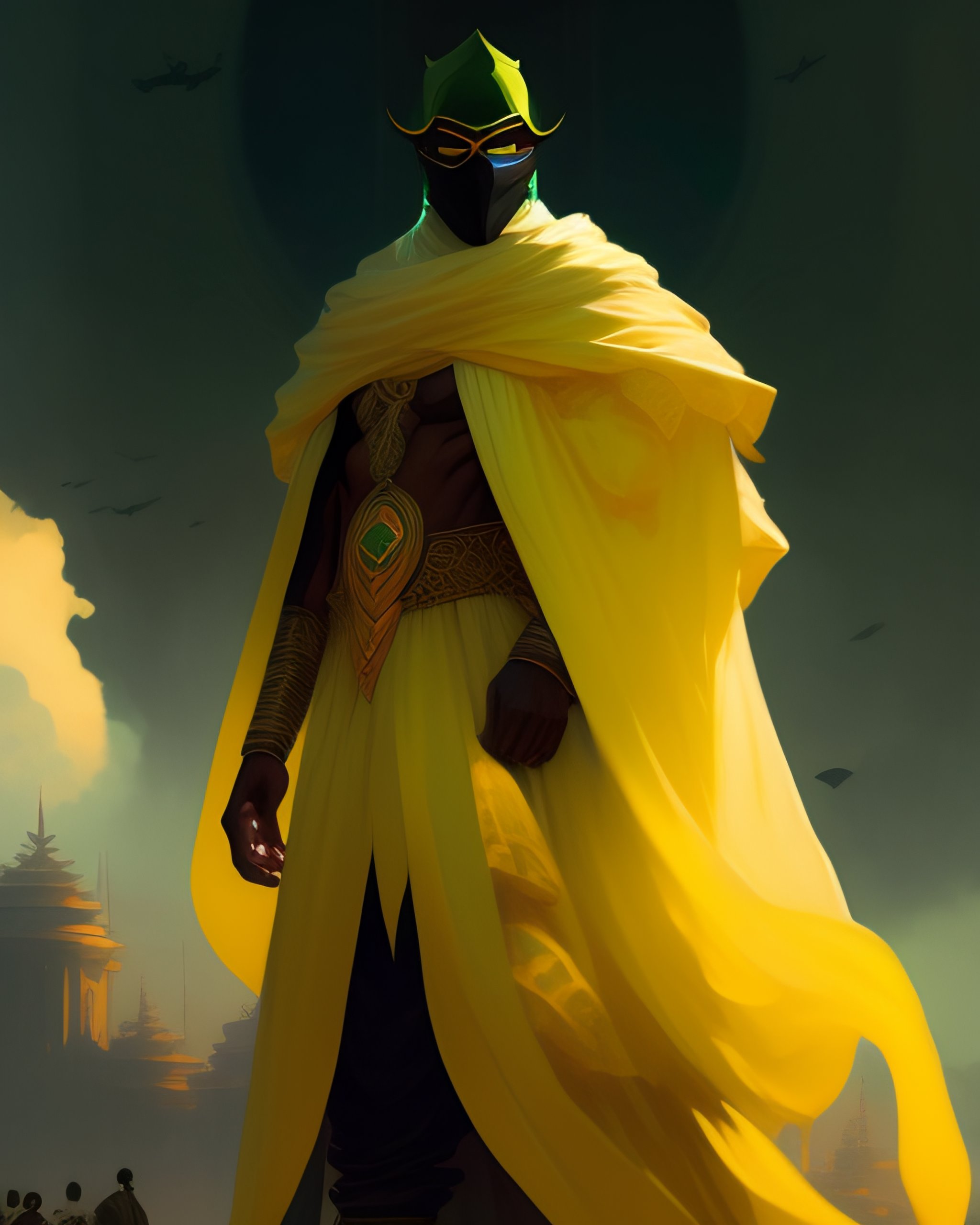 A gloomy art piece depicting a full body man representation of a menacing supervillain from senegal, dramatic and intimidating, weraing unique outfit and mask in the colors of the senegalese flag ( must use these 3 colors : green, yellow, red), include details such as weapons that enhance his villainous persona, afro-futuristic landscape background, gloomy and shadowy environment, imagine a dark backstory for this character, sharp focus, illustration, highly detailed, digital painting, concept, greg rutkowski and alphonse mucha