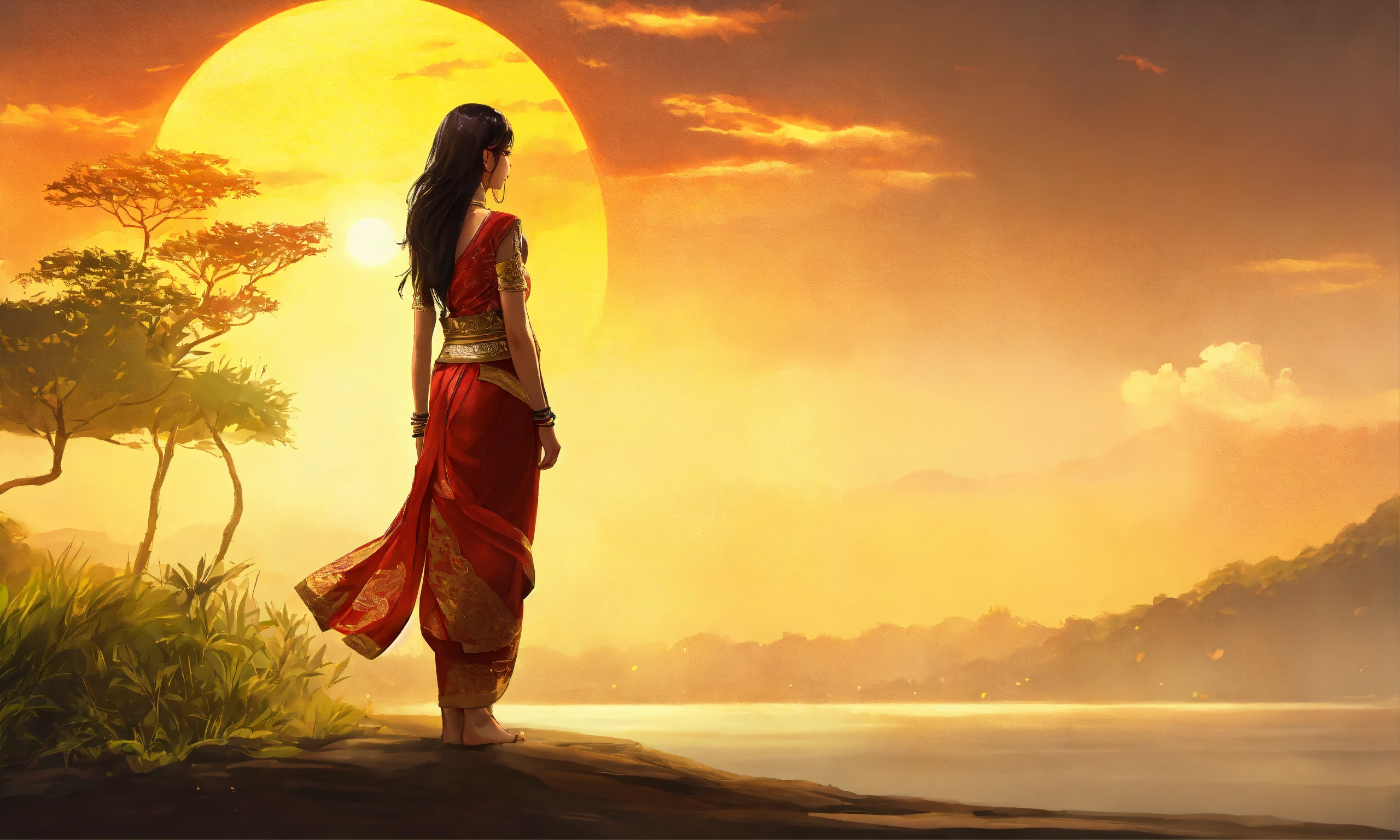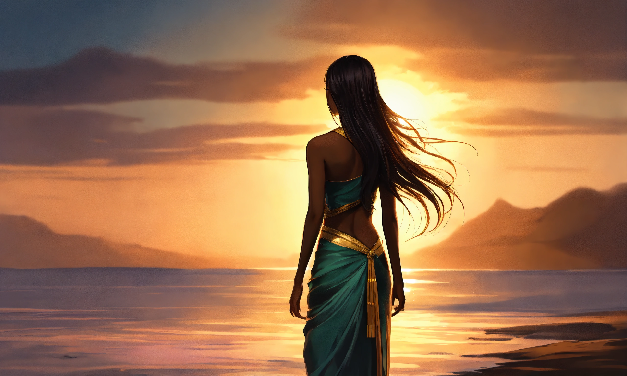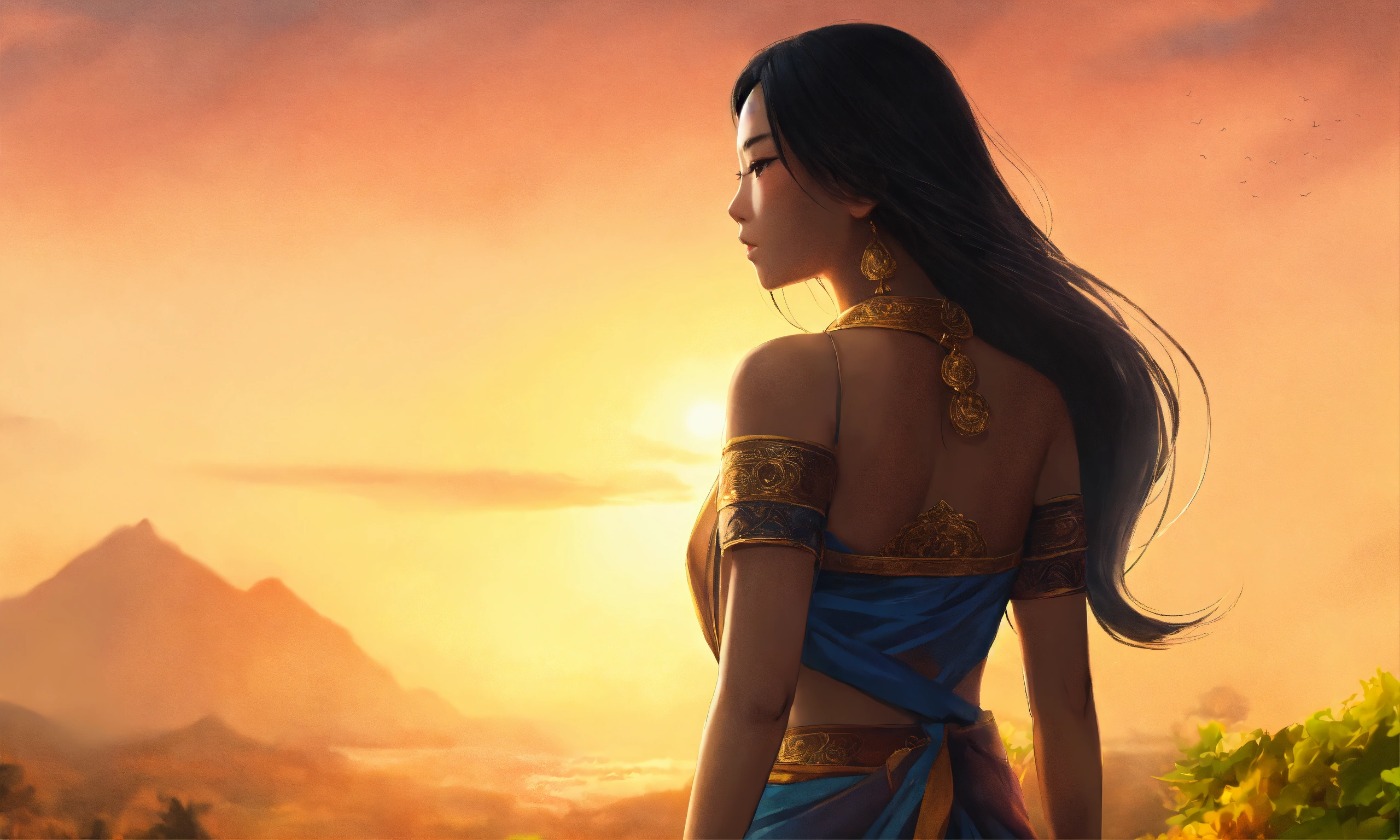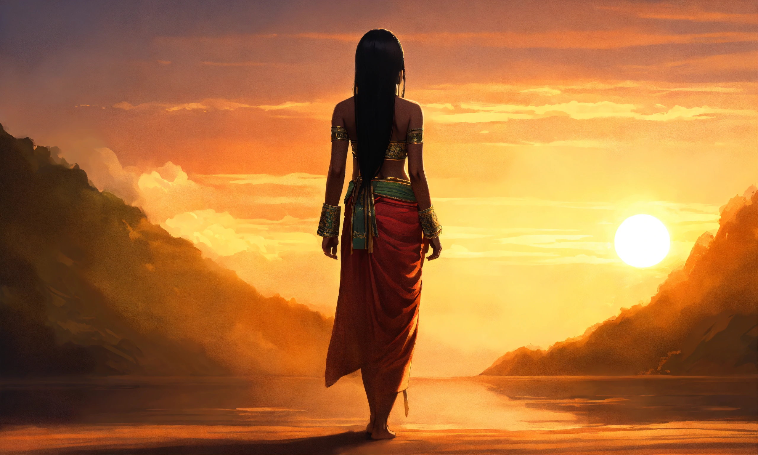 Asian woman, long hair, dark skin, standing with her back (hope) facing right, the sun. symbol of something new high quality clarity; 640 pixels wide by 360 pixels tall (perfect body) thai art style