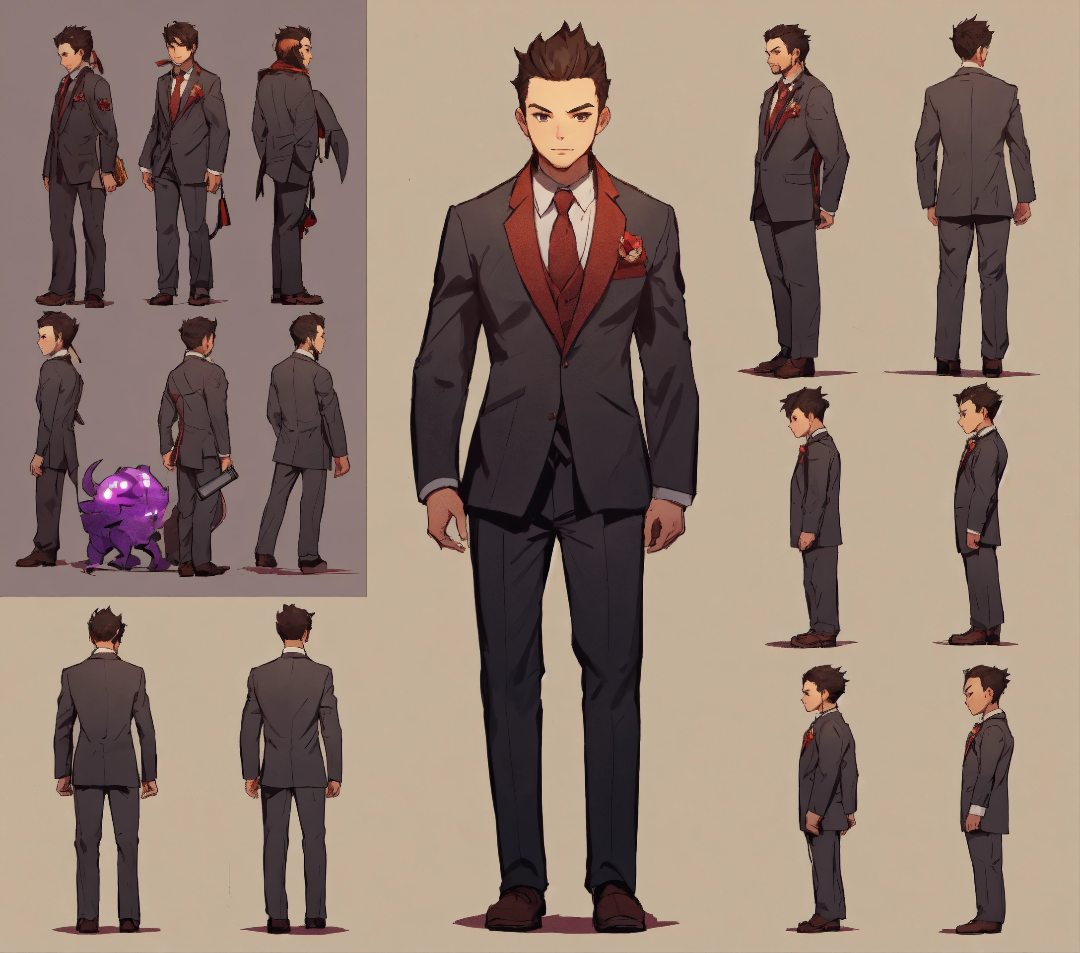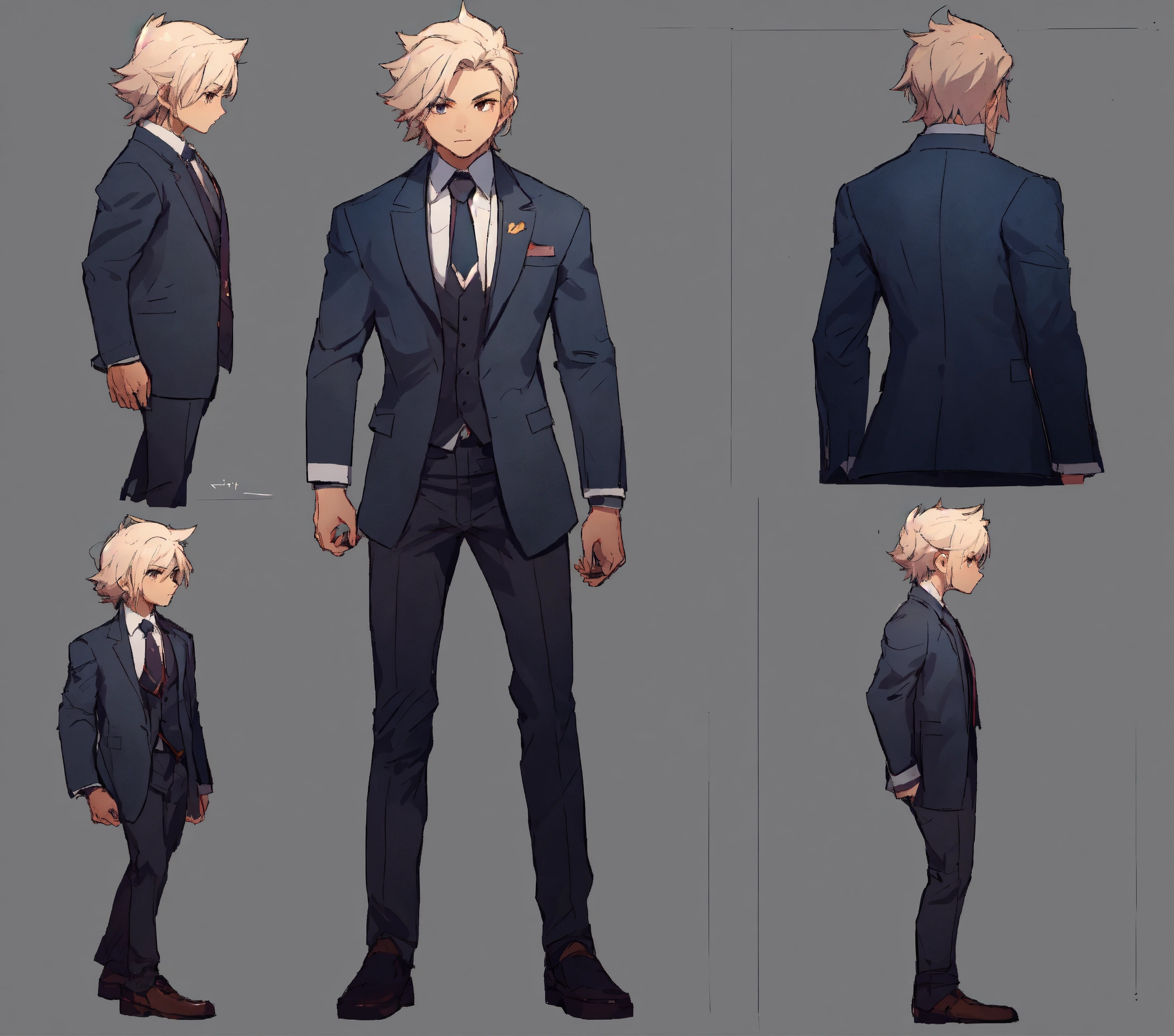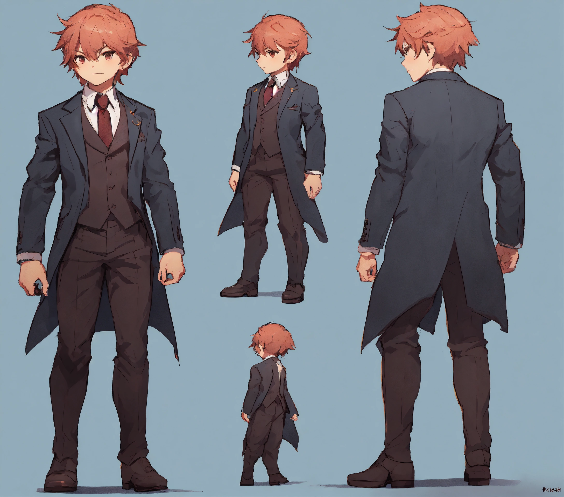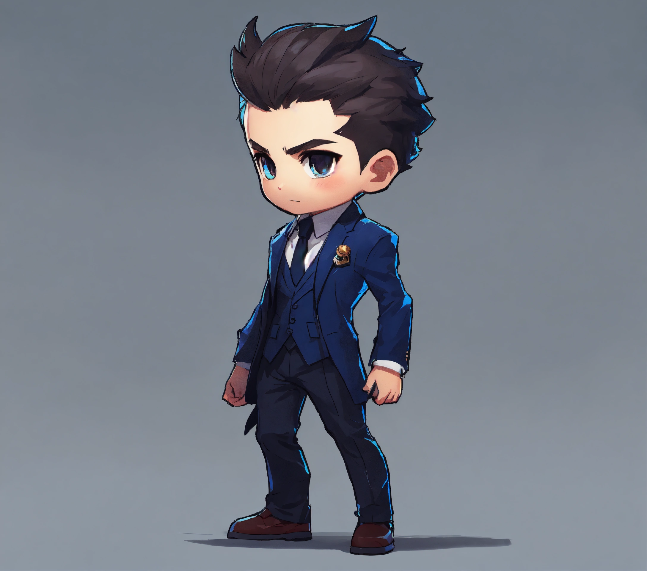 Game assets, concept art, boy, walking, suit, evil, sideview, full body view, blank background, artstyle from the ragnarok, chibi proportions