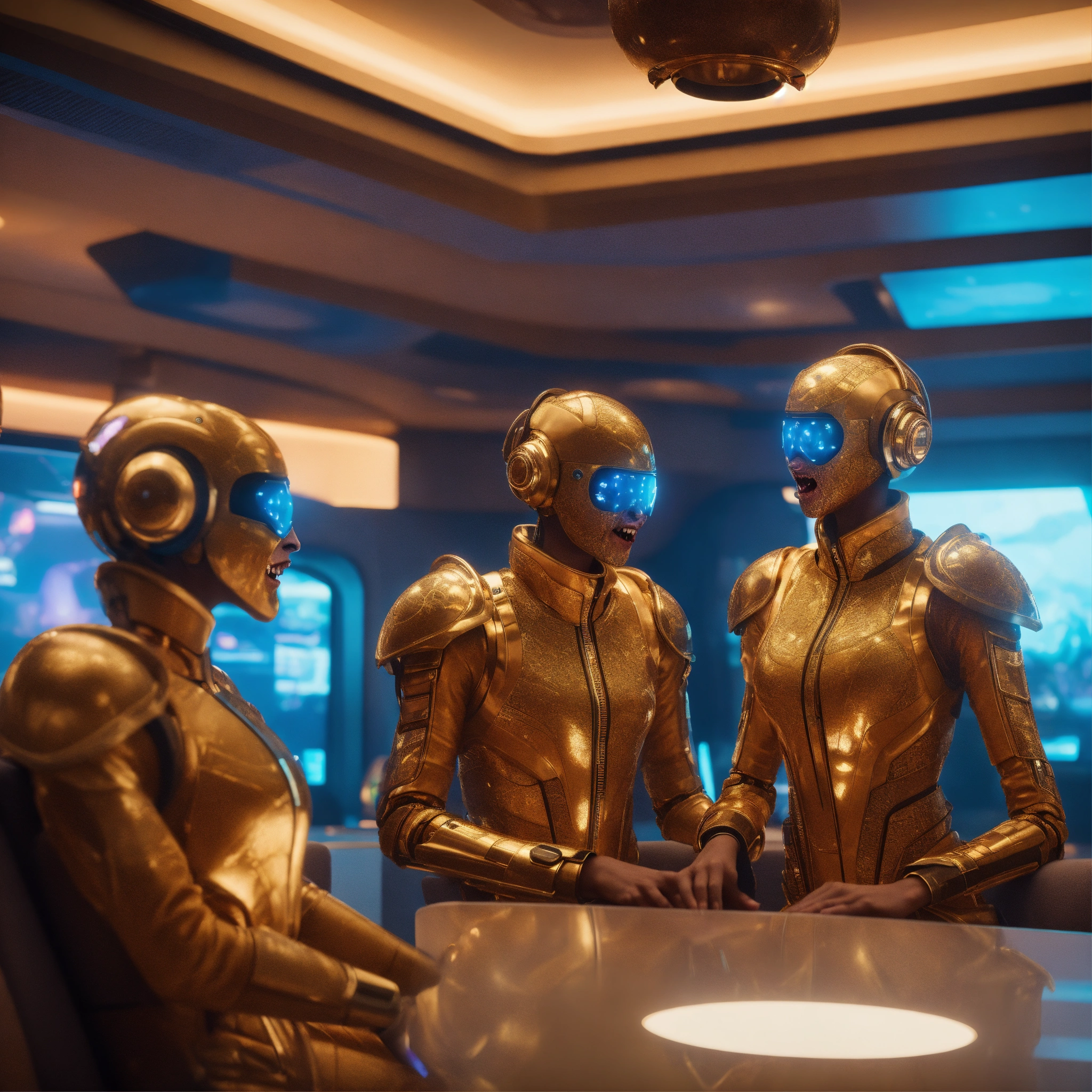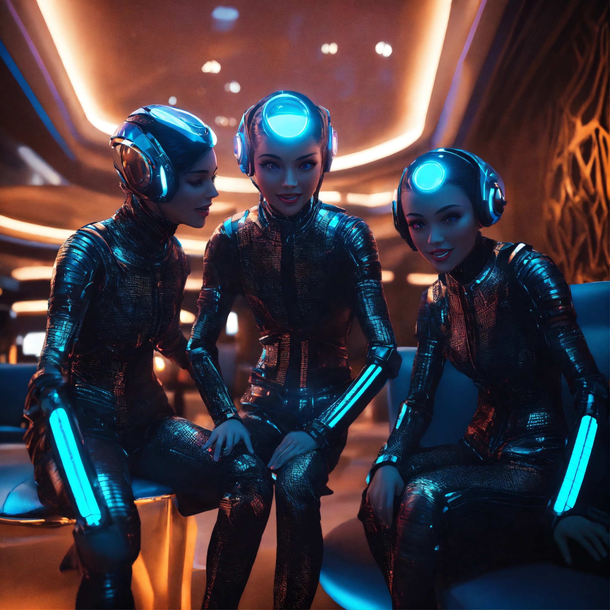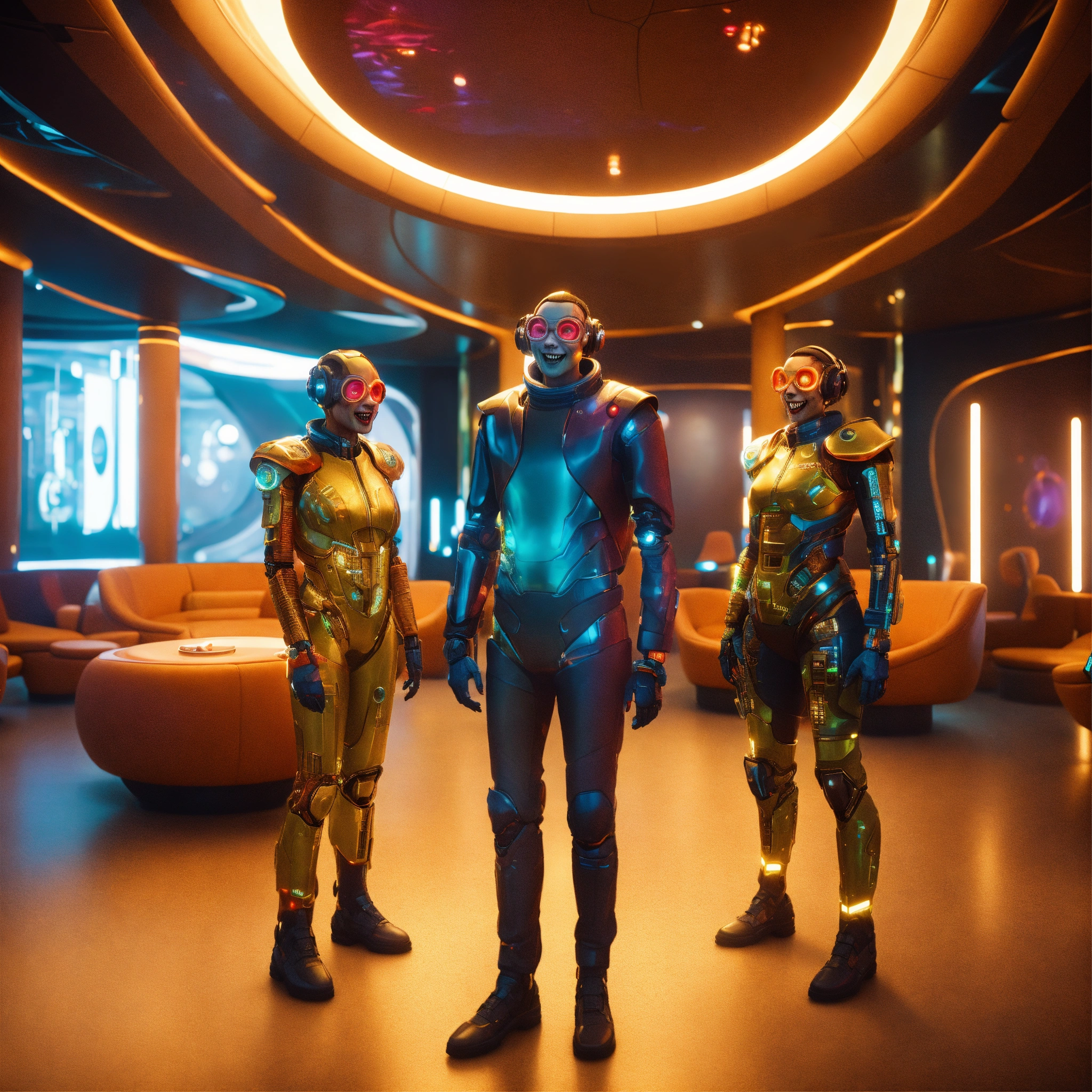 Close up of 3 humanoid traveler in futuristic space clothes that are hypnotized zombies wearing stylish futuristic clothes that are laughing and havinga good time relaxing in a luxurious space port hotel lounge reception area, realistic, futuristic, sci-fi, 8k, unreal engine, pixar, disney, zaha hadid