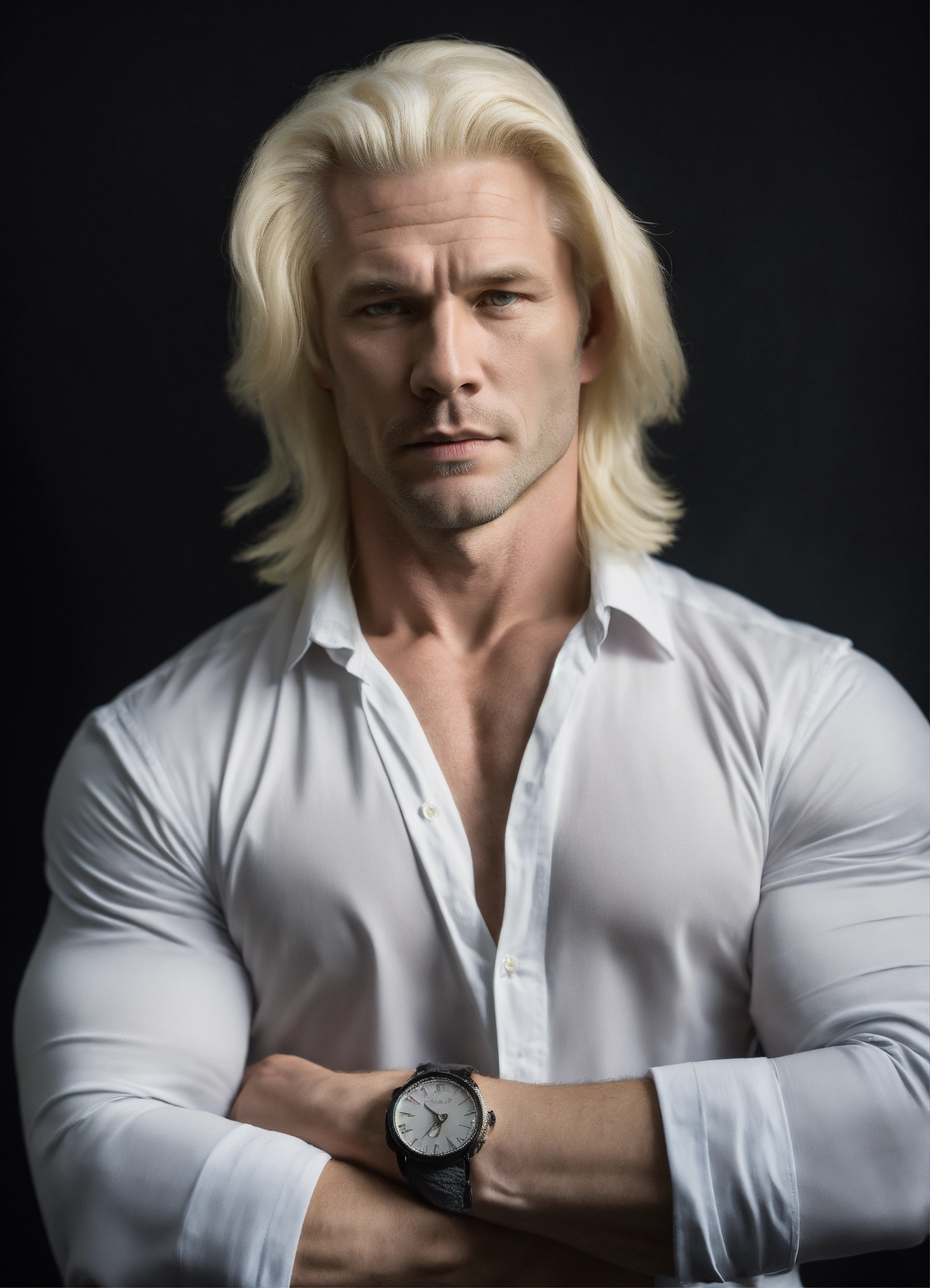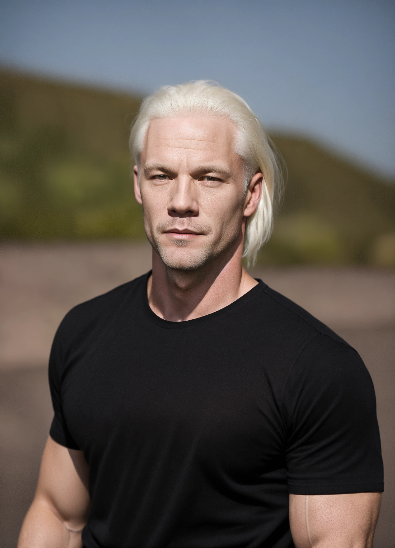 Gorgeous 40-year-old albino man with white shoulder-length hair, and a muscular build. dressed in a black shirt, black pants, and black shoes.