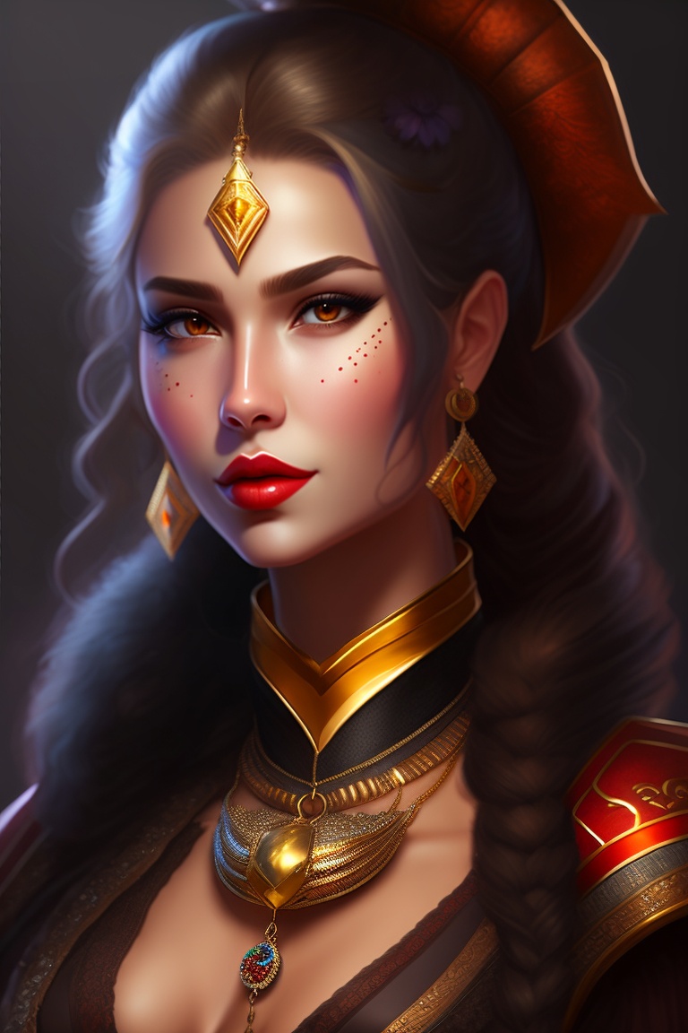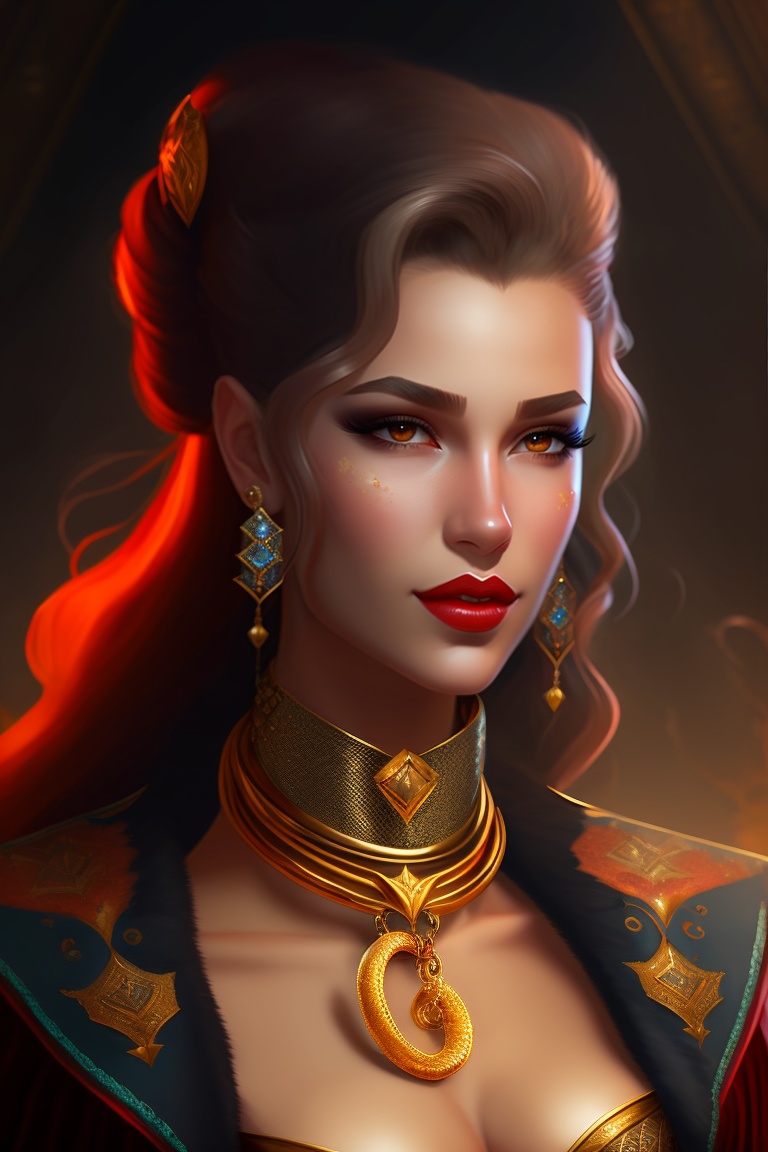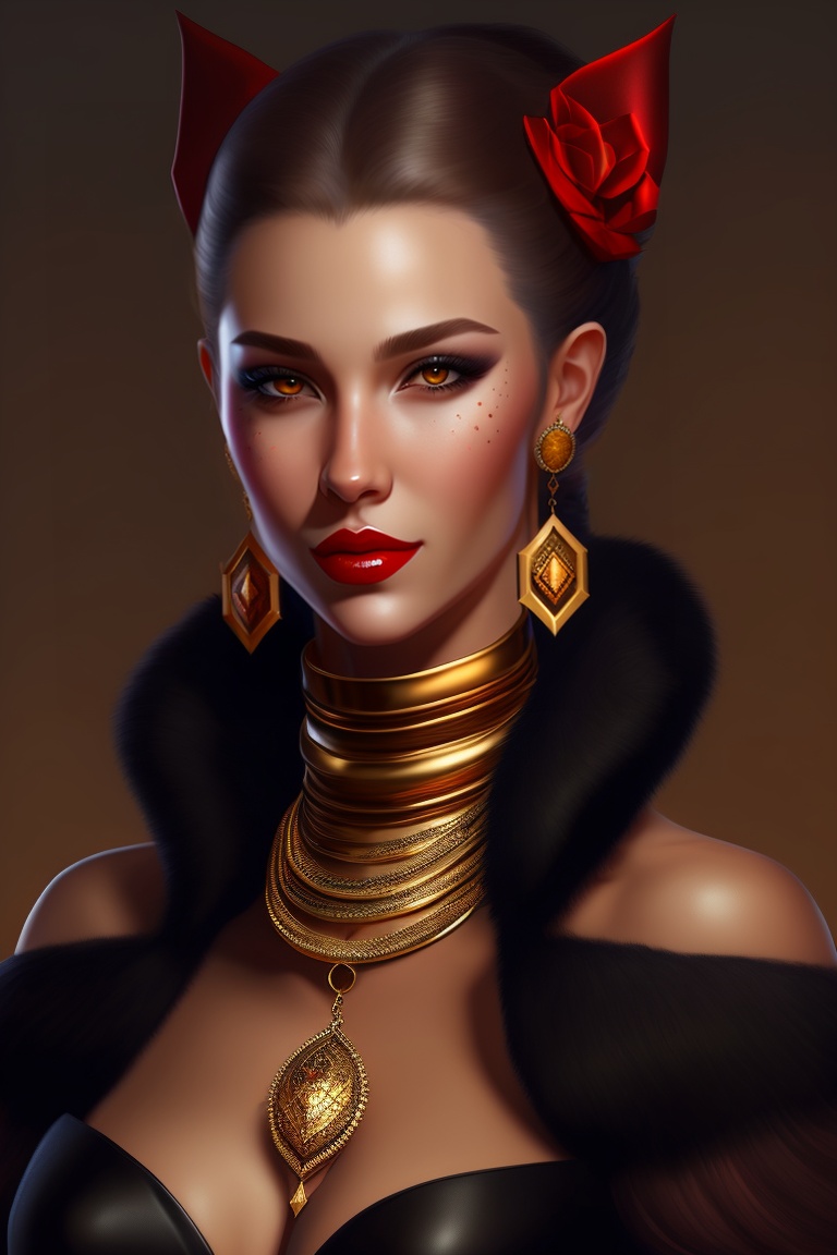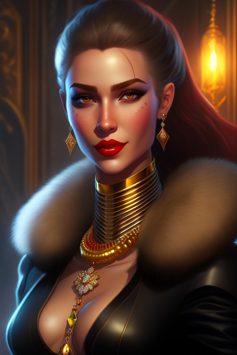 A female vampire dressed in the fur of mythical creatures, with a golden snake necklace around her neck