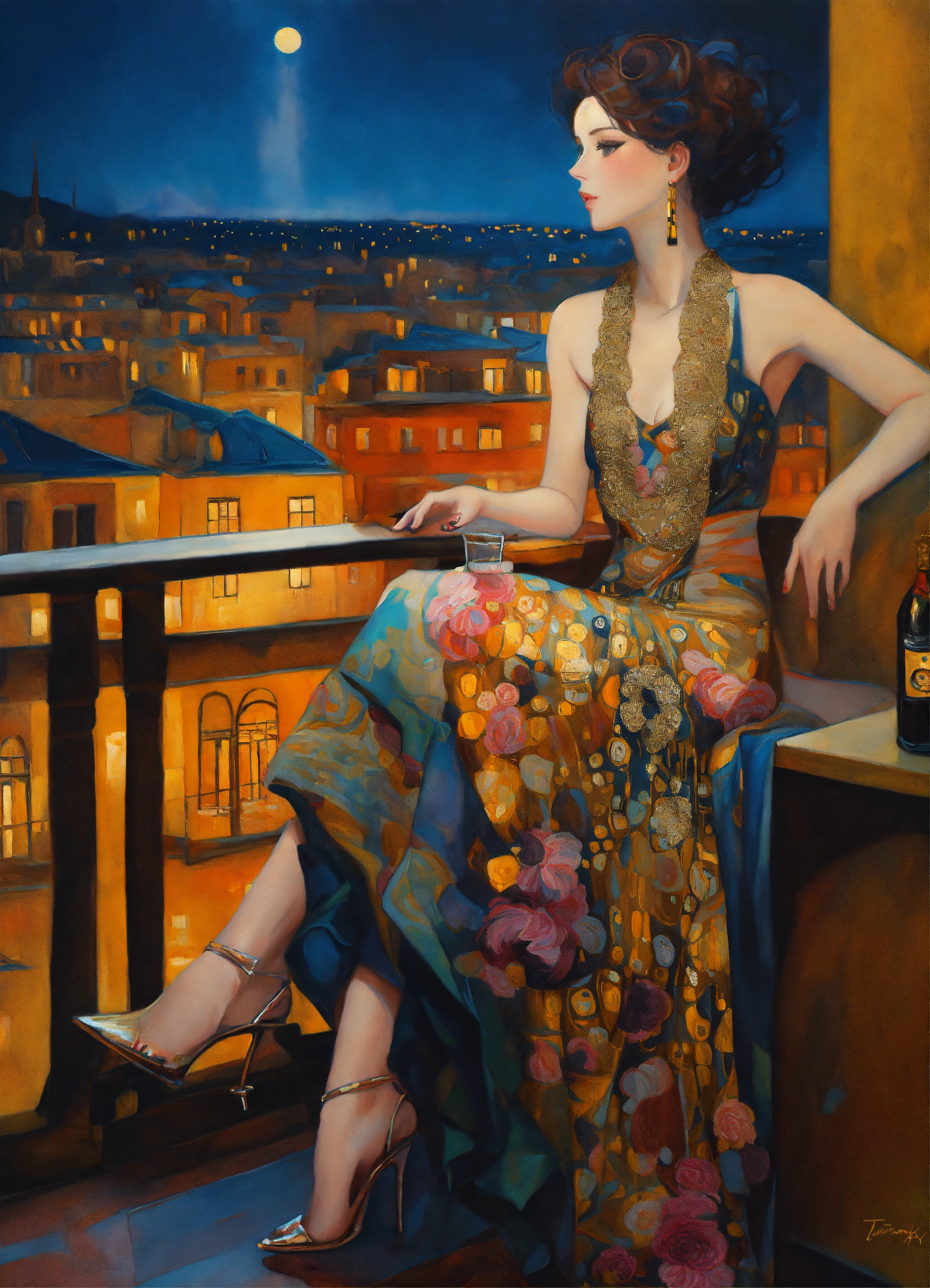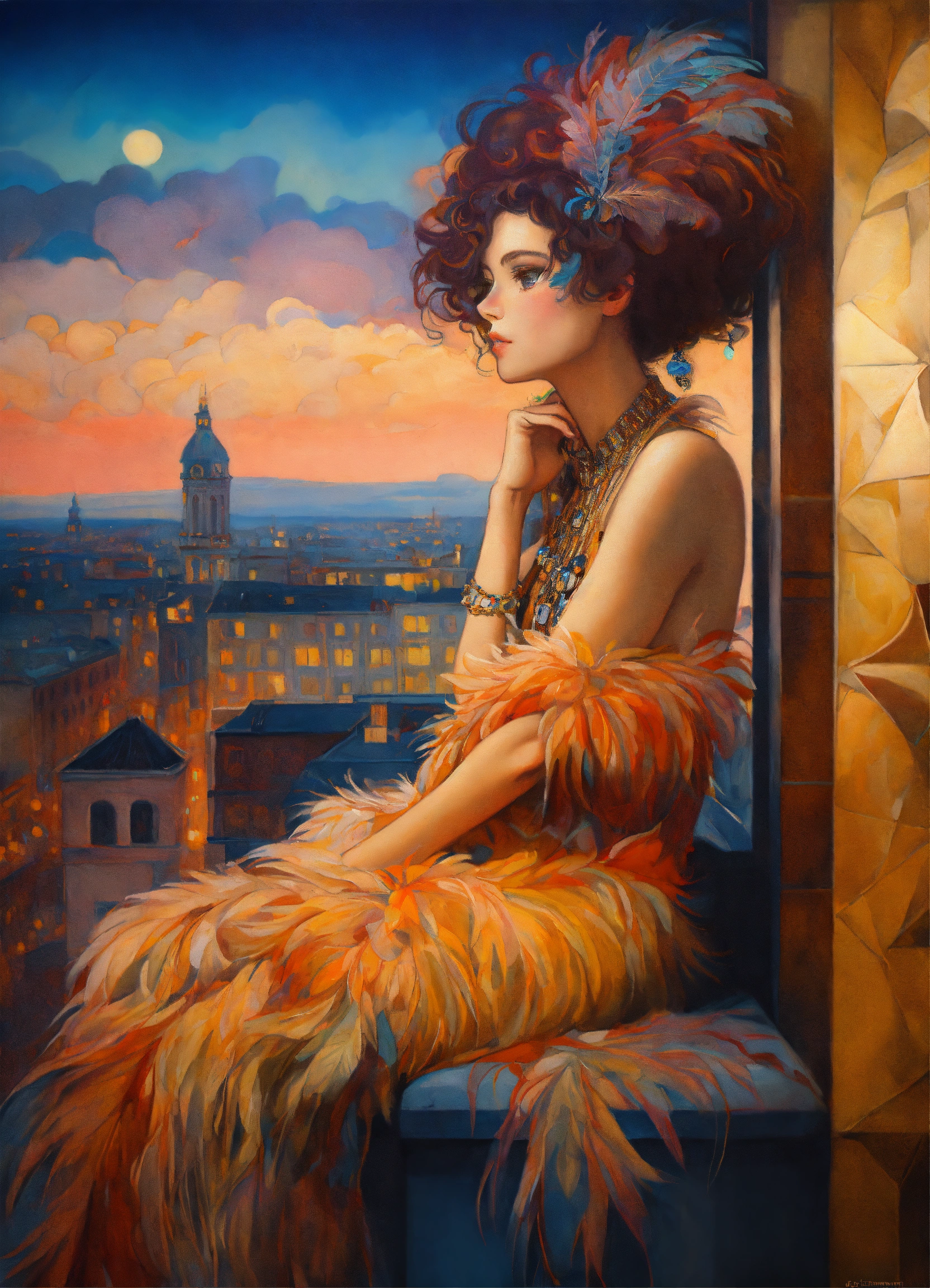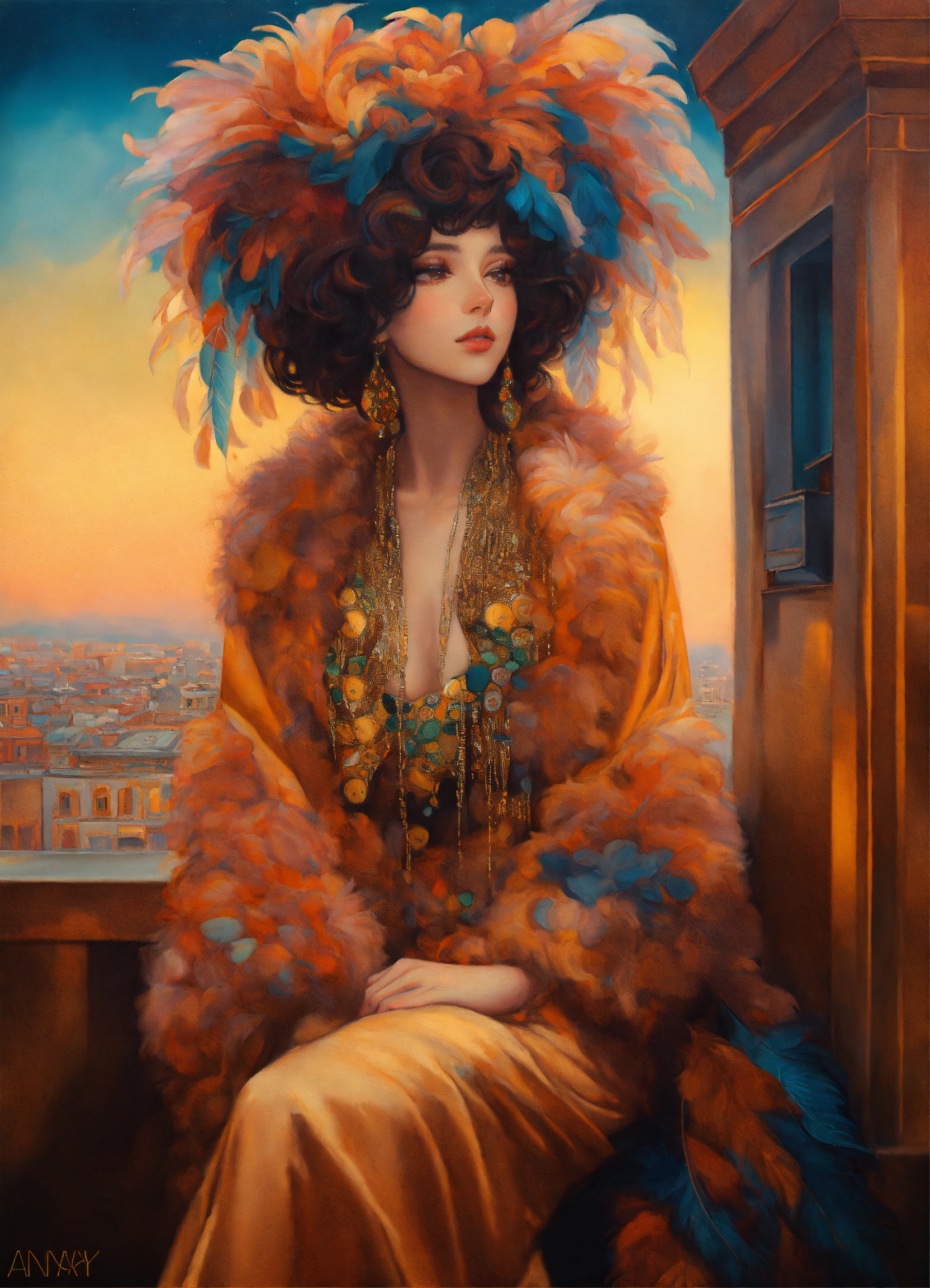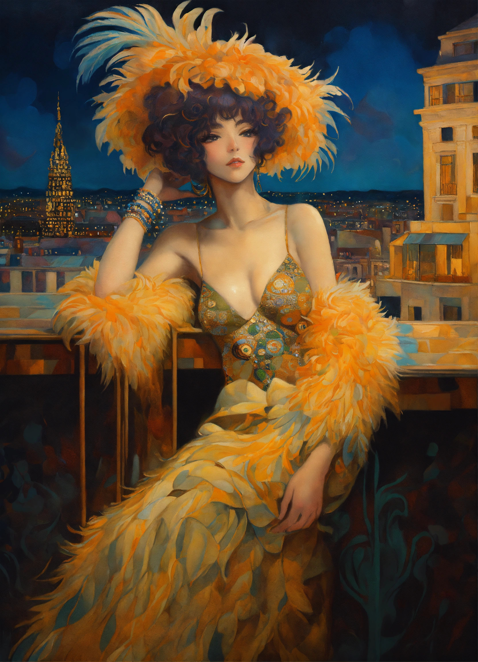 Breathtaking oil painting of a fashionable homeless woman wearing a feather boa sitting in a rooftop bar, by gustav klimt, by tarkay, by anna dittman, intricate details