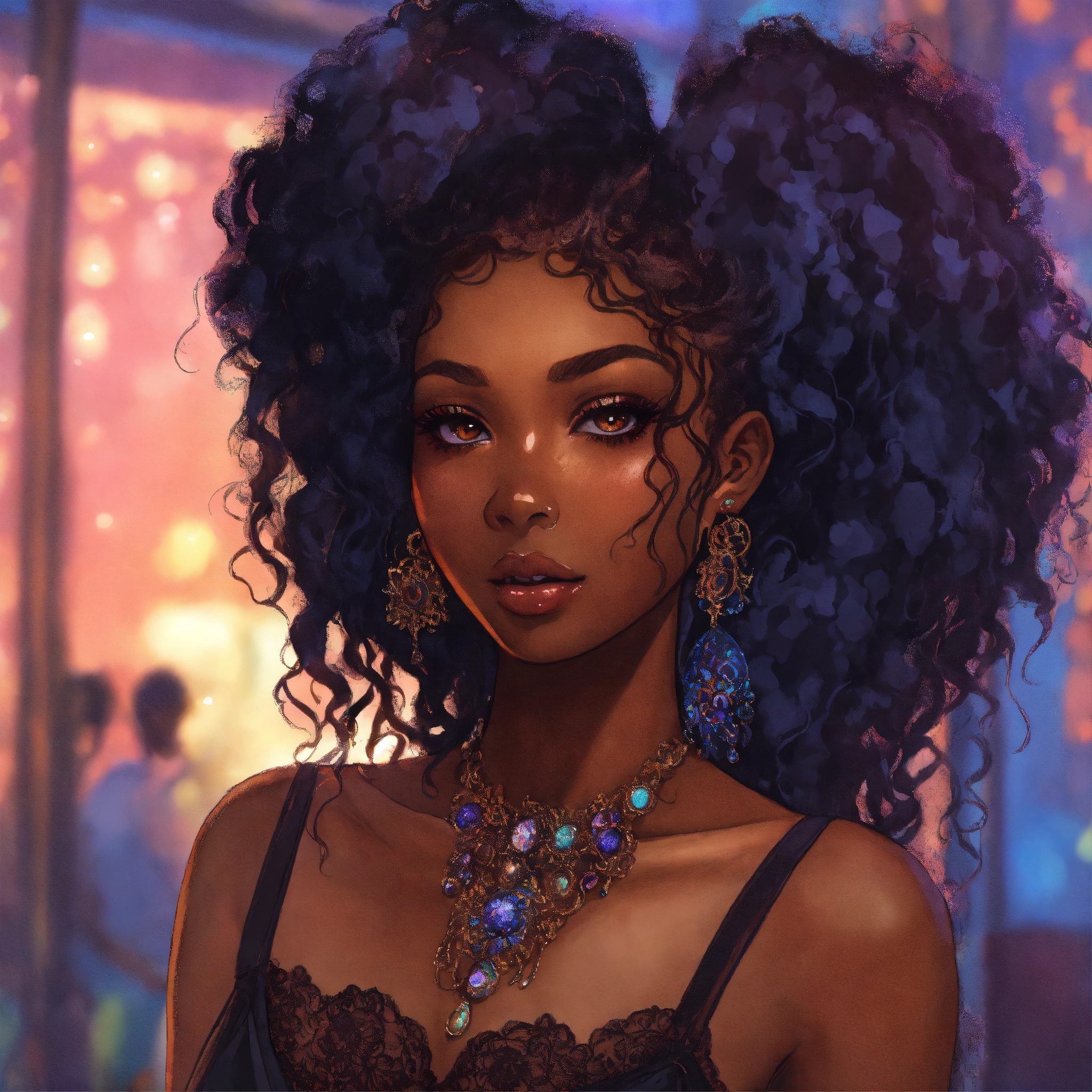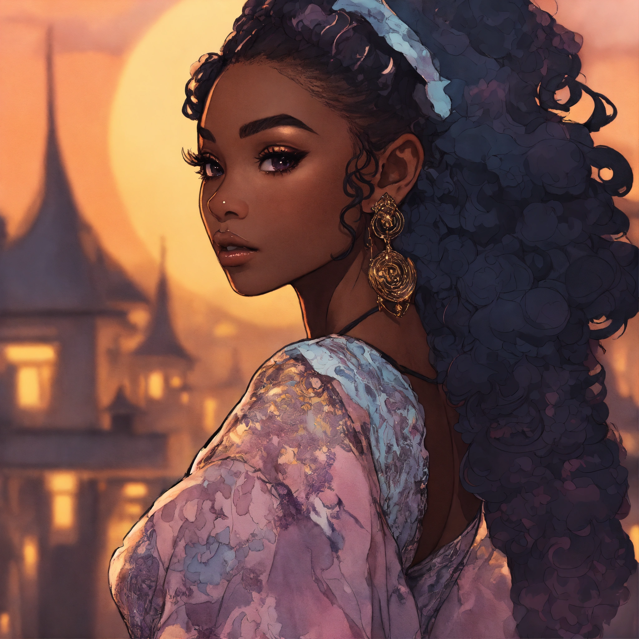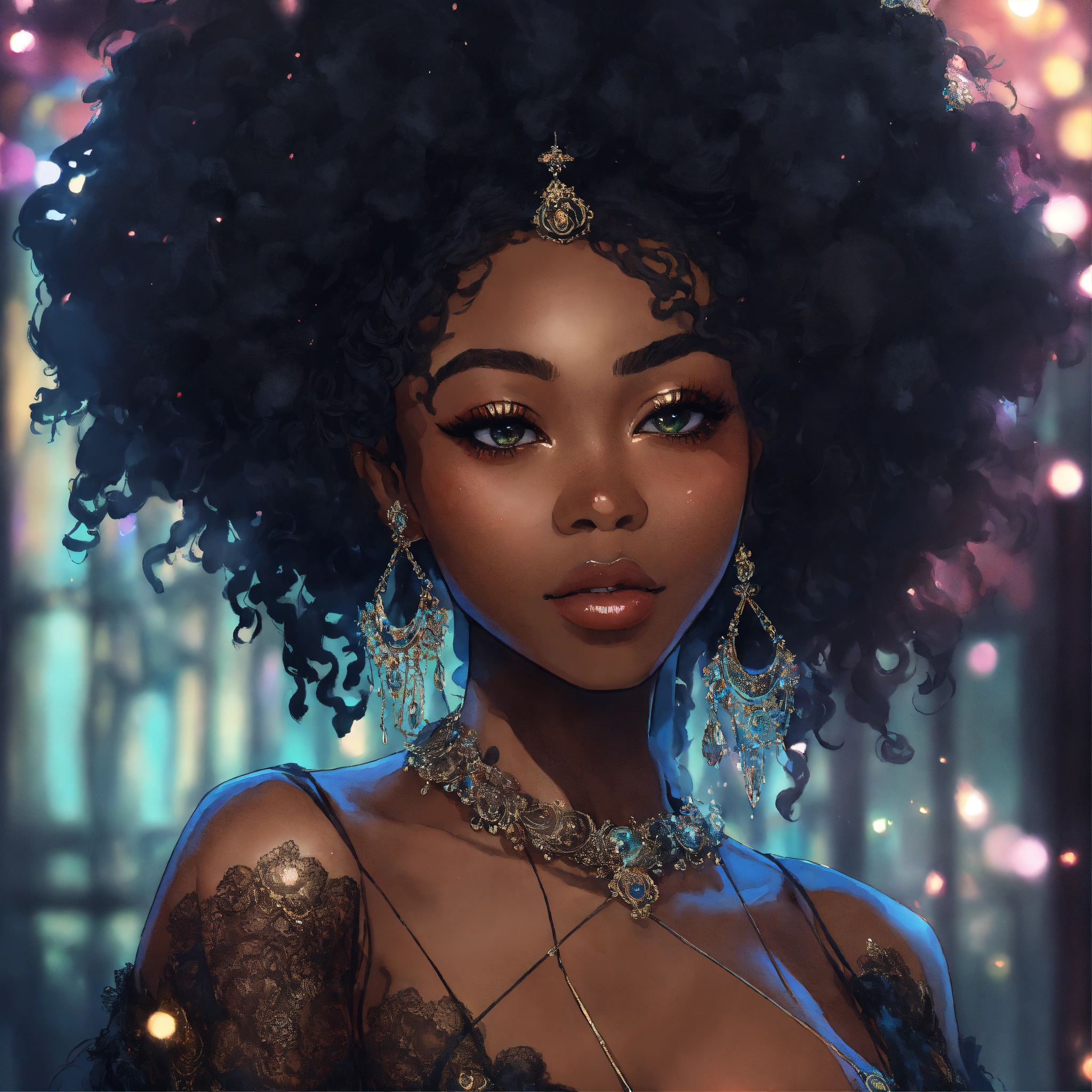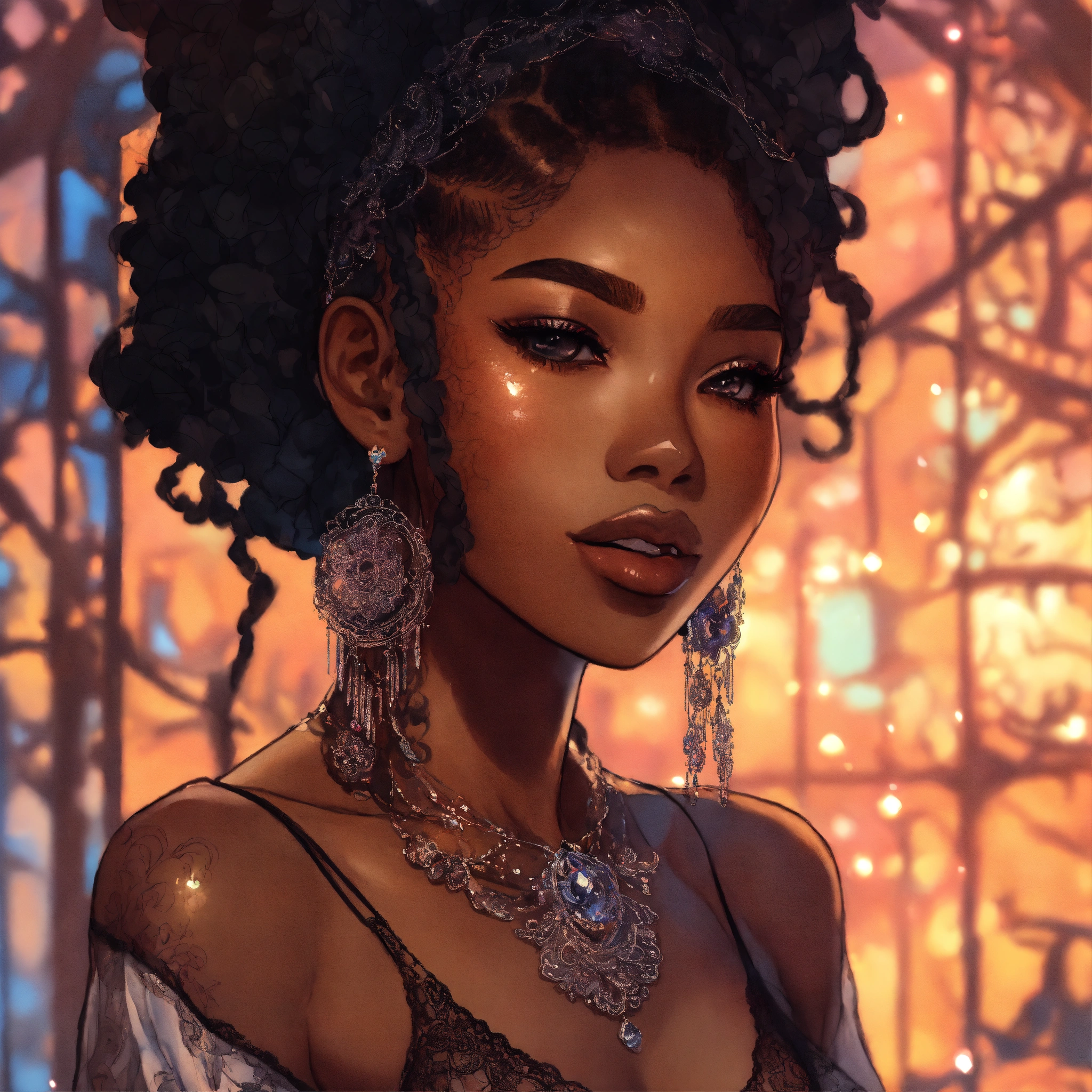 Lace goth lore, dark nigerian complexion african american woman looking back over her shoulder, swirls of rich surreal melting subtle glasslike skin, beautiful woman, extreme gyaru makeup aesthetic, hyper realistic, warm cam, sharp detail, back twinkle lighting, over the top gyaru trend style, watercolor, ghibli cartoon style, rule of thirds