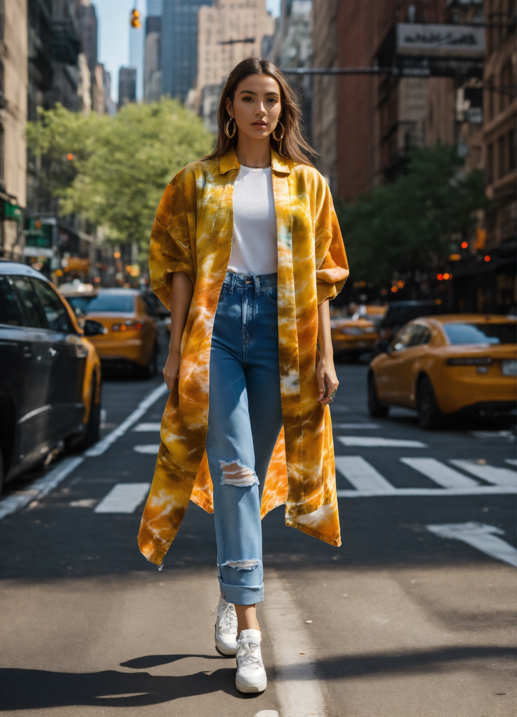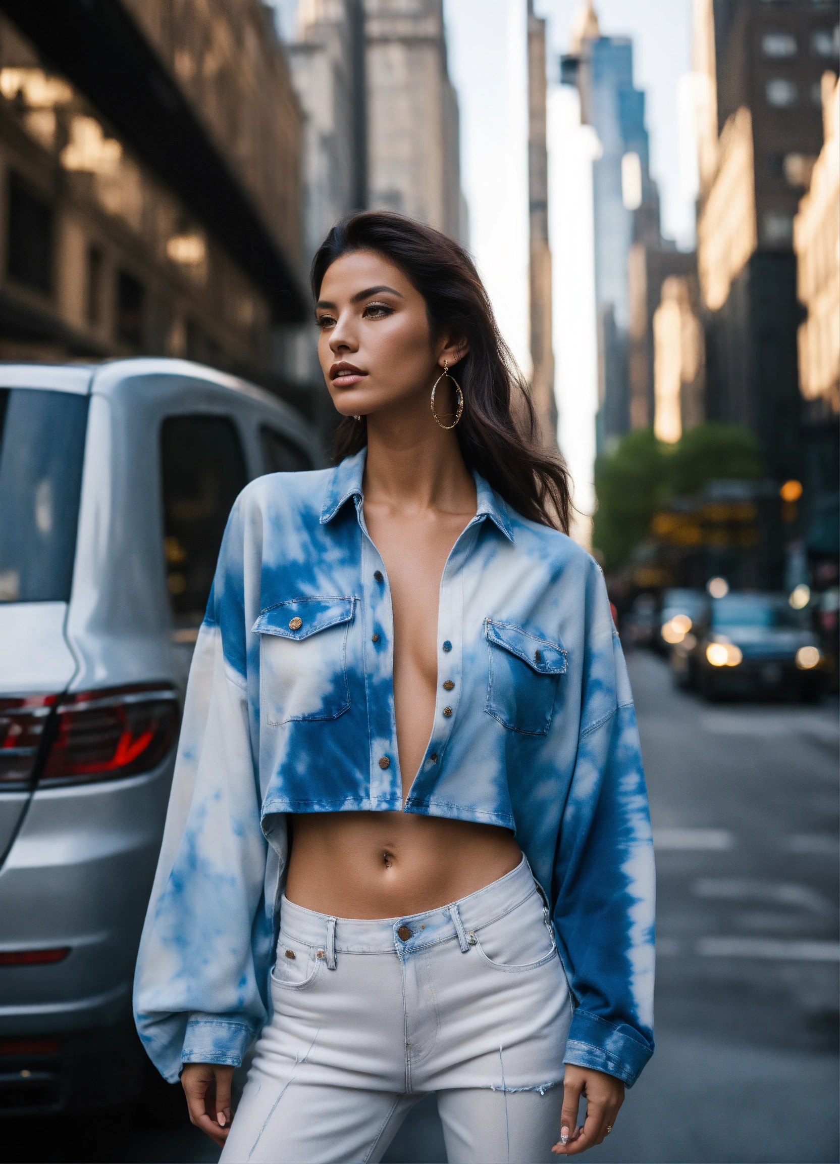 Ultra realistic full body photo of athletic italian female model modeling upscale dolman sleeve travel inspired marble shibori dyed denim outfit with cool elements in new york