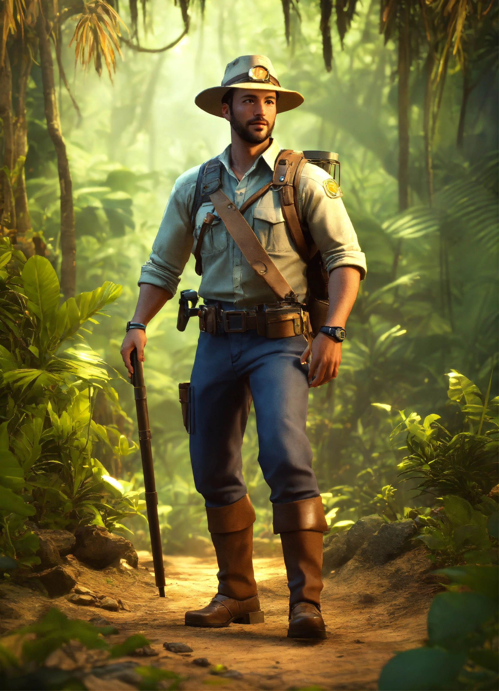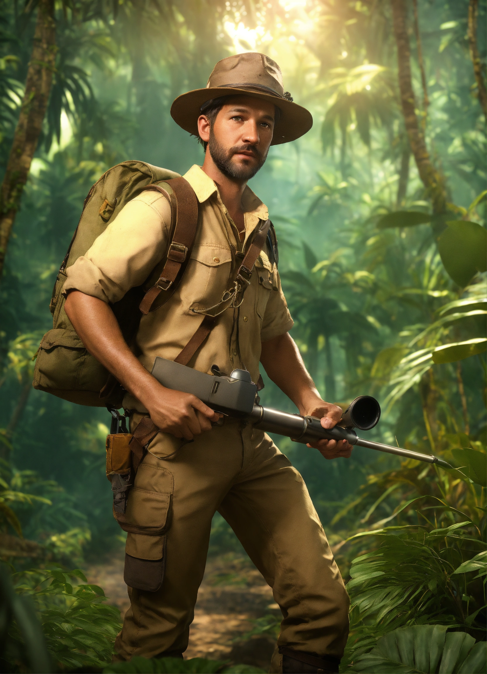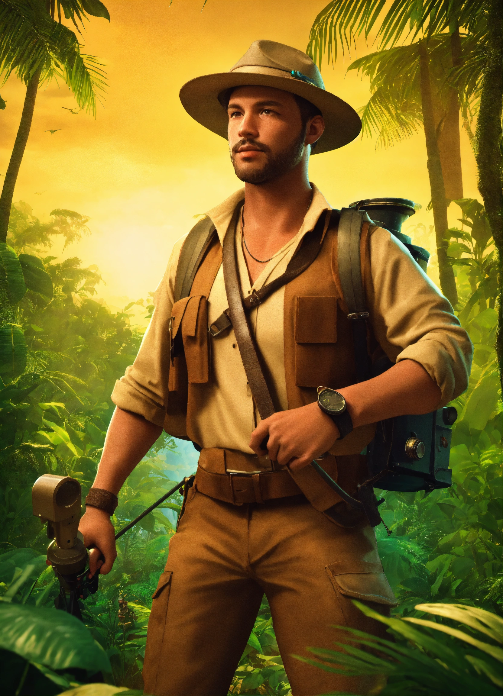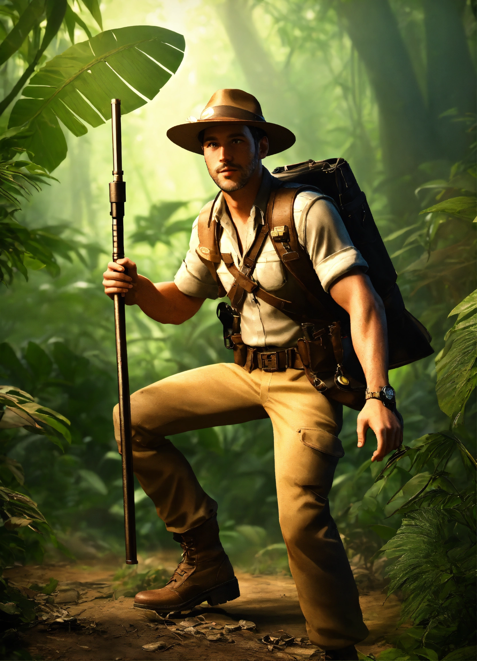 A 35-years-old treasure hunter with a explorer hat and dressed in a explorer outfit, with in a metal detector in one hand and with a jungle map in to the other hand, with in a jungle. detailed image with vintage 3d video game animation style, with great lighting and tension.