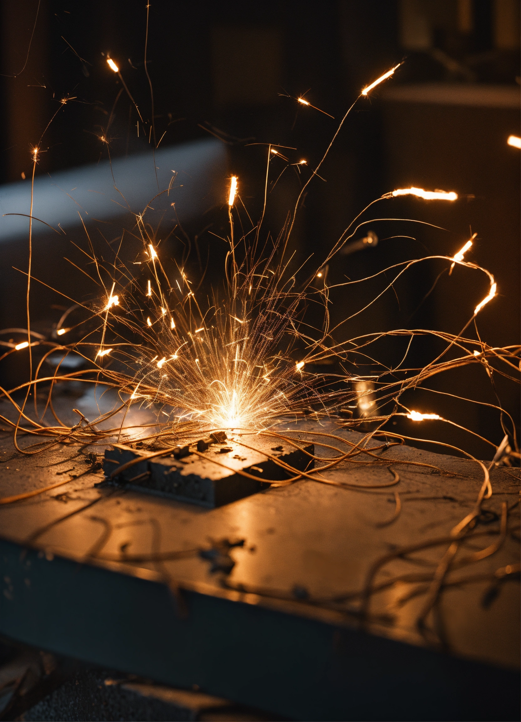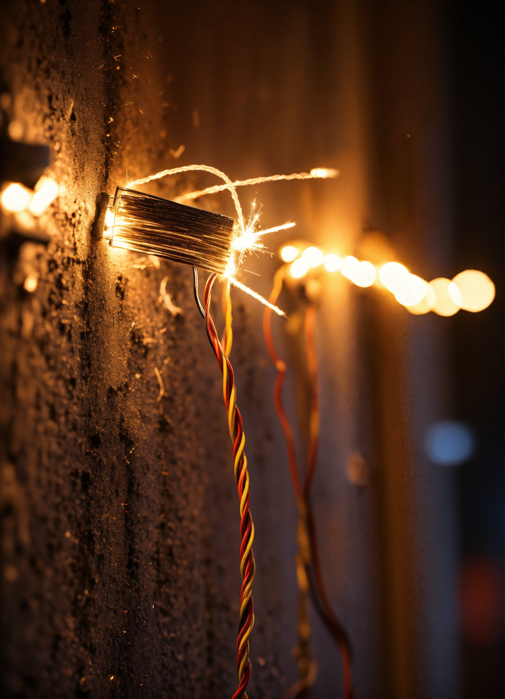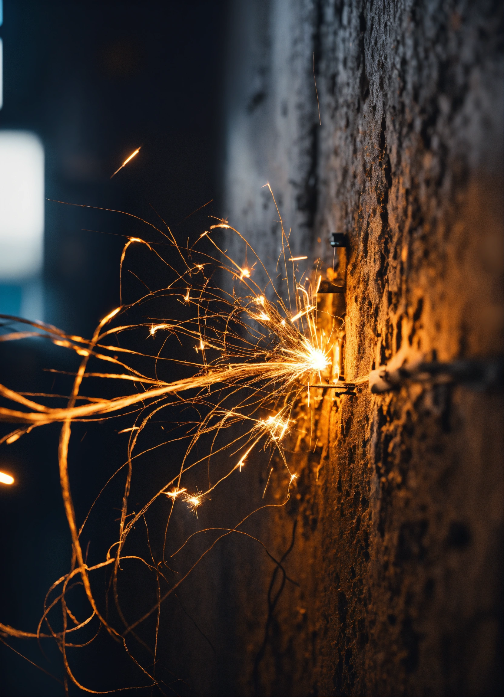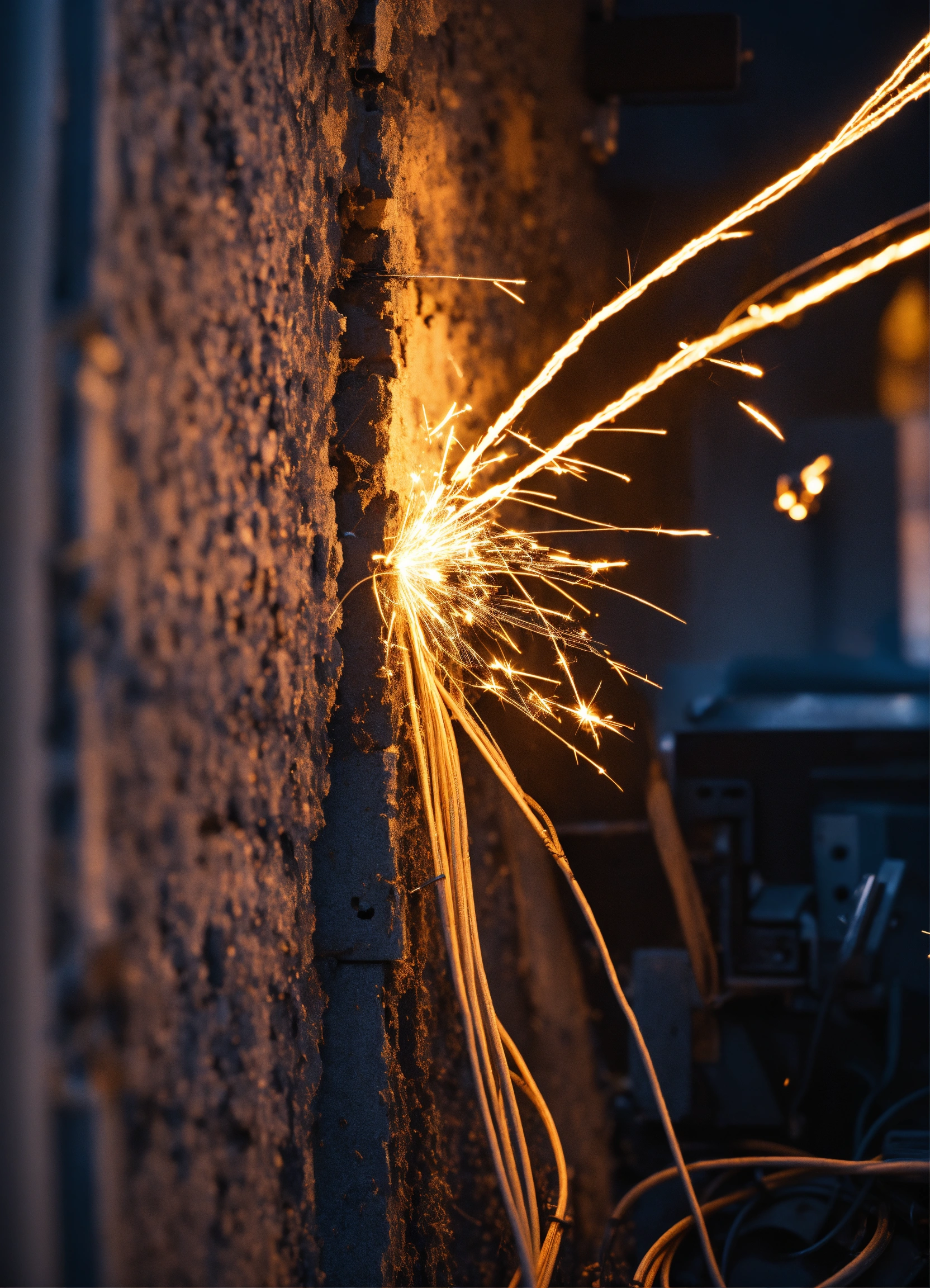 Loose electrical wires with sparks that can cause damage, damaged wall, debris, high quality photography of texture, lighting, volumetric, sharp focus photography, exquisite details, ultra photorealism, depth of field, 8k.