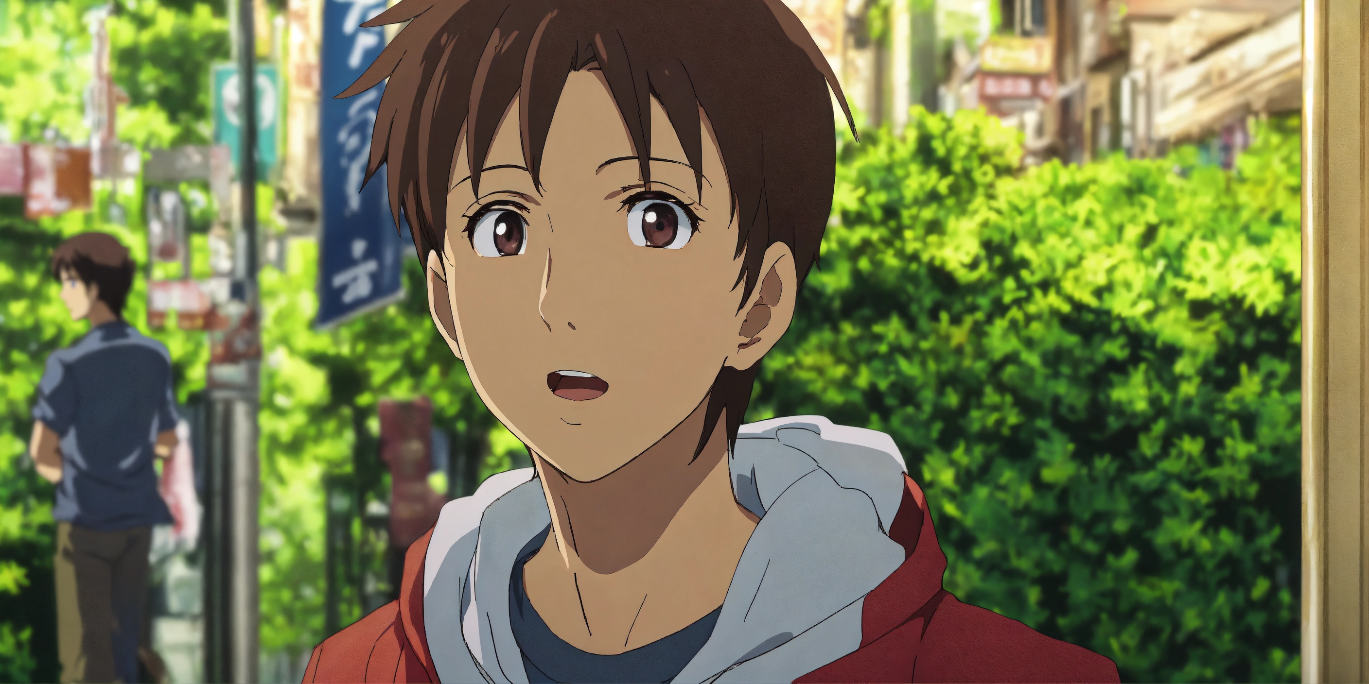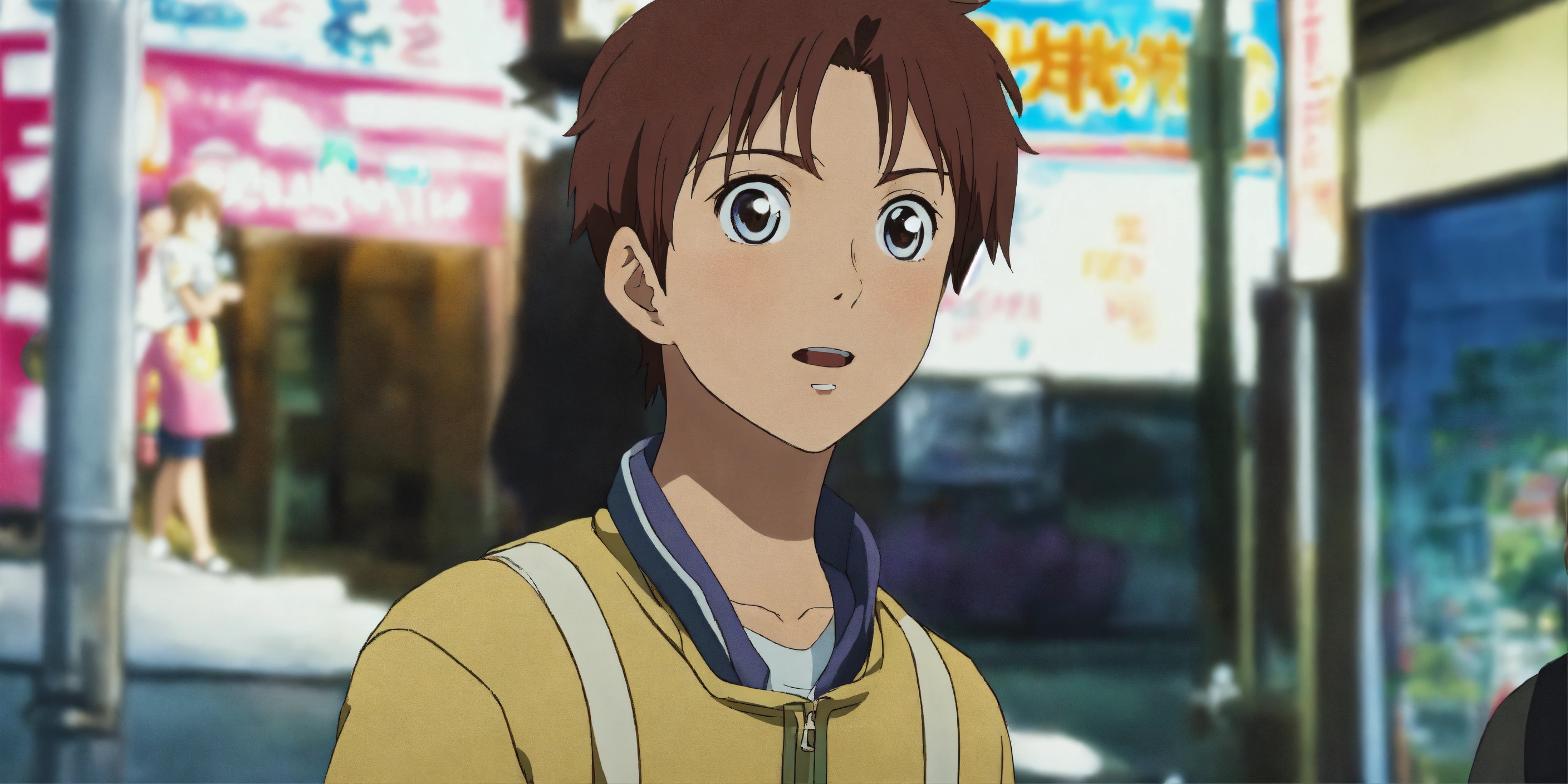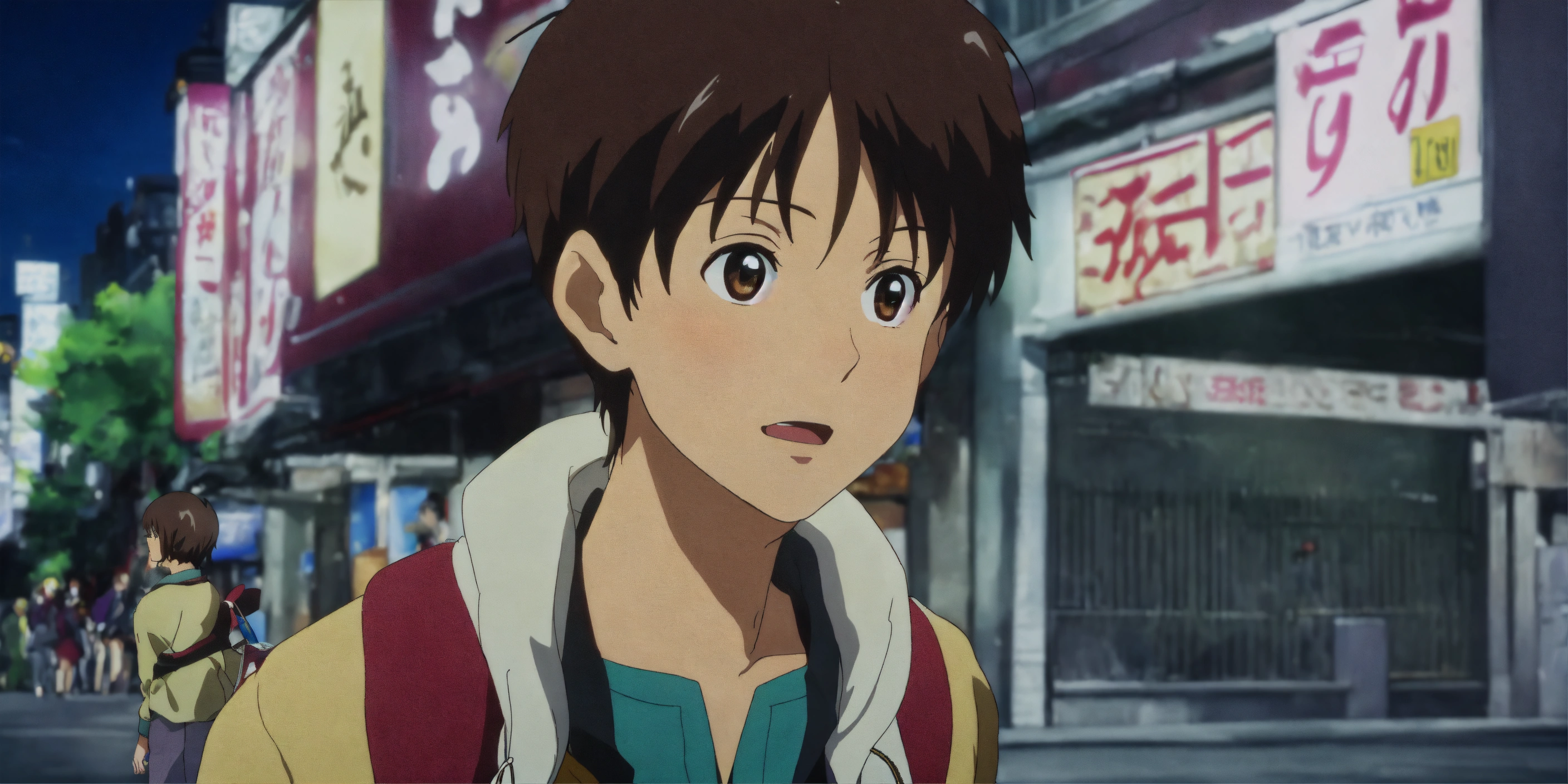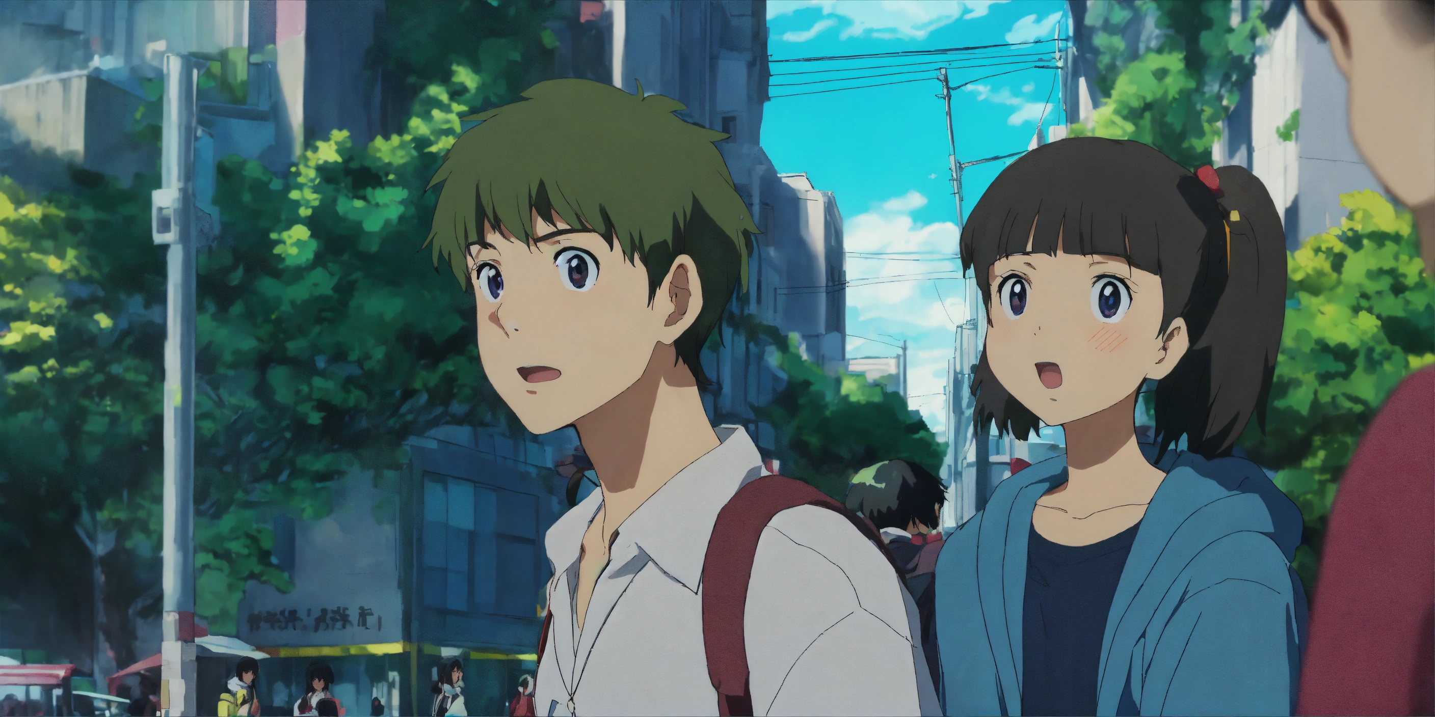 A young guy standing on a bustling street corner, looking at a girl with shining eyes who's passing by with excitement in her expression in anime