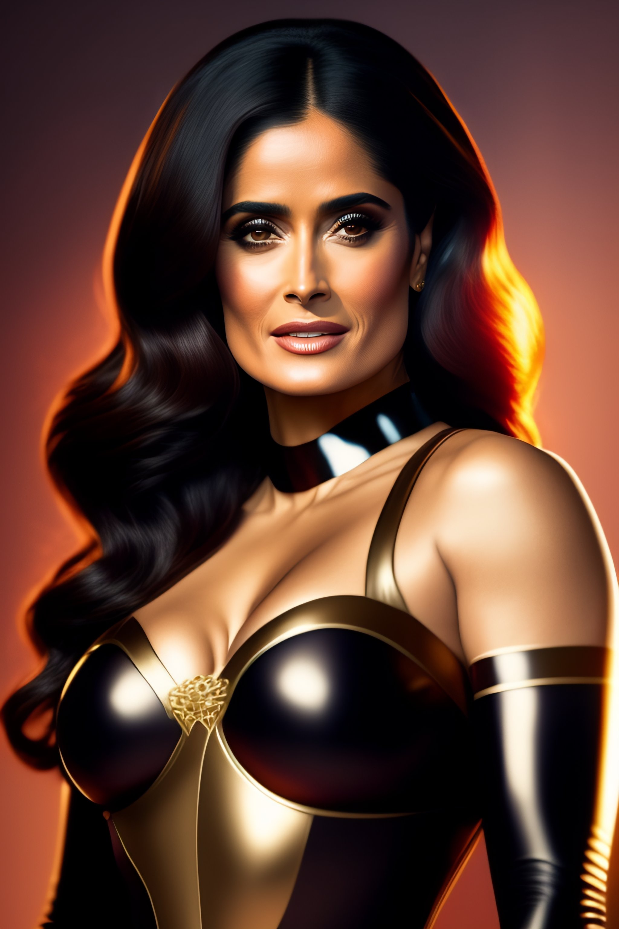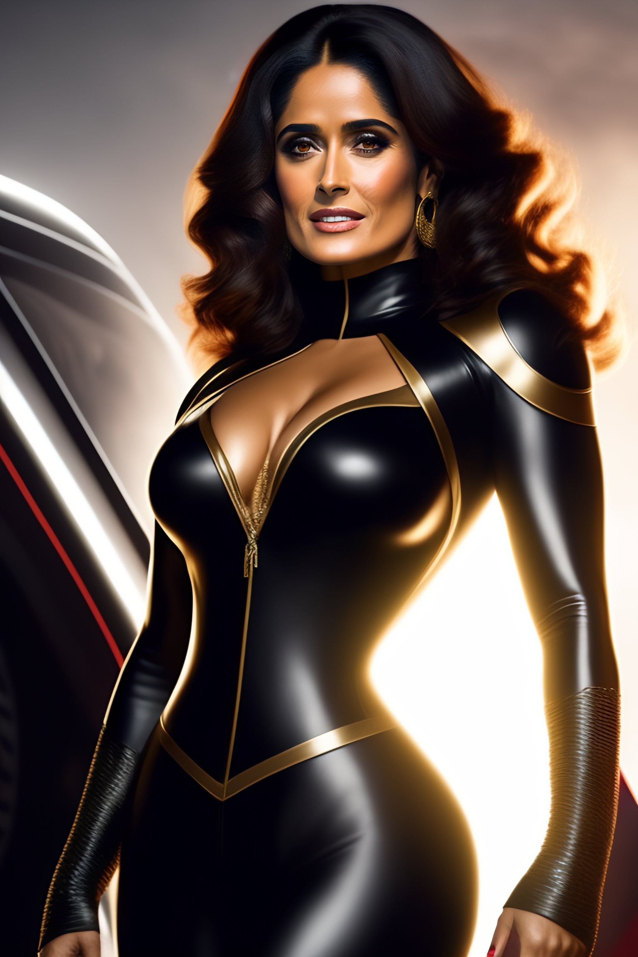 A portrait of salma hayek, superhero of the marvel cinematic universe, women's full-length supersuit, in a catwoman costume