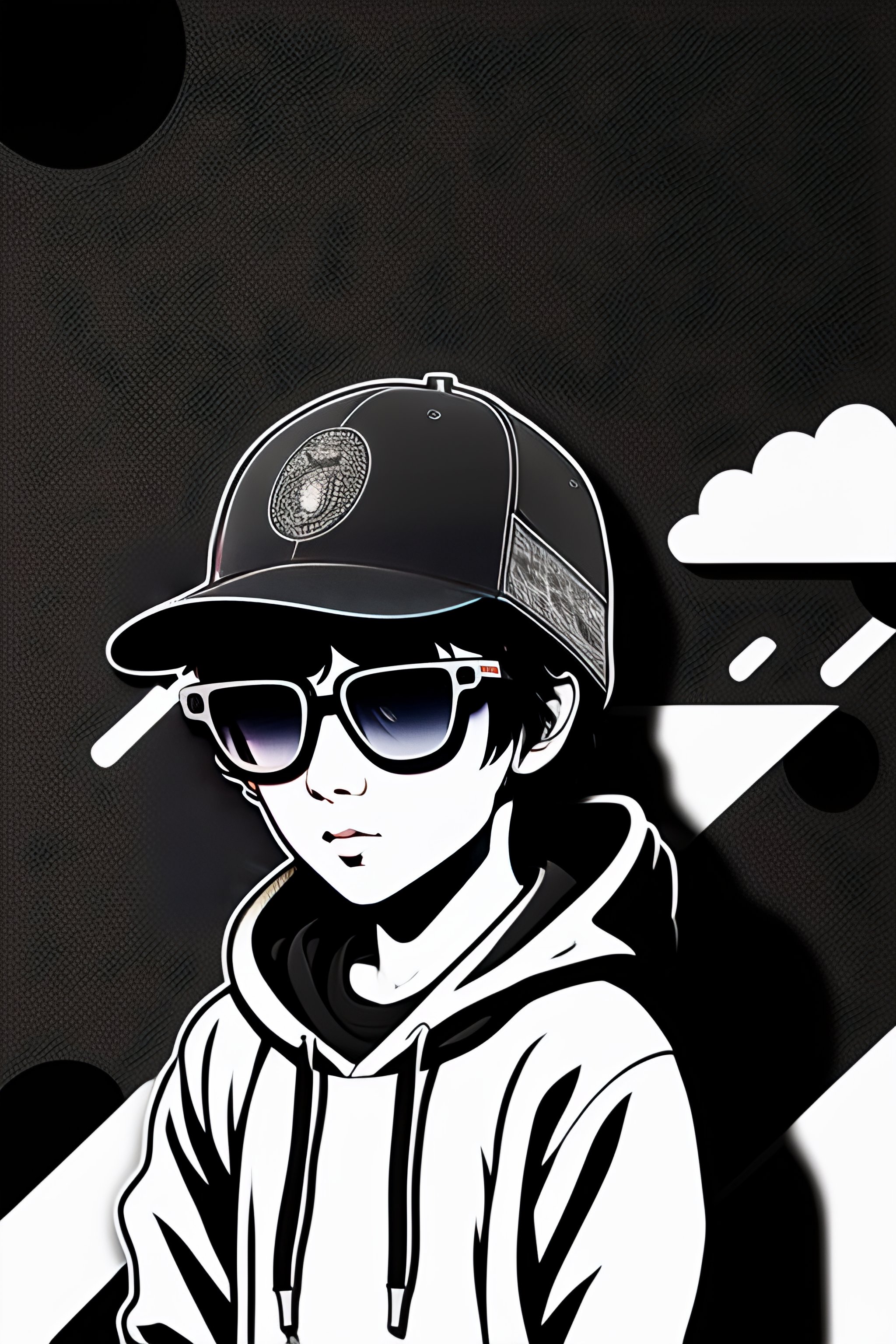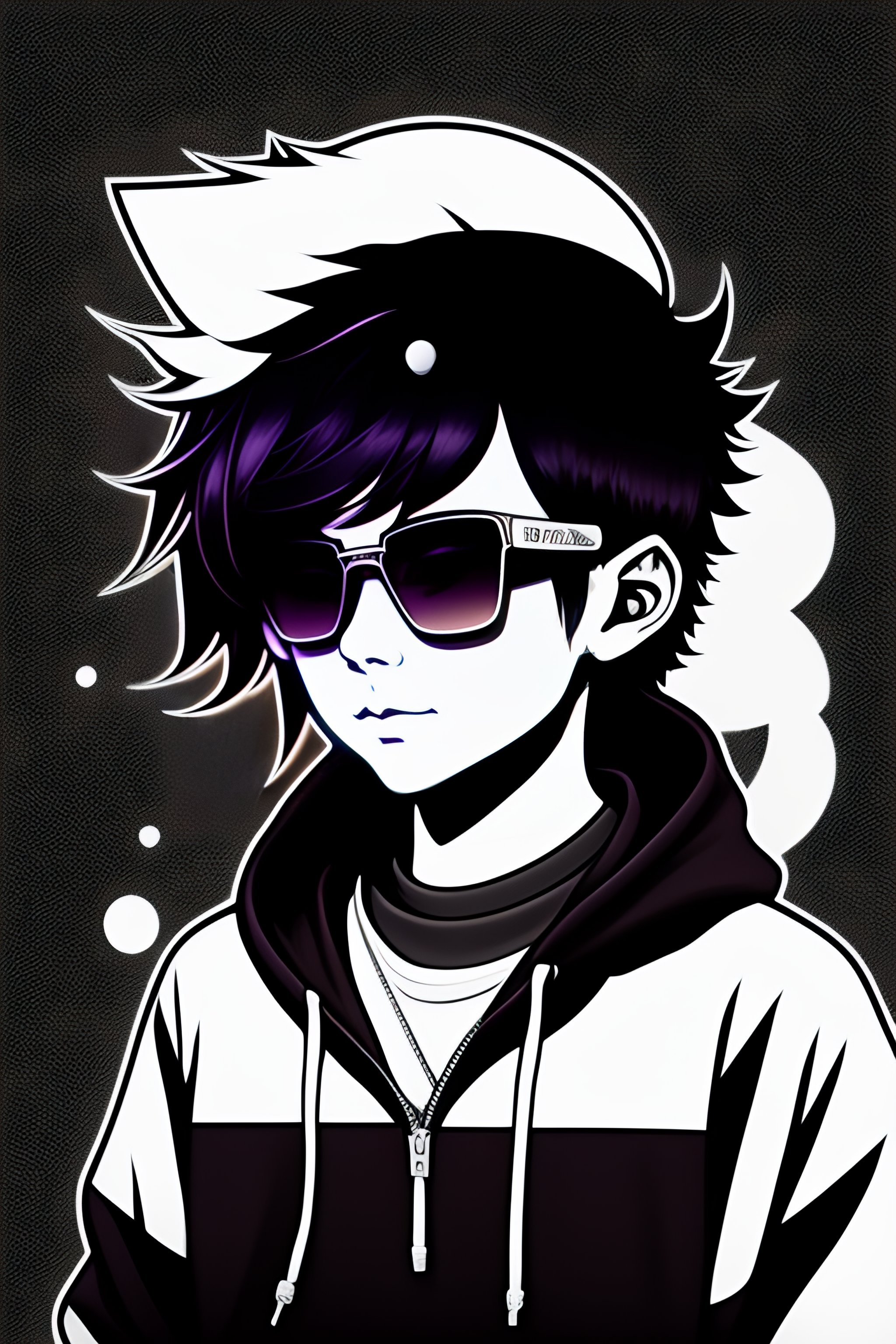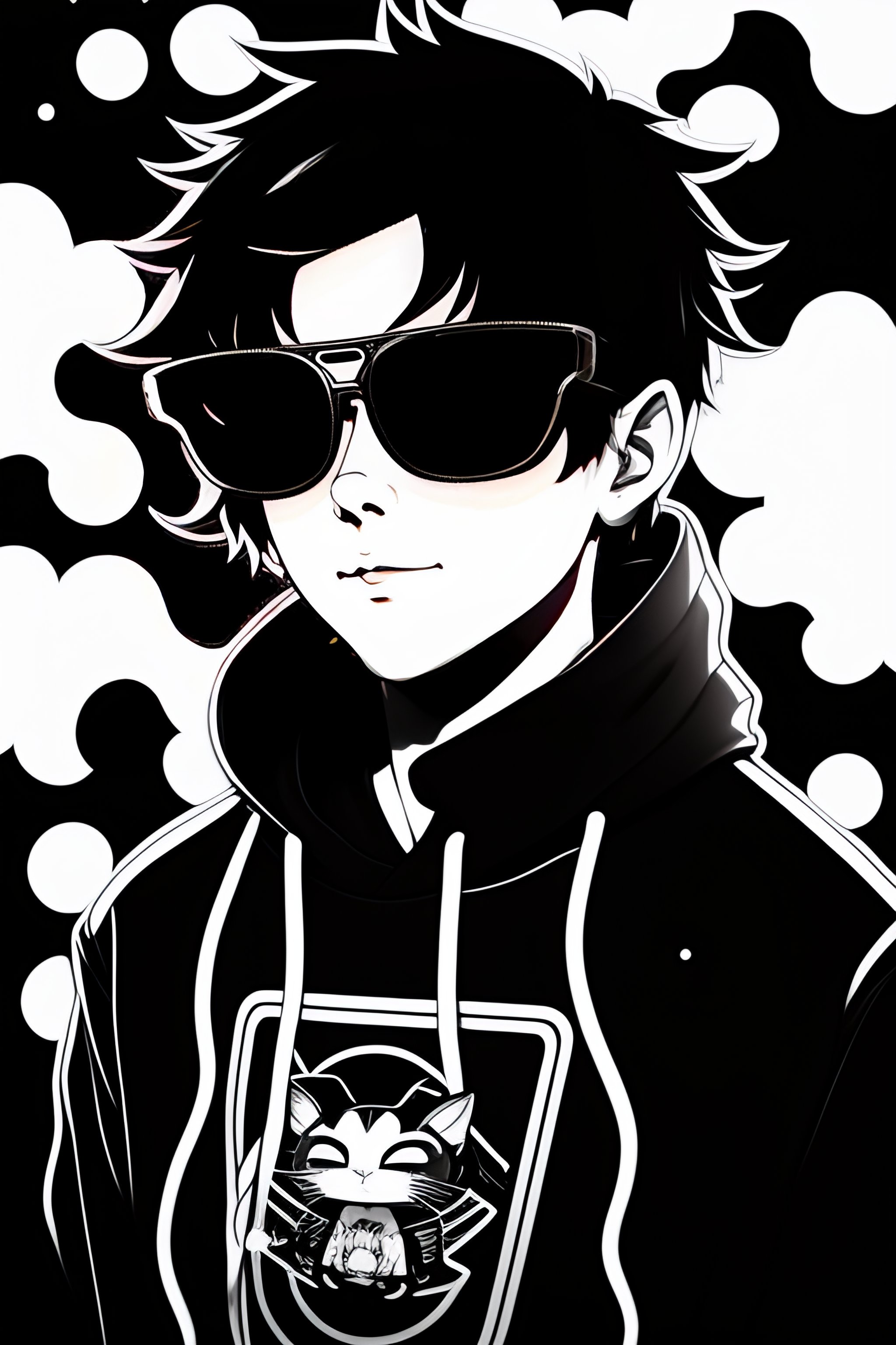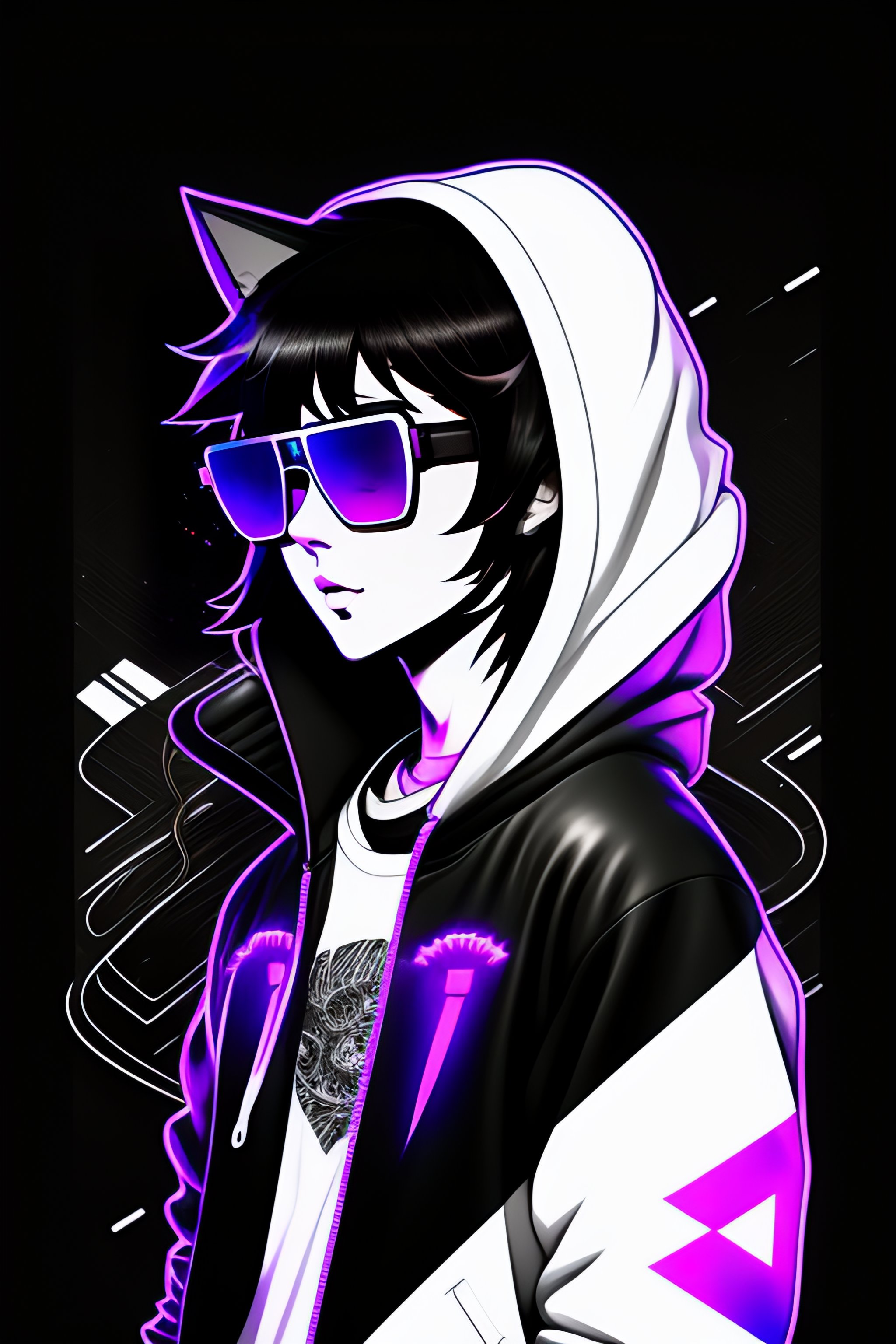 Twitch vtuber model, boy in black hoodie, long dark hair, black and white cat ears, black sun glasses, line art, face dark room, retro anime, manga, black and white, pixels 8 bit, pen drawing, sticker, glitch, neon, pattern, microphone art, comics