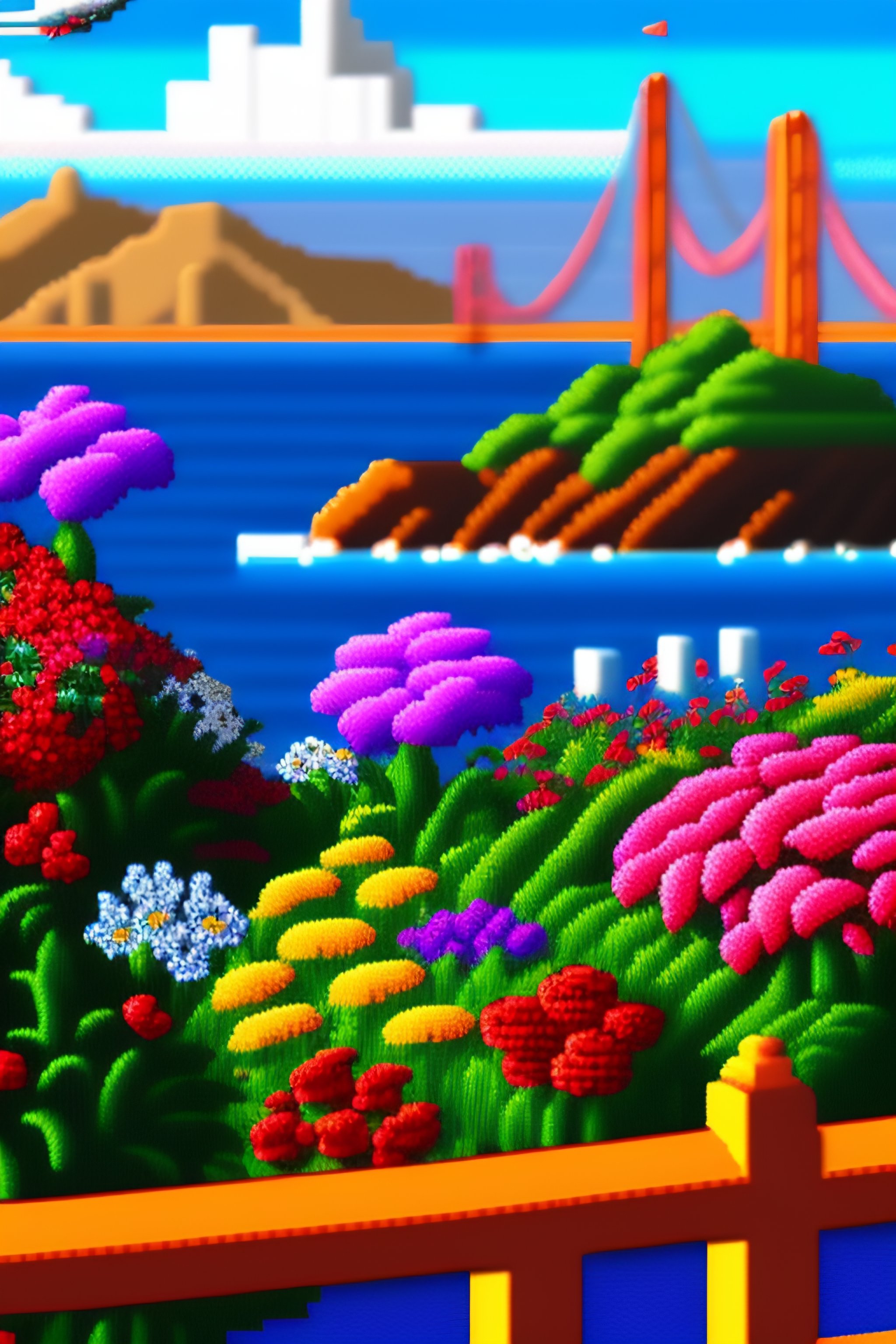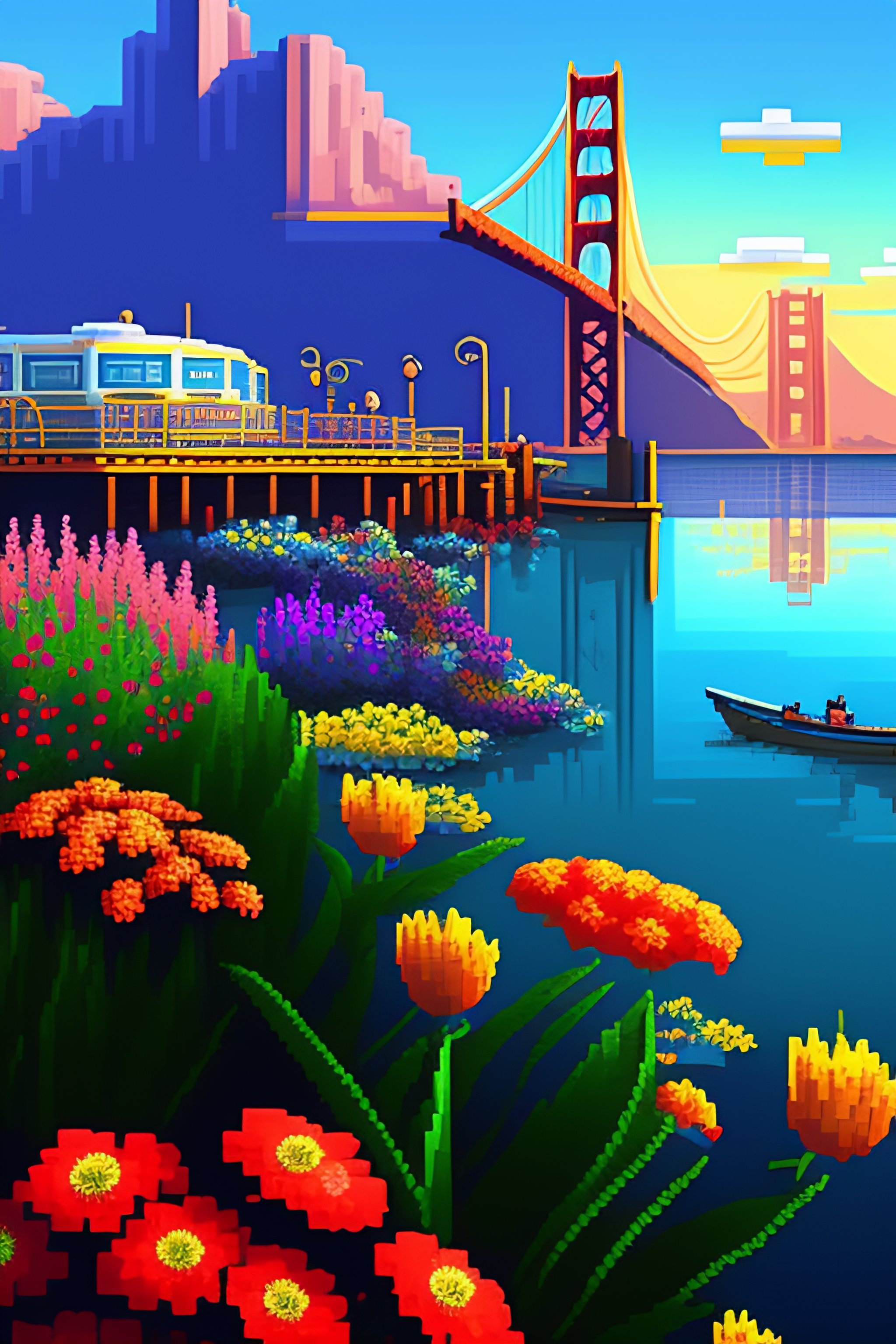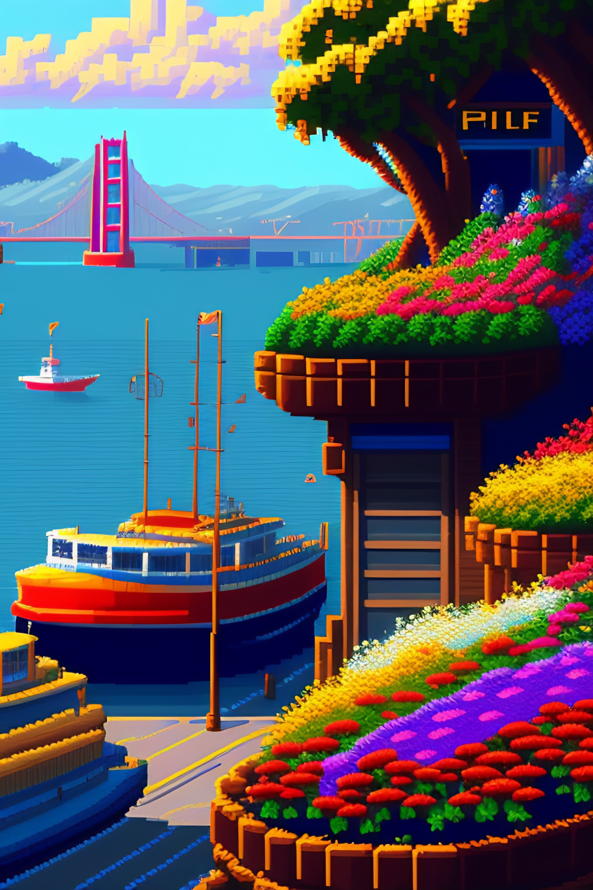 Pixel art san francisco fisherman's wharf, 3d pixel art 4k wallpaper, incredible pixel art details, flowers, pixel art, lots of people in foreground, pixel art by pixel jeff
