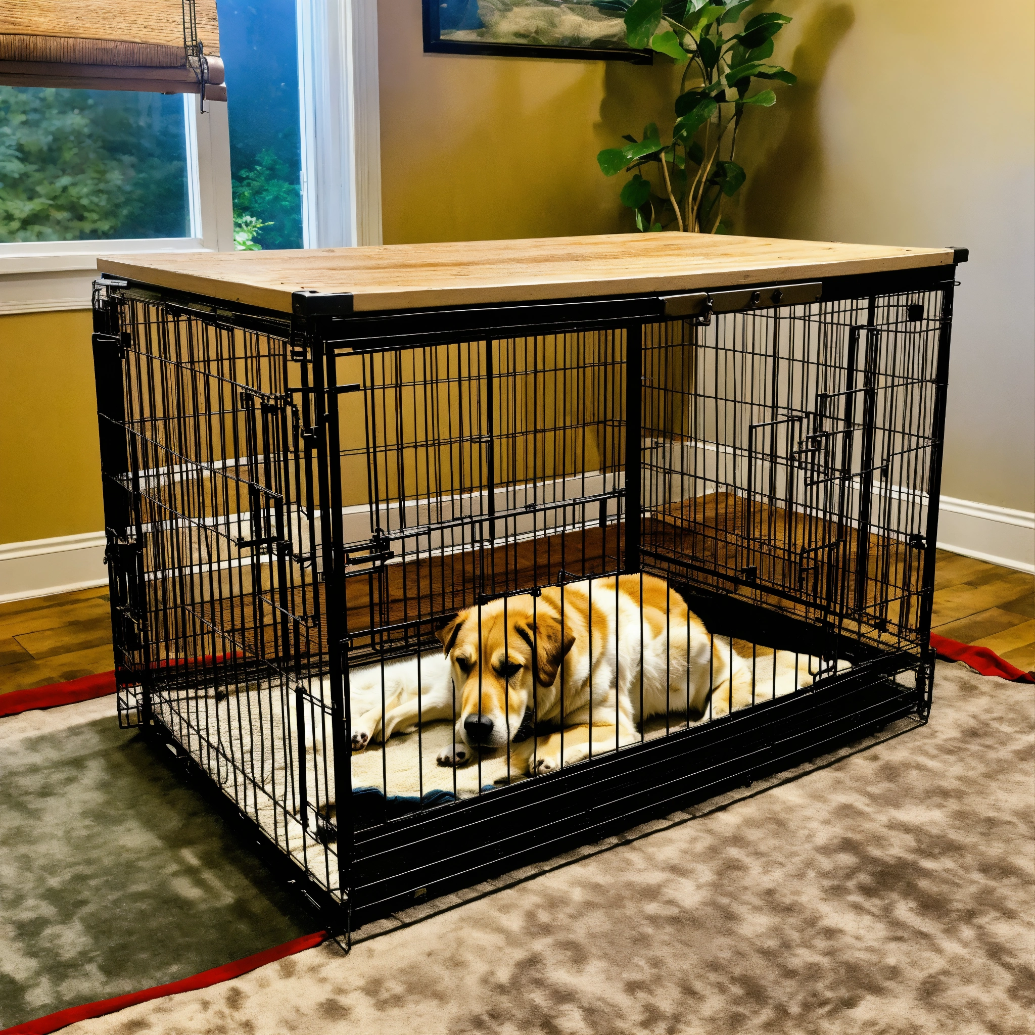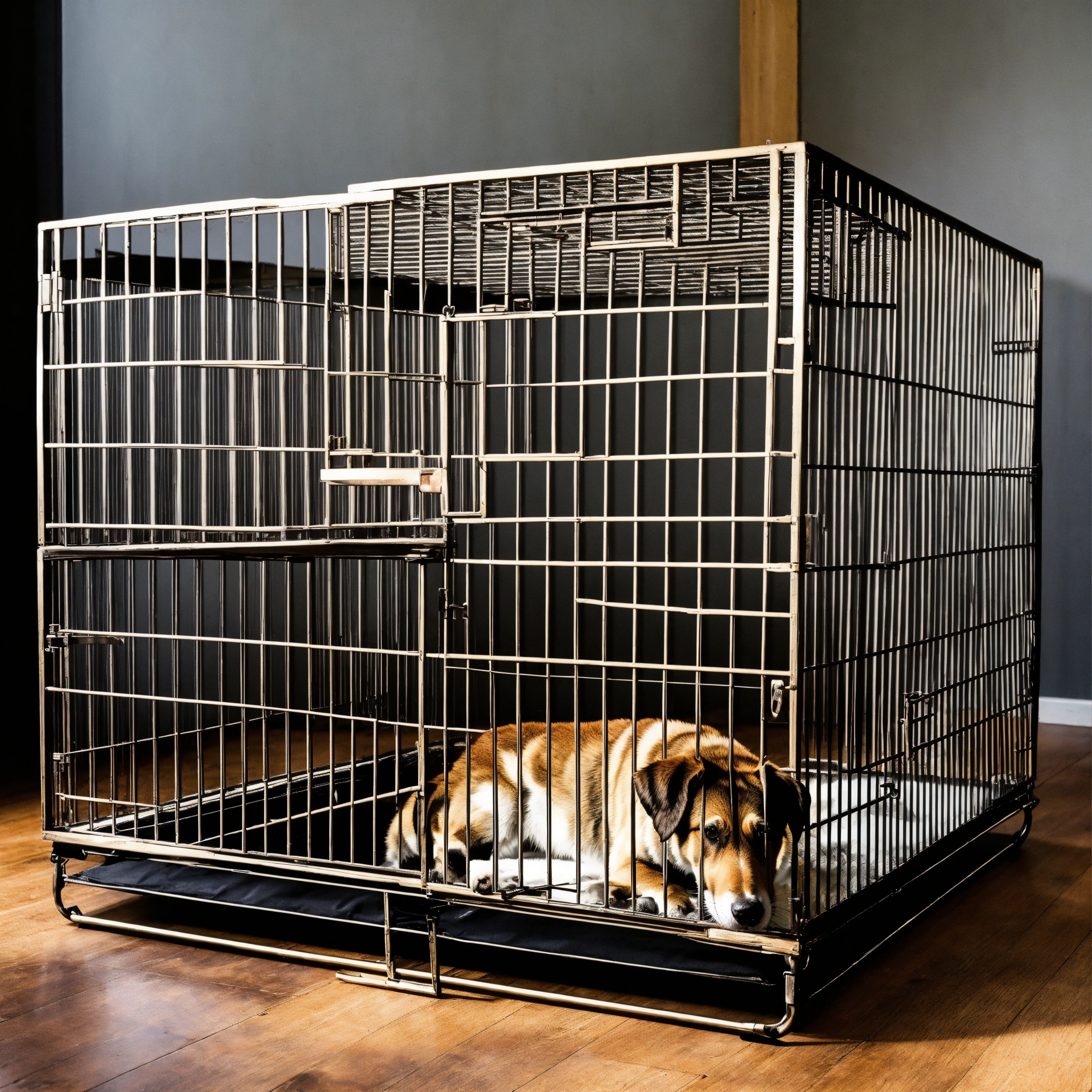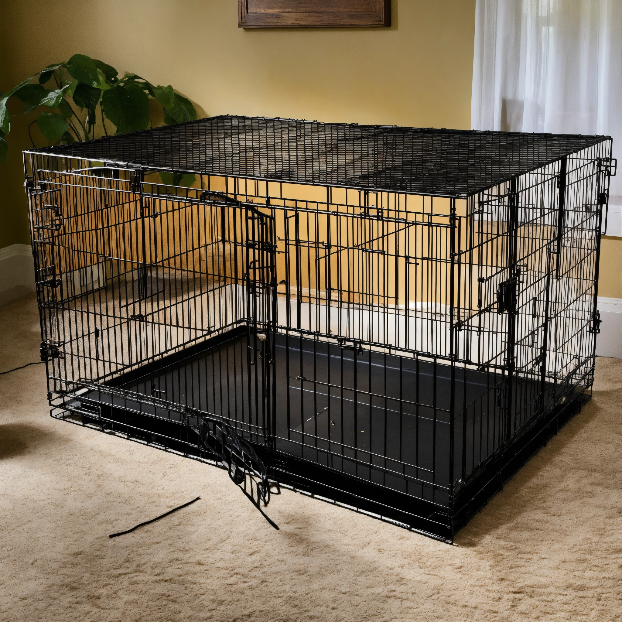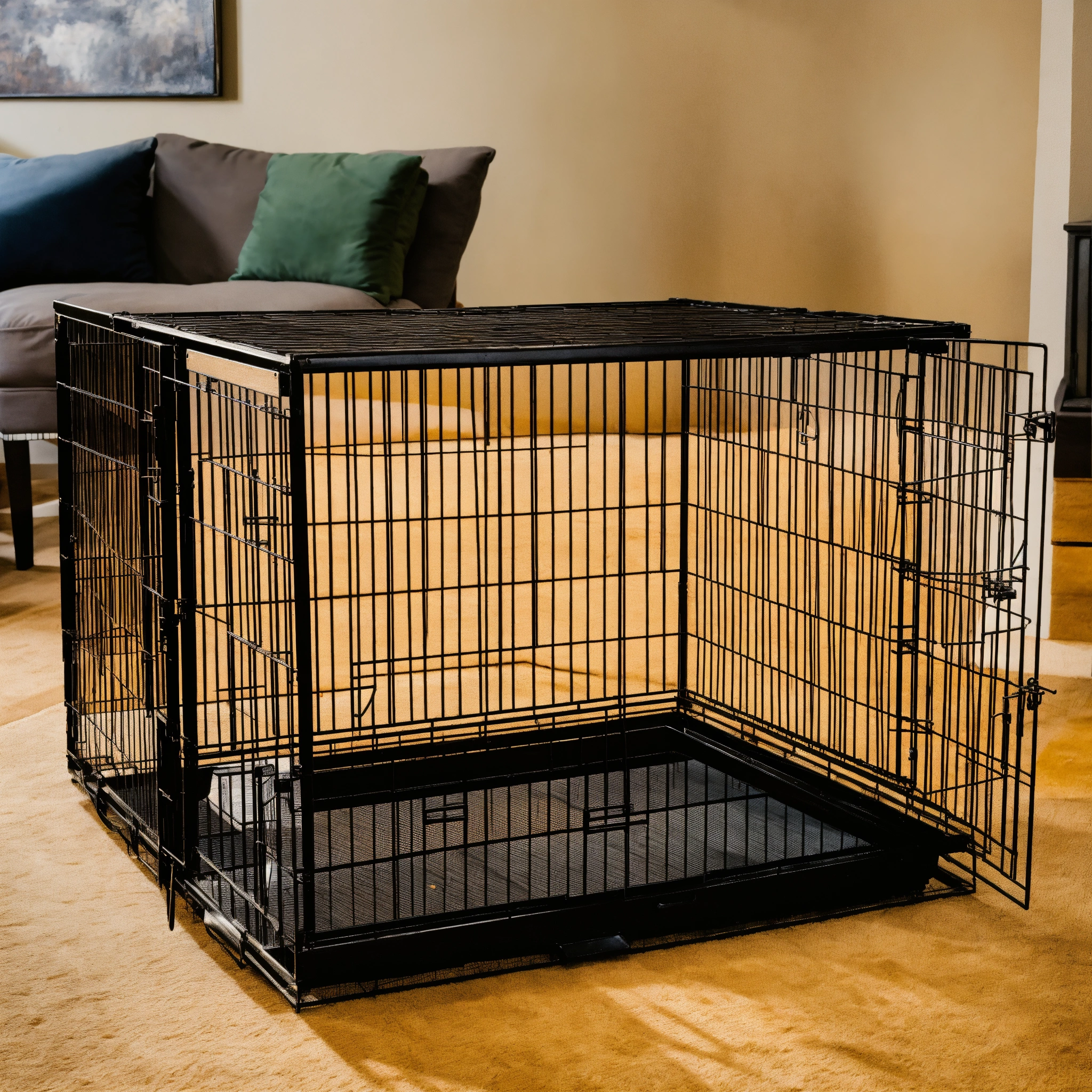 A photo of a large dog crate, the crate is made of metal and has a wire mesh door, the crate is empty