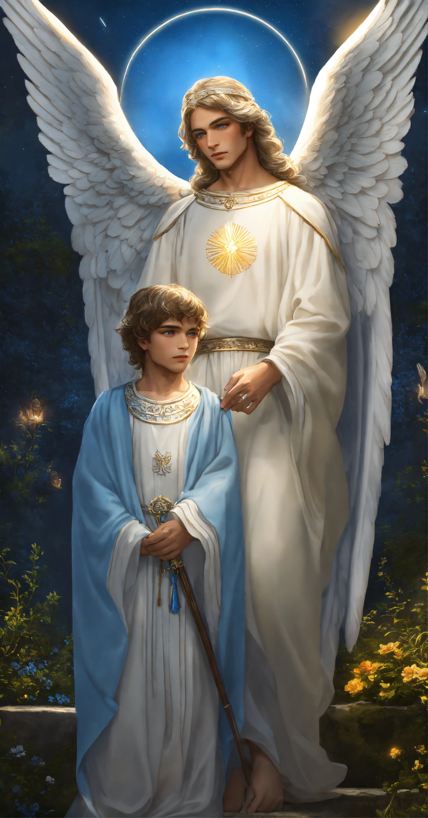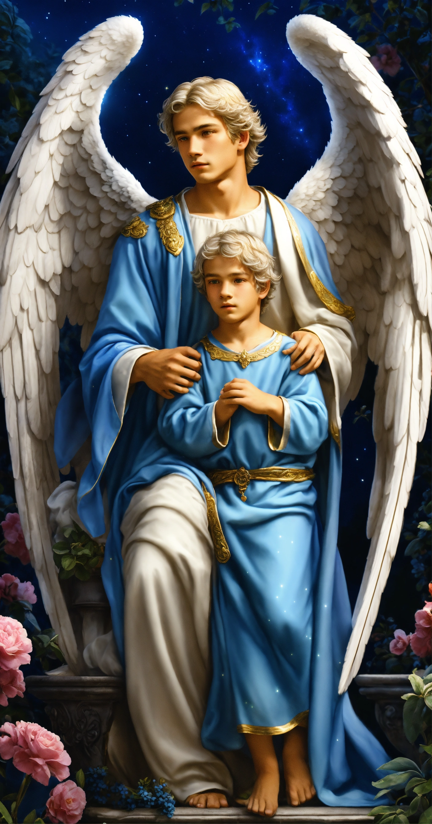 2 male guardian angels with detailed and luminous blue angel wings. 1 30-year-old male angel protecting a 9-year-old male angel child. the 2 male angels have large, uniform luminous blue wings. their faces beautiful and detailed. very clear eyes that open with a deep and penetrating look. detailed and manly short white hair. blue tunic-type dresses with many silver details. they are in a beautiful, detailed garden with a night sky. hyper-detailed, hyper-realistic illustration. realism. masterpiece. digital art, hd, high quality. high definition, high definition. 8k.