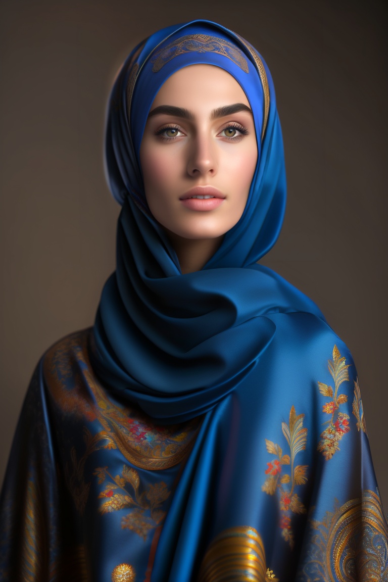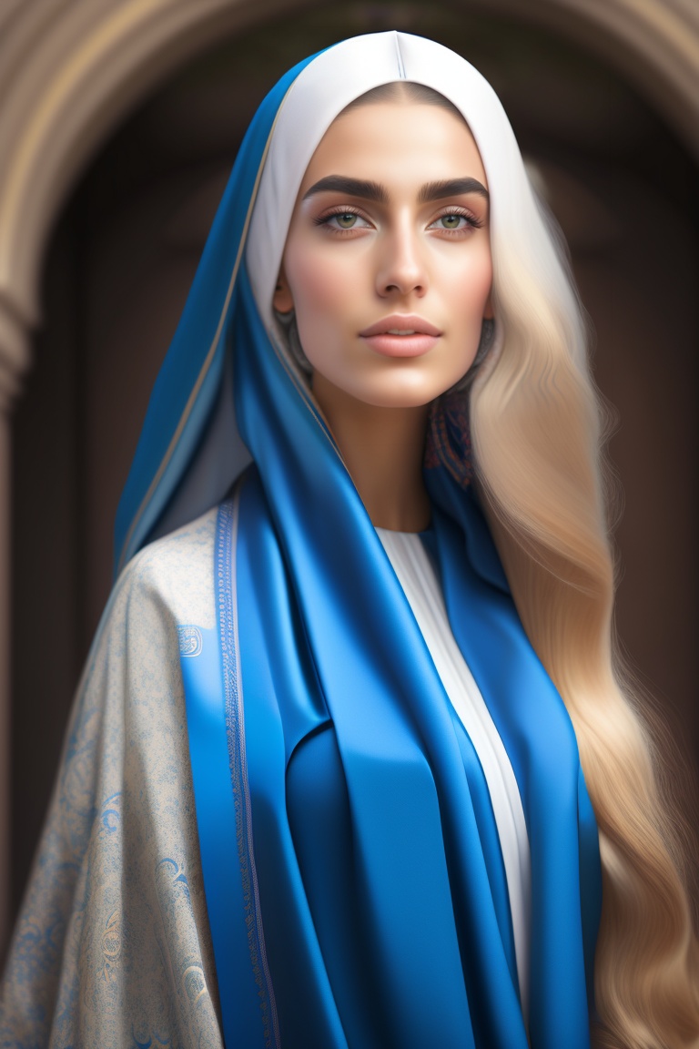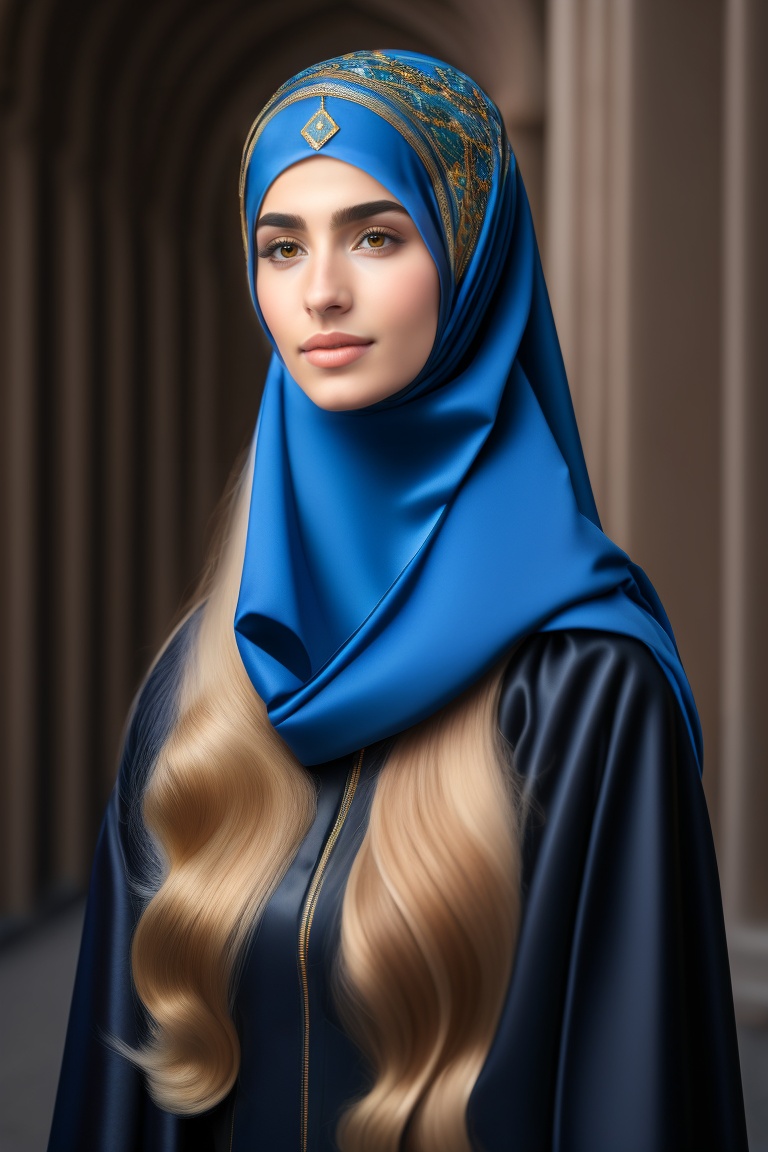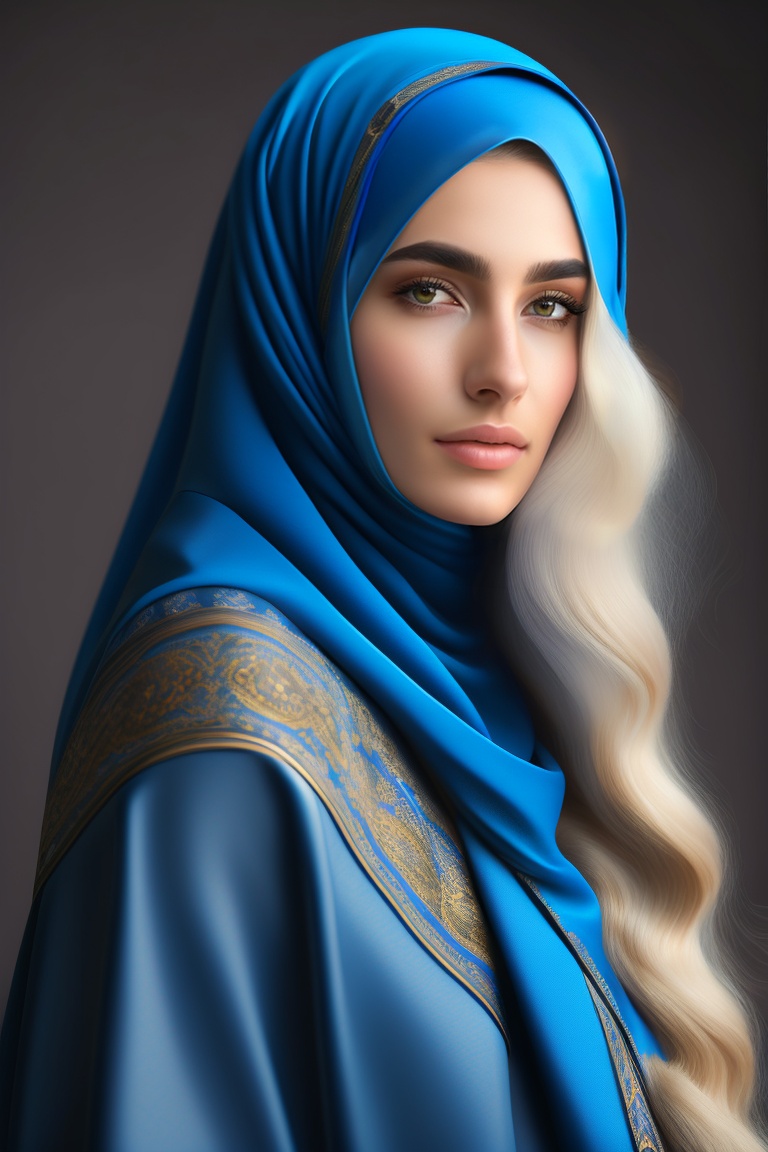 Portrait of a majestic iranian young woman wearing a blue hijab with long blonde hair, photorealist, 4k, dslr photograph full body