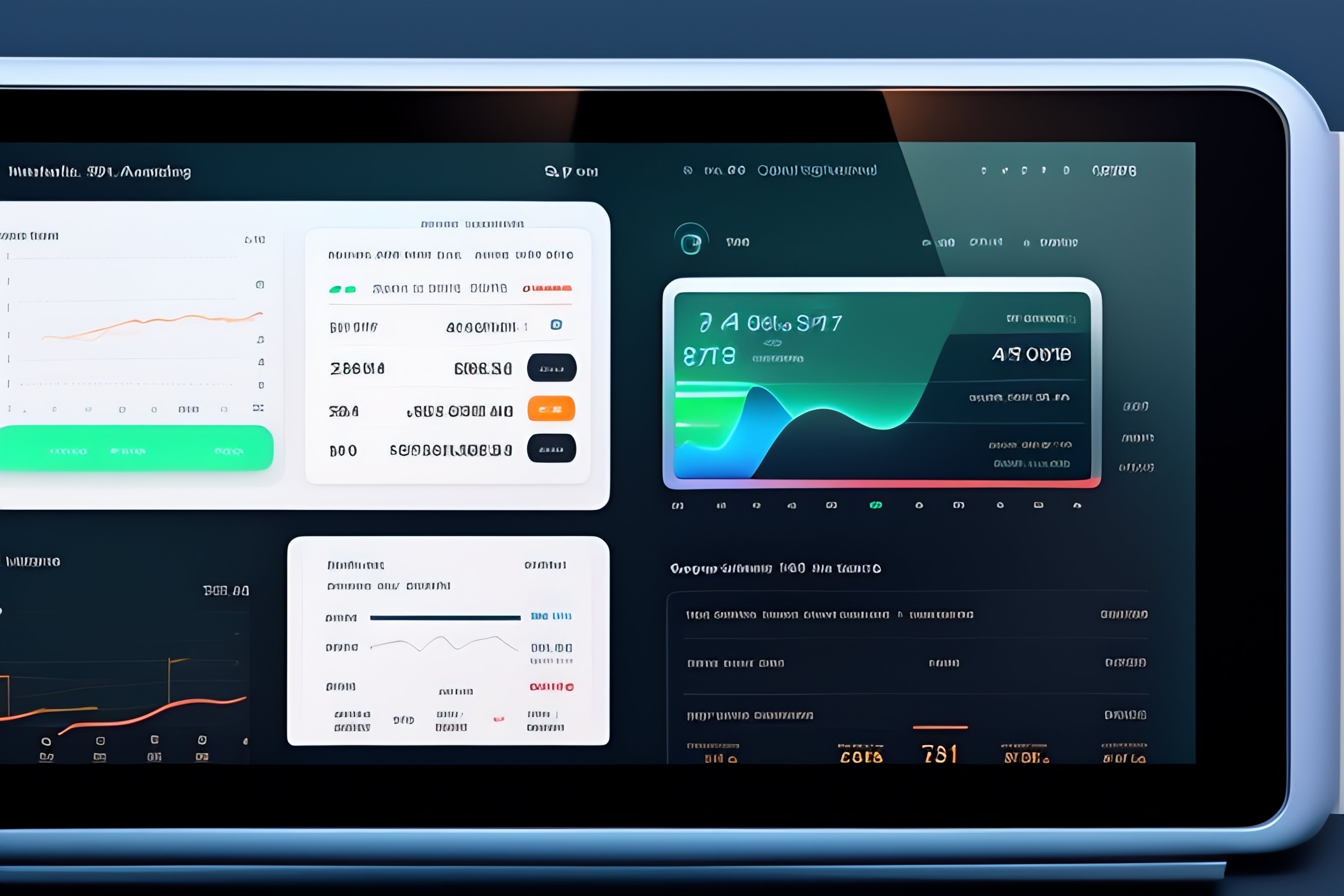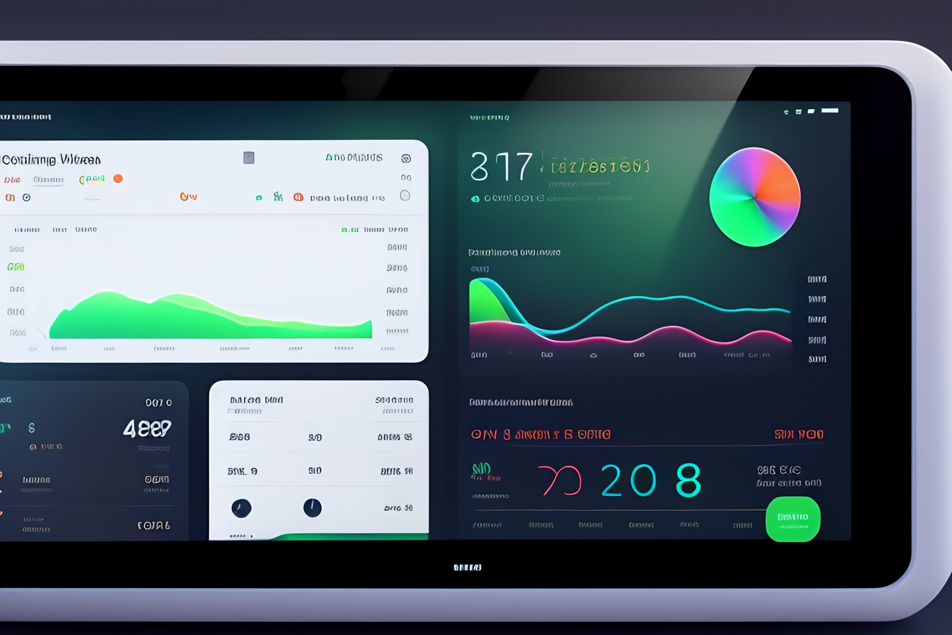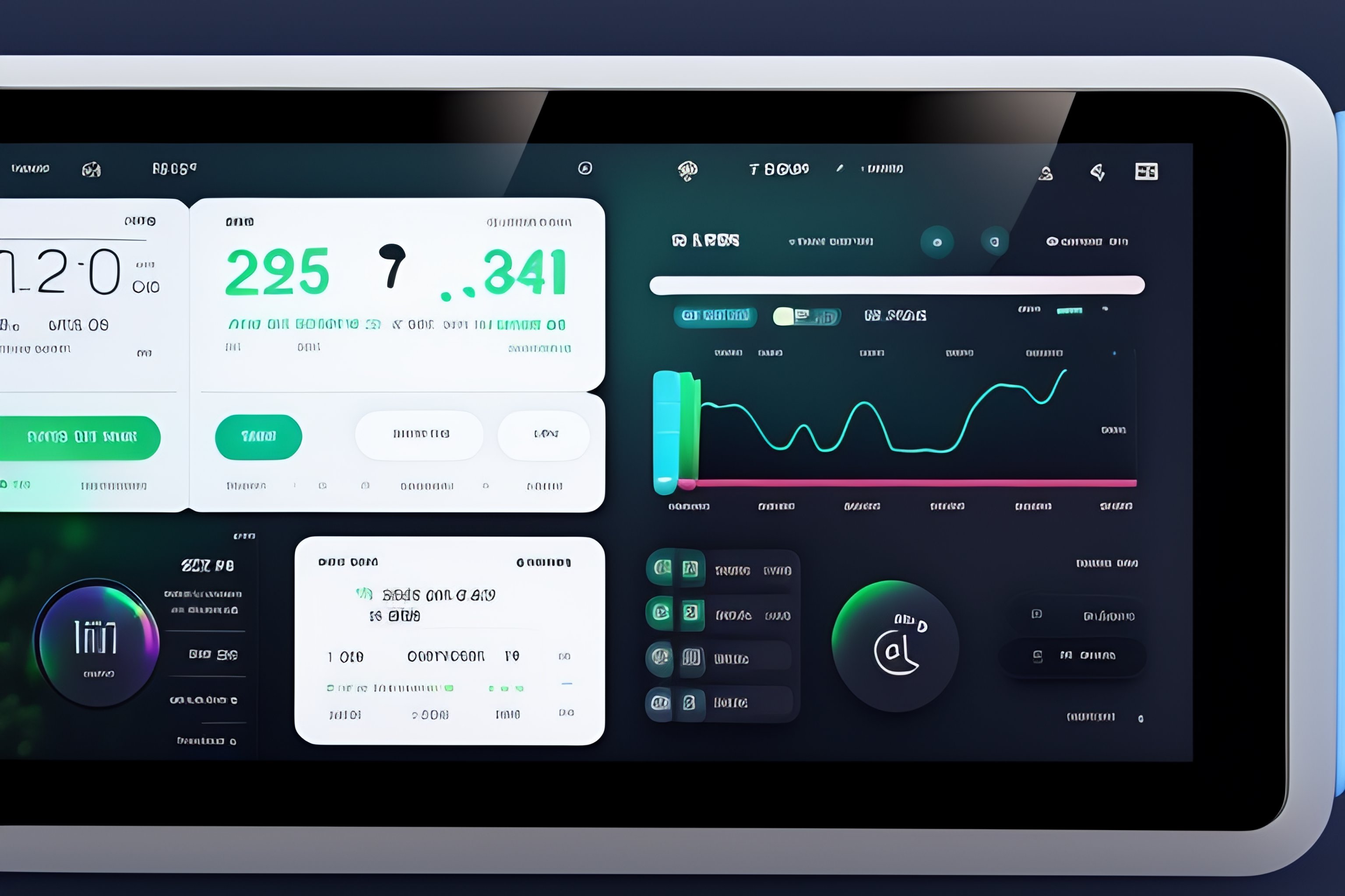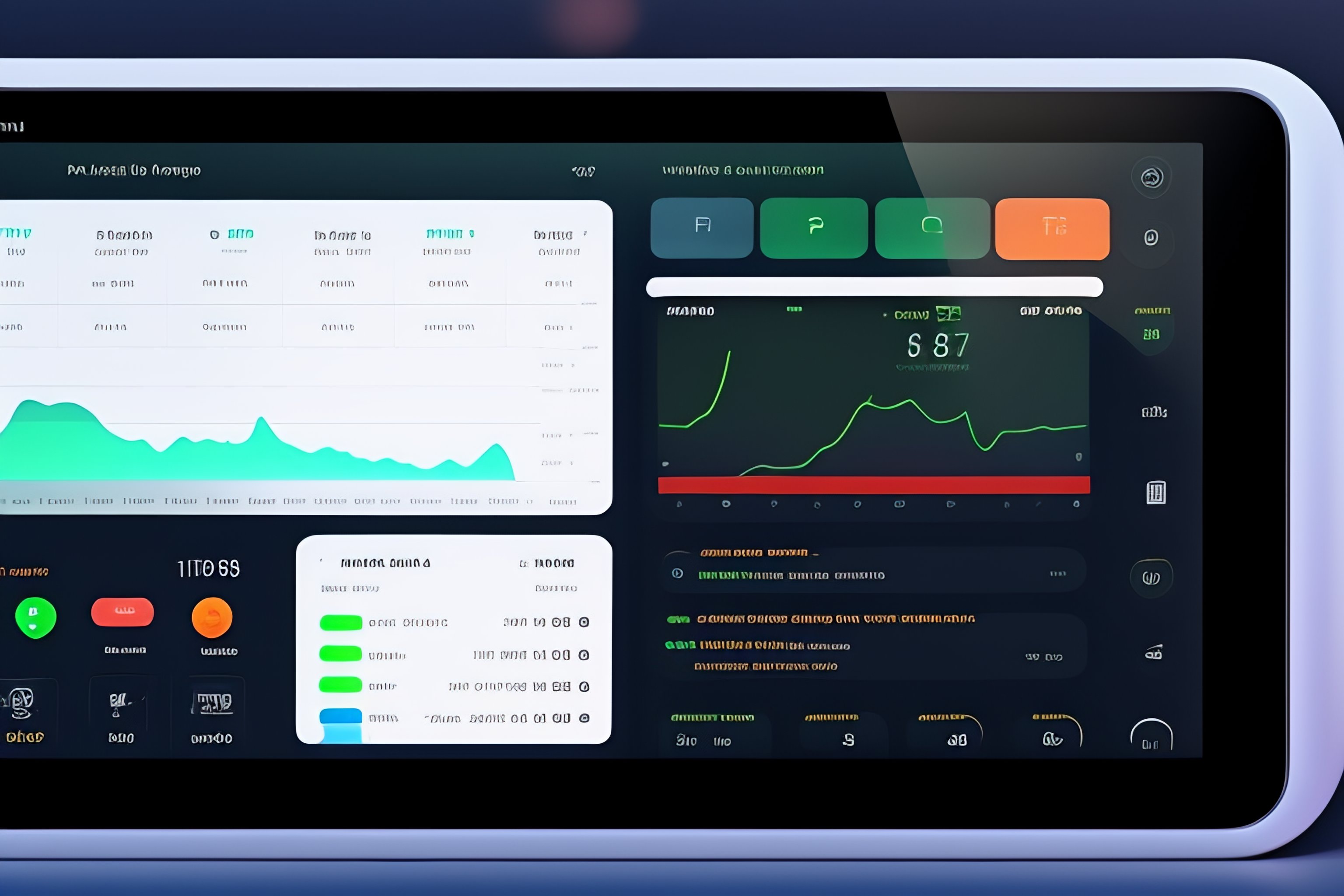 Ui interface for smart home tablet with side column left and right panel with different widgets for media, lights, doorlock, and some stats with graphs