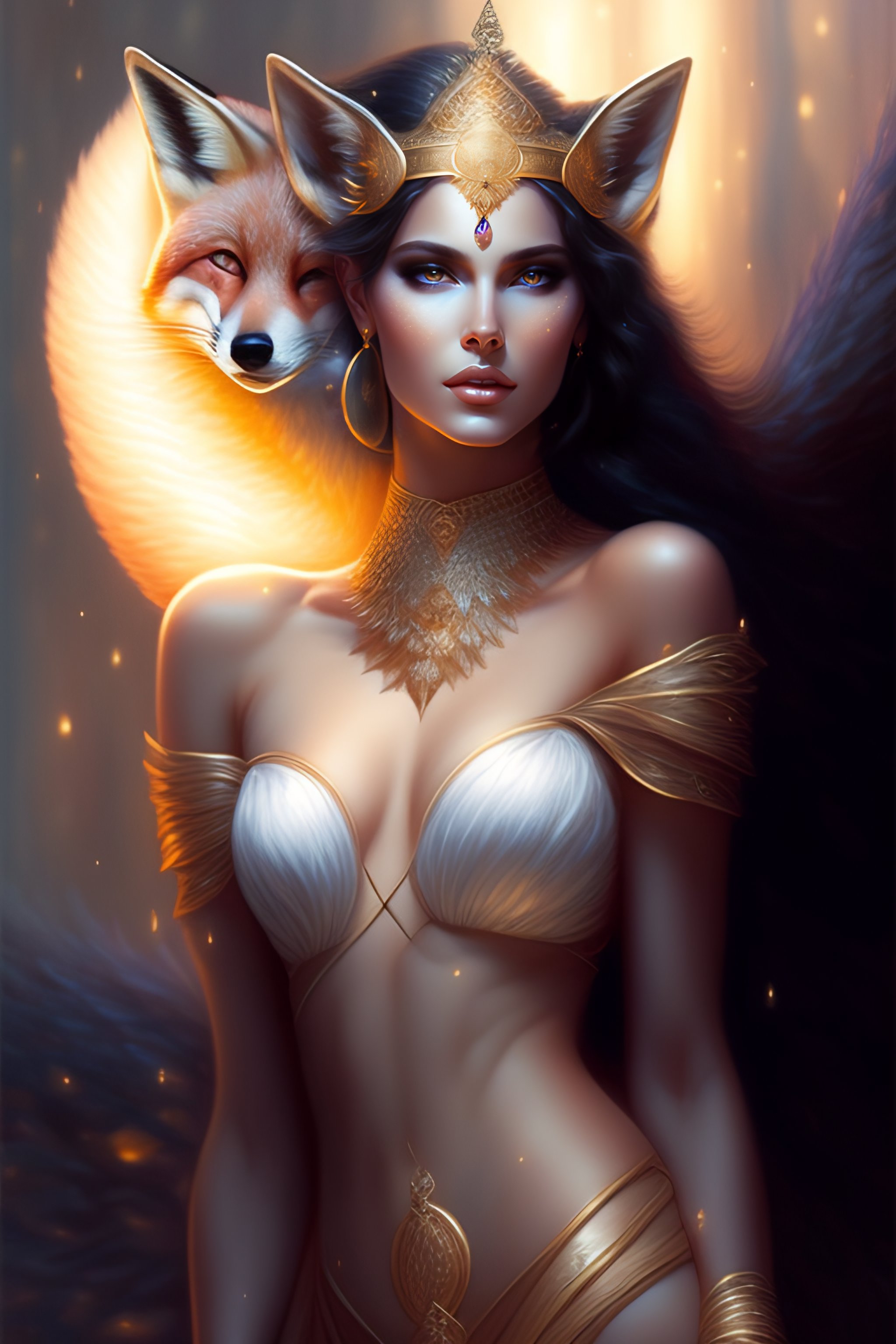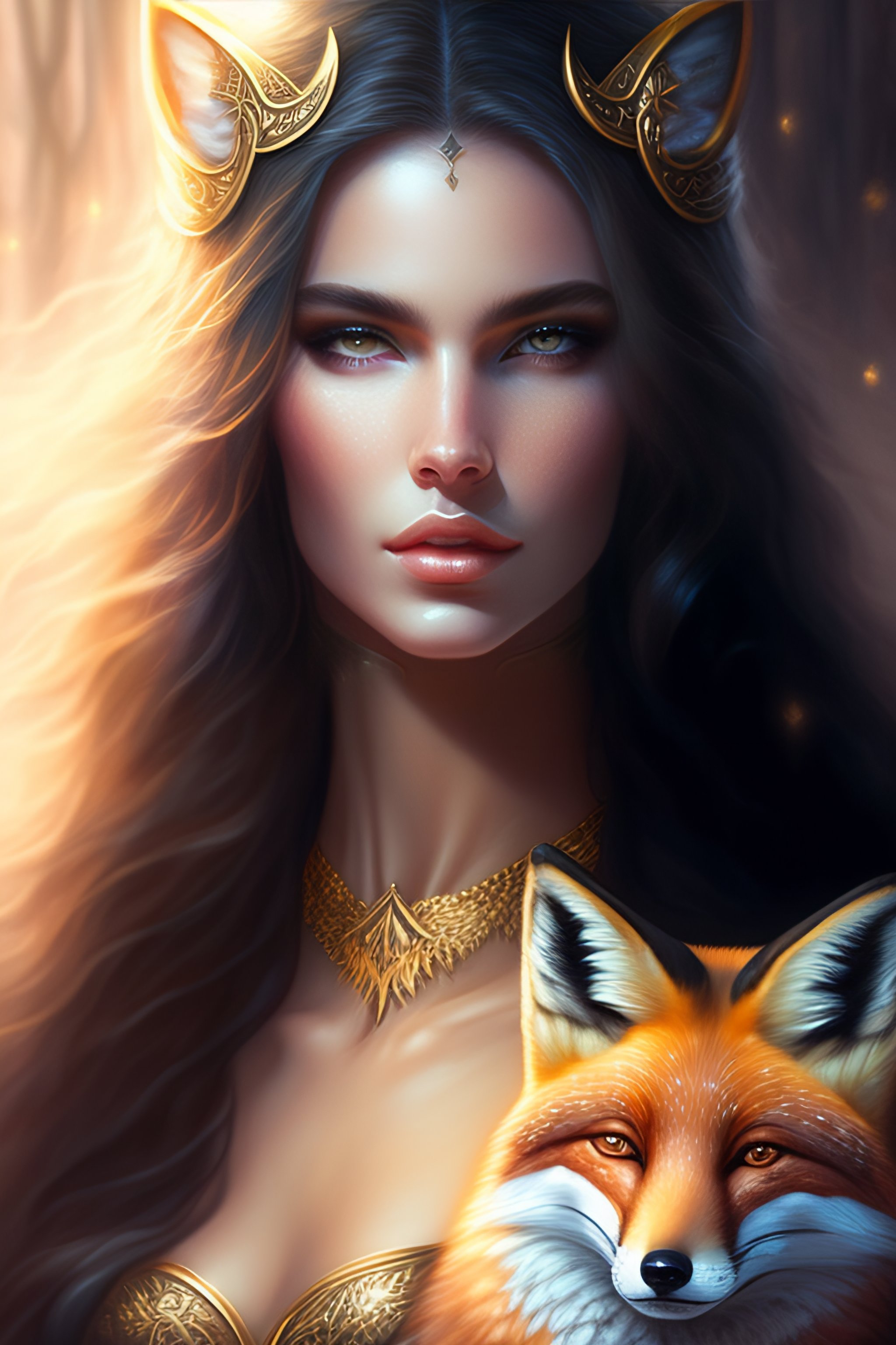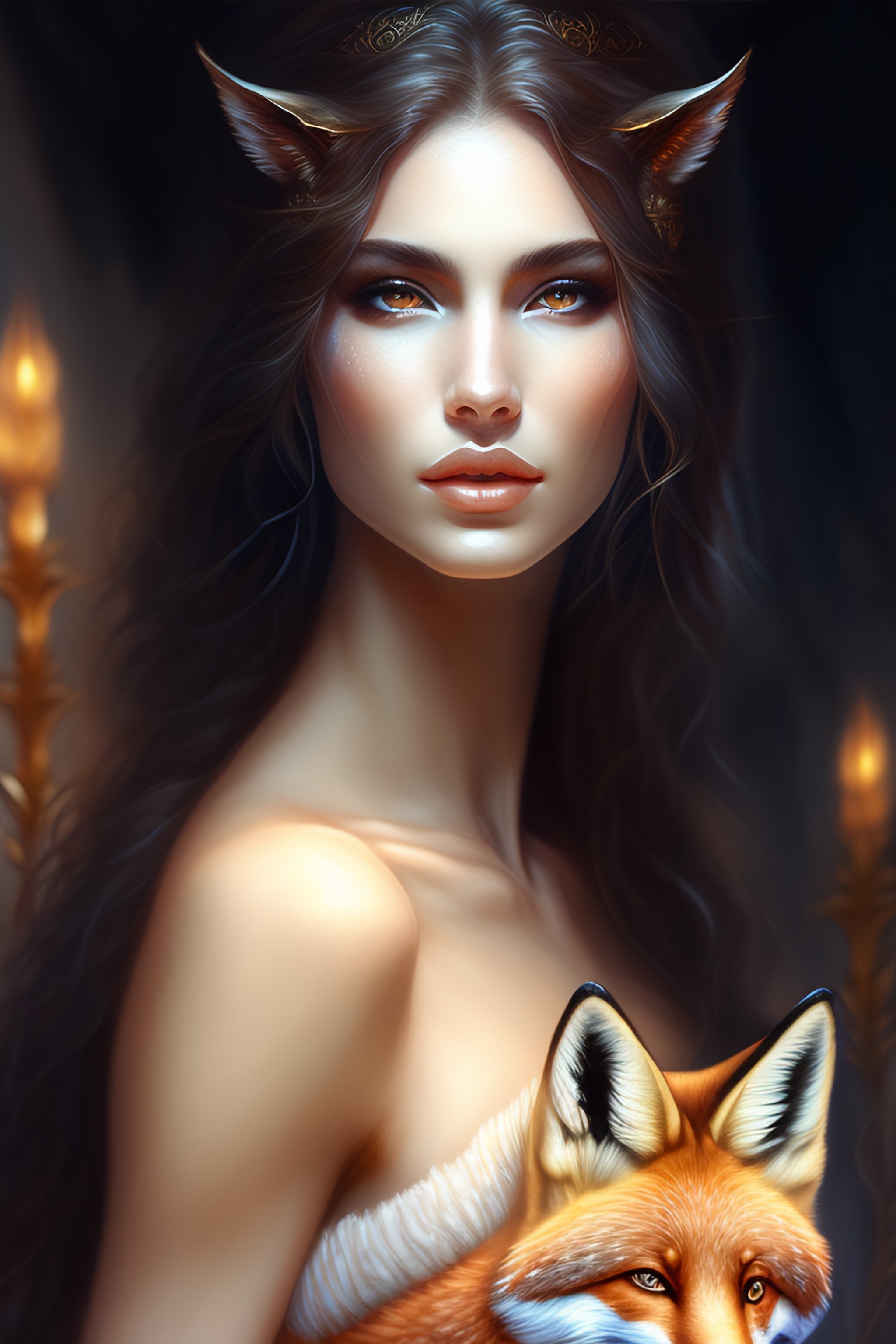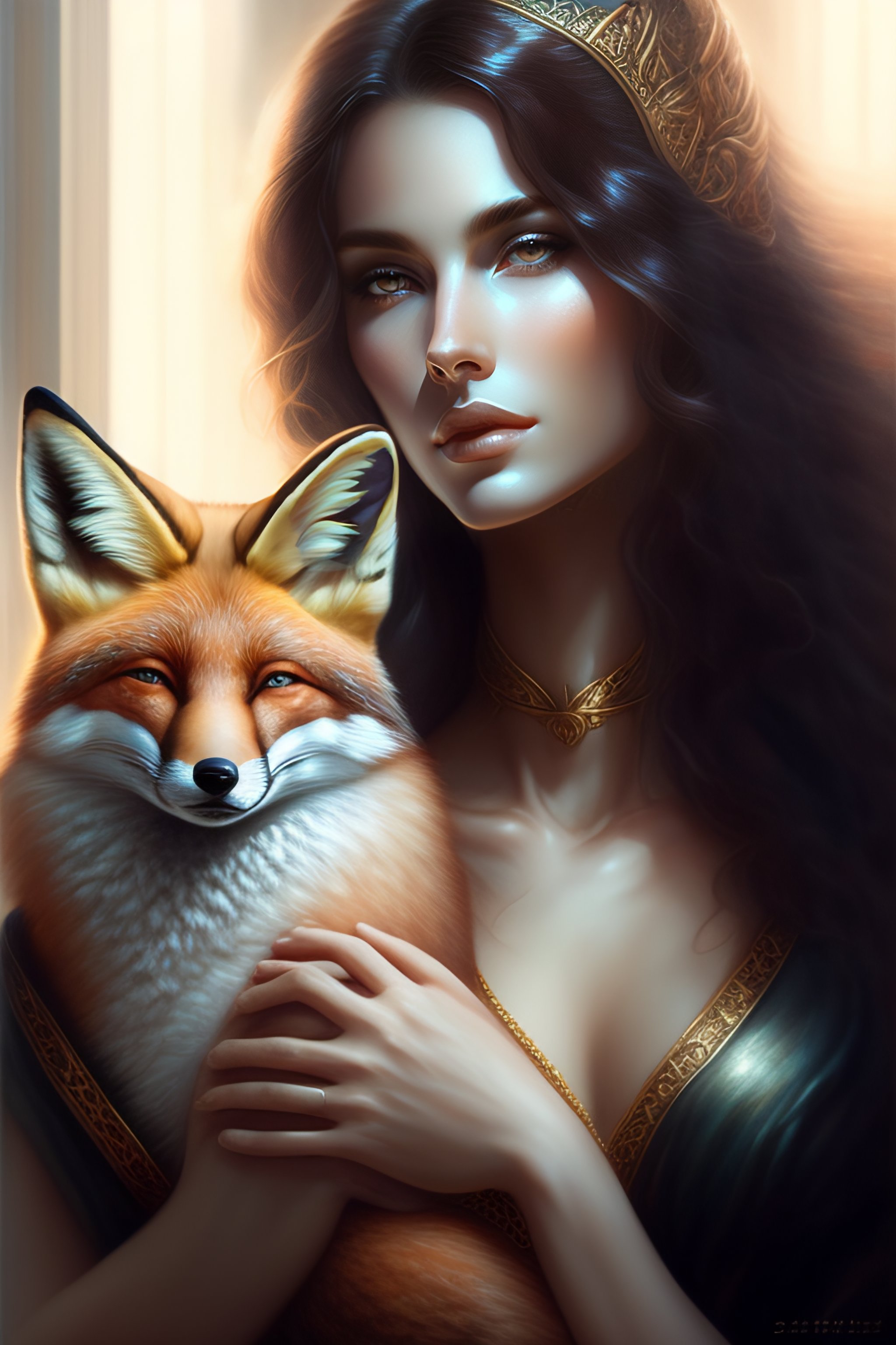 Goddess, holding fox in the hands, pale skin, fantasy, sharp focus, intricate, elegant, illustration, ambient lighting, art by stefanie law, qistina khalidah, tranding on artstation, art by luis royo higly detailed studio lighting