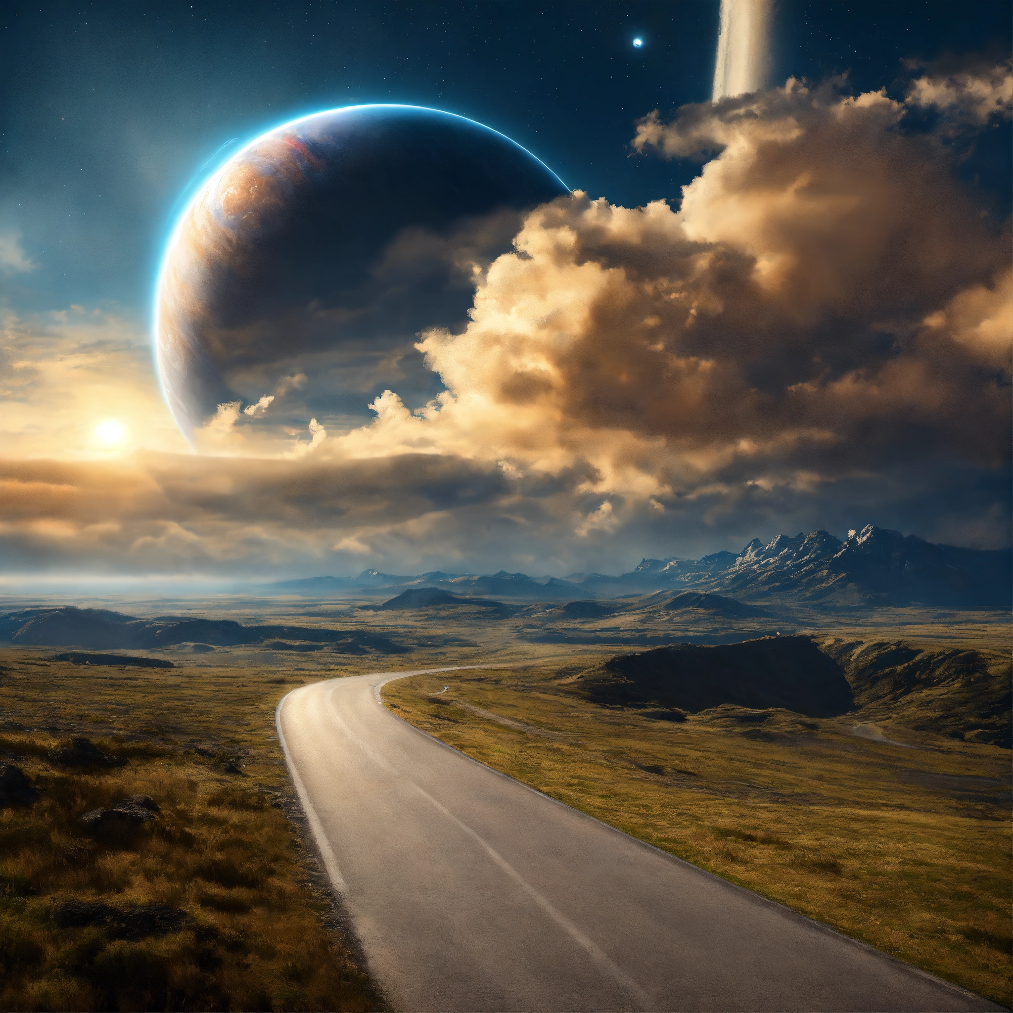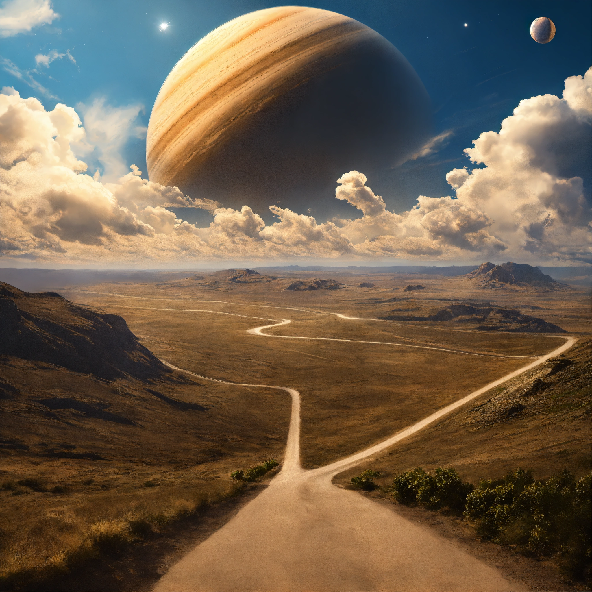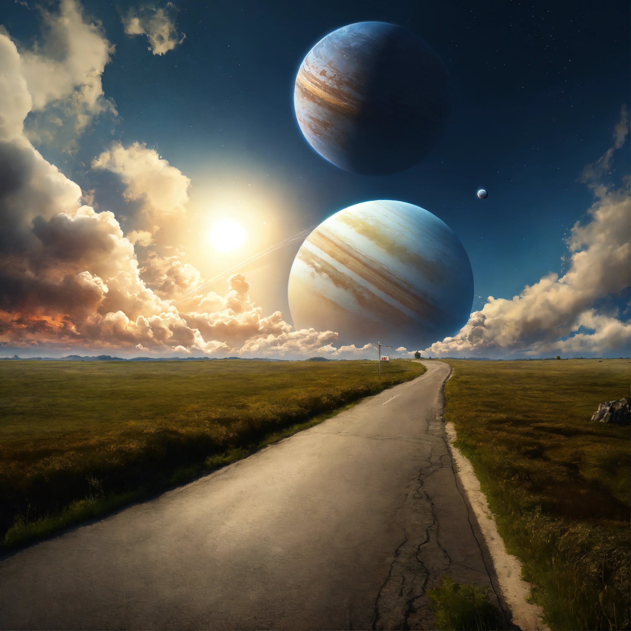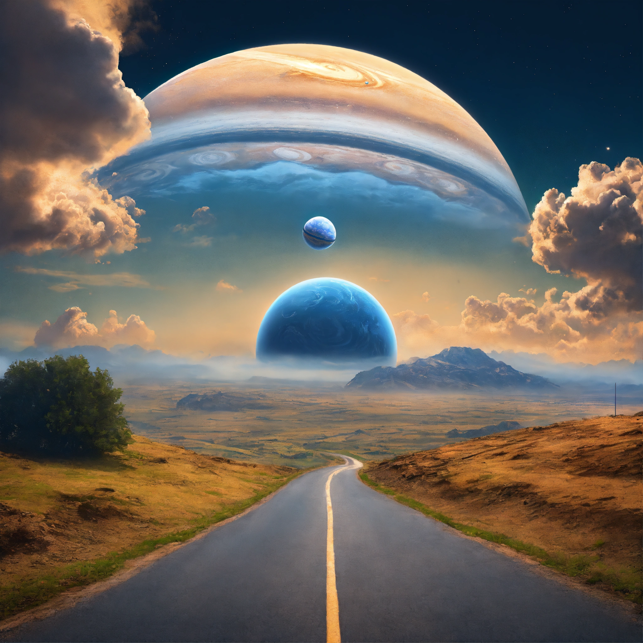 Generates a landscape full of clouds, blue sky and a small planet saturn in a corner with a road next to it