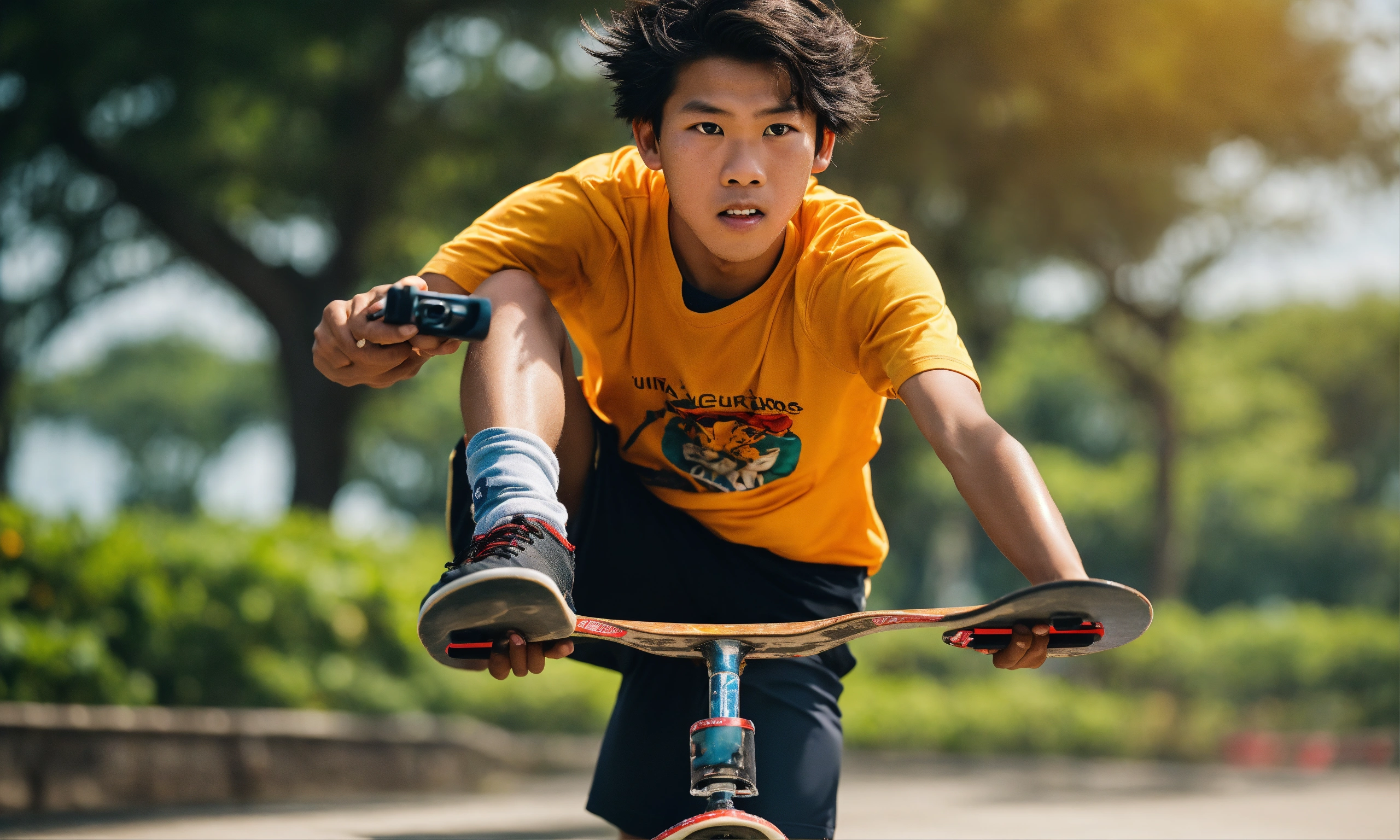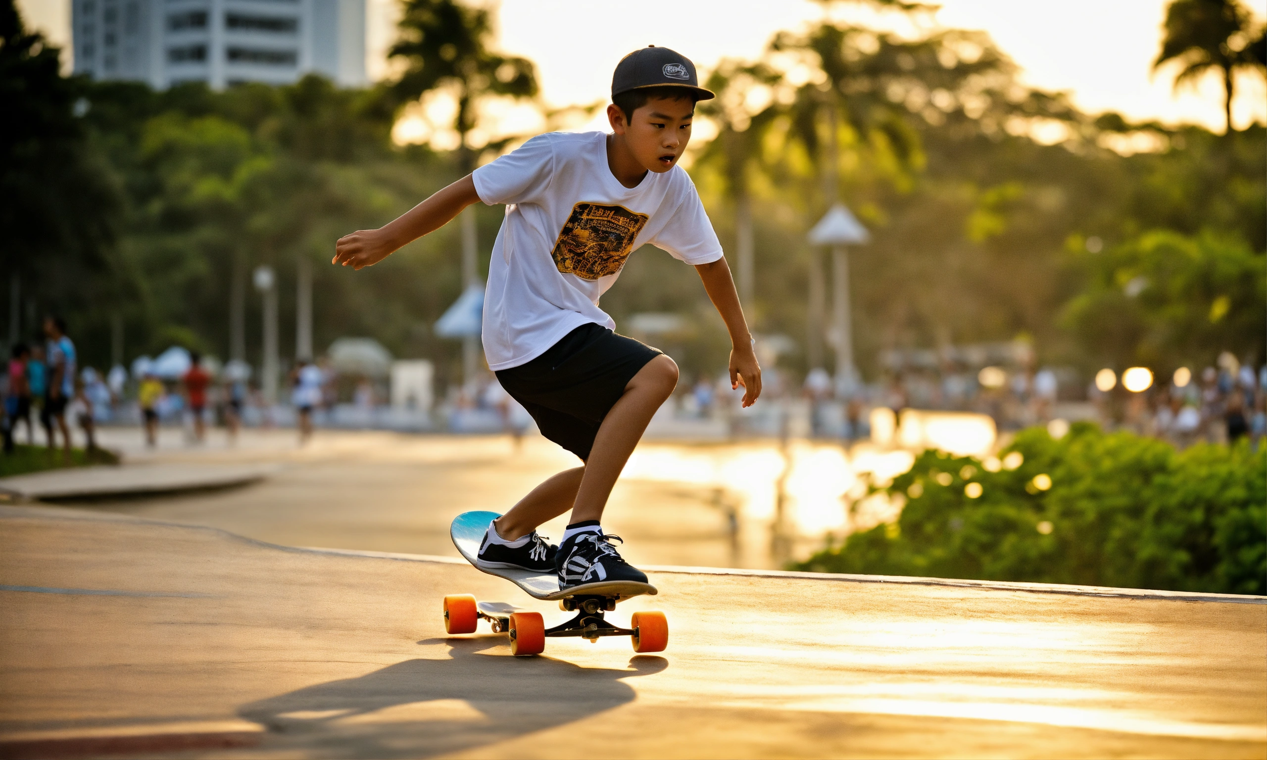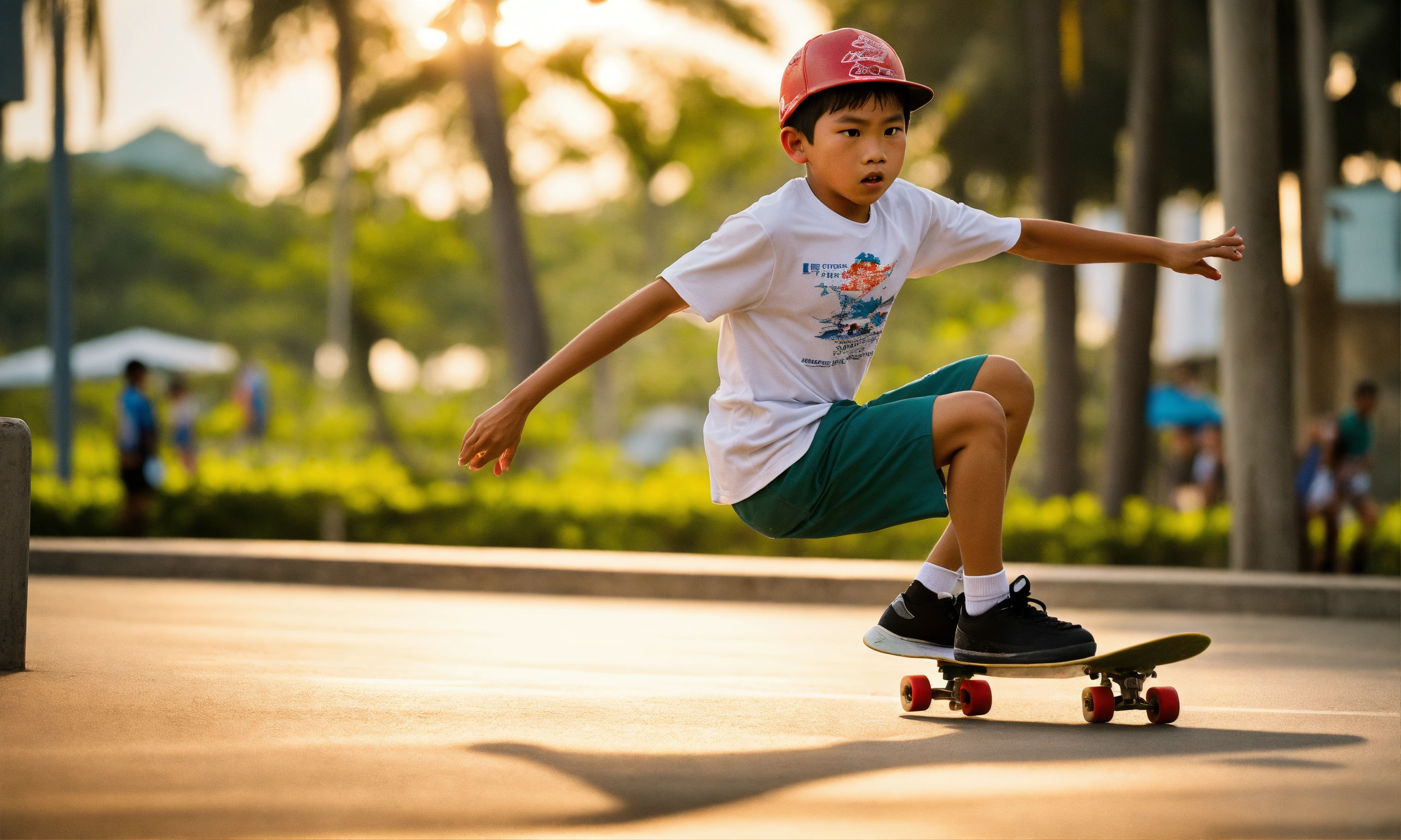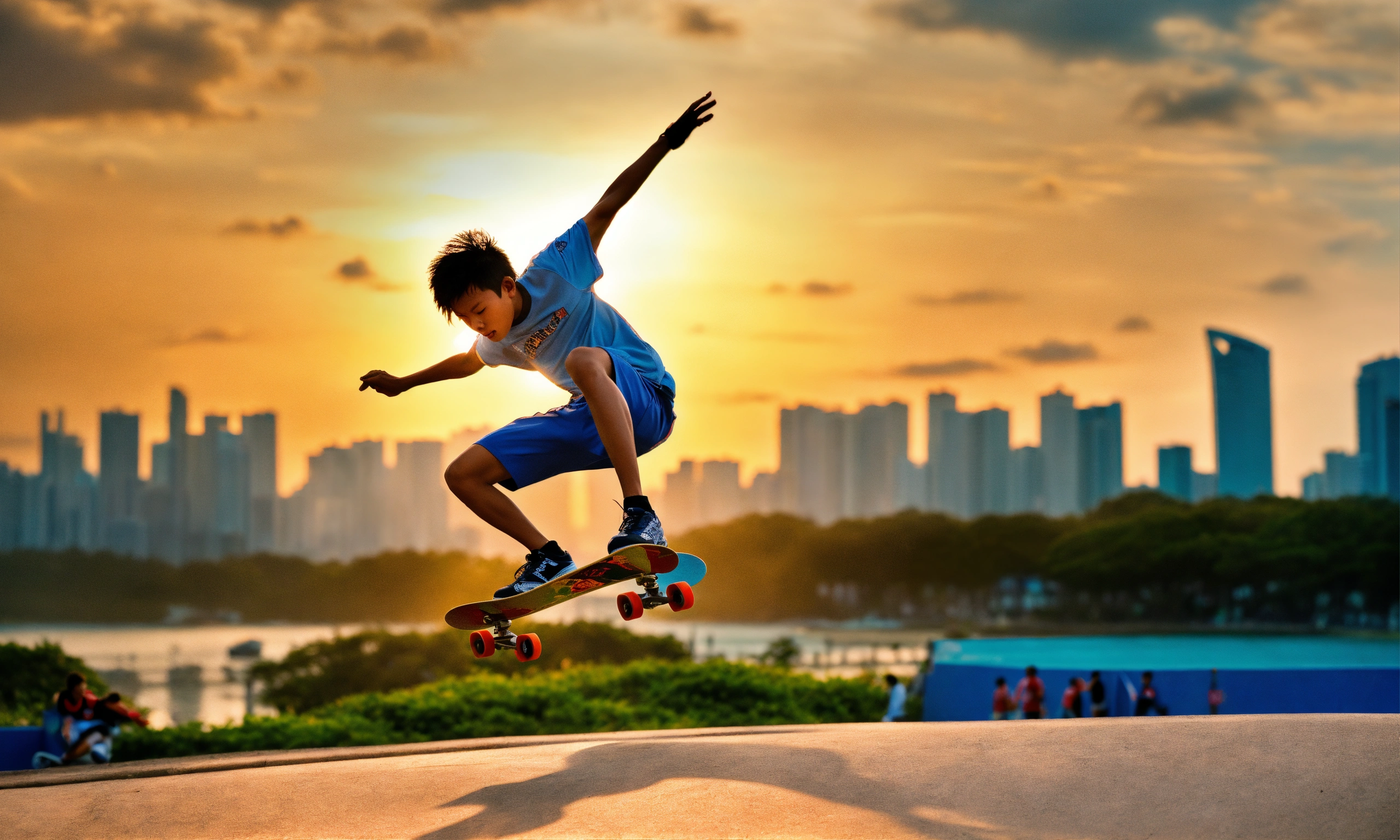 Afternoon sun, ultra-realistic photo, cinematic quality, close-up action shot at singapore's east coast park, singapore, the backdrop showcases the iconic scenery of the park. main focus a 9-year-old malay skateboarder in mid-air executing a challenging trick, his body contorted in concentration. intense focus radiates from his eyes, sweat glistening on his brow, exuding raw passion and unyielding perseverance; clothing contemporary skateboarding attire including protective gear, a t-shirt, shorts, and sneakers. expression grit and determination, a testament to his dedication to the sport. themes modern nostalgia, overcoming adversity, dynamic lighting emphasizes the contours of his face and body against the backdrop of east coast park, 50mm camera lens producing sharpness with a blurred background, portra 400 film, subtle film grain adding depth and emphasizing the raw energy of the moment.