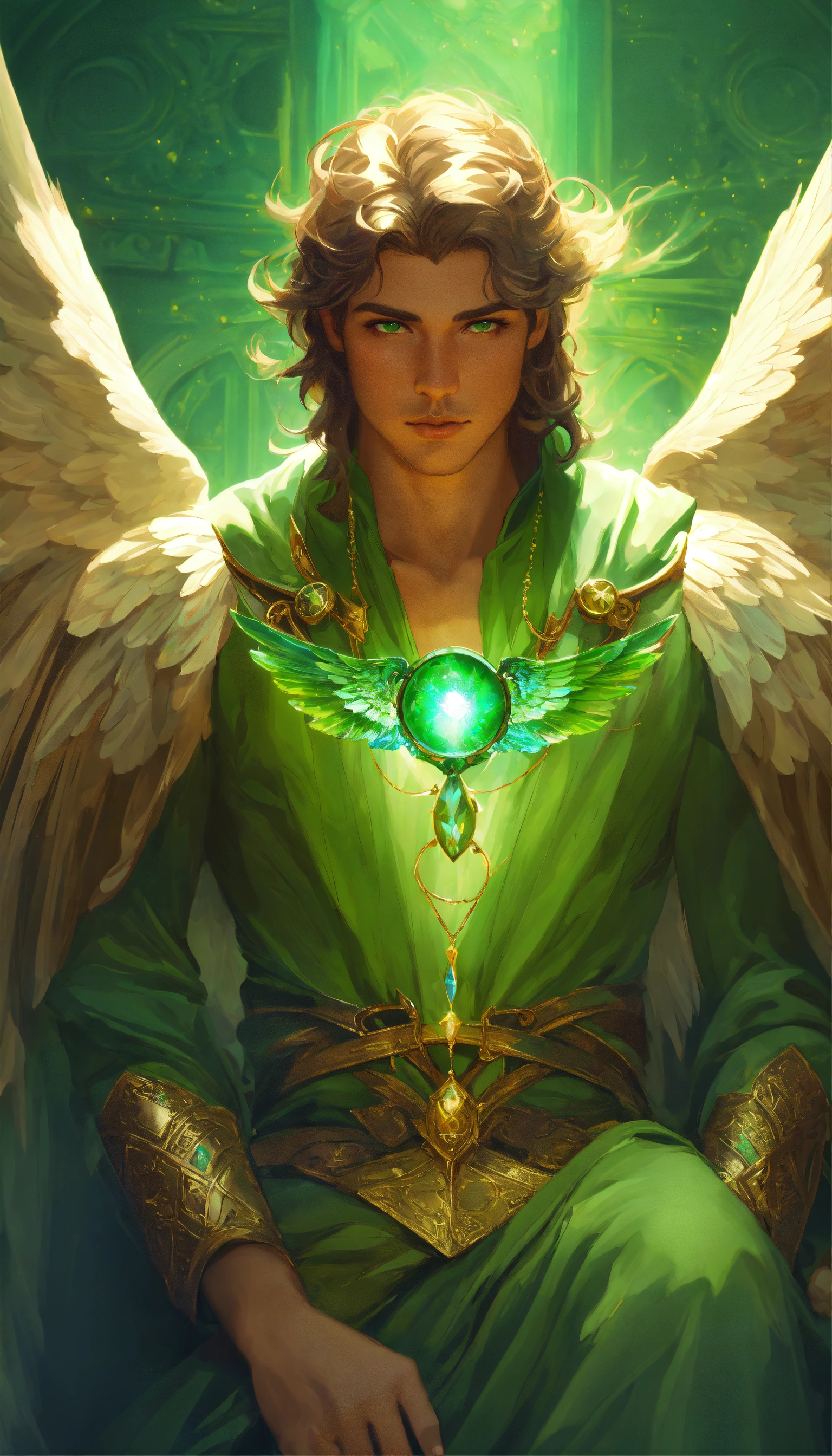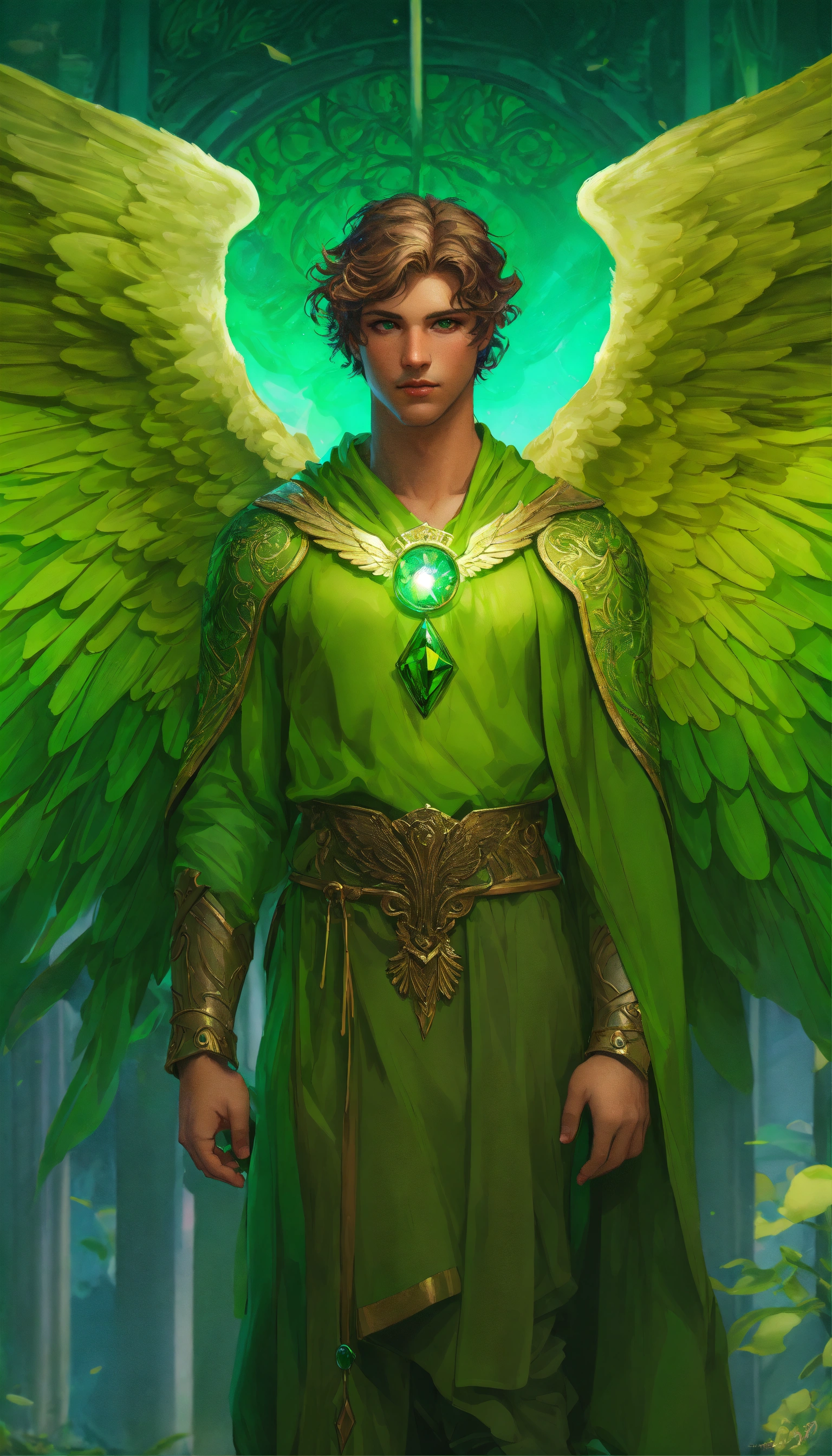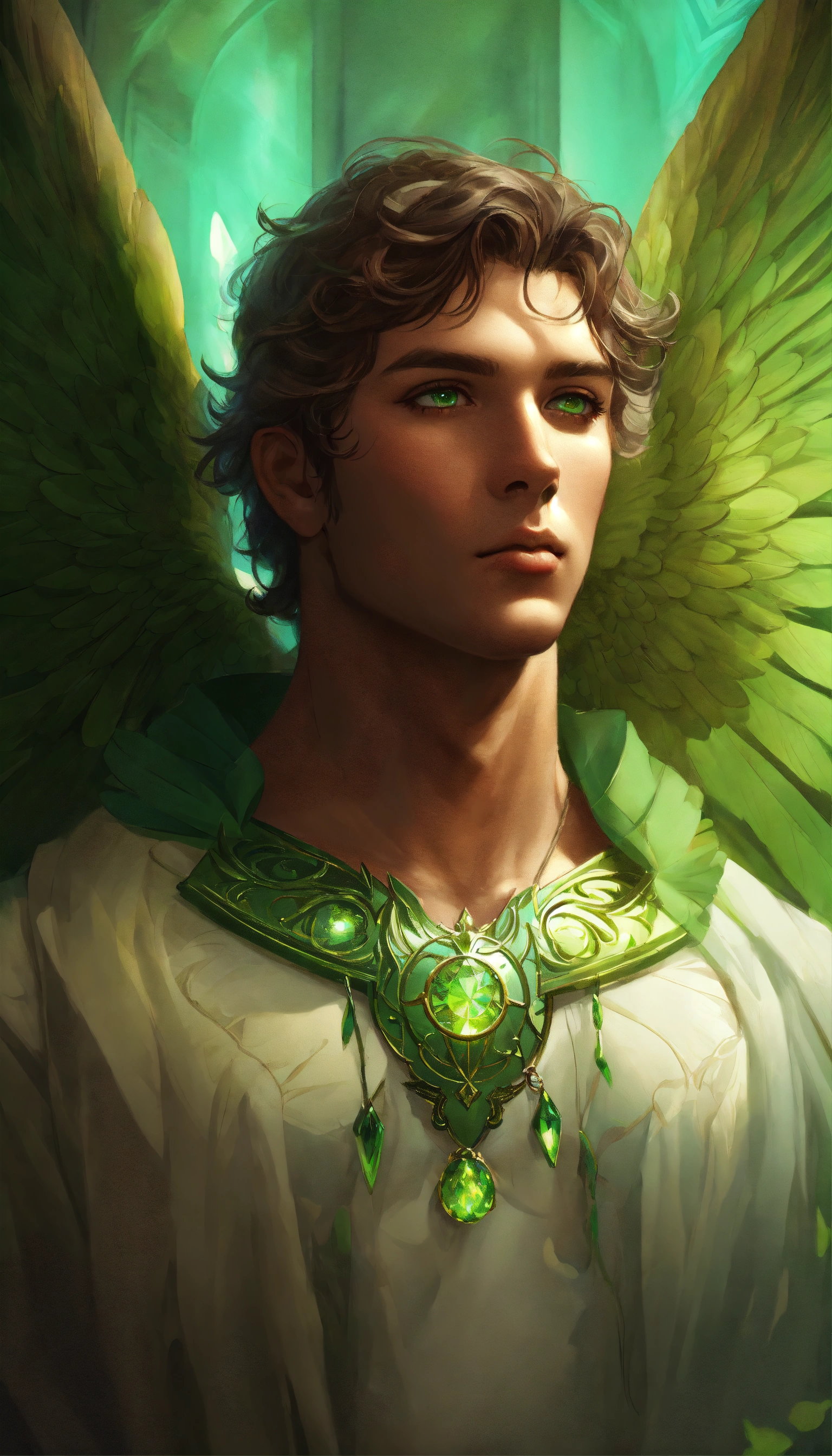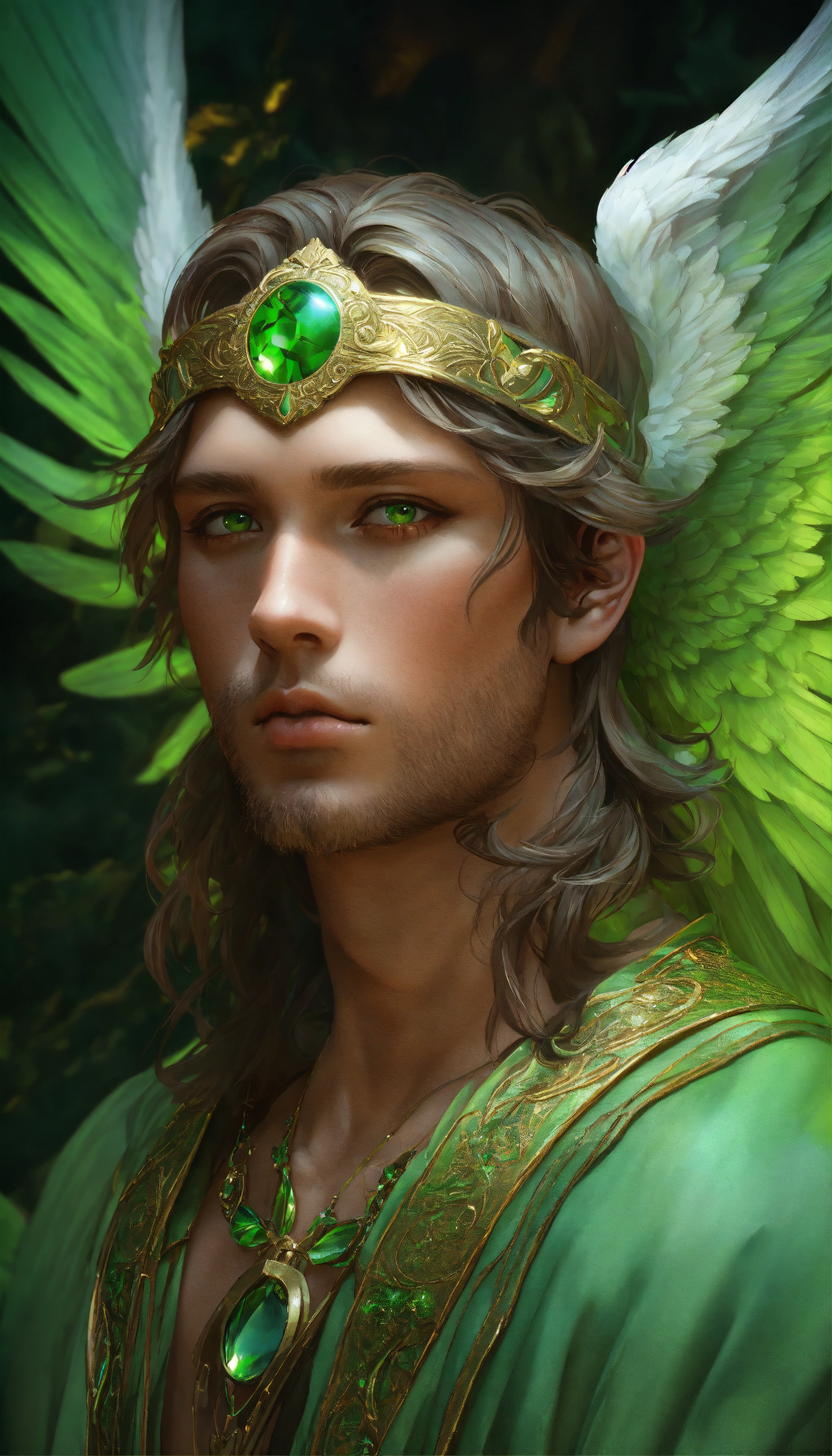 Male angel, wings, surreal, headshot, digital painting, art station, real, 3d, large detailed green wings, green eyes and deep gaze, jewel in the third eye, green tunic, mystical, sharp focus, cinematic lighting, 8k, illustration, art by artgerm and greg rutkowski, alphonse mucha, cgsociety