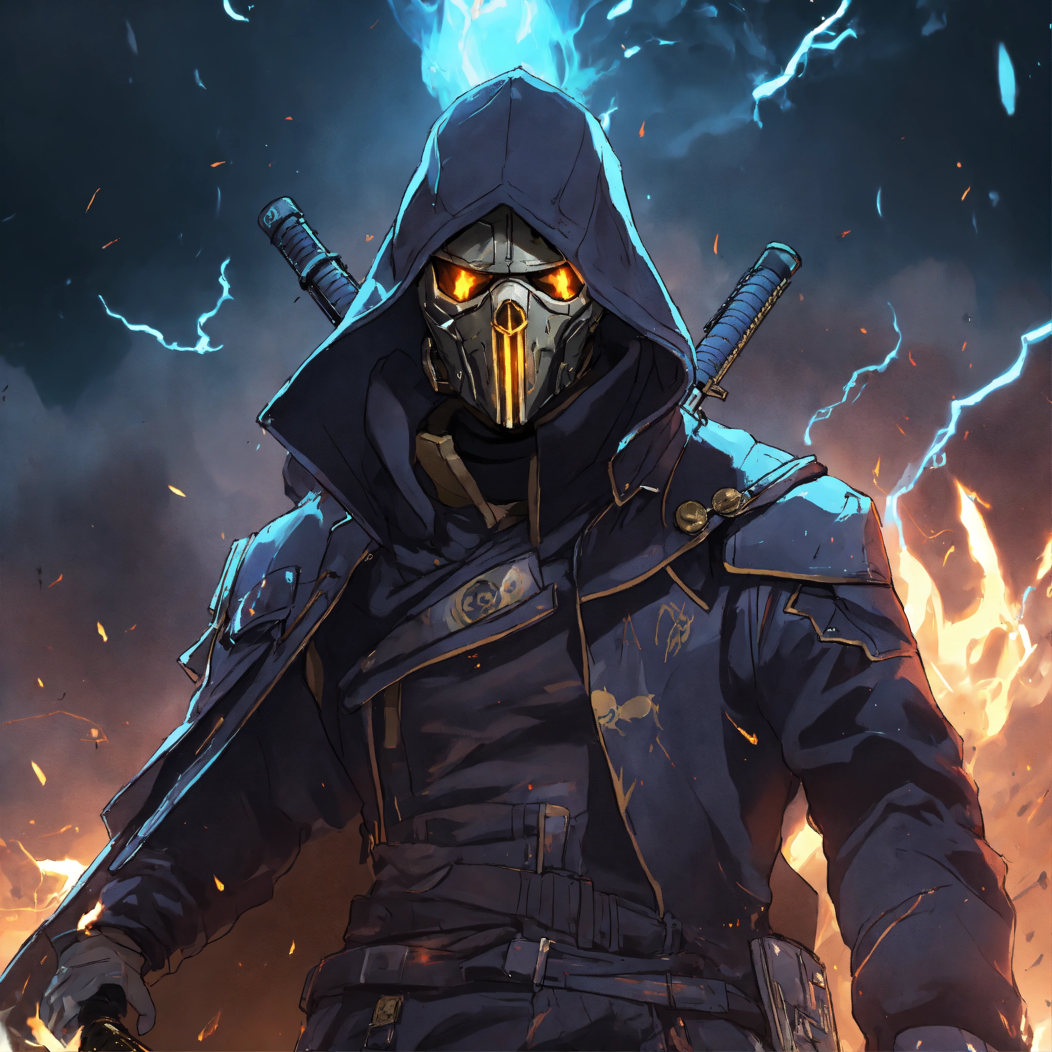 All glassblowing style dishonored wearing a cyberpunk helmet with a skull face mask and a hooded cloak while breathing smoke from the helmet holding a katana standing in a war surrounded by smoke and lightning and sparks flying in the air in anime art style