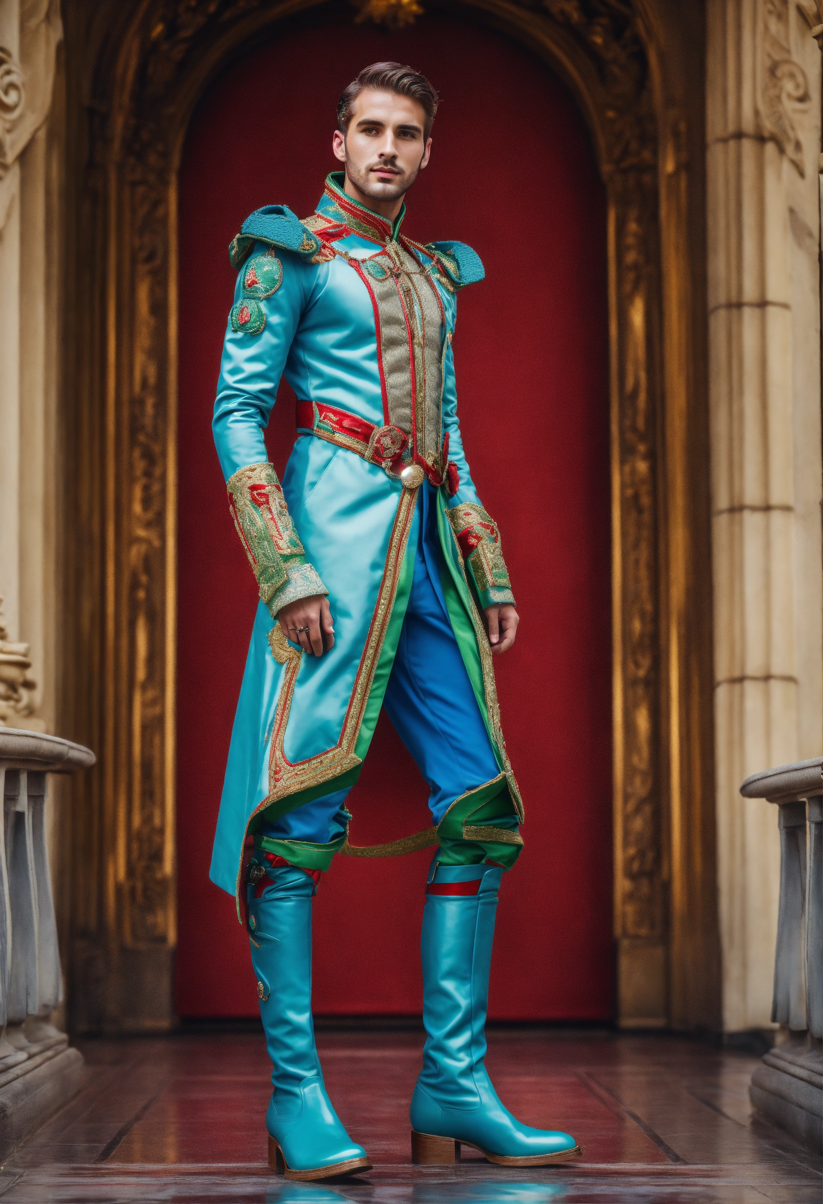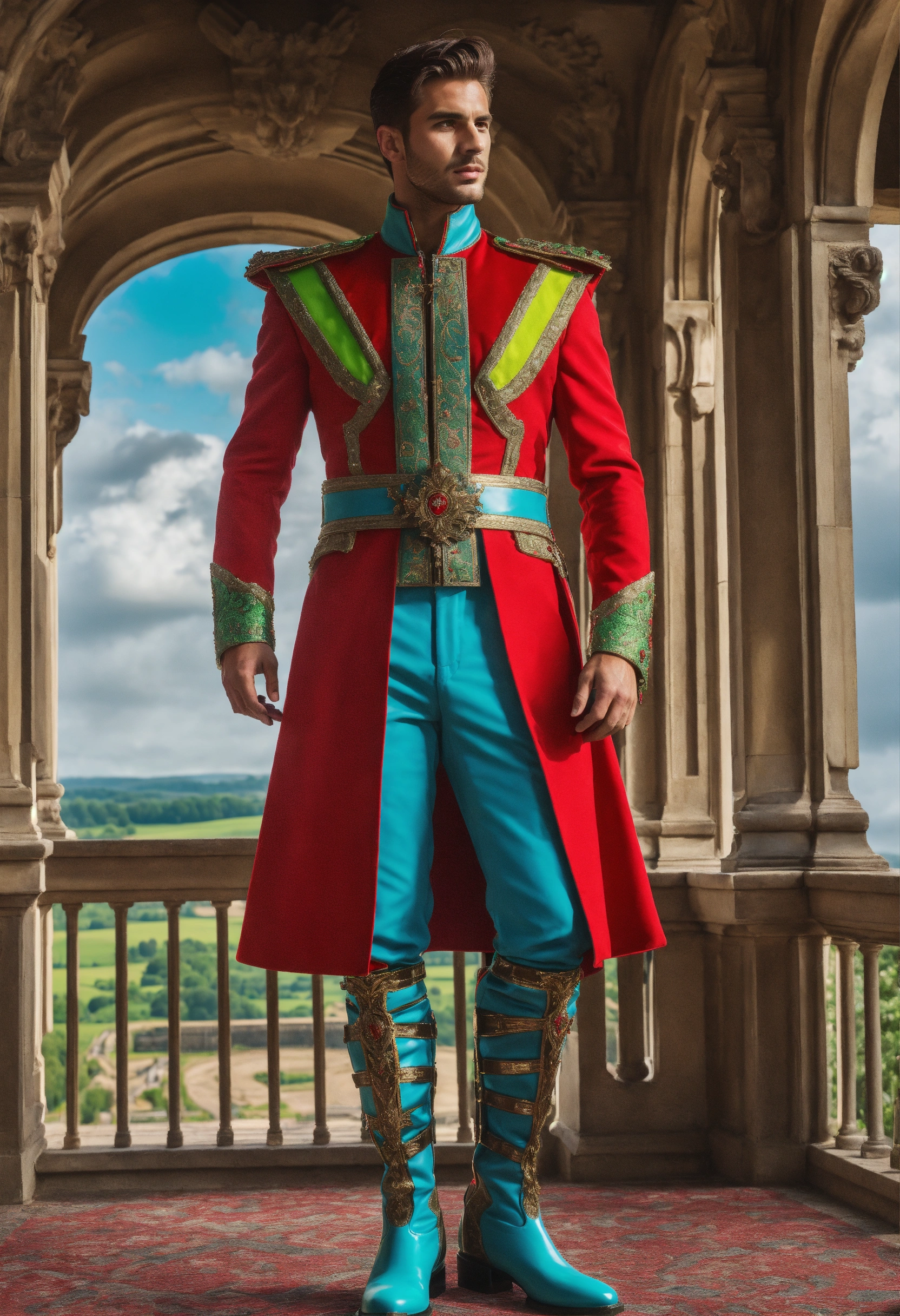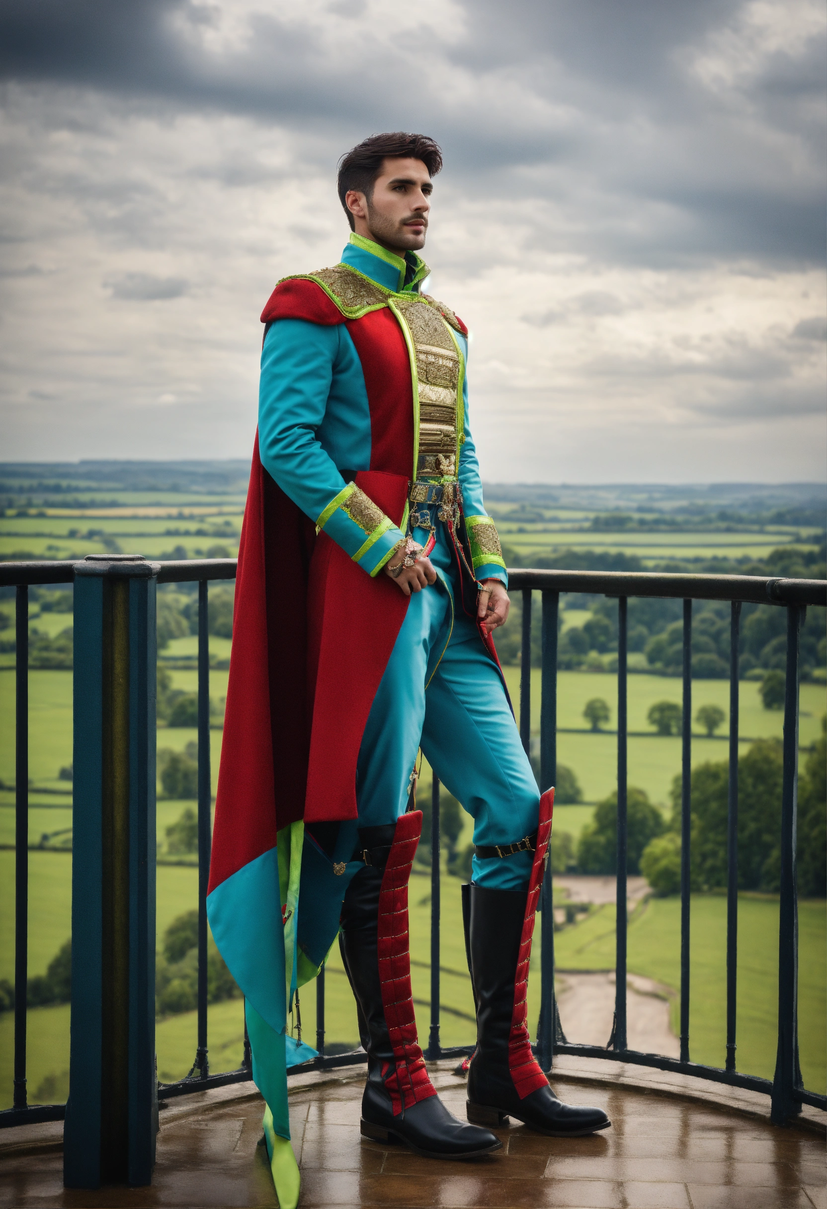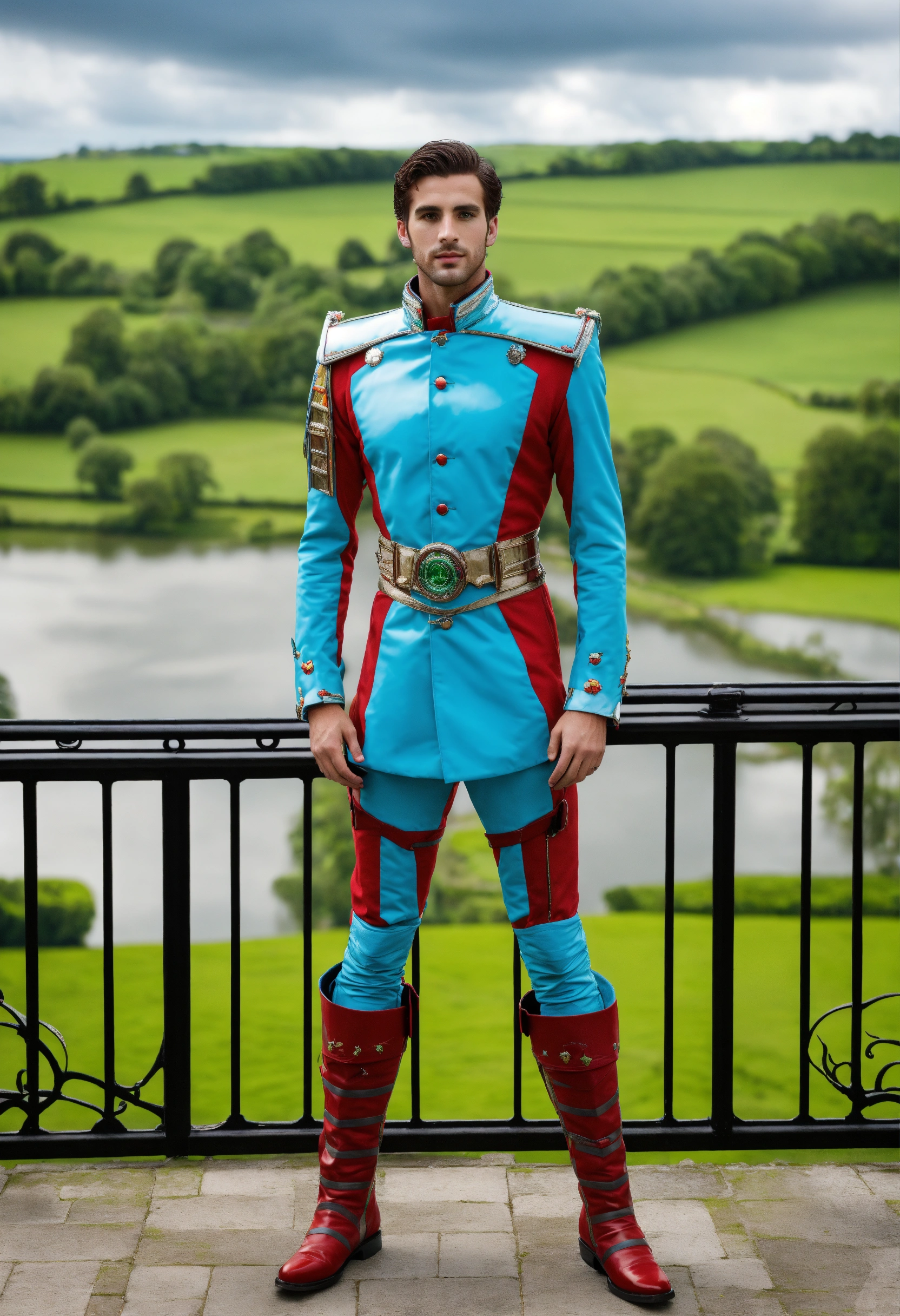 Highly detailed full body of a sci fi aristocrat, royalty, light blue and red and volt green futuristic outfit and boots, standing on palace balcony overlooking the english countryside on a cloudy day, male, handsome, 29 years old, highly detailed