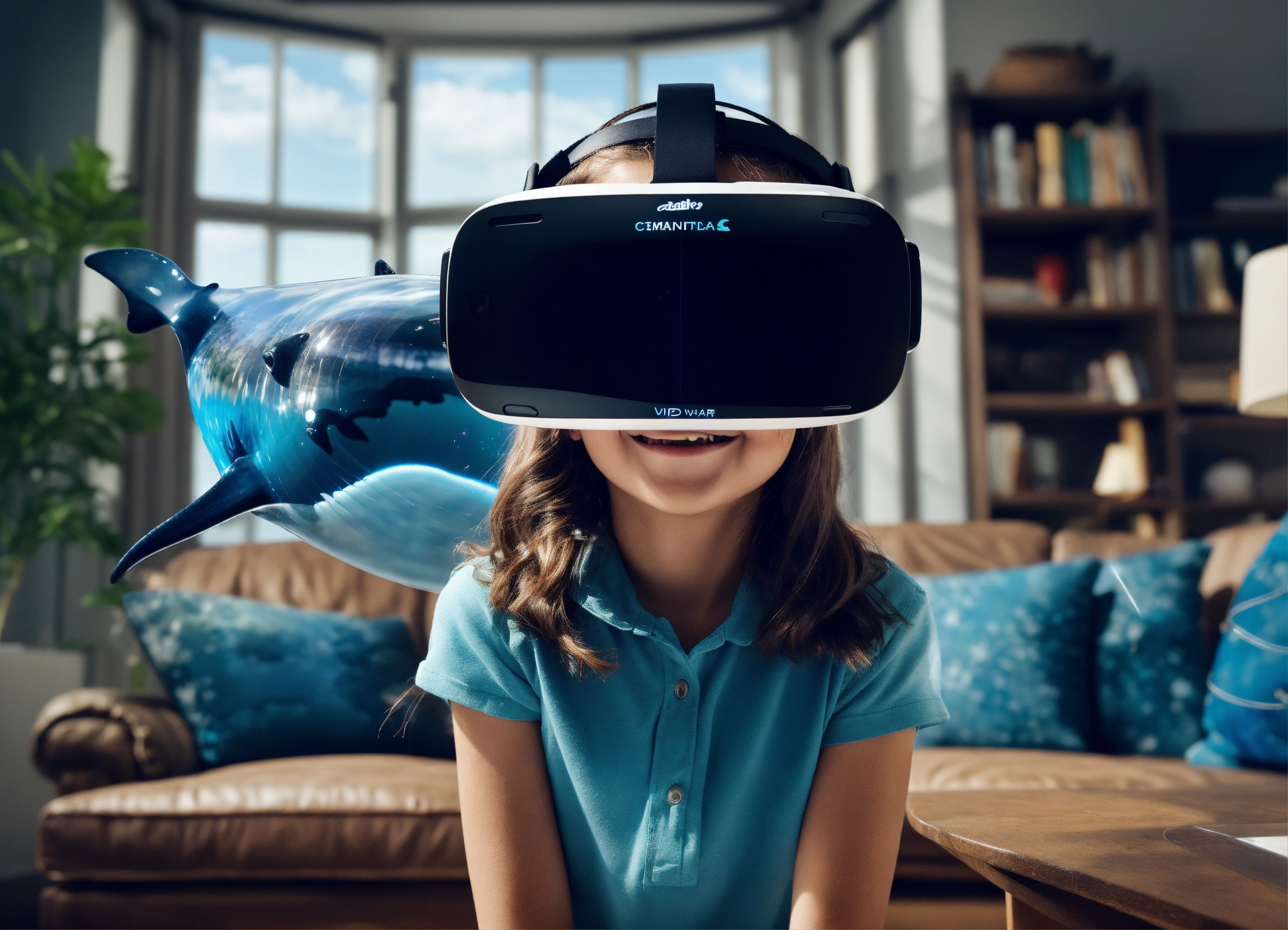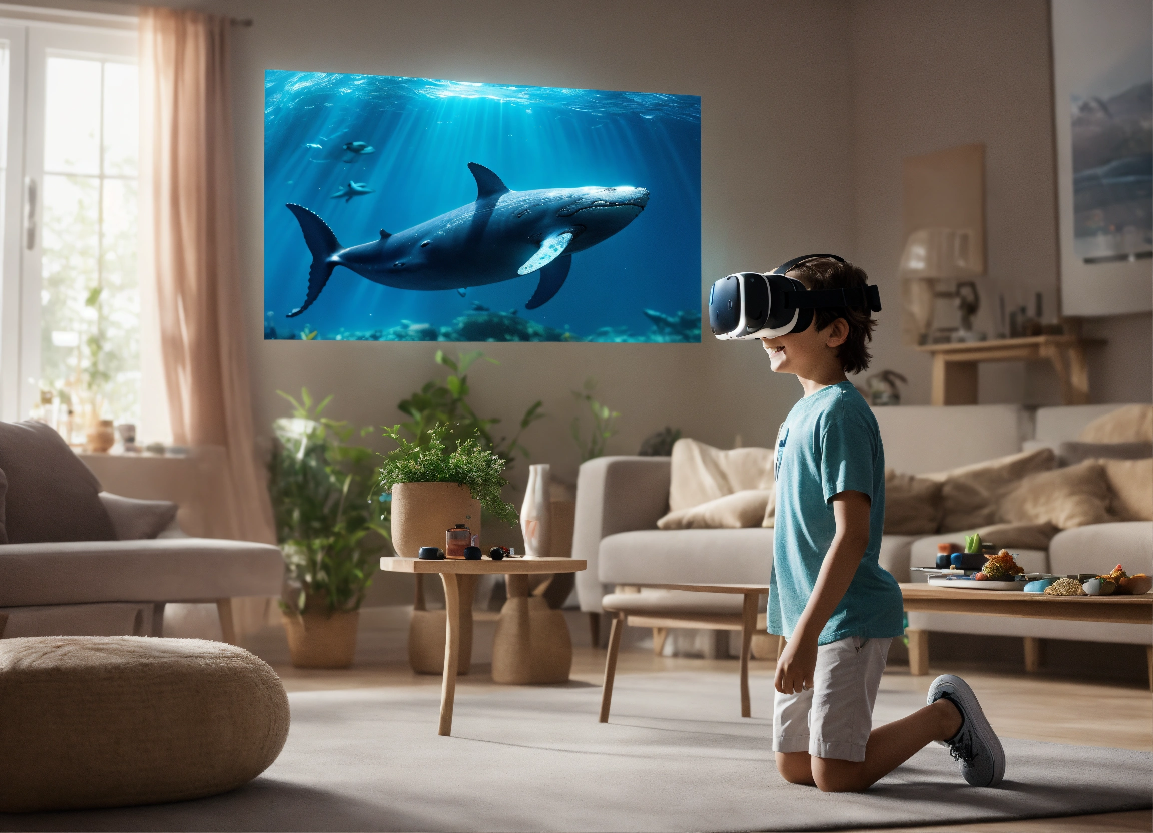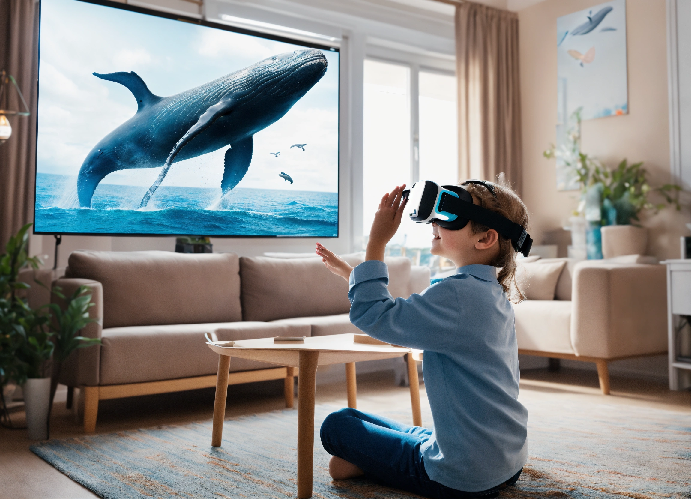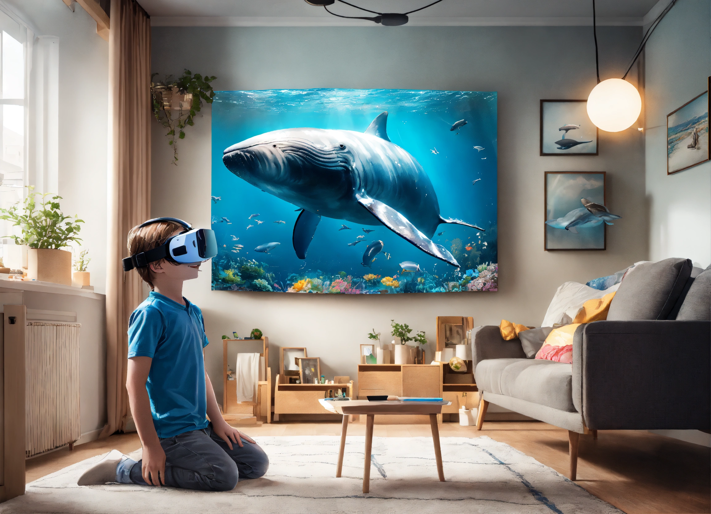 Create a promotion image with a smiling 10-year-old child in a vr headset. show the child looking at a giant transparent whale, with an augmented reality display floating besides the whale. make the whale 2 times larger than the child, and create this setting in an ordinary living room.