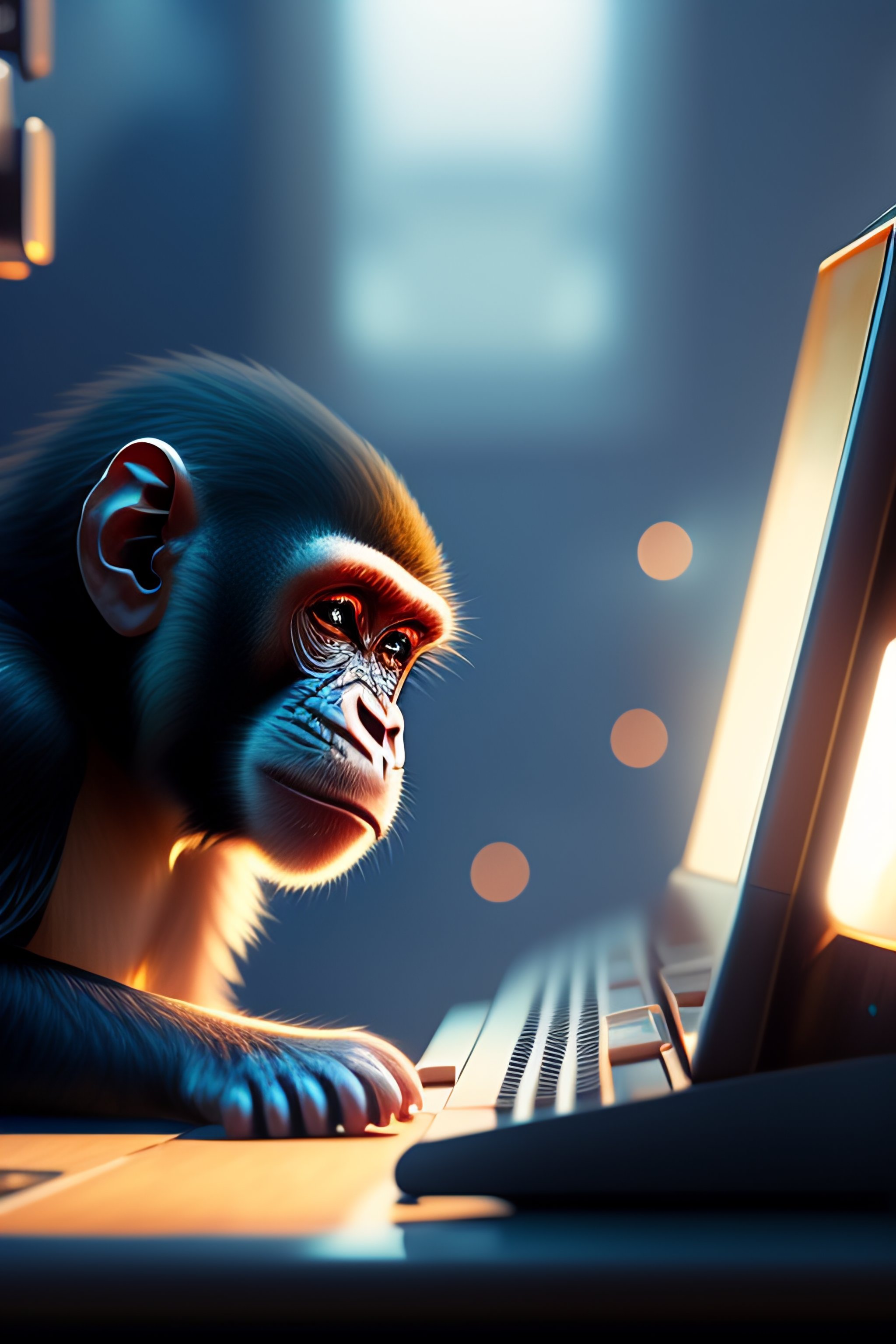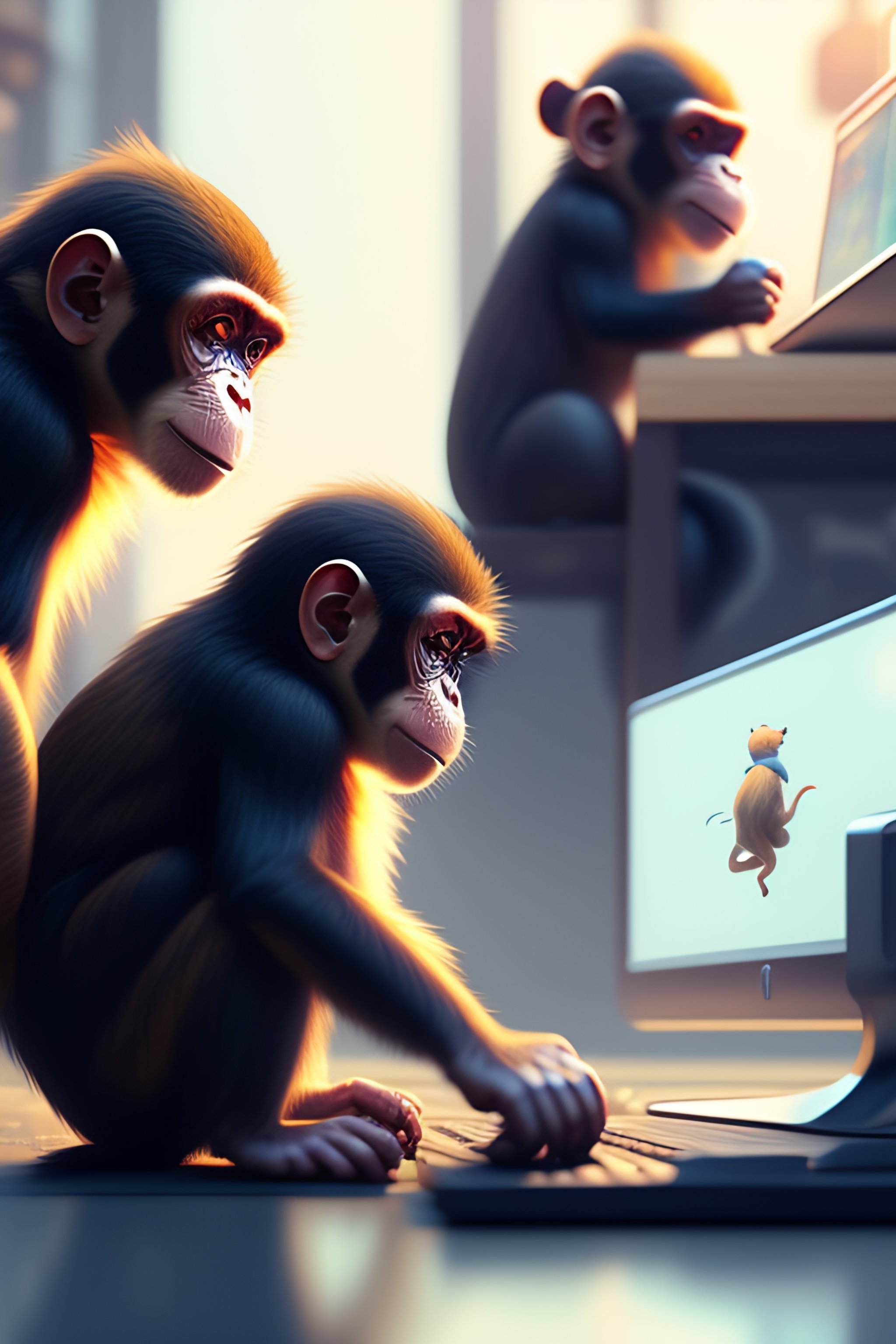 Monkeys playing with computers, by greg rutkowski makoto shinkai kyoto animation key art feminine mid shot