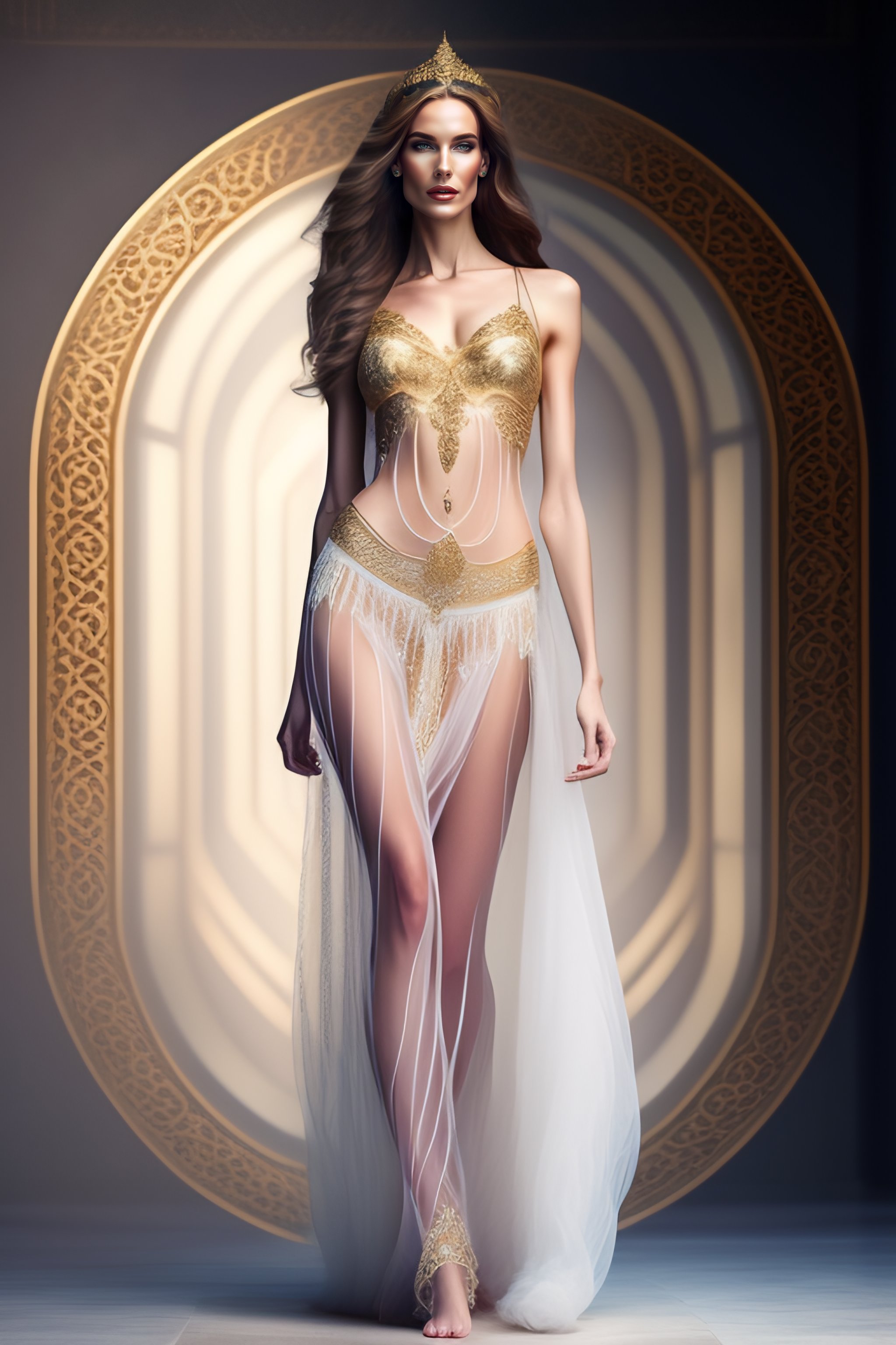 Full body portrait of alluring greek goddess aphrodite, slim and slender, wide pelvis and outstretched long legs, showing abs, movement, motion, wearing ornate mesh translucent decorative short nightgown, victoria secret, arms behind head