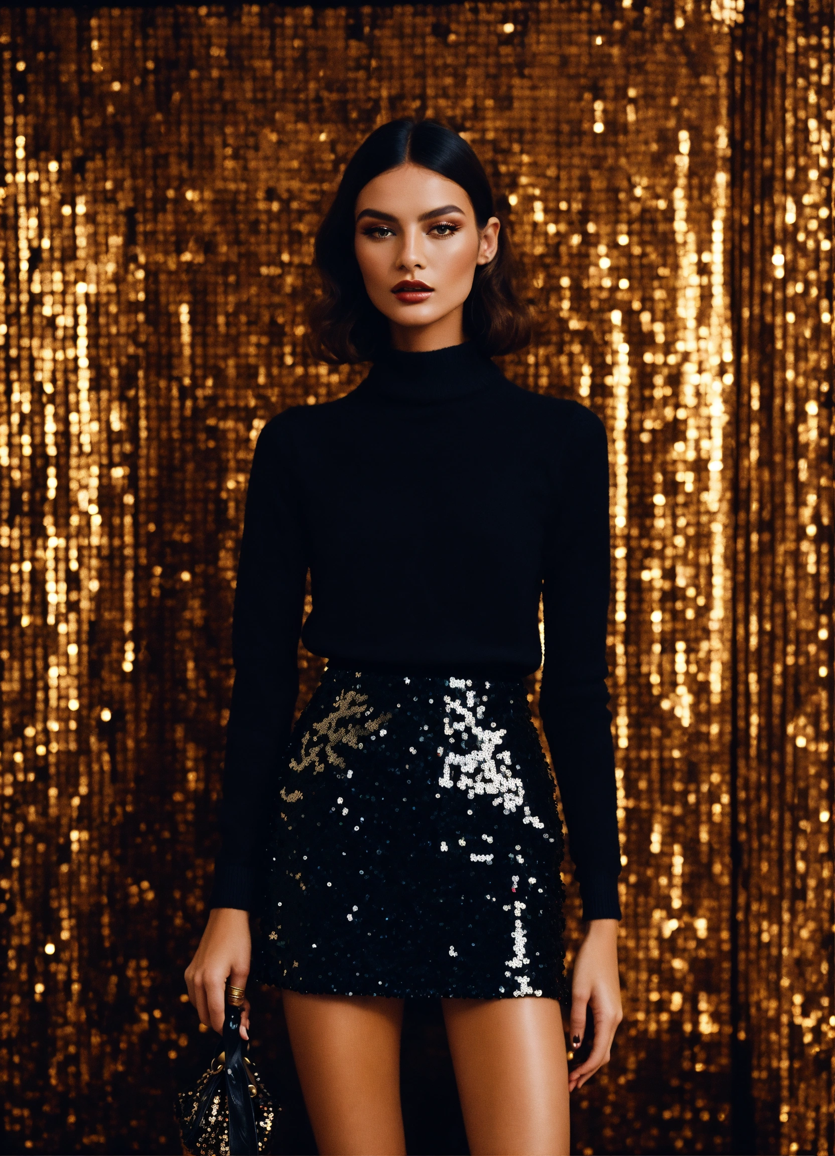 Create a visually stunning gucci inspired photoshoot featuring a tanned supermodel wearing black sequin miniskirt and black sequin jumper, iso 400, surrealistic, 8k, full frame, french fashion house vintage background